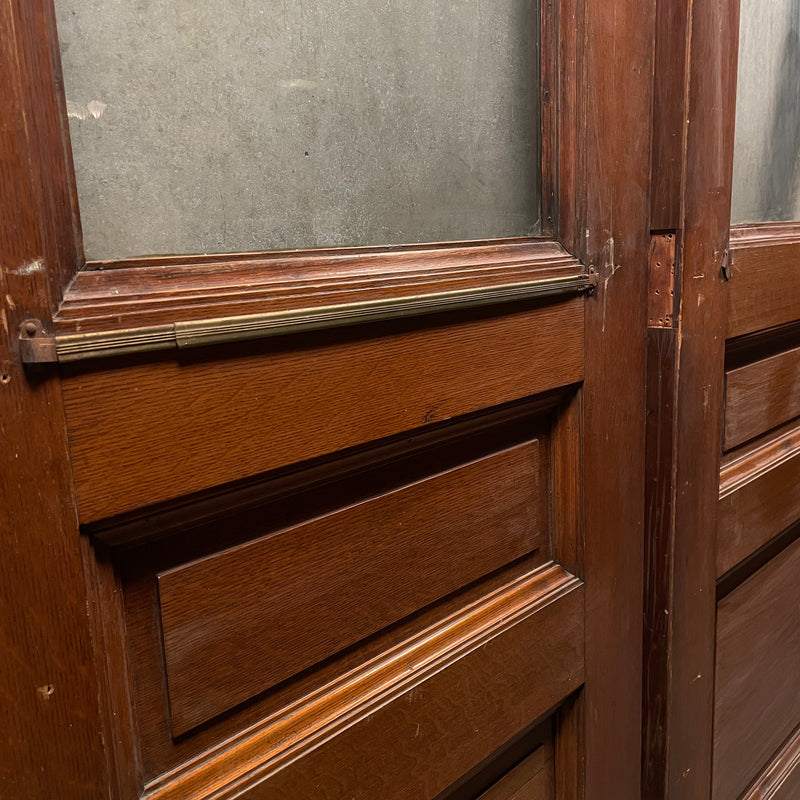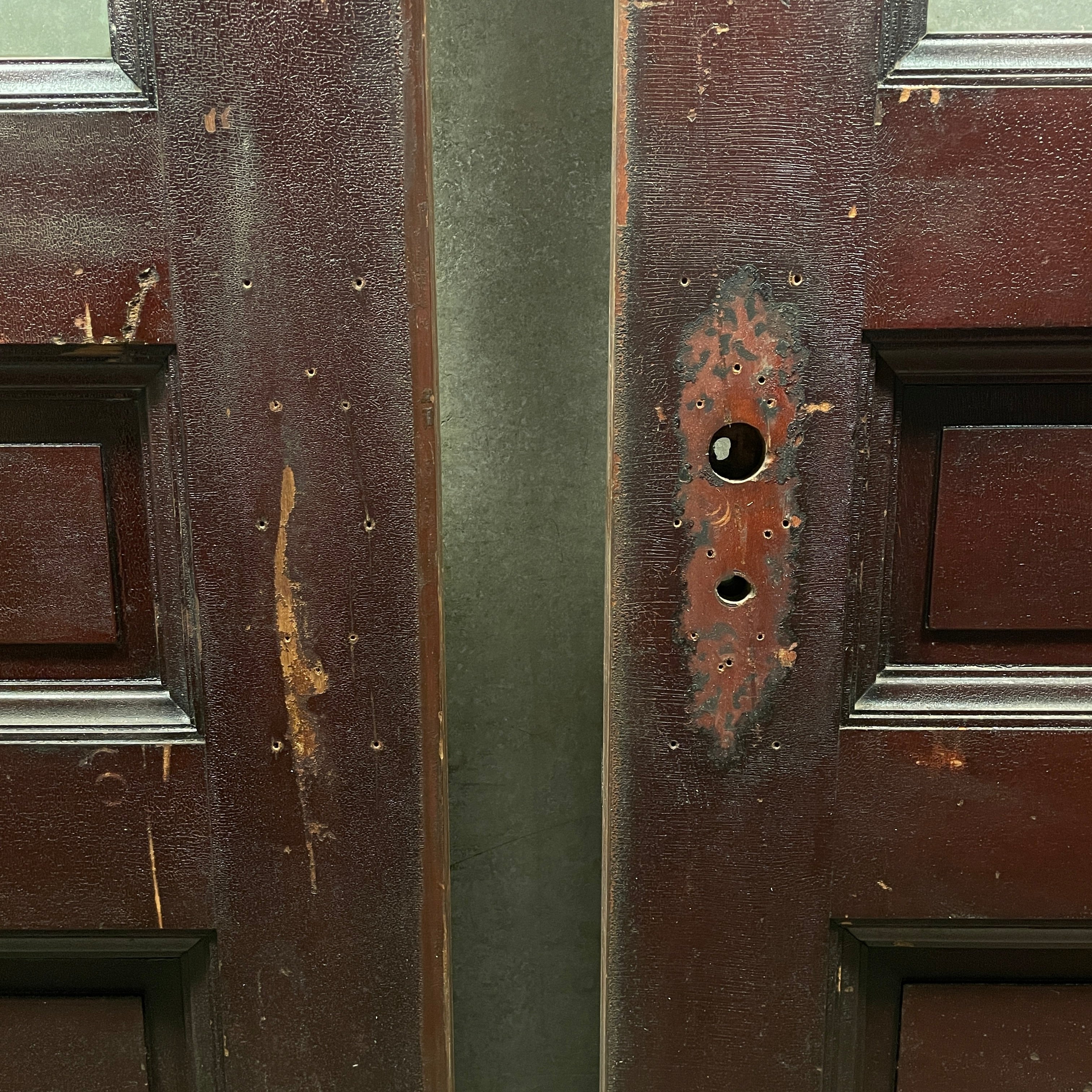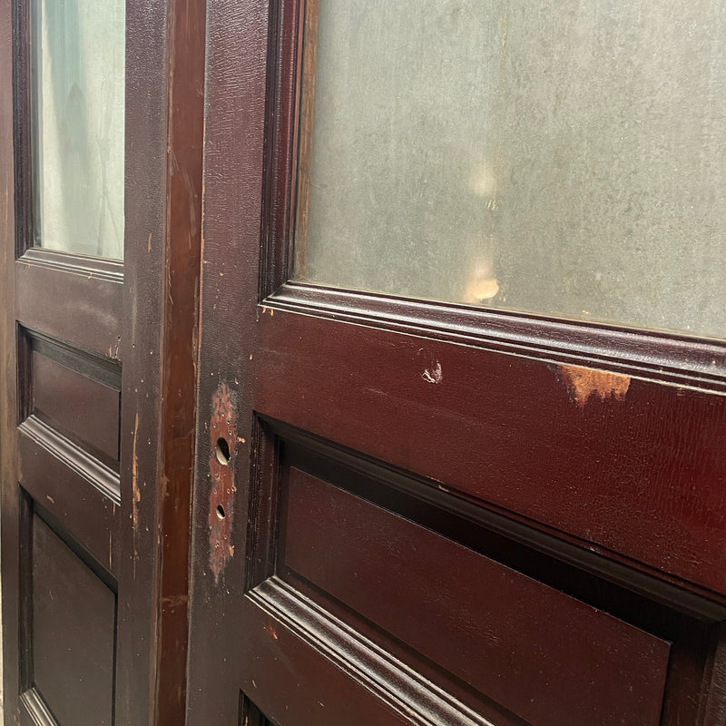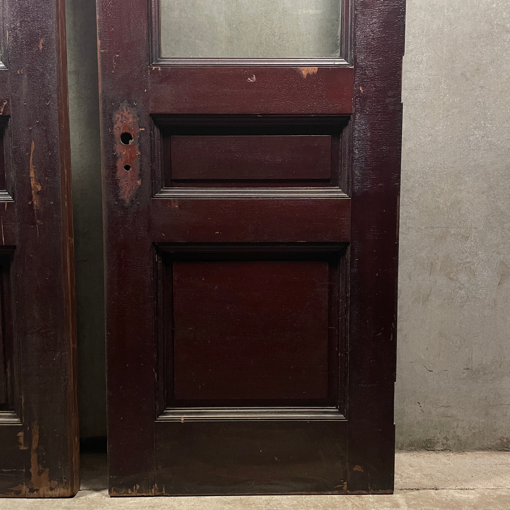 A very nice set of front doors in solid wood, multi panels, with glass. These doors are thick, 2.5- 3 inch material, almost 8 feet tall.