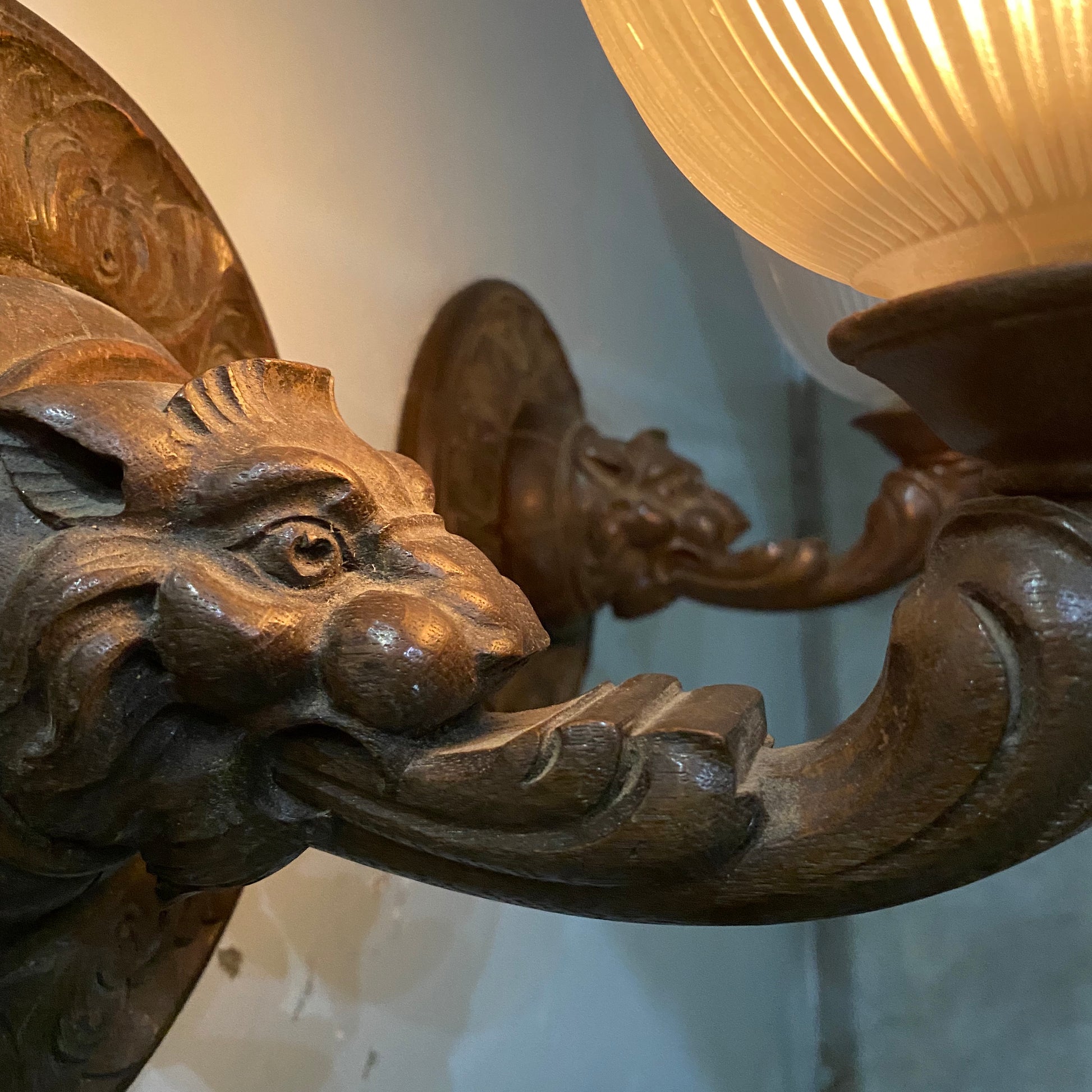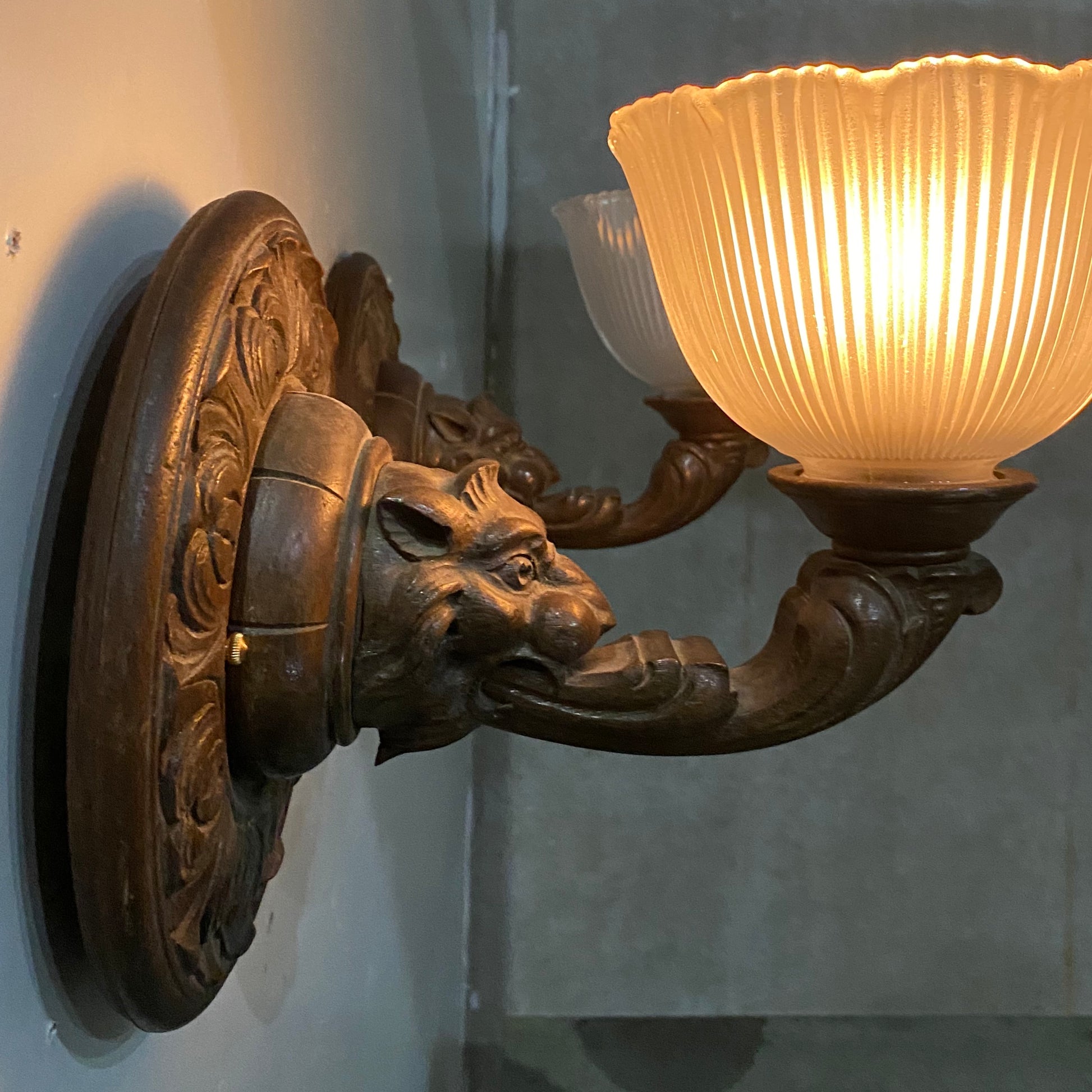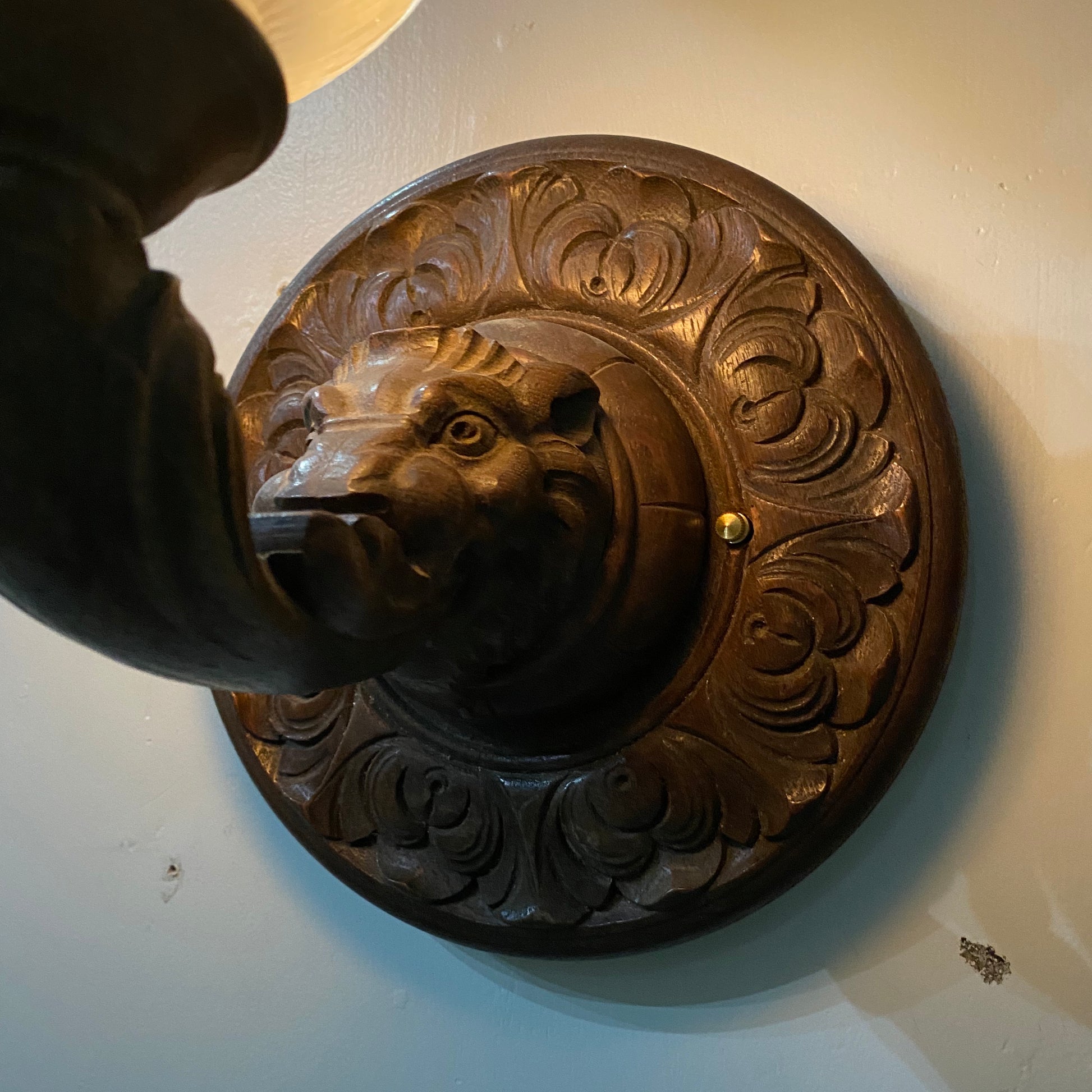 These beautiful wooden sconces feature a unique lions head detail and were salvaged from a Country Estate in France.