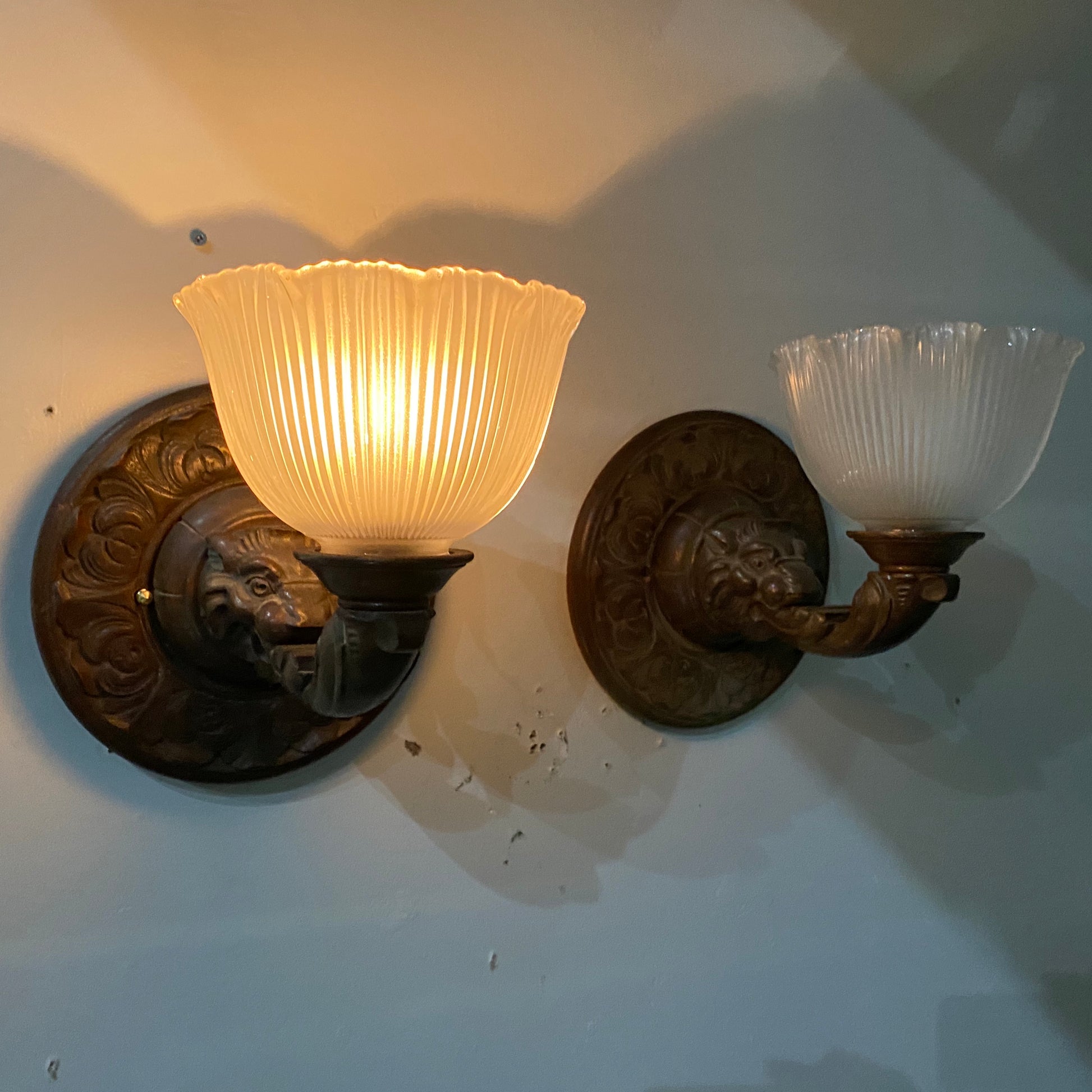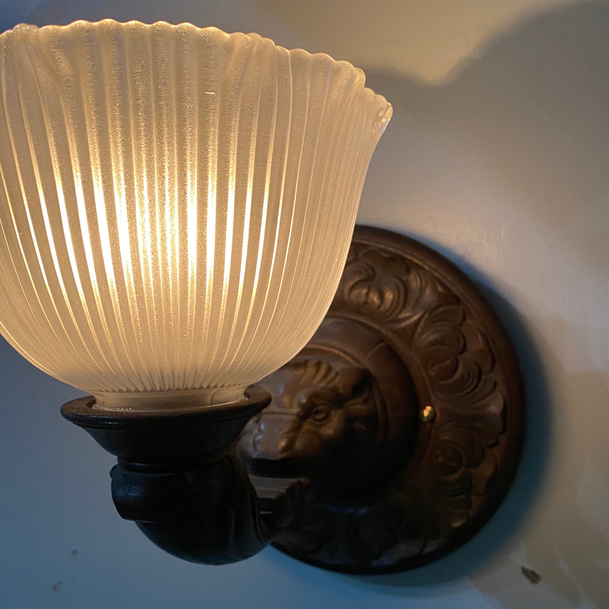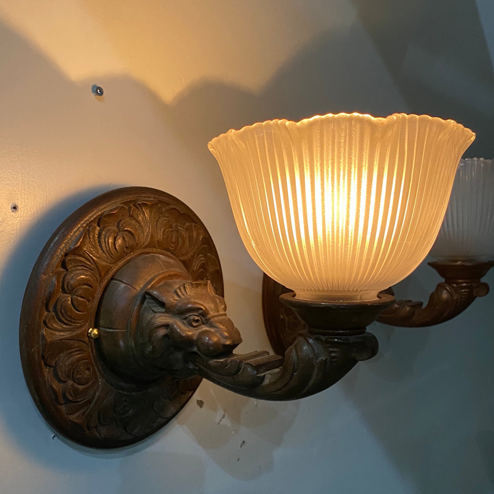 These beautiful wooden sconces feature a unique lions head detail and were salvaged from a Country Estate in France.