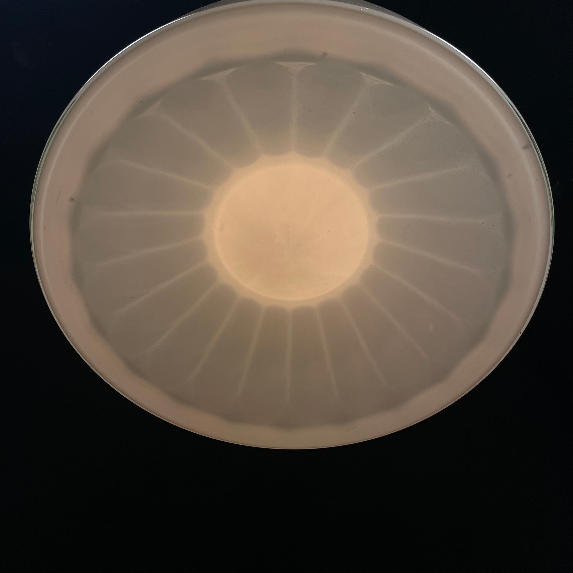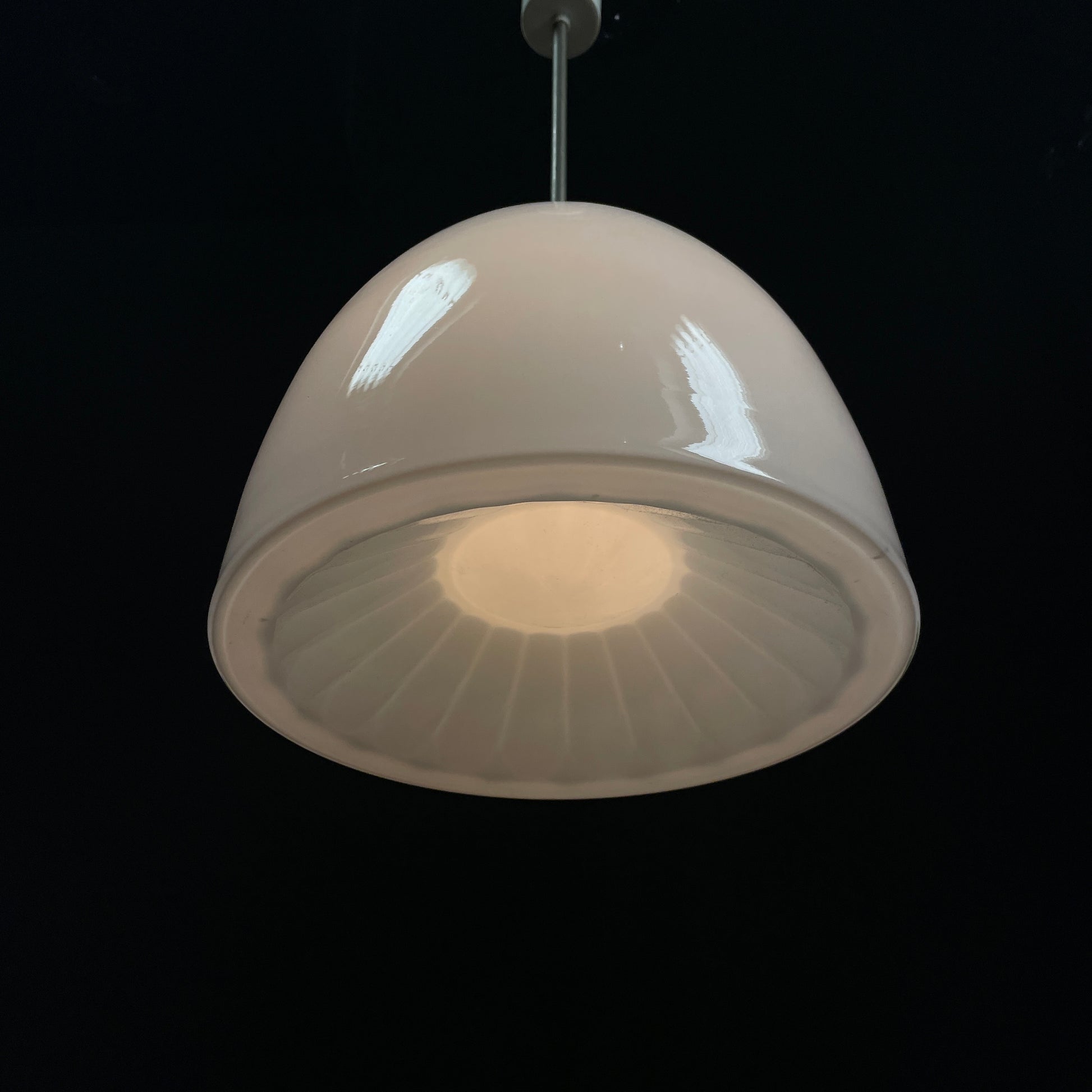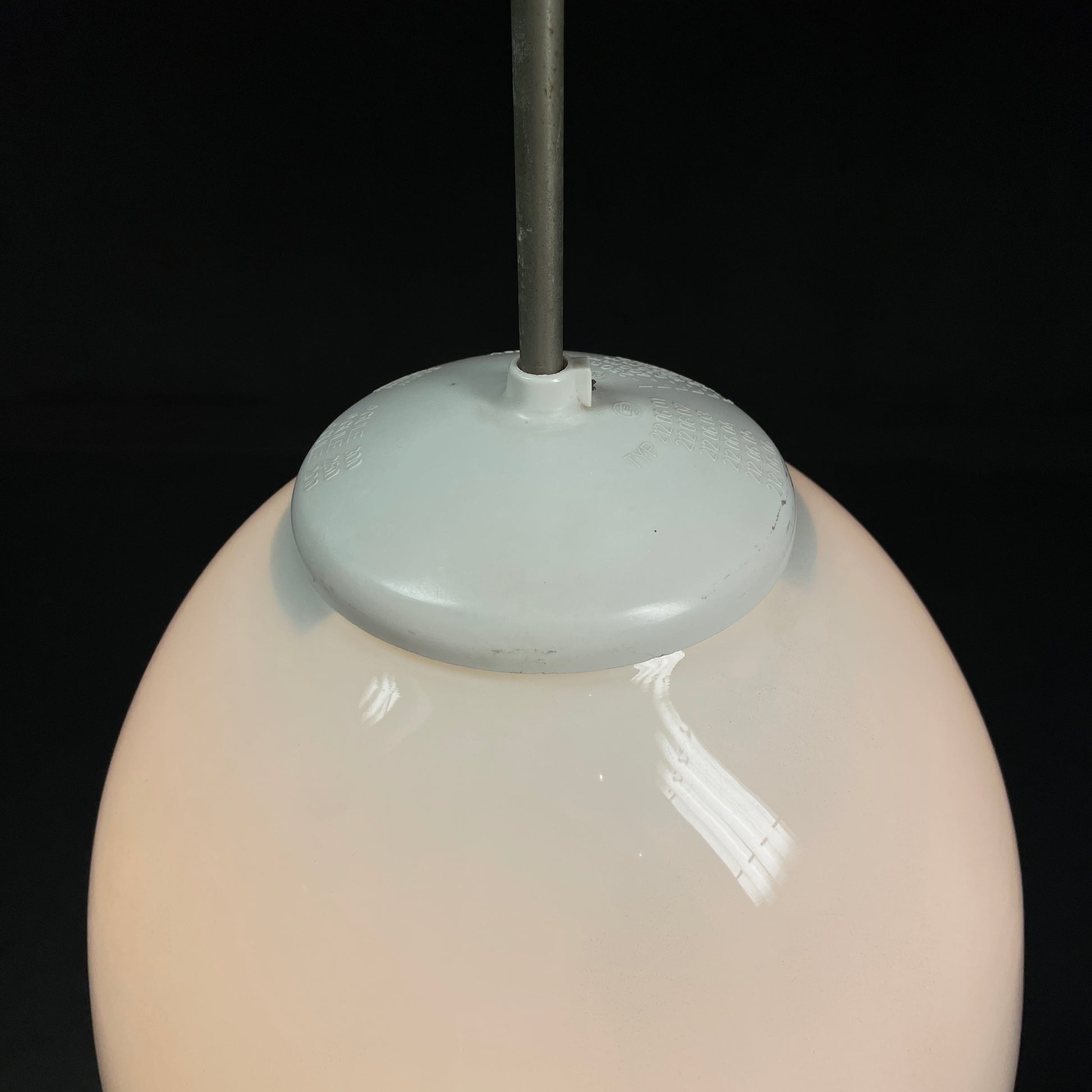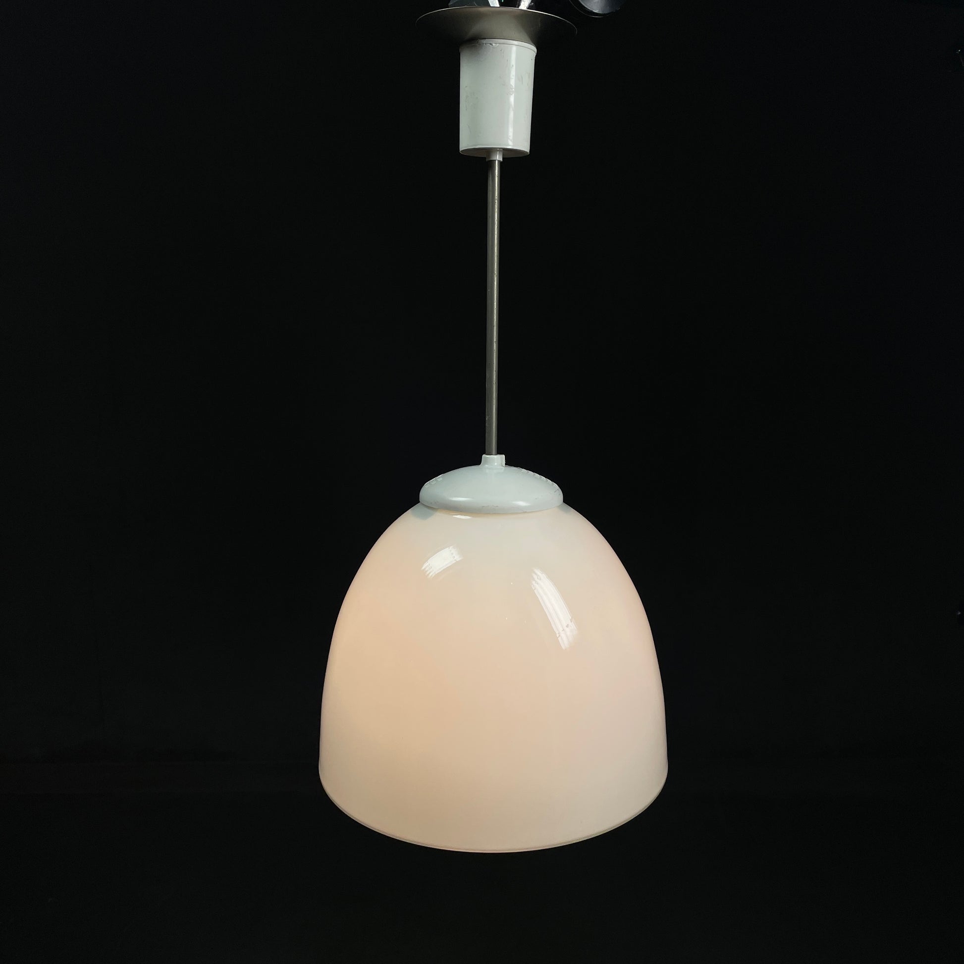 Pendant lamp made in Czechoslovakia in the 1950's for Elektrosvit in Nové Zámky. The shade has an opaline white glass pattern with an interesting unique cone shape mounted on a rigid, chrome-plated arm. Found in a cafe in France.