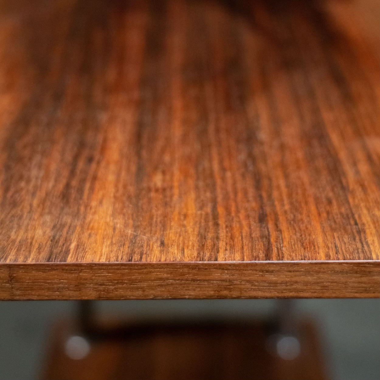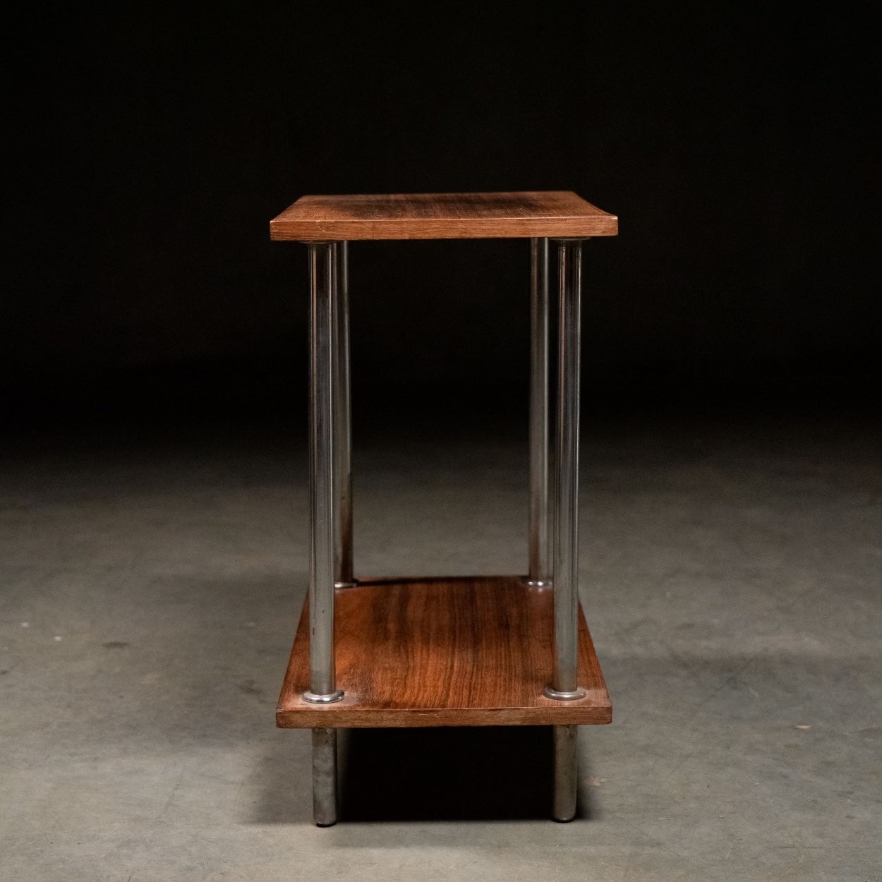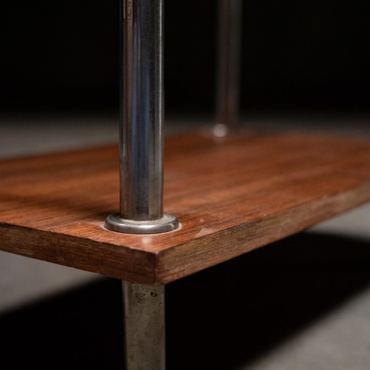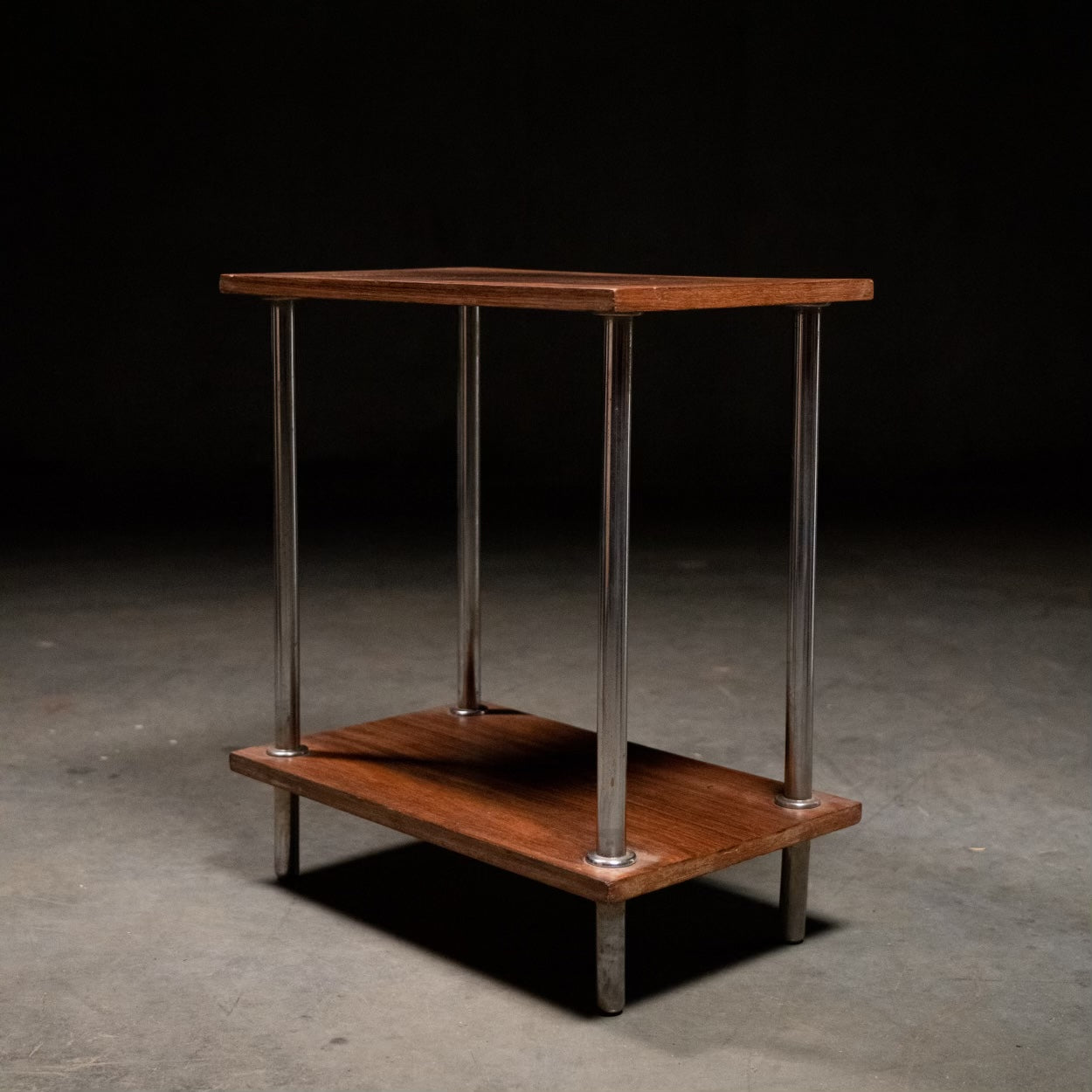 This is an unusual piece in solid rosewood with chrome legs very well built with identifying tag. Research pending …