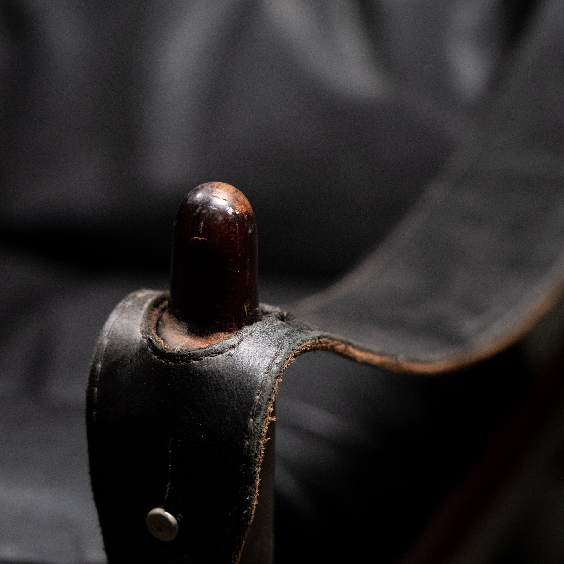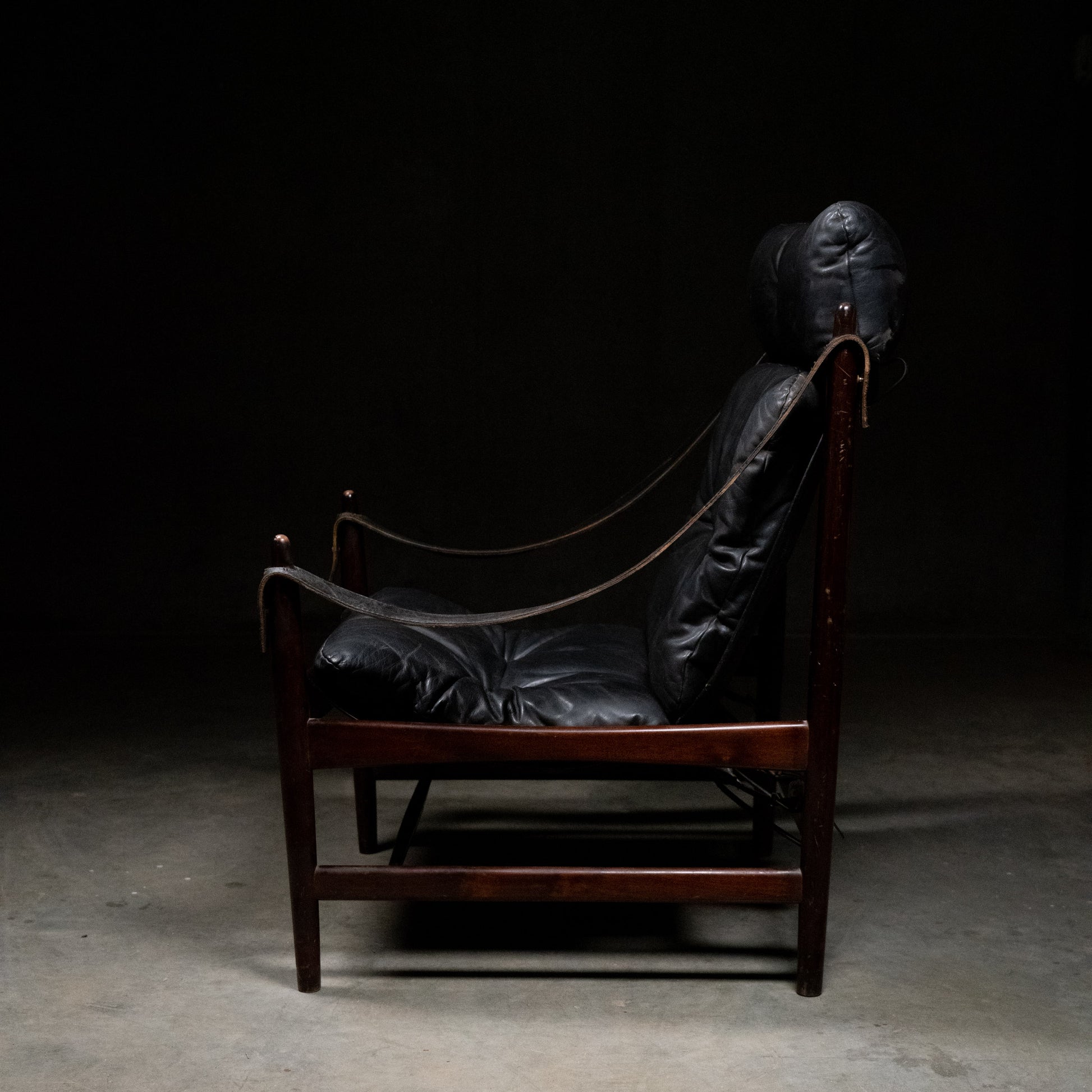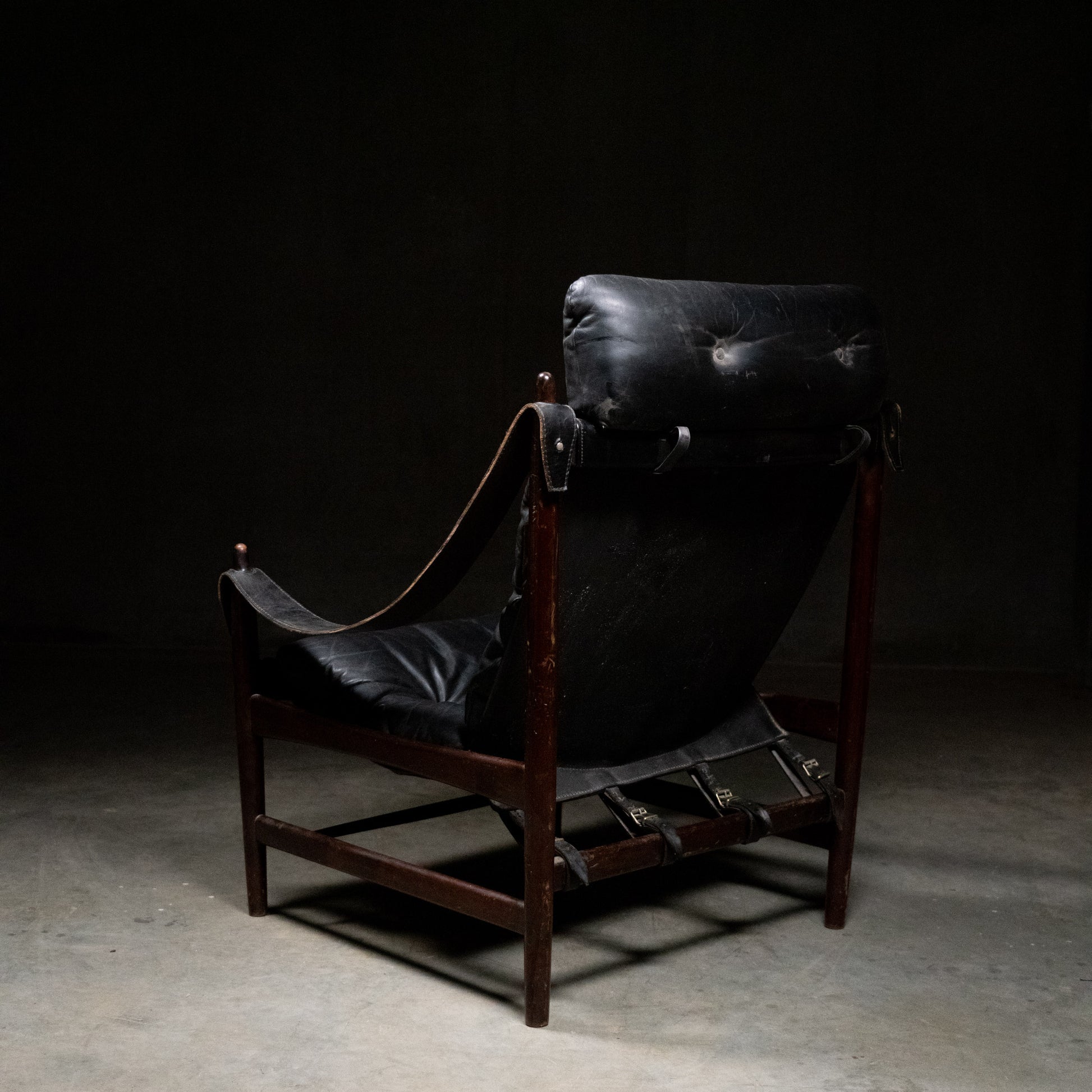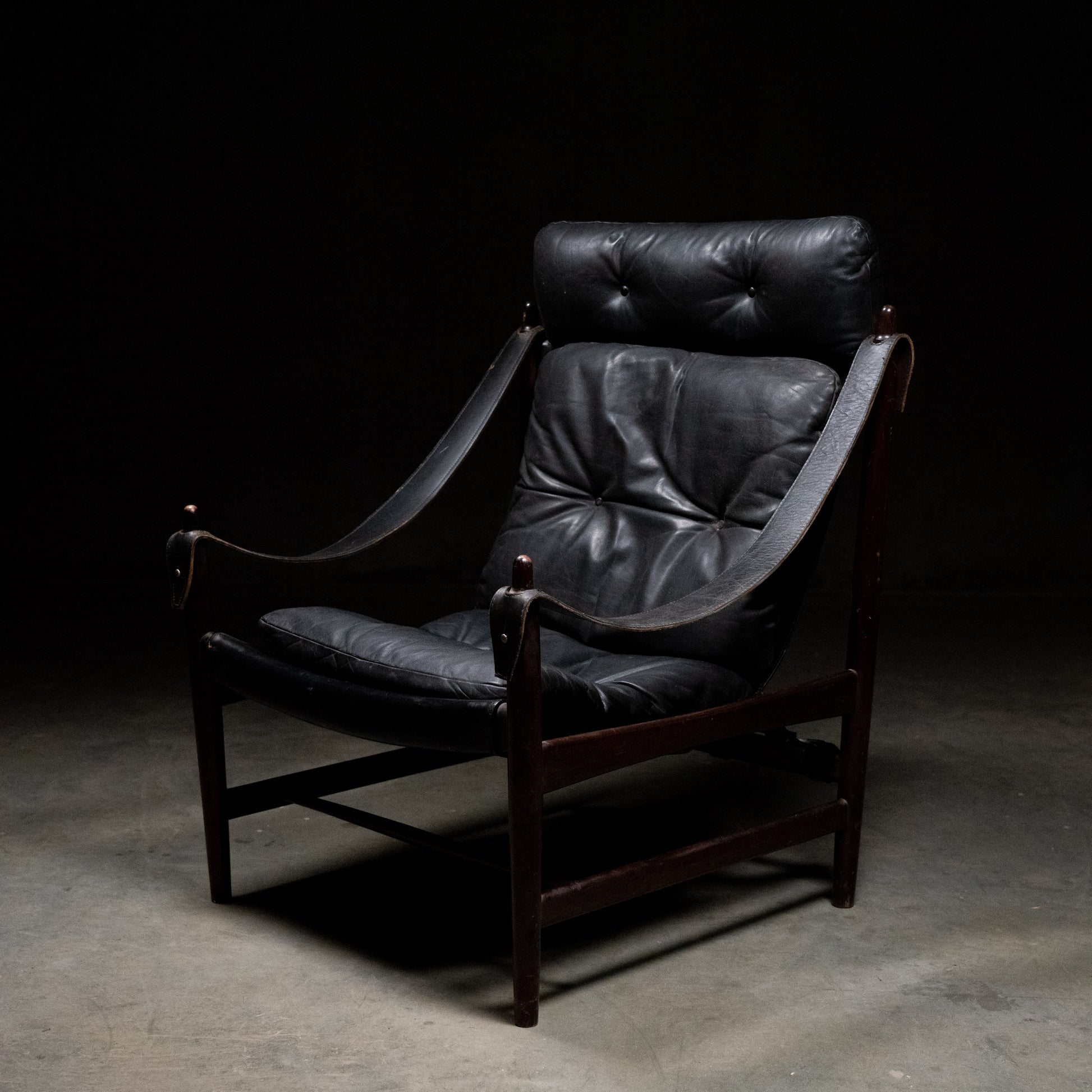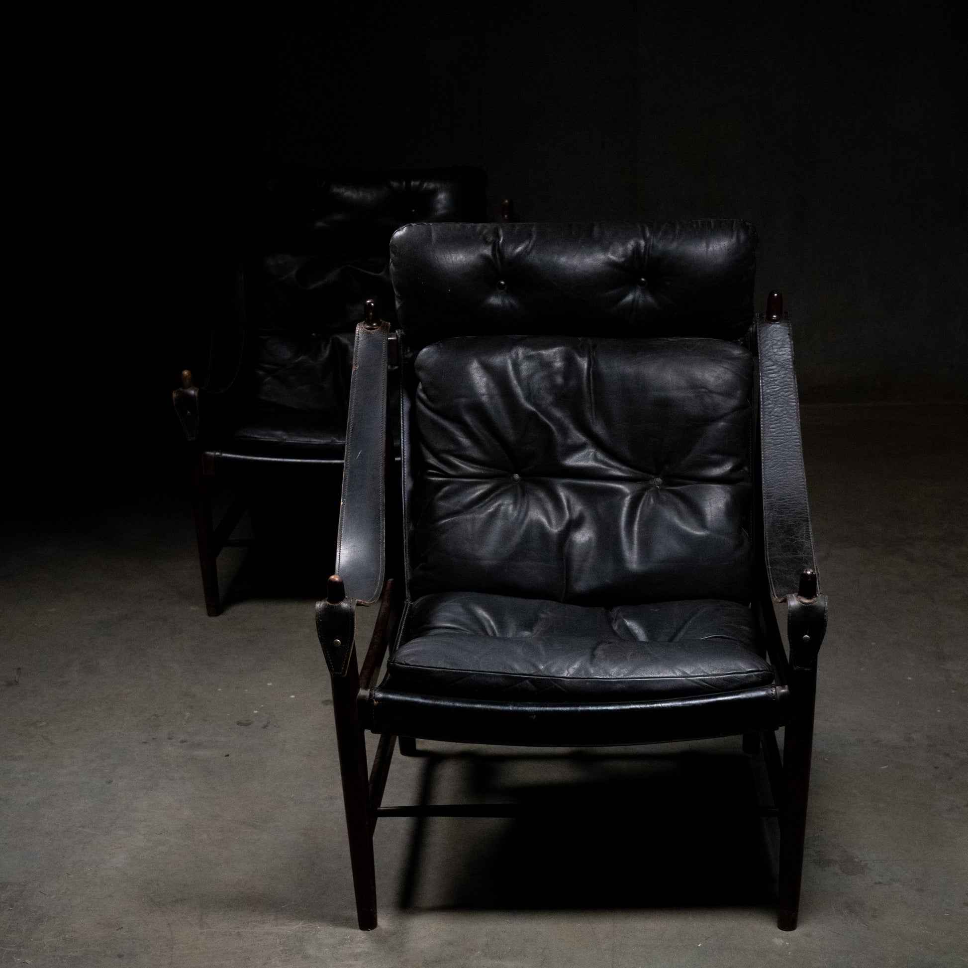 Stunning Nordic pair of safari lounge chairs in original condition, made in Norway 1965. These fantastic chairs are made of solid mahogany frames and thick black saddle leather seats, and are in a very good and original condition. The chairs are made to look like campaign or officers chairs, but distinguish themselves with strong scandinavian features.