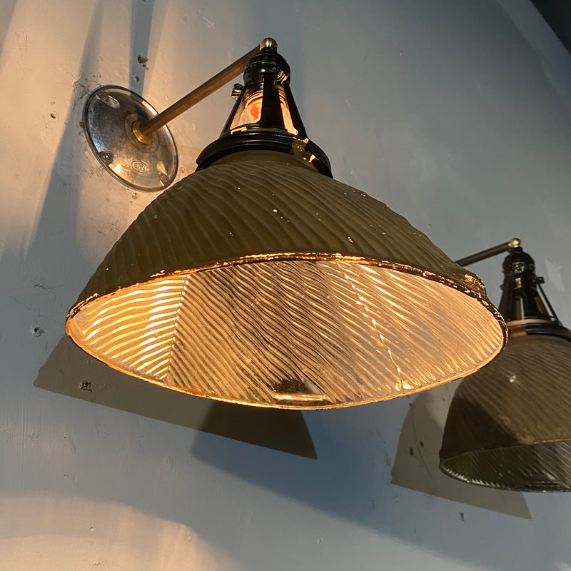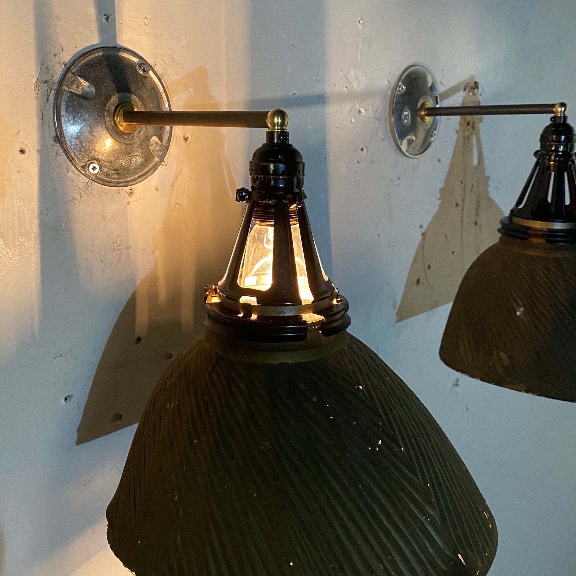 A pair of vintage X-ray ribbed green mercury glass shades with period brass wall lamp sconces. Signed. USA, circa 1930. All original shades attached to restored and rewired wall lamps.