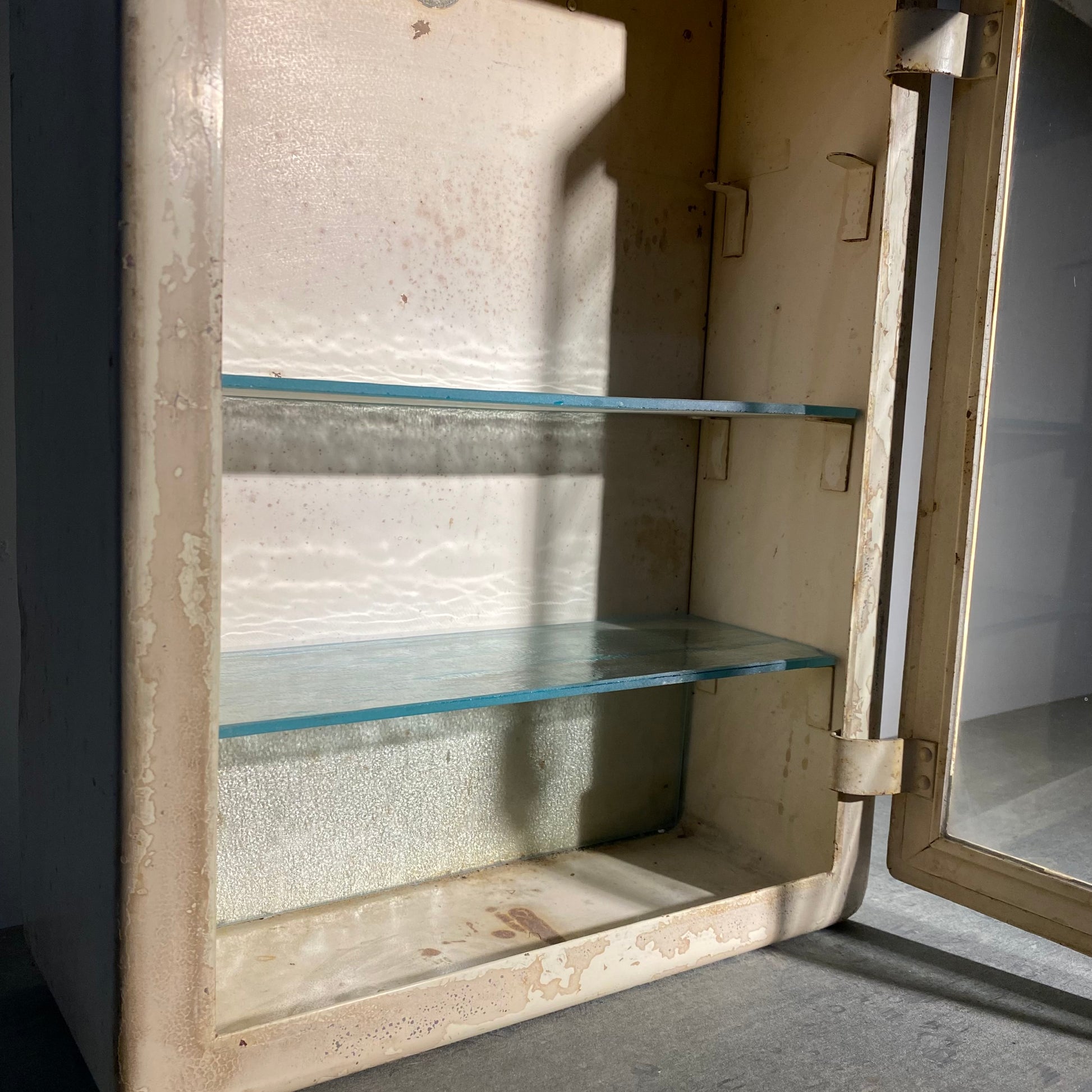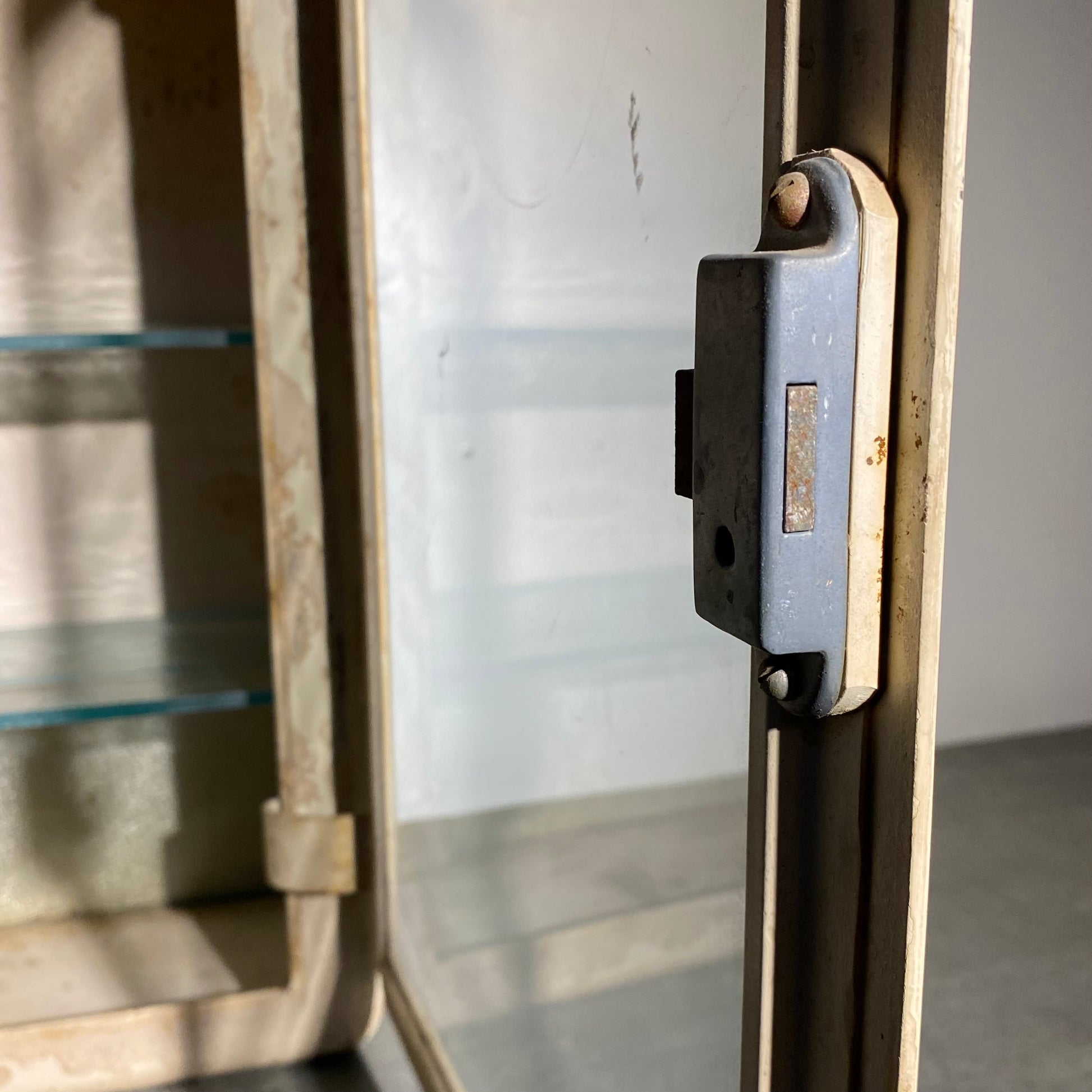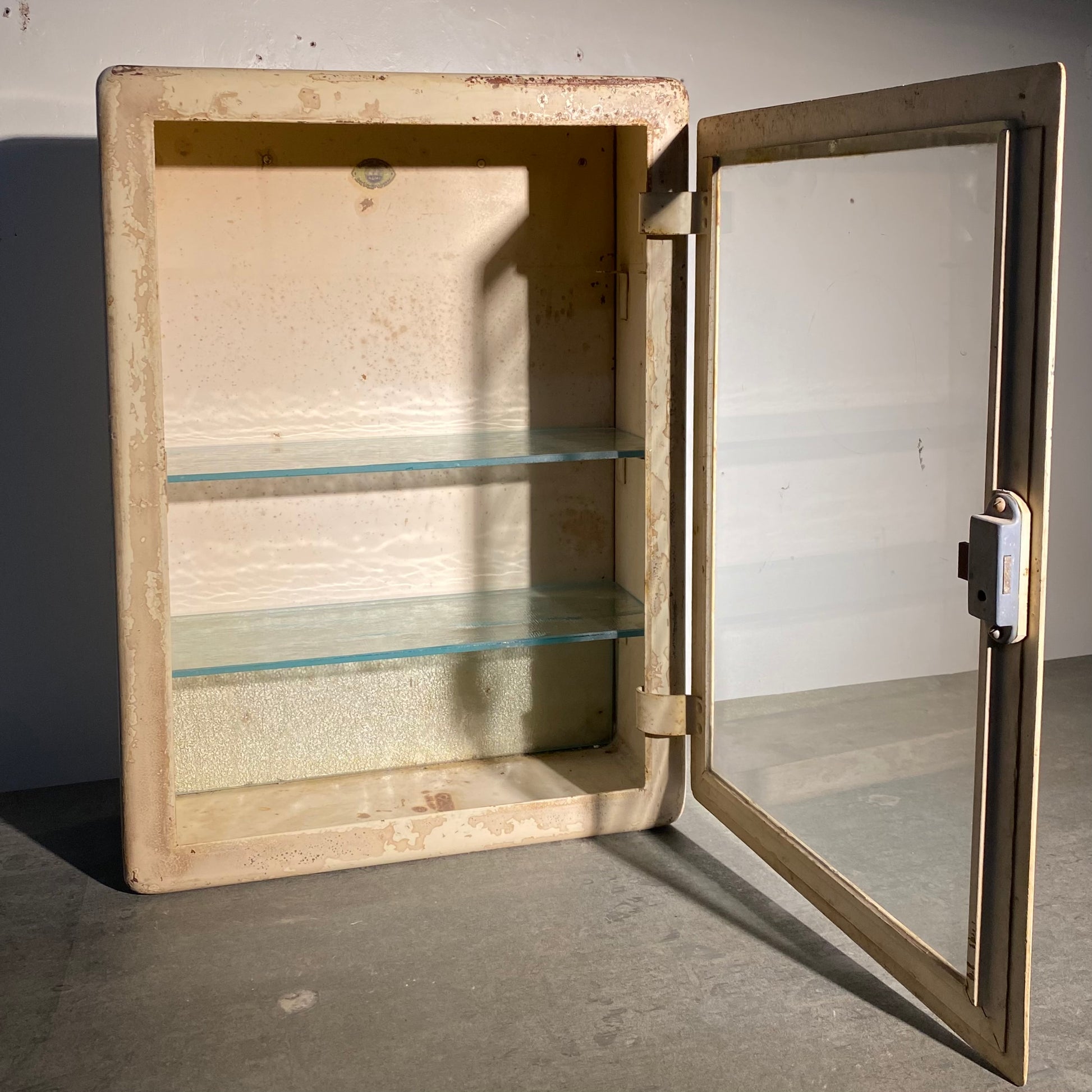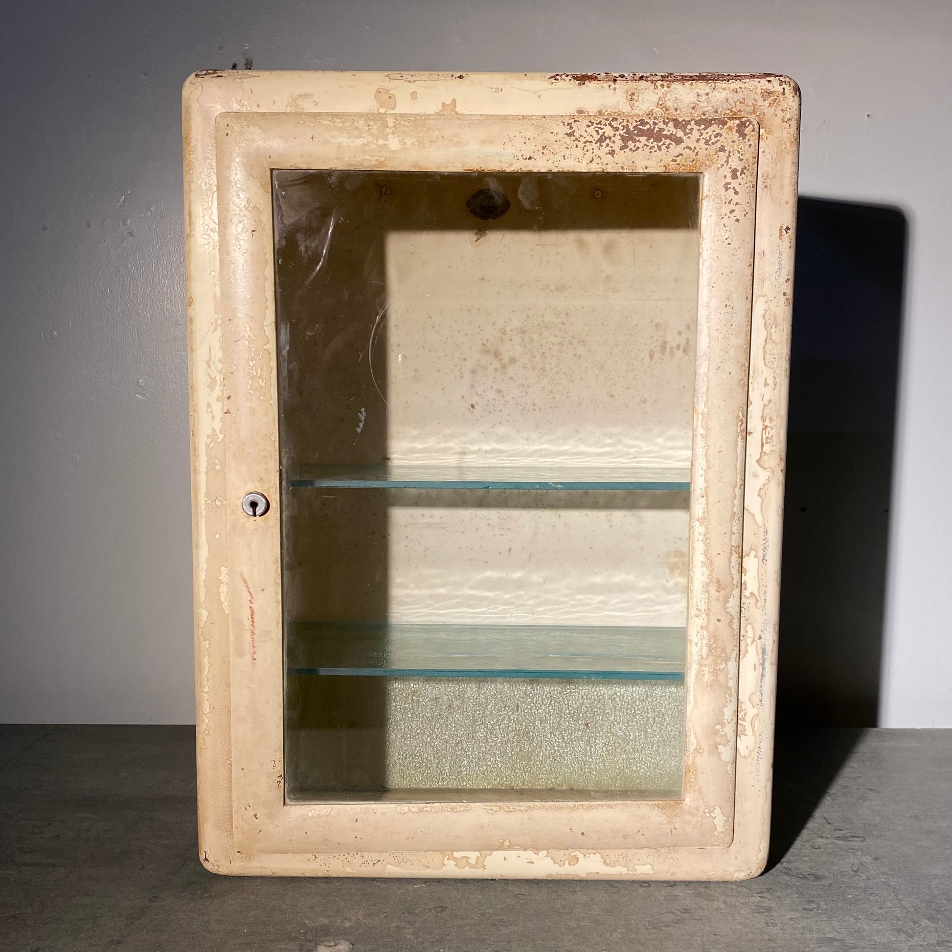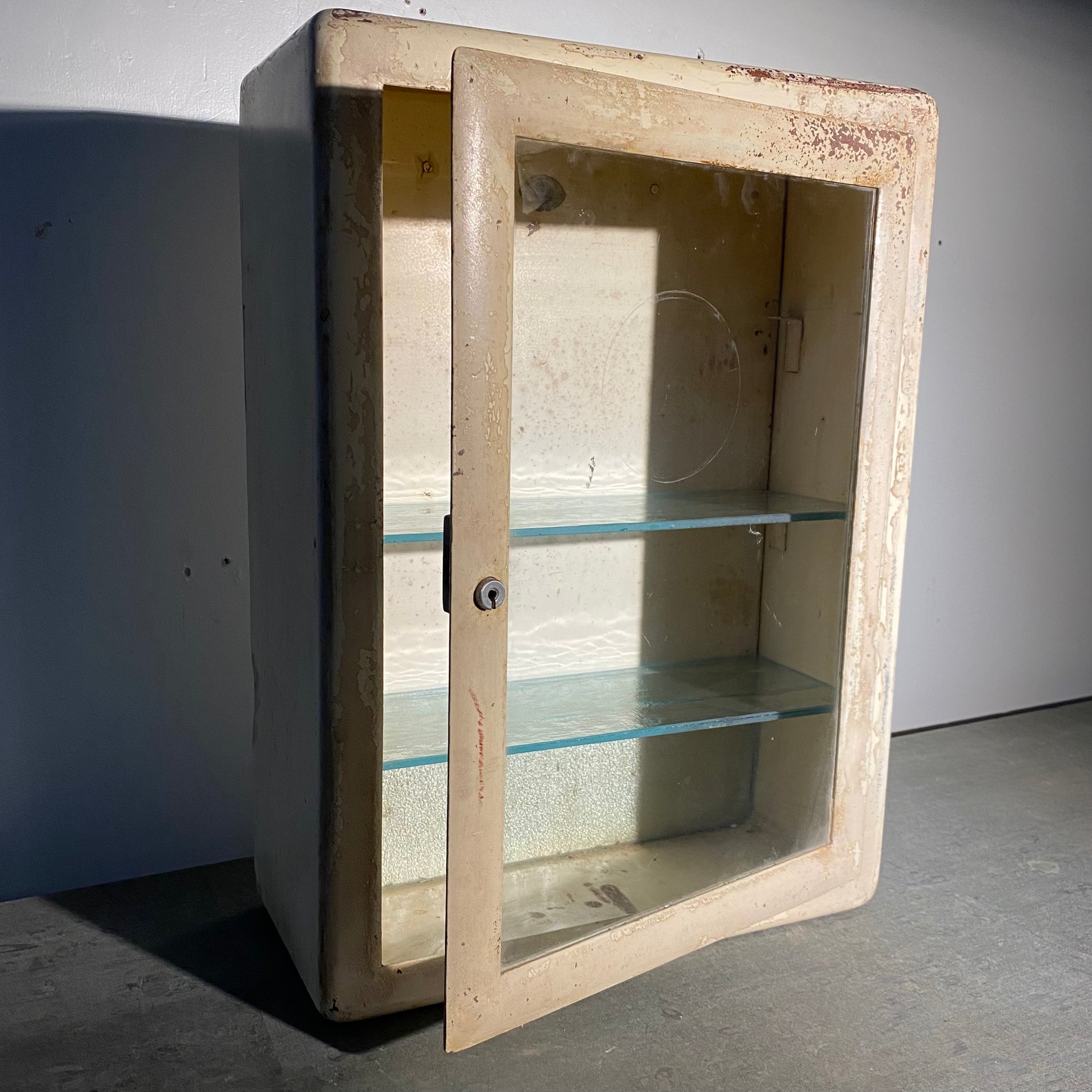 A wonderful metal EUROPEAN MEDICAL /PHARMACY CABINET IN OLD FINISH WITH ADJUSTABLE SHELVING