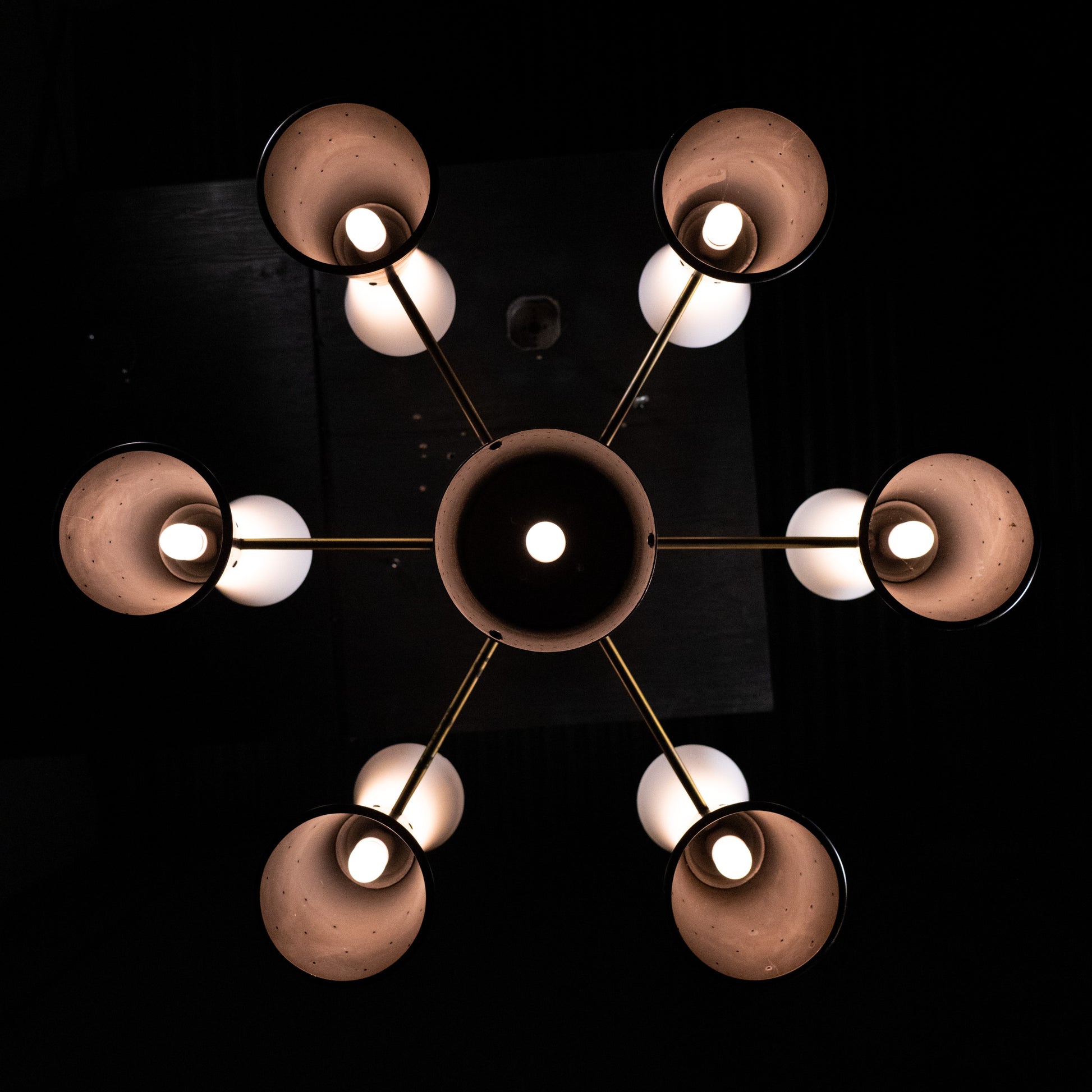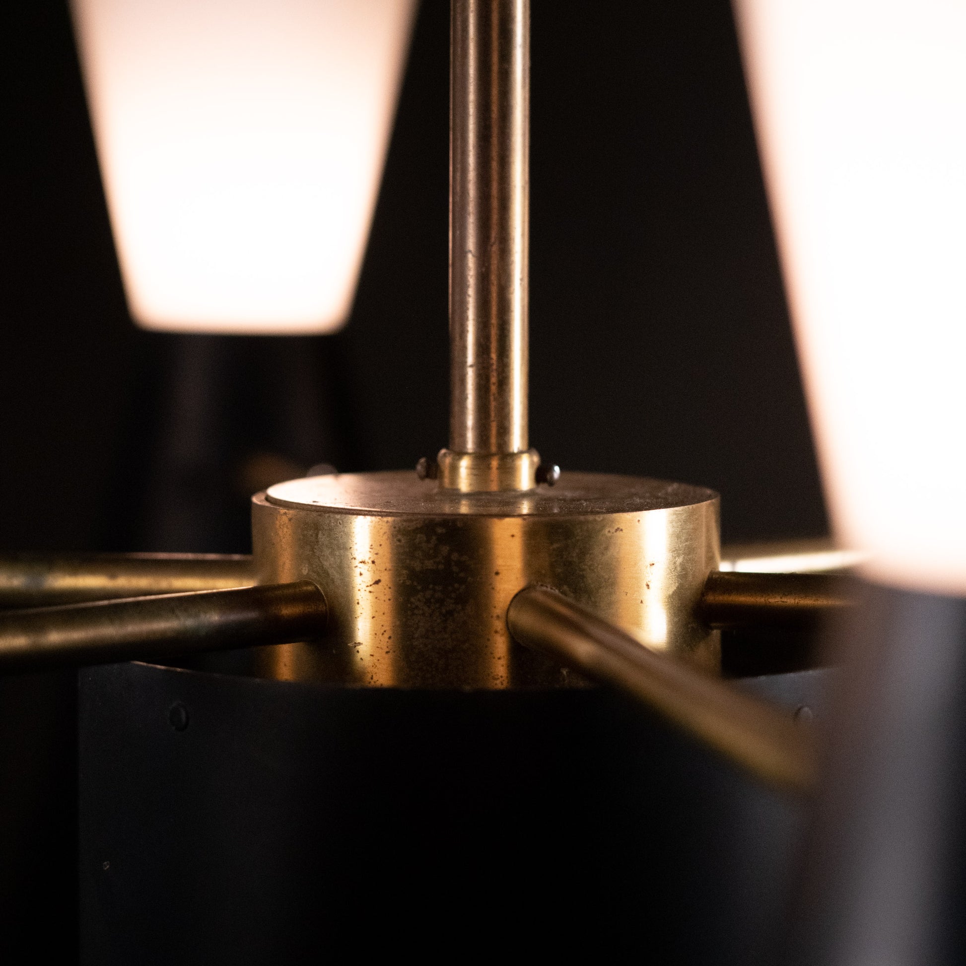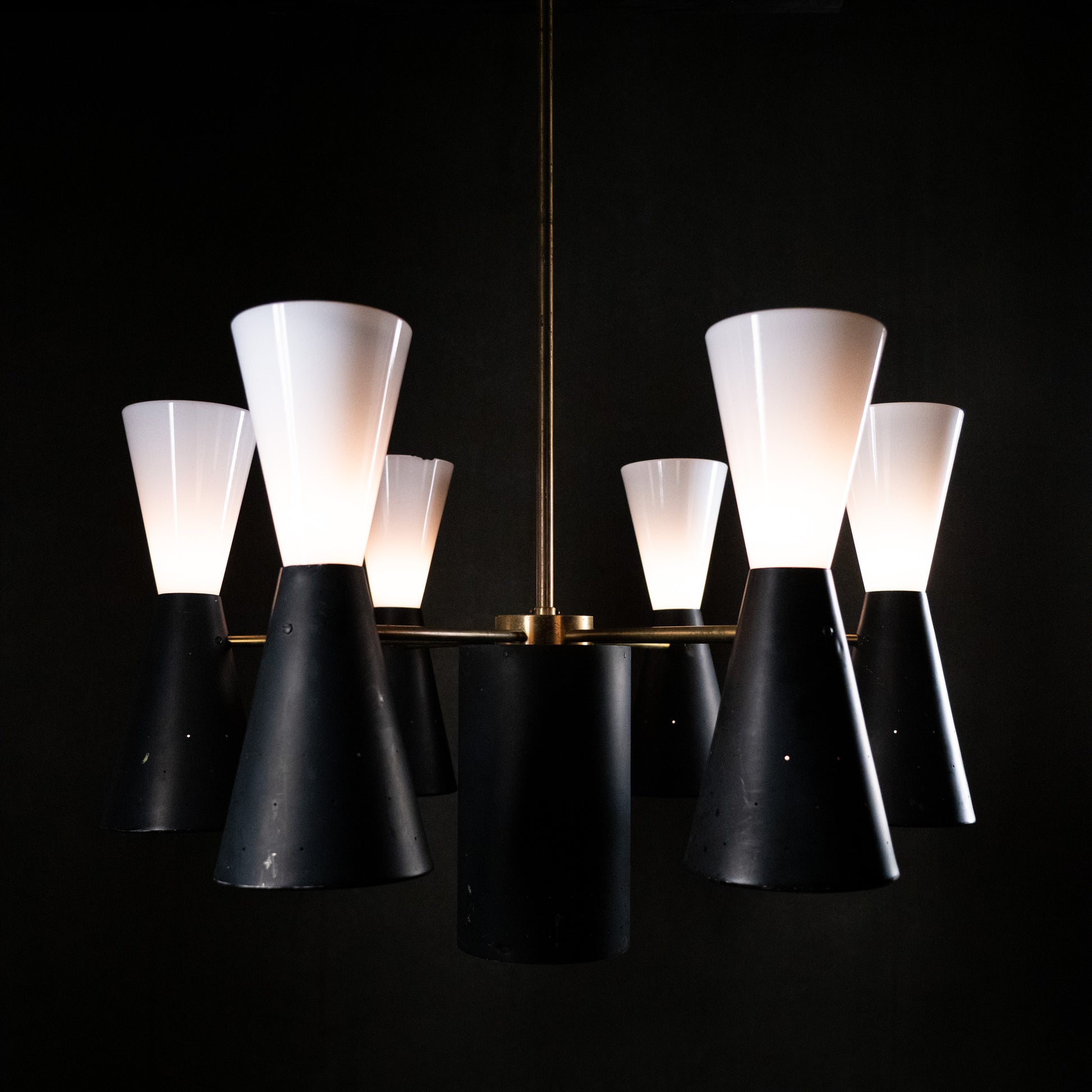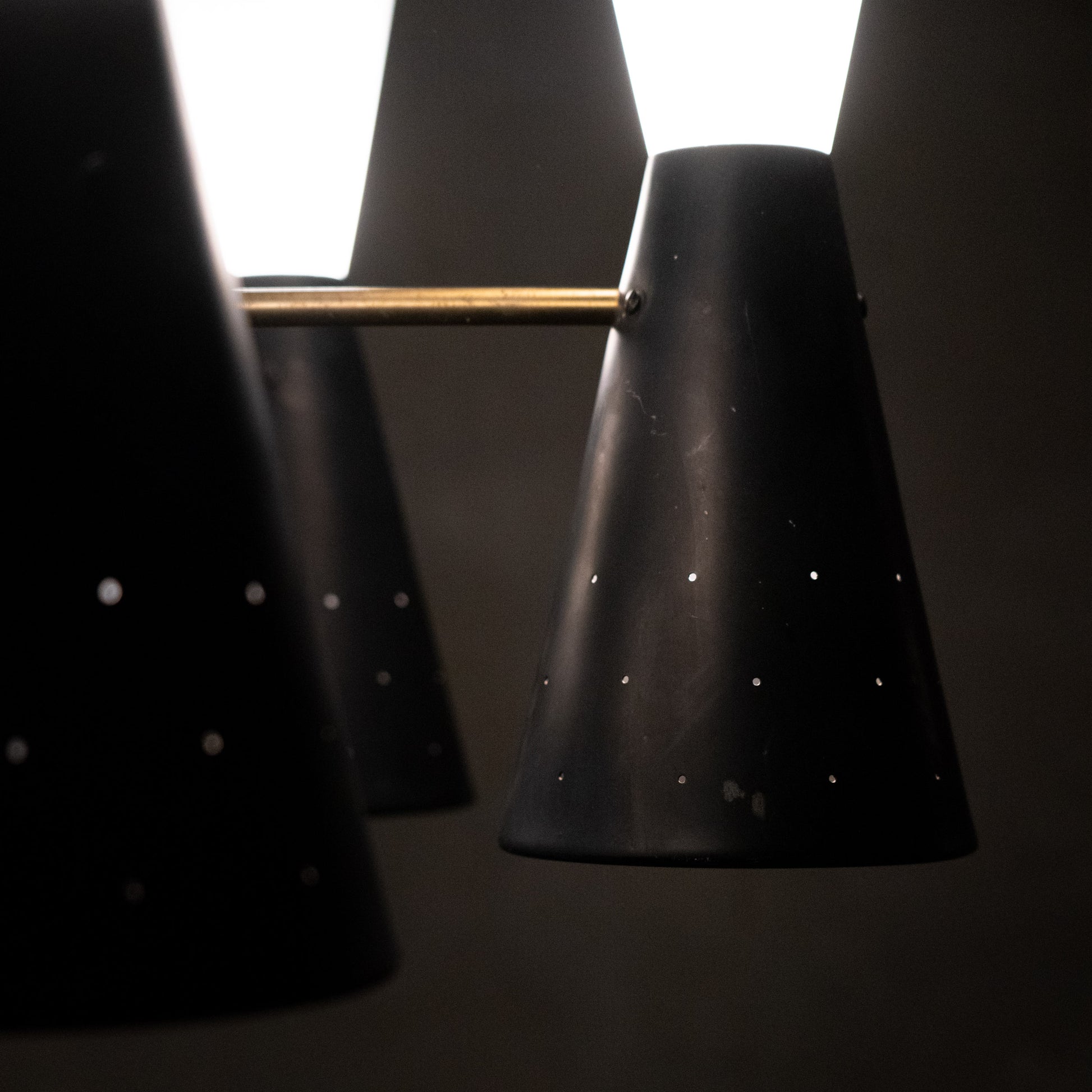A very rare fixture found in the 1970’s at an antique fair in Texas. The light was kept in storage for years in a La collection. It is believed to have been Italian origin. With the ease glas stop globes and popular iconic hour glass shades. A rare find ..rewired and CSA approved.