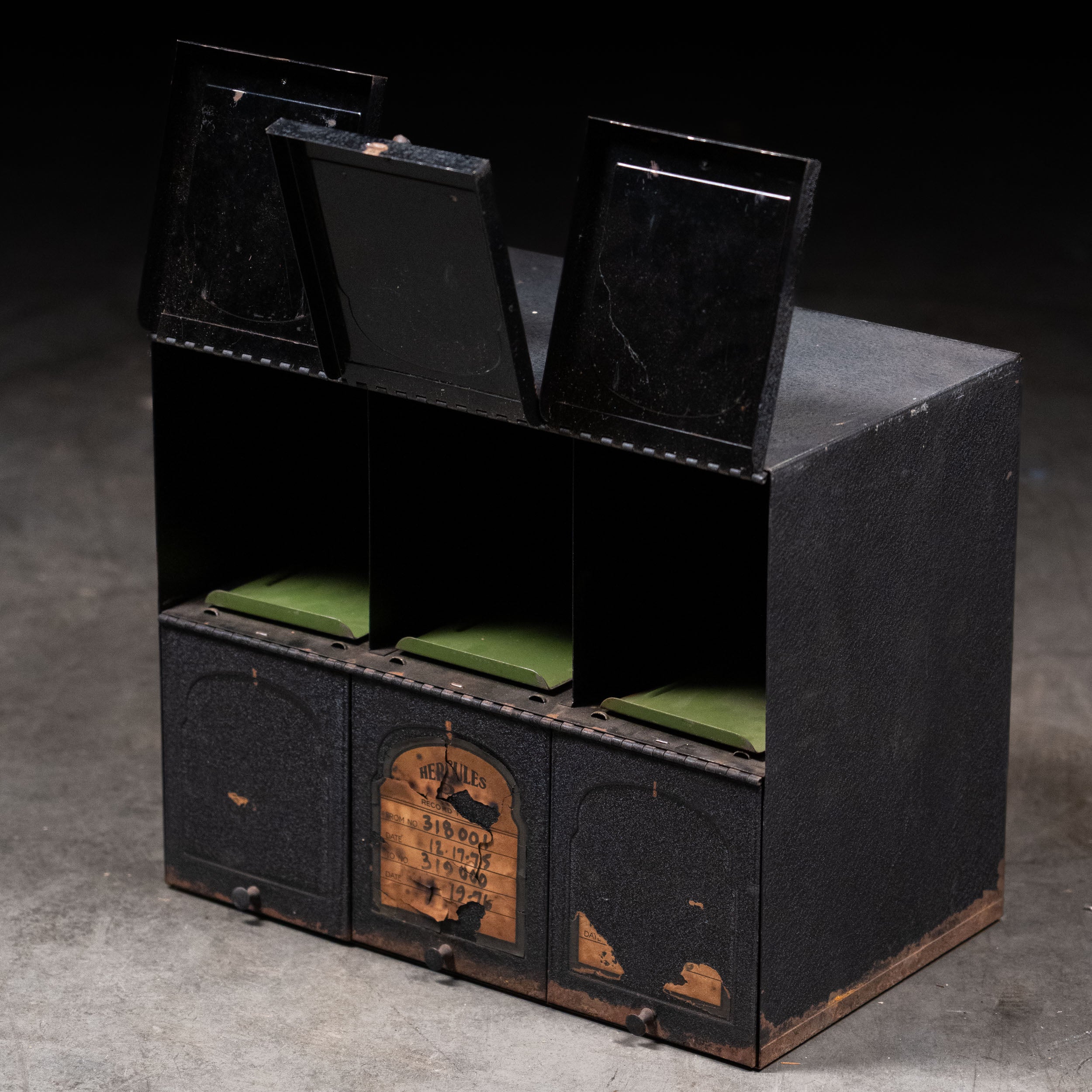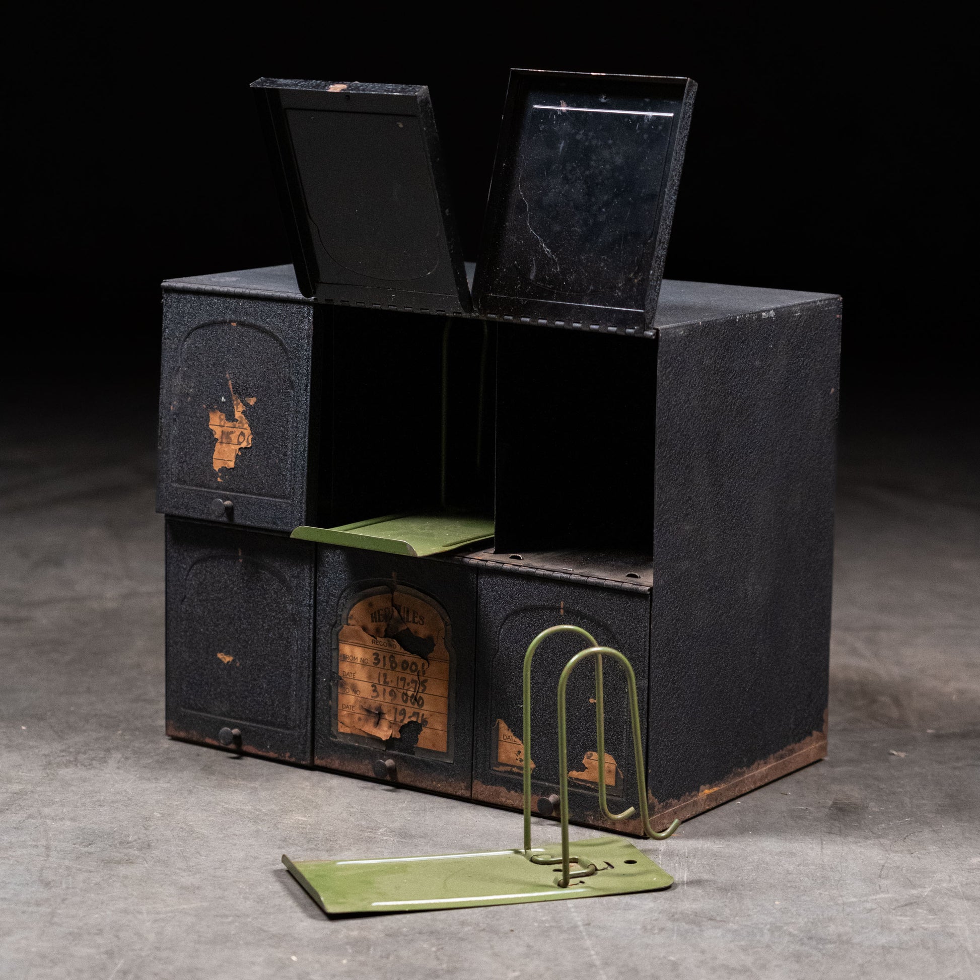 A small counter top cubby with doors and interior clip boards for storage and sorting papers. Found in France.