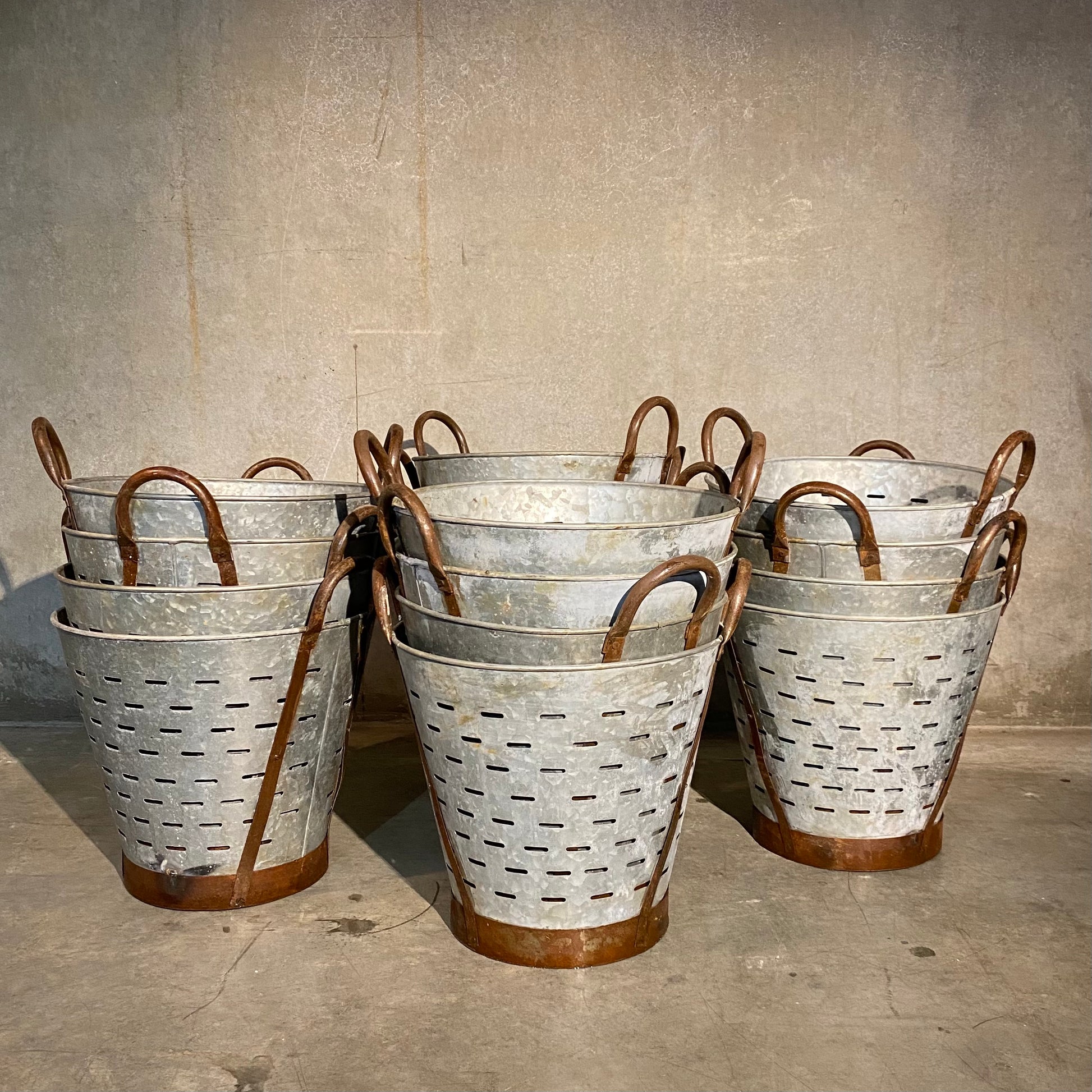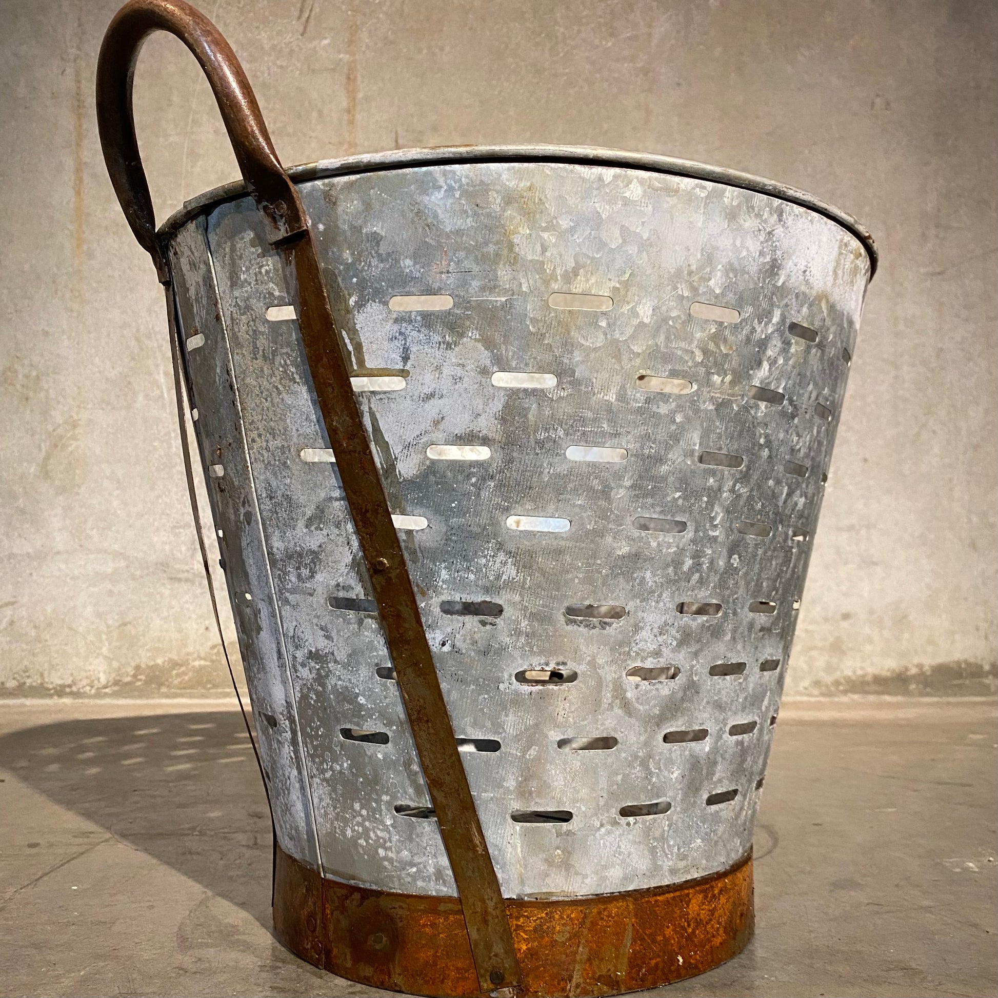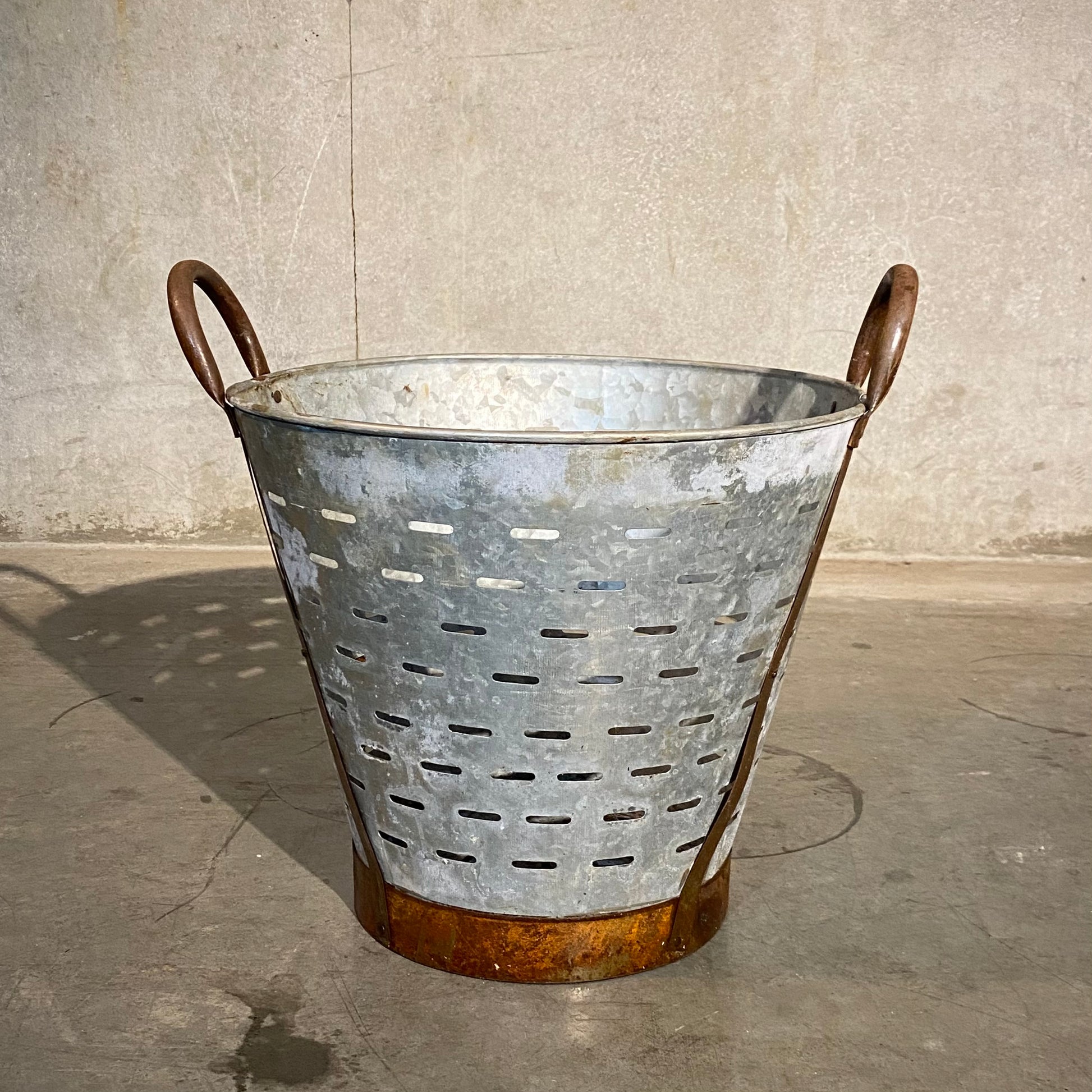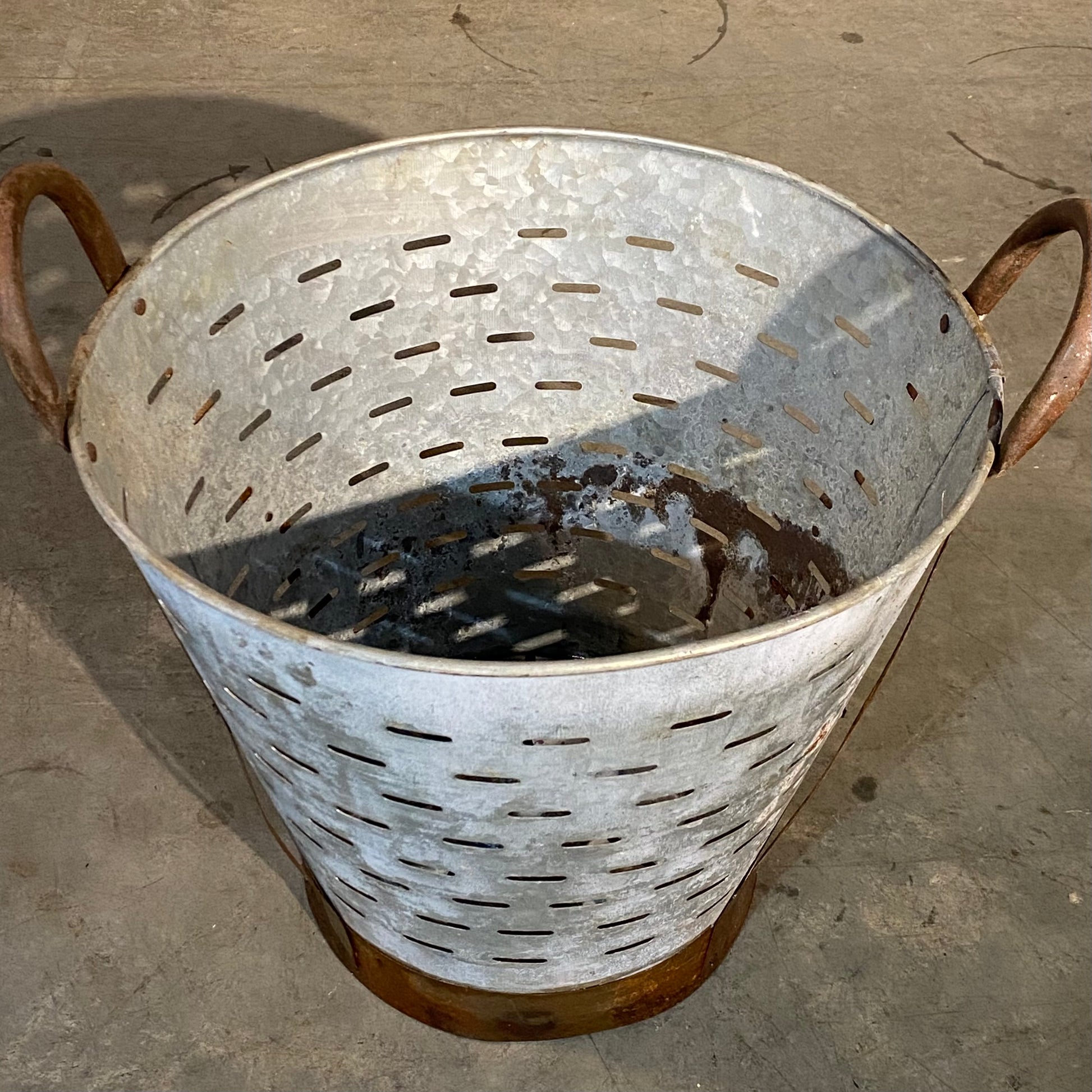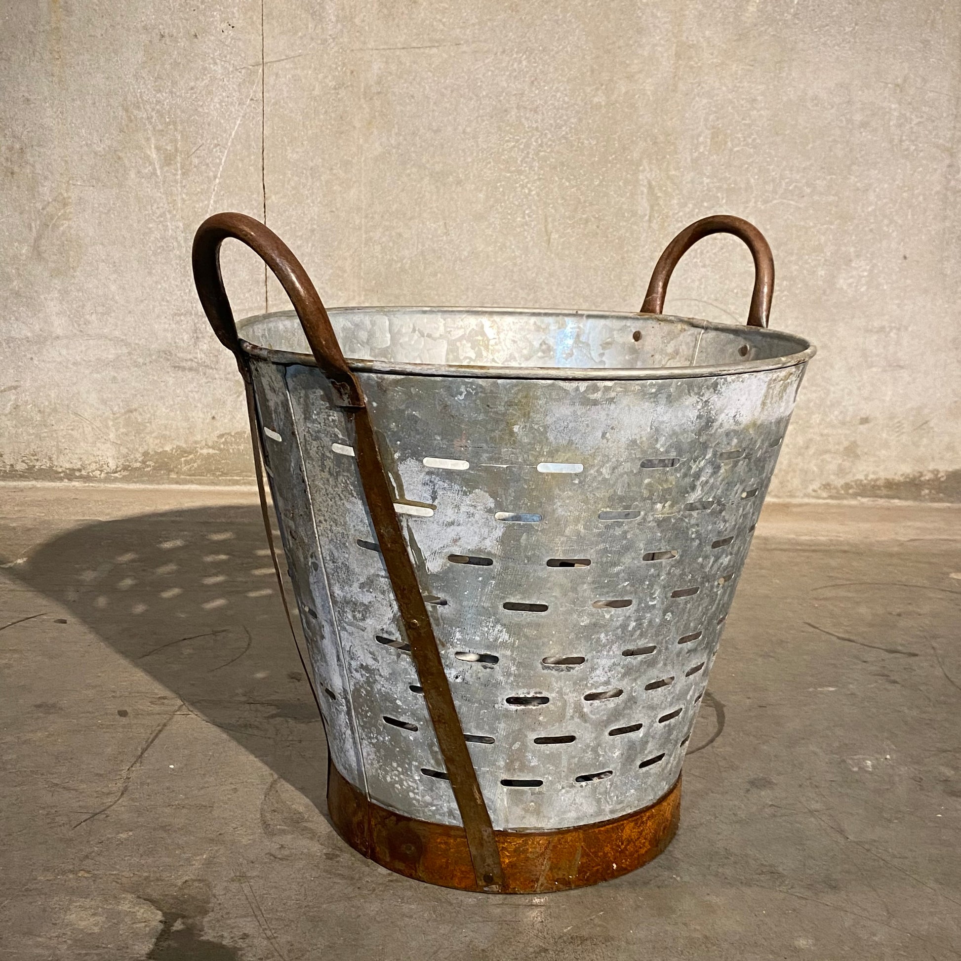 This piece also features slit drainage holes and rustic handles. These buckets were used to gather Olives in countries along the Mediterranean Sea, but can also be used to harvest vegetables, store fire wood or potted plants.