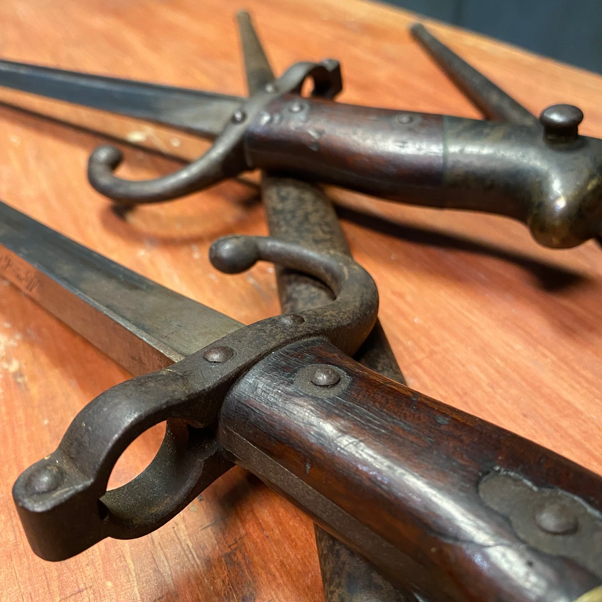 Signed and dated authentic bayonets with matching numbered scabbards with brass details perfect patina. We have two examples. .