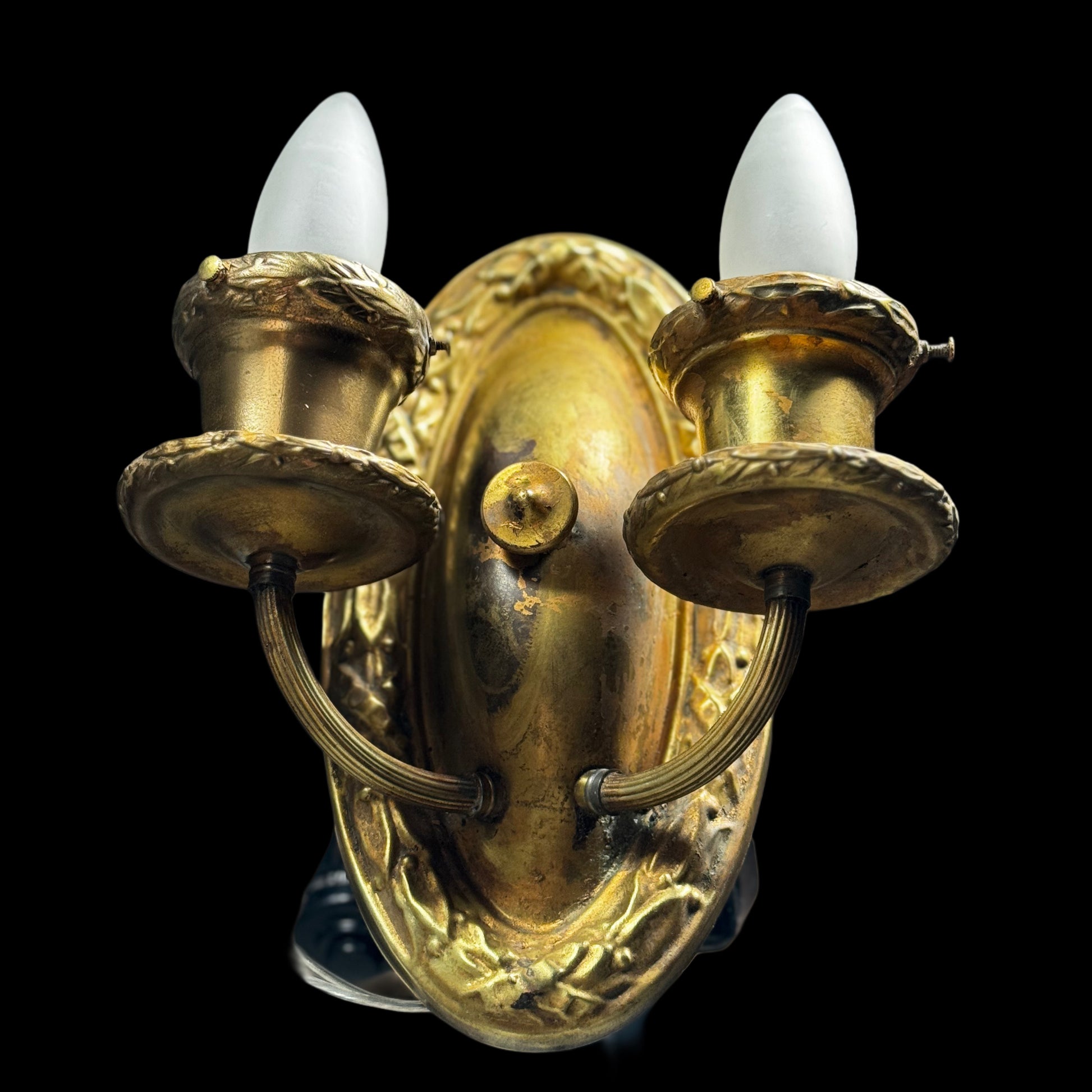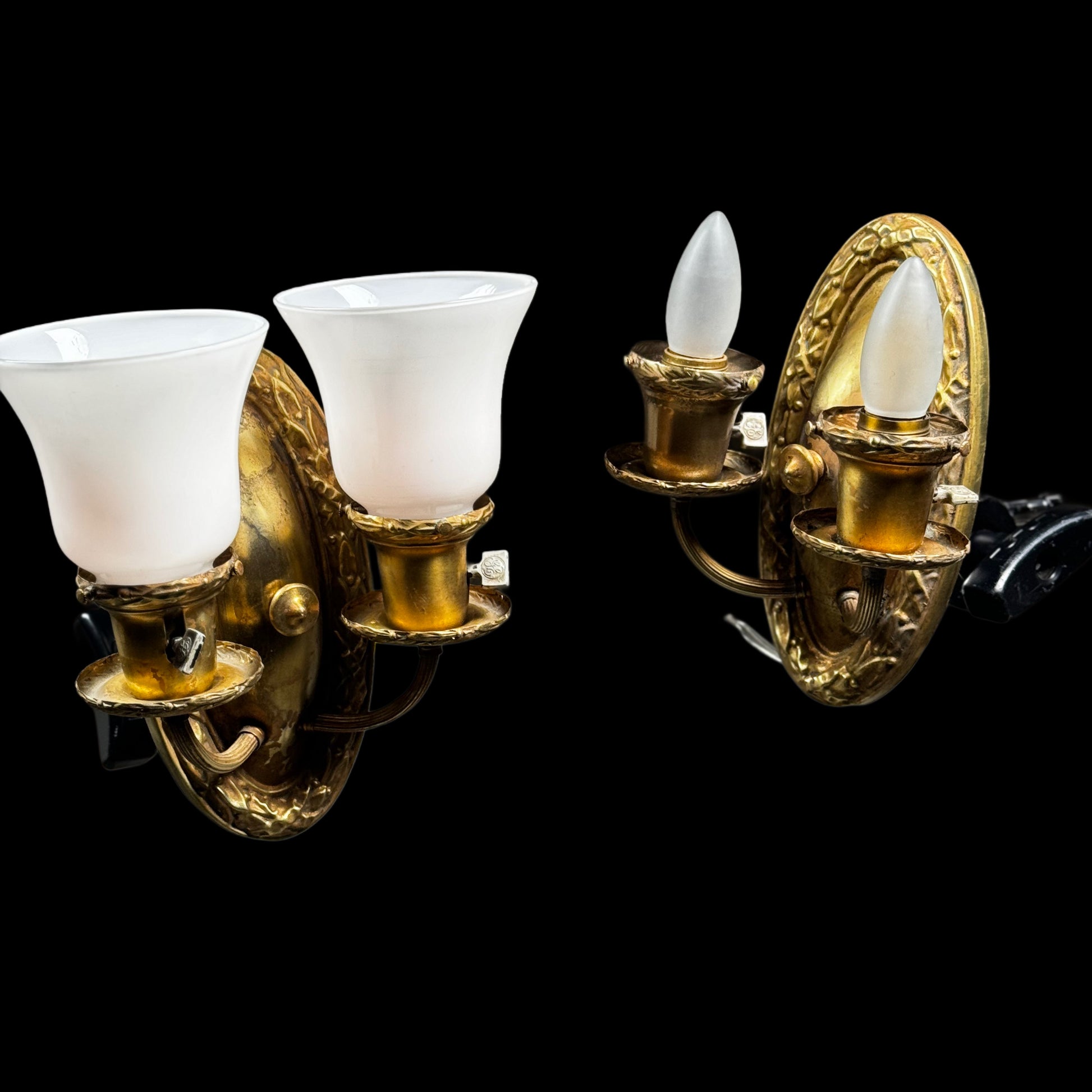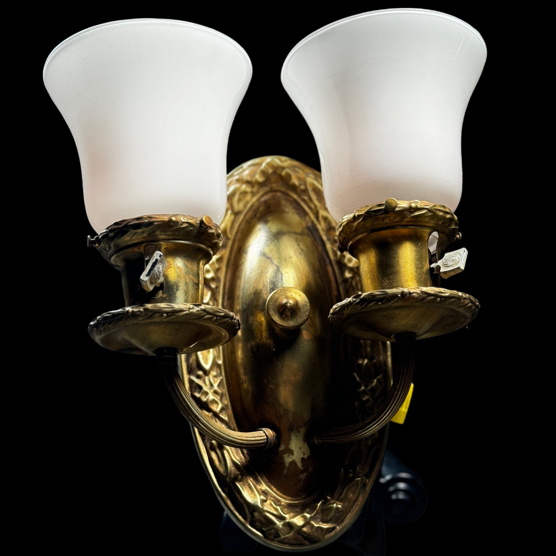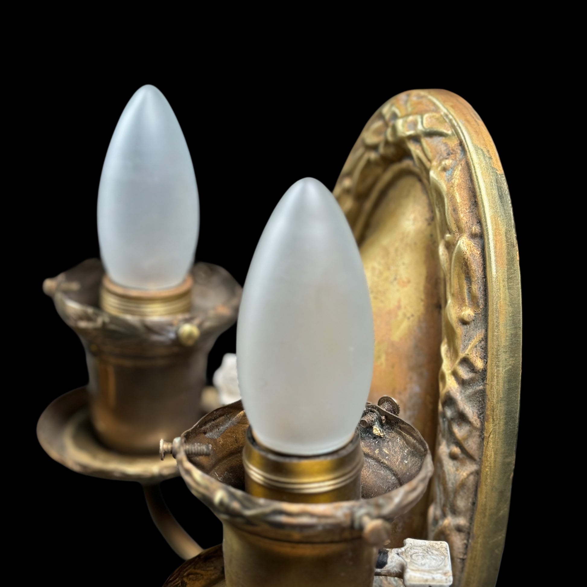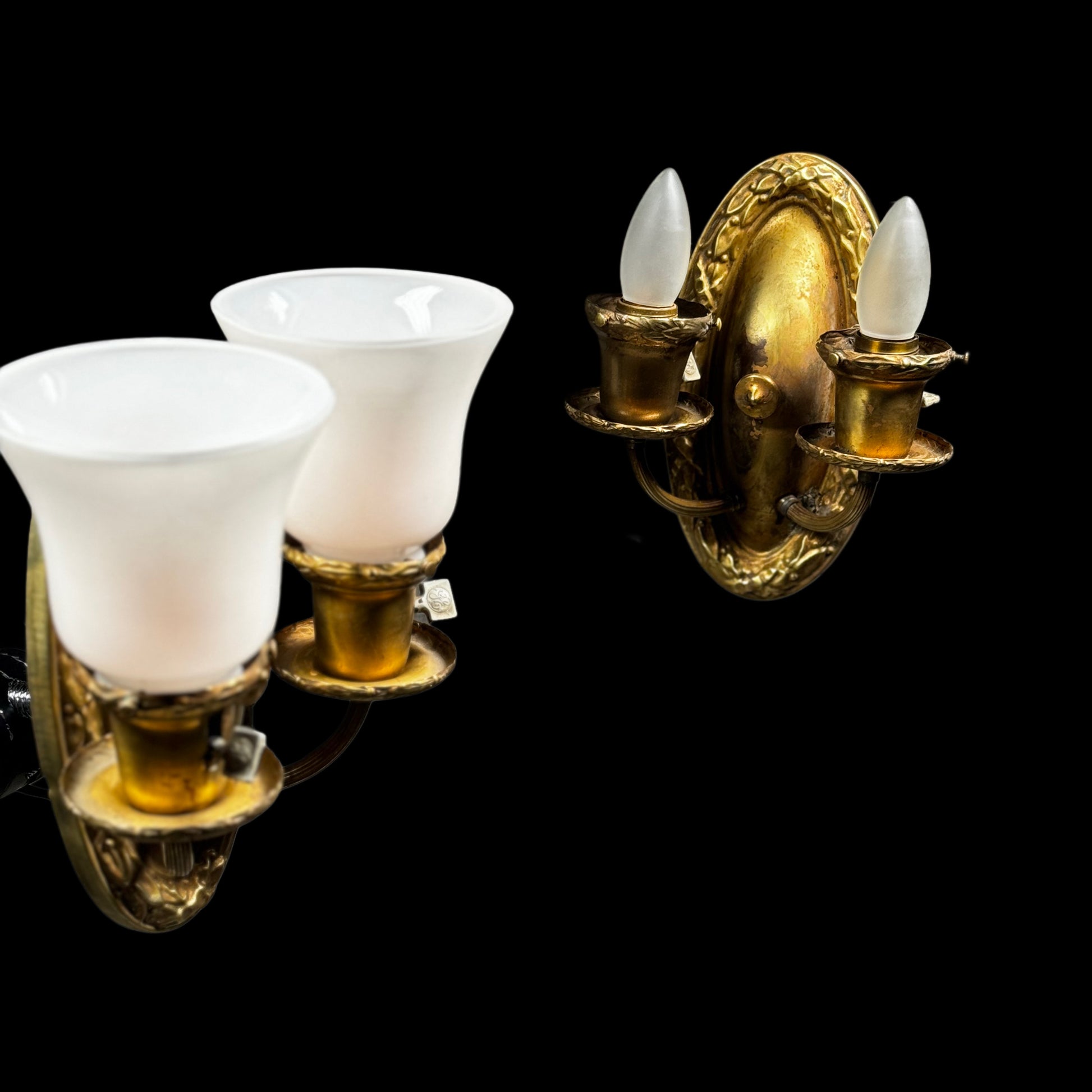 A very nice pair adaptable shades or simple decorative bulbs. Showing nice patina, rewired and CSA pending.