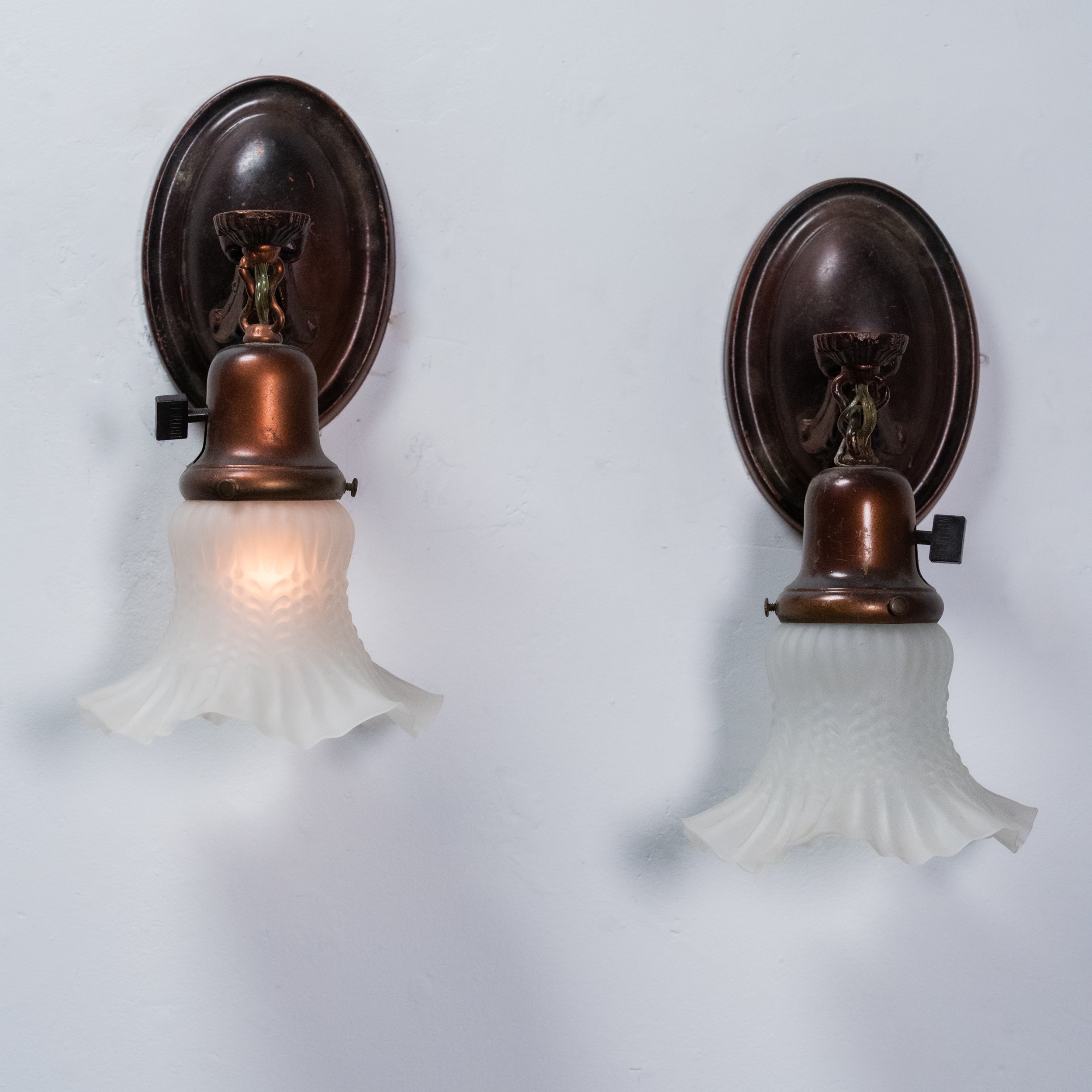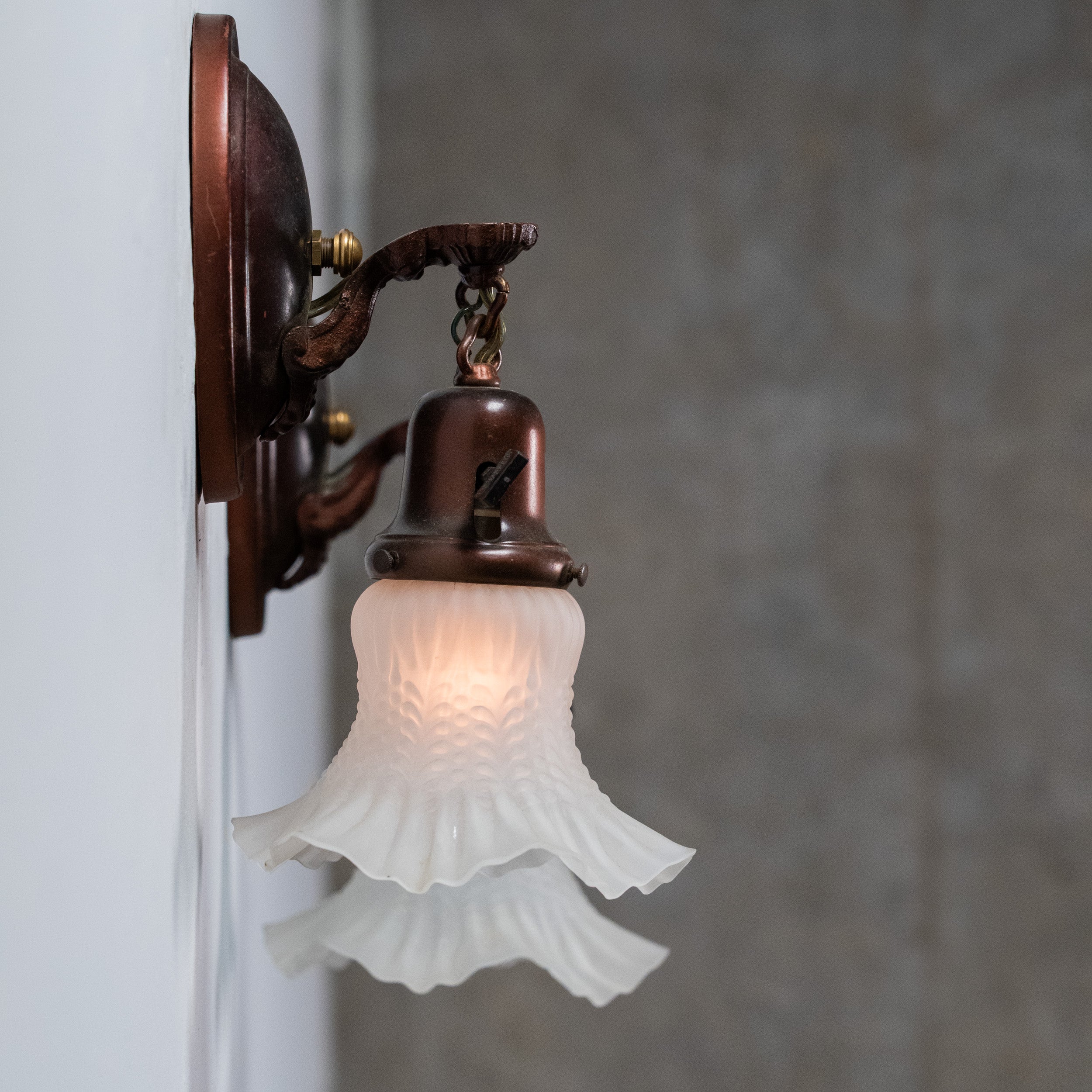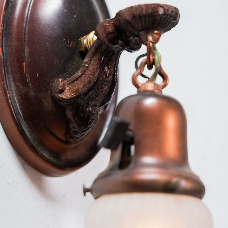 Lights are copper with some brass highlights with great glass molded shades. Found in Montreal.
