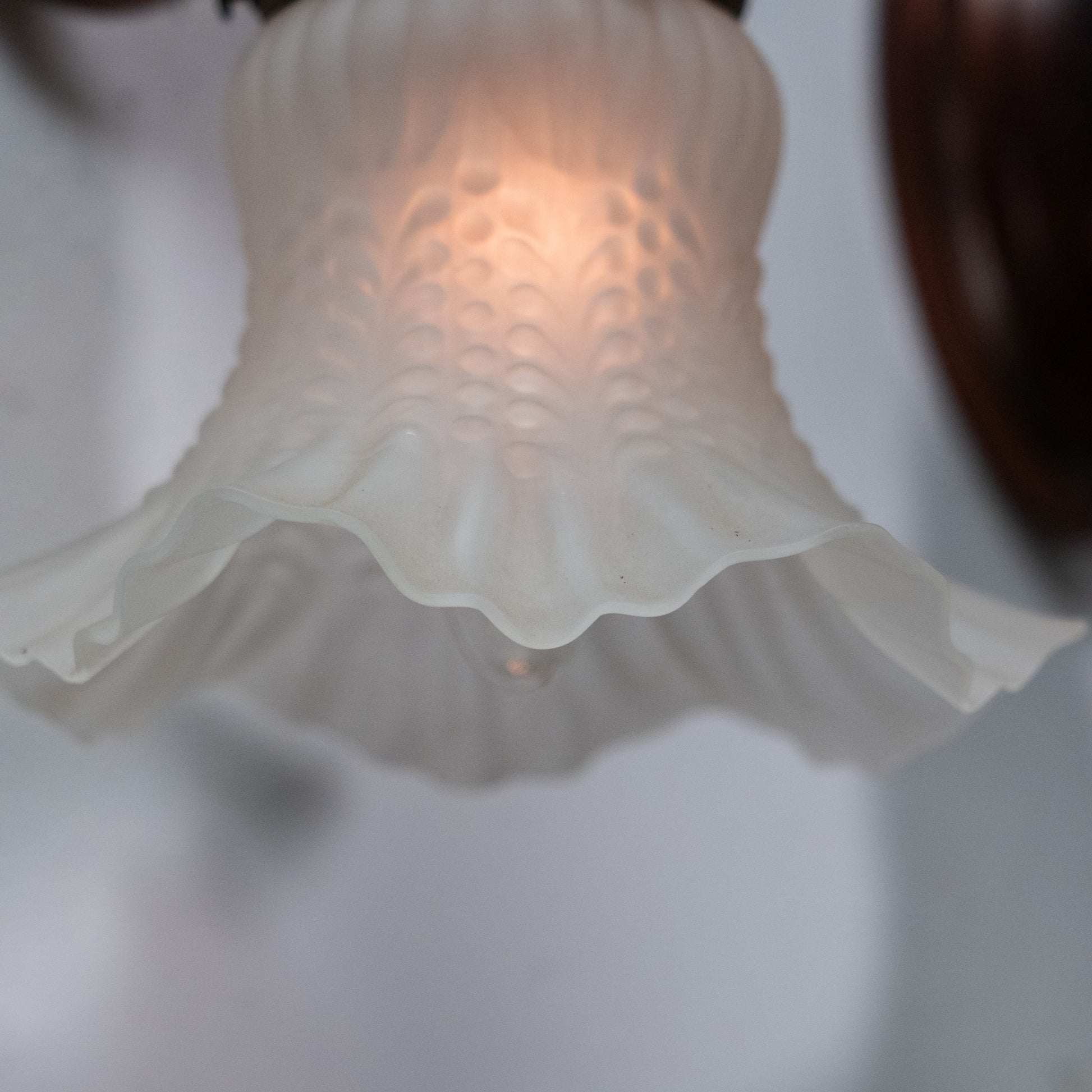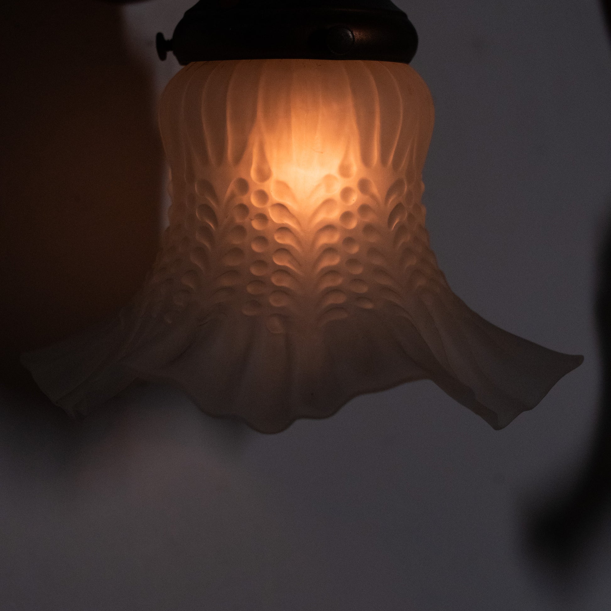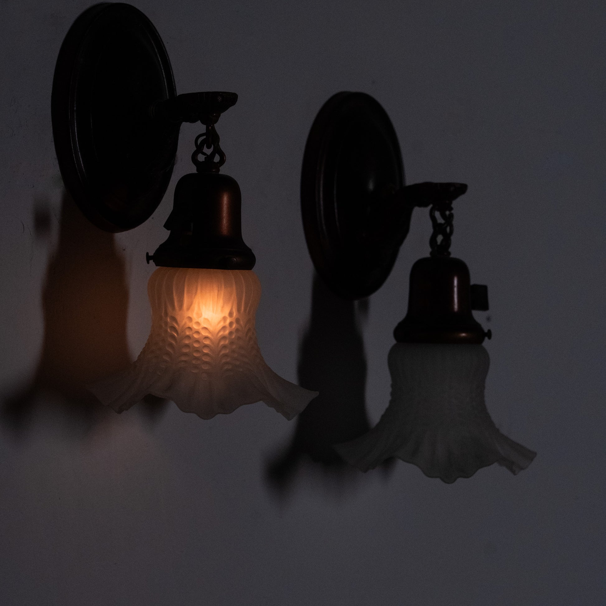 Lights are copper with some brass highlights with great glass molded shades. Found in Montreal.