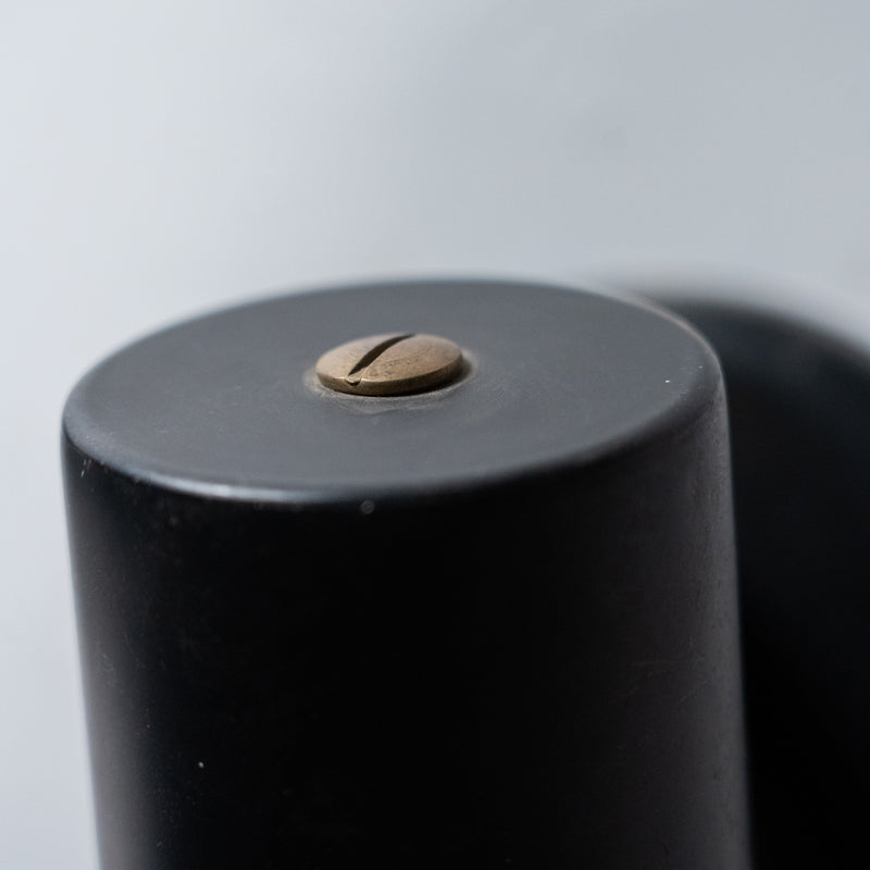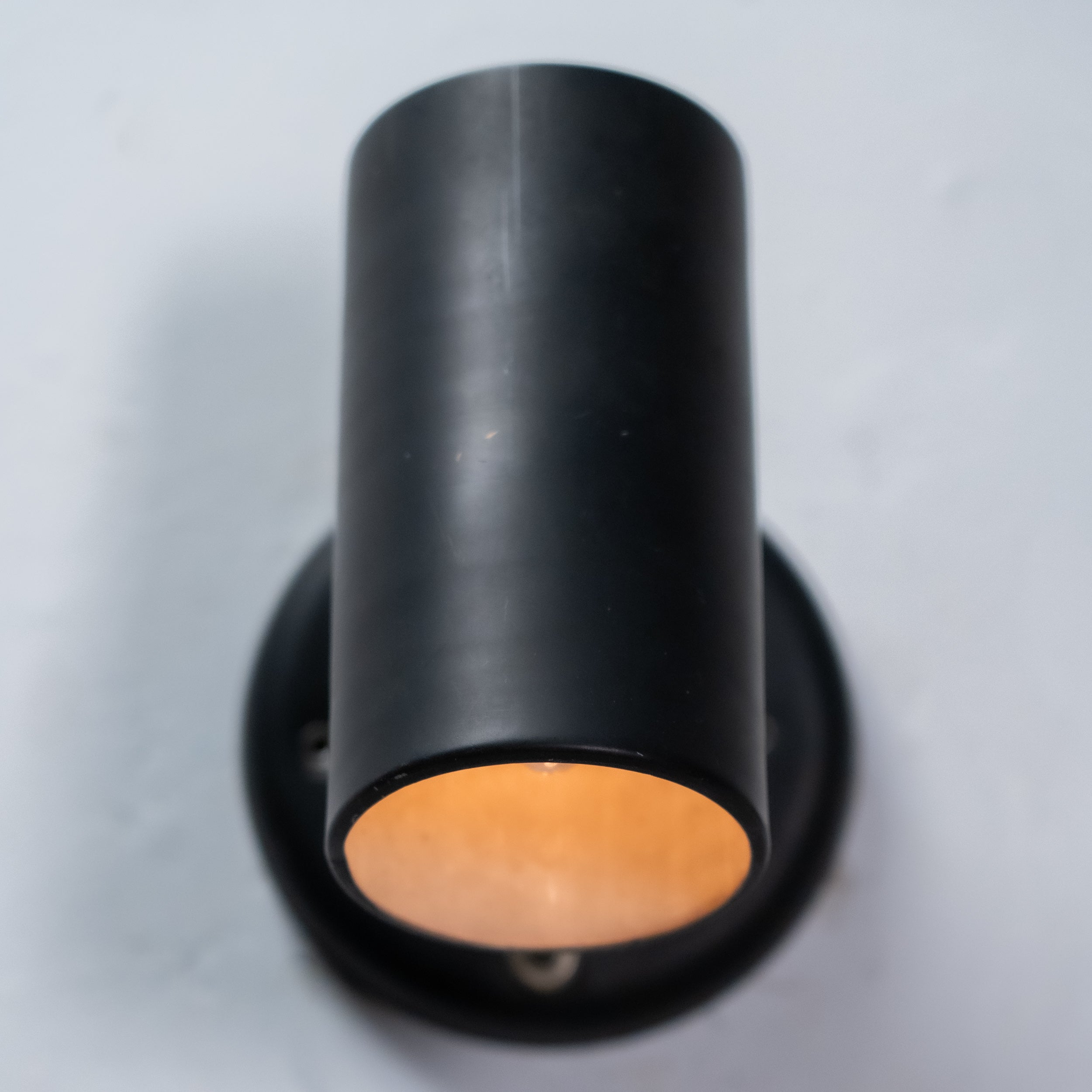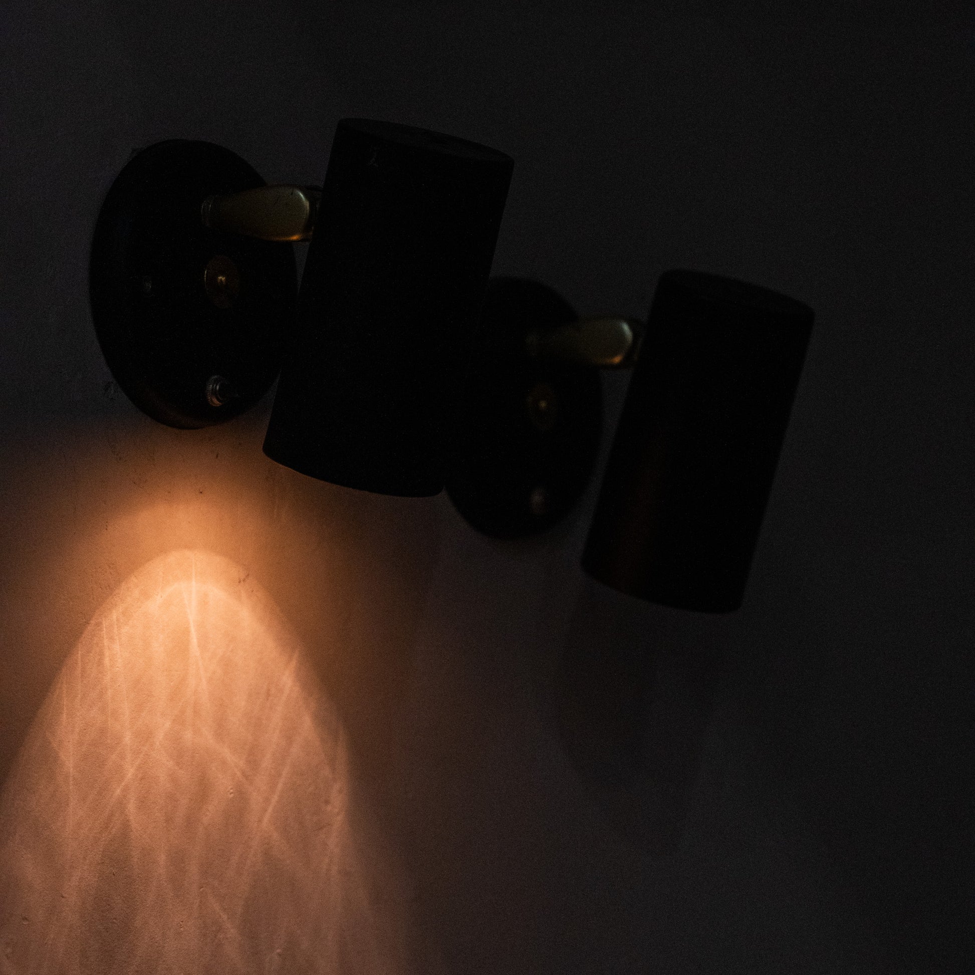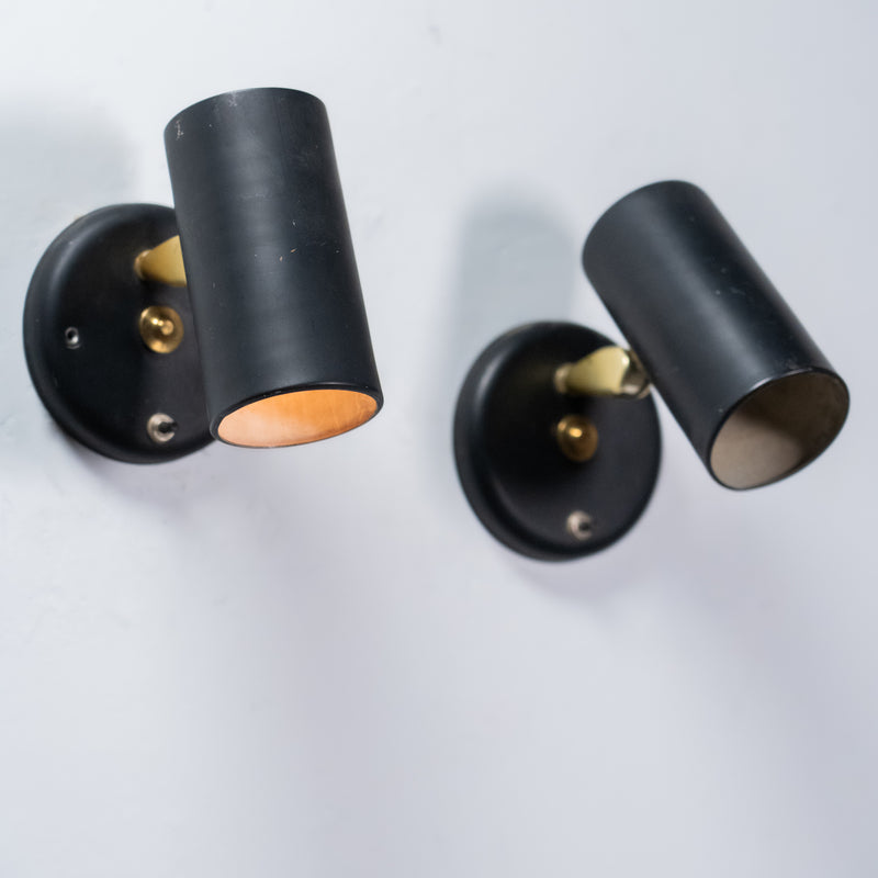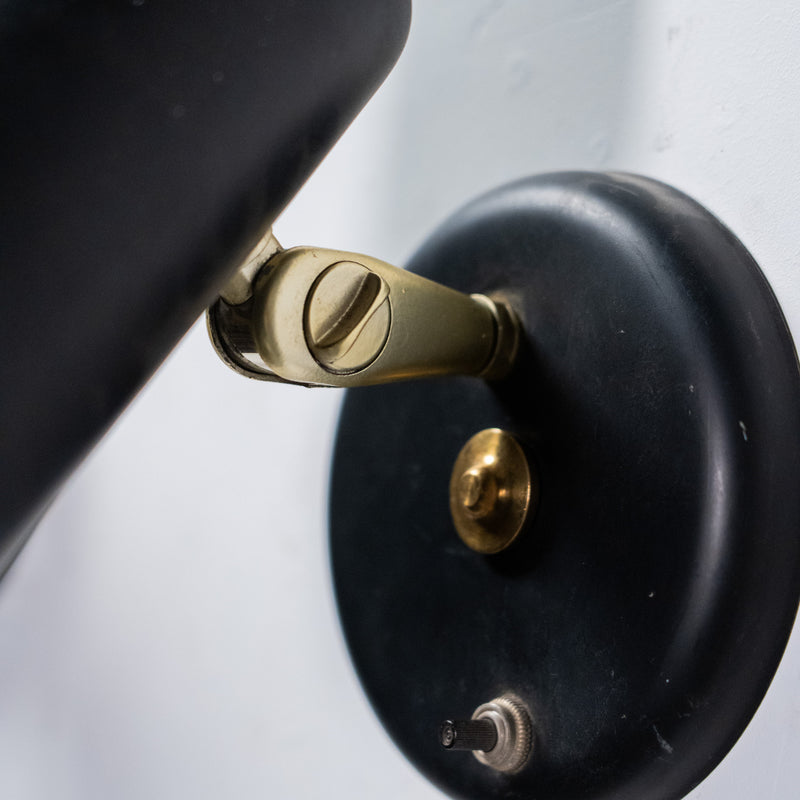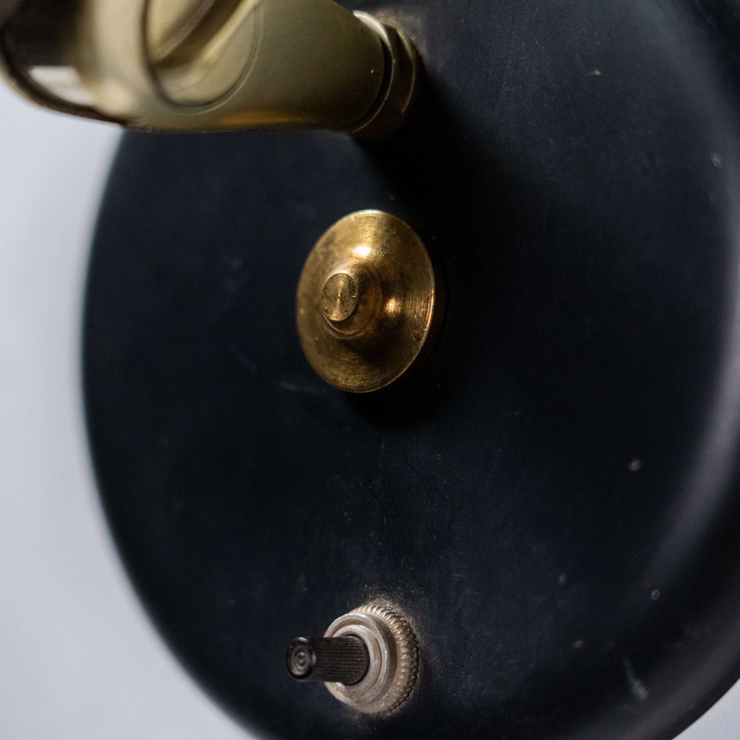 Pair of period lighting salvaged from a building in Vancouver built in 1955. Power switch, brass highlights. Nice black factory finish.
