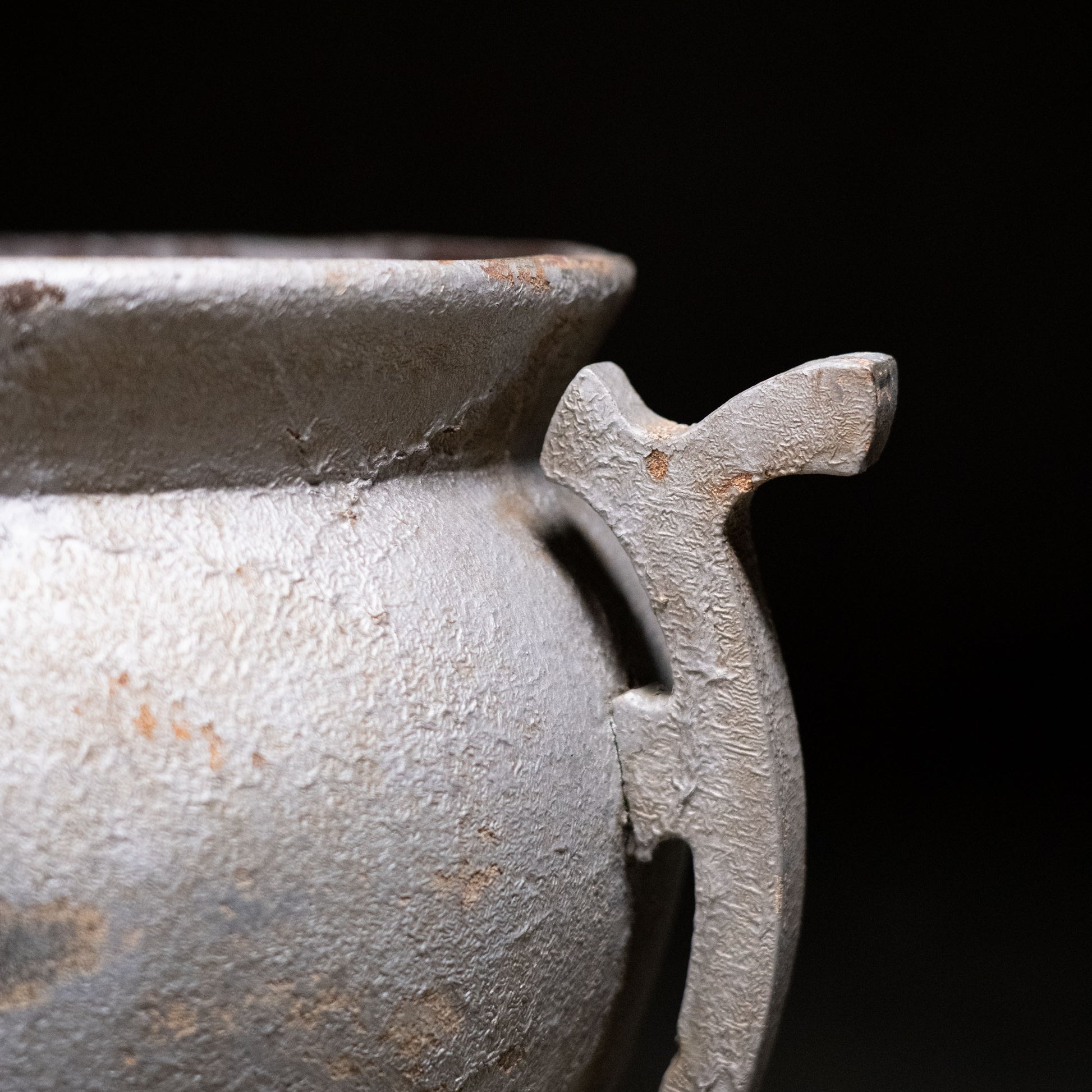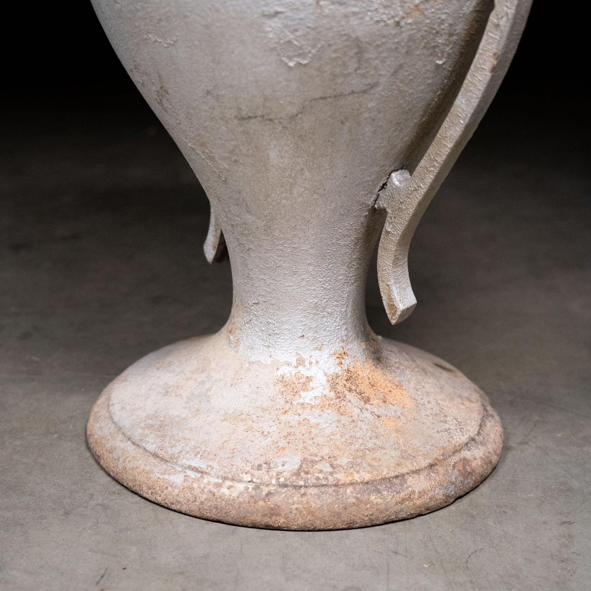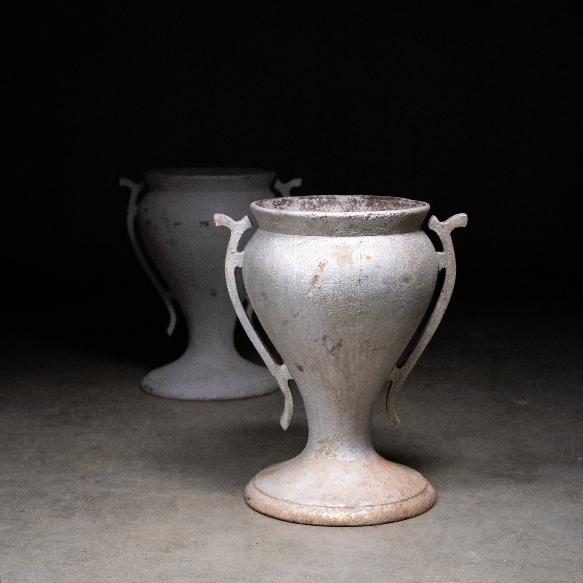 A nice pair of old multi coat painted cast iron urns by Kramer brothers.