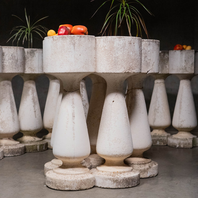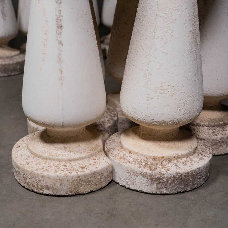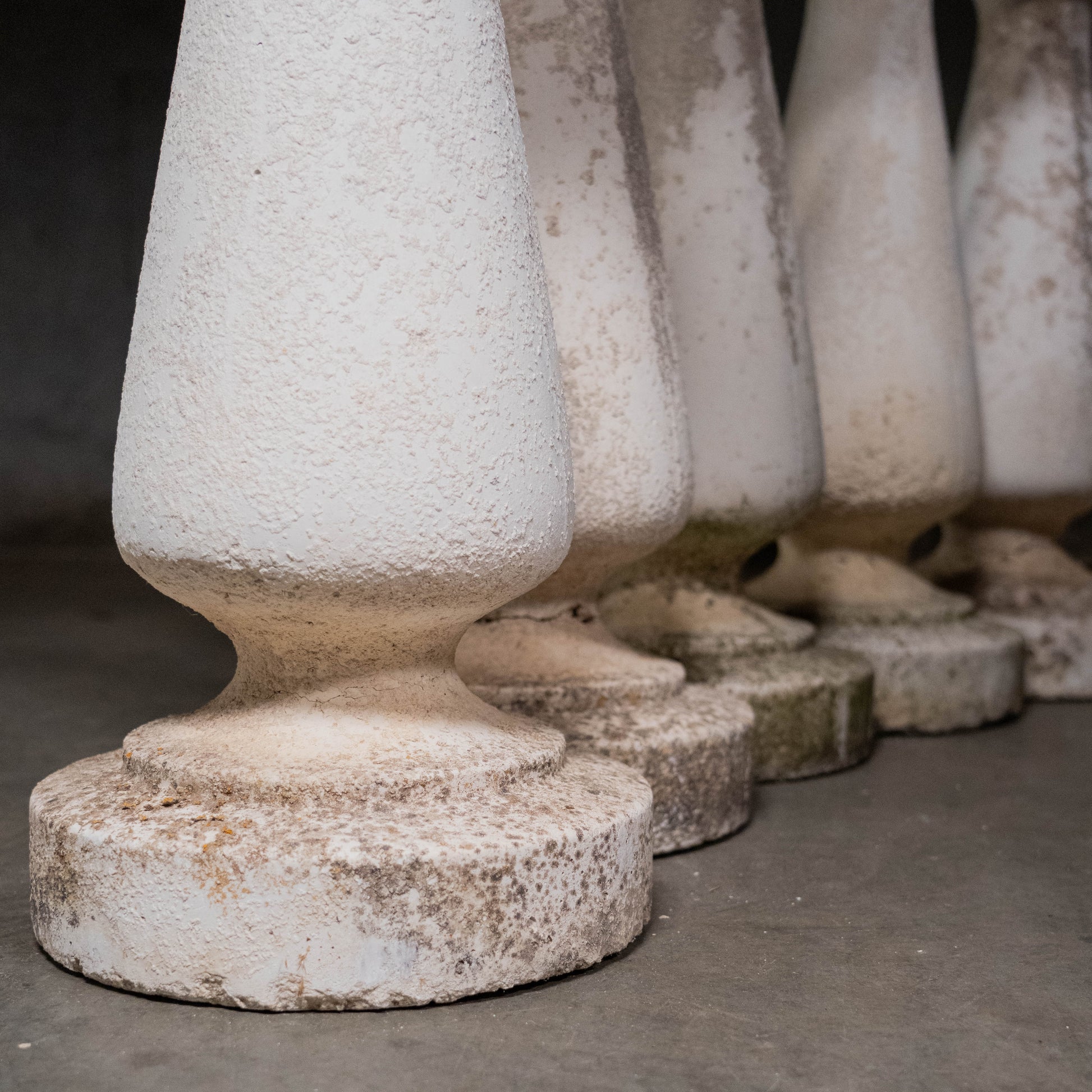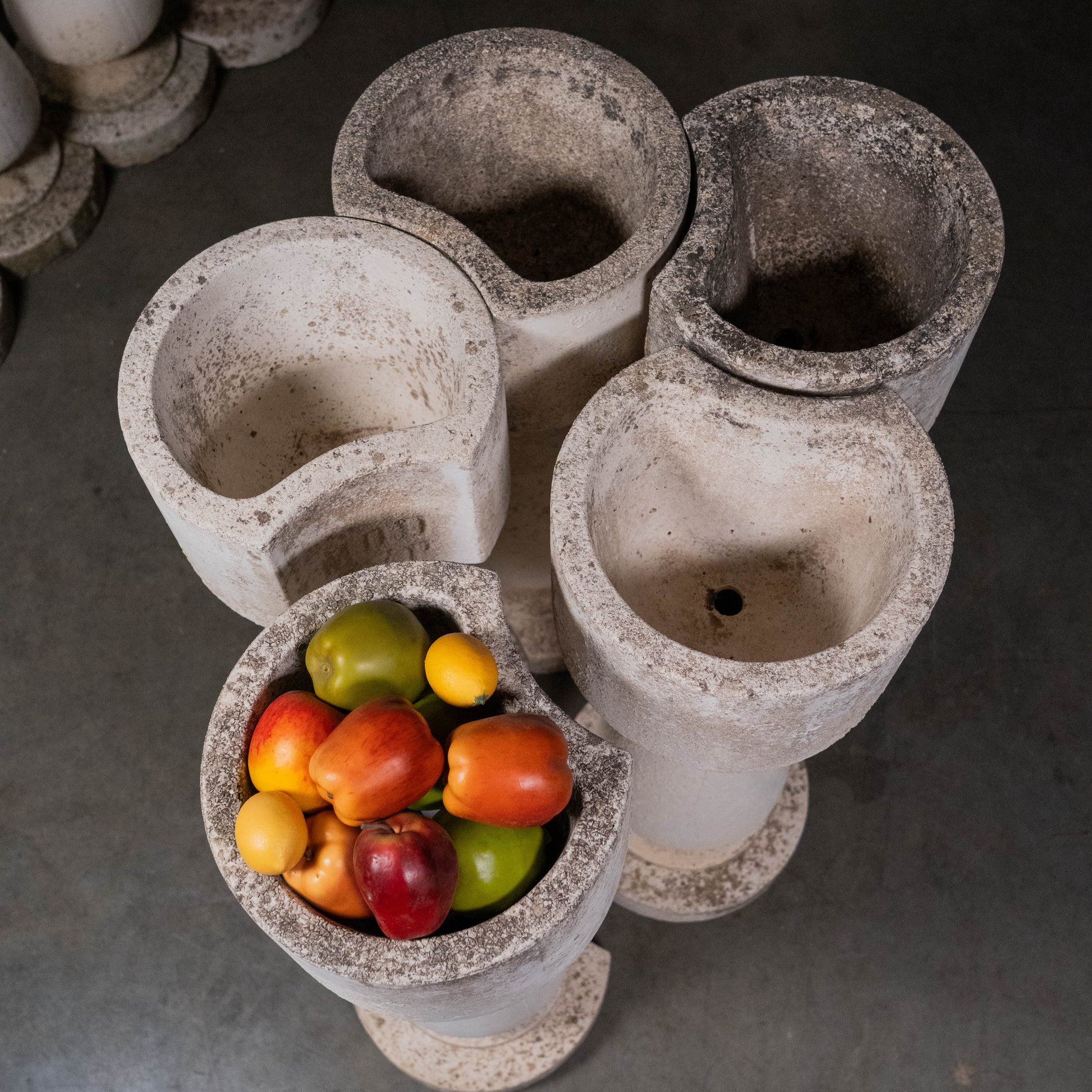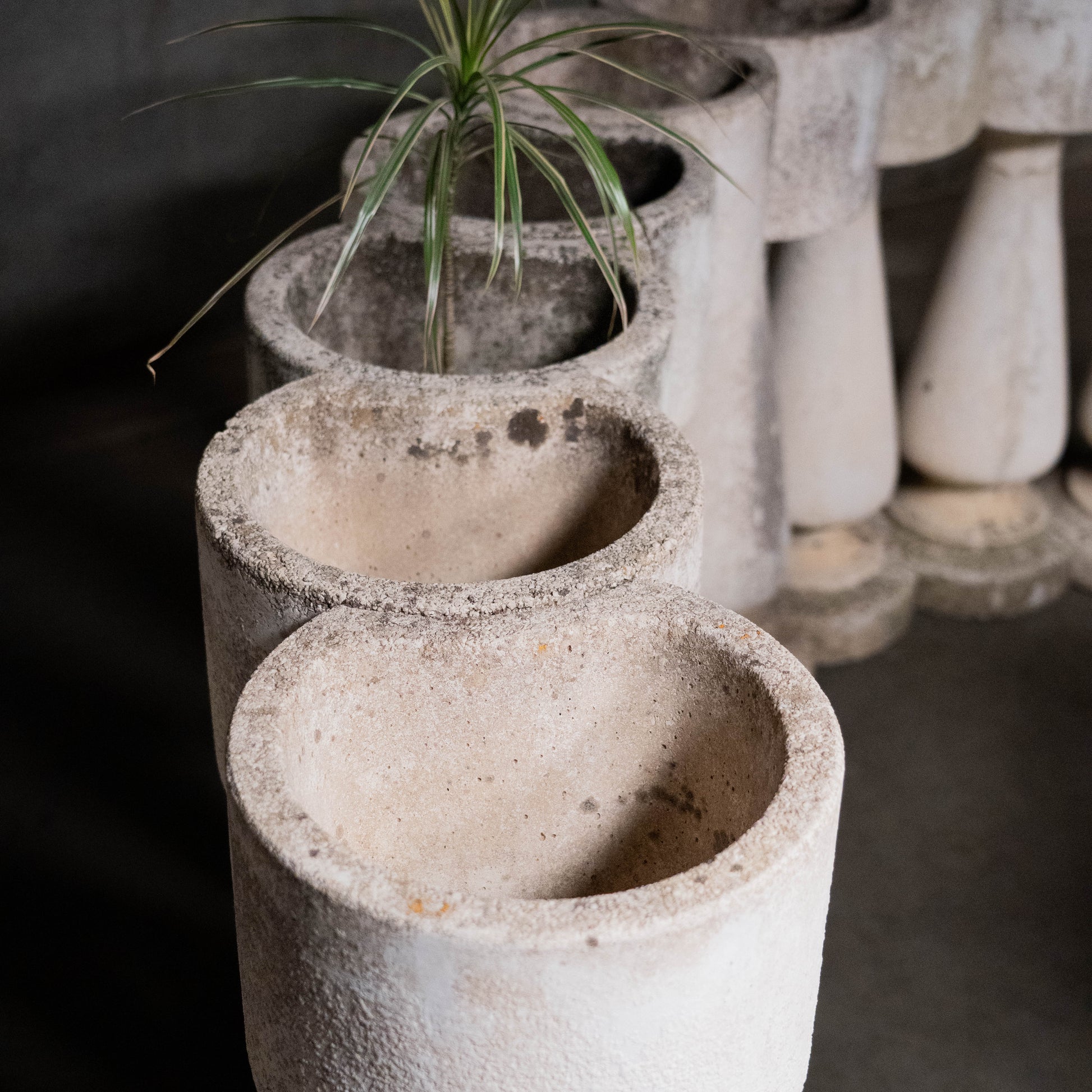 A rare set of mid-century French interlocking concrete planters, sculptural in form and designed to install individually or as modular architectural groupings. Each planter features a cast-stone hourglass pedestal supporting a cylindrical planting basin, creating a bold totem-like silhouette with exceptional presence.