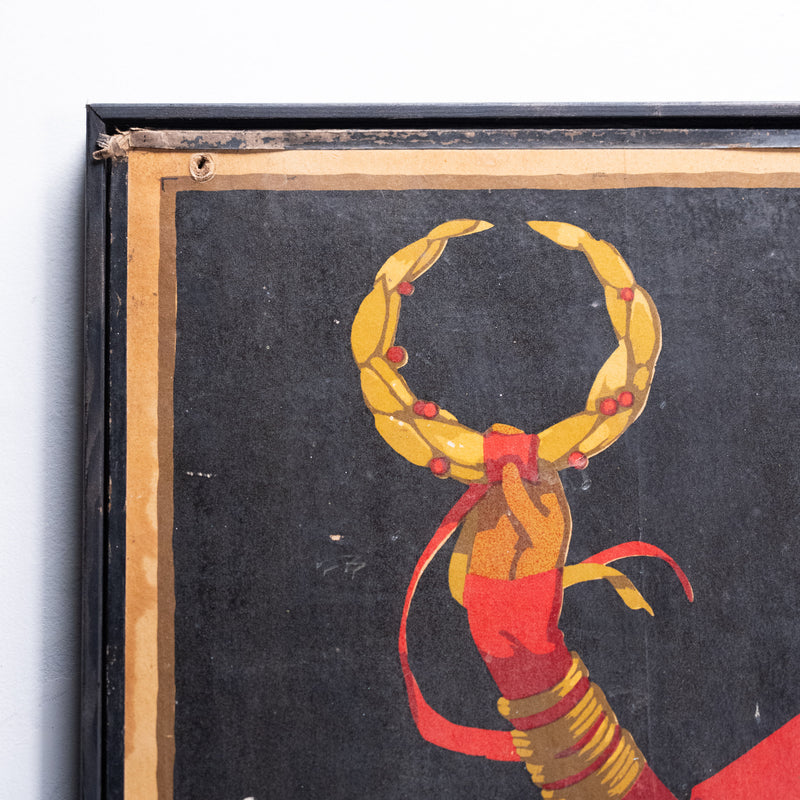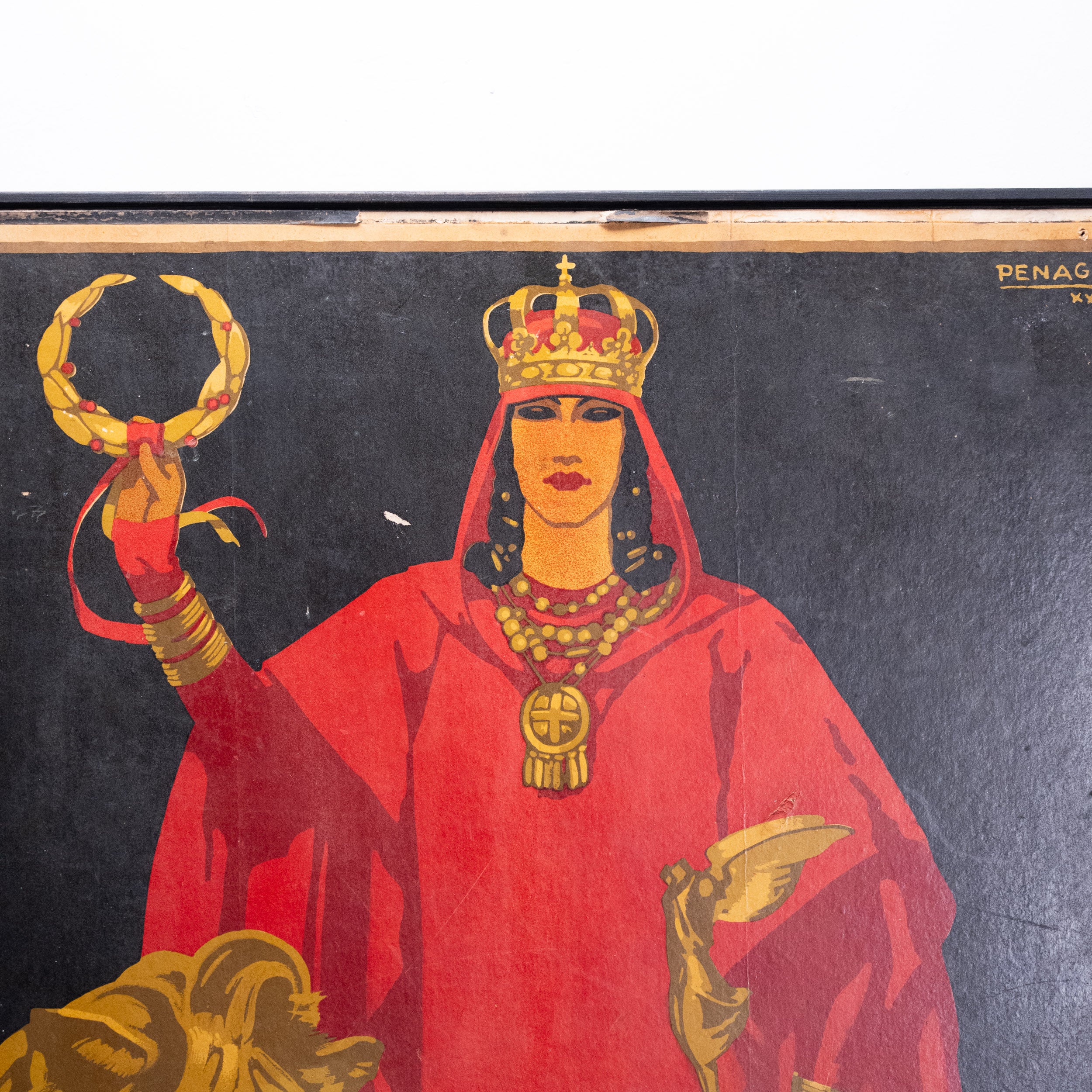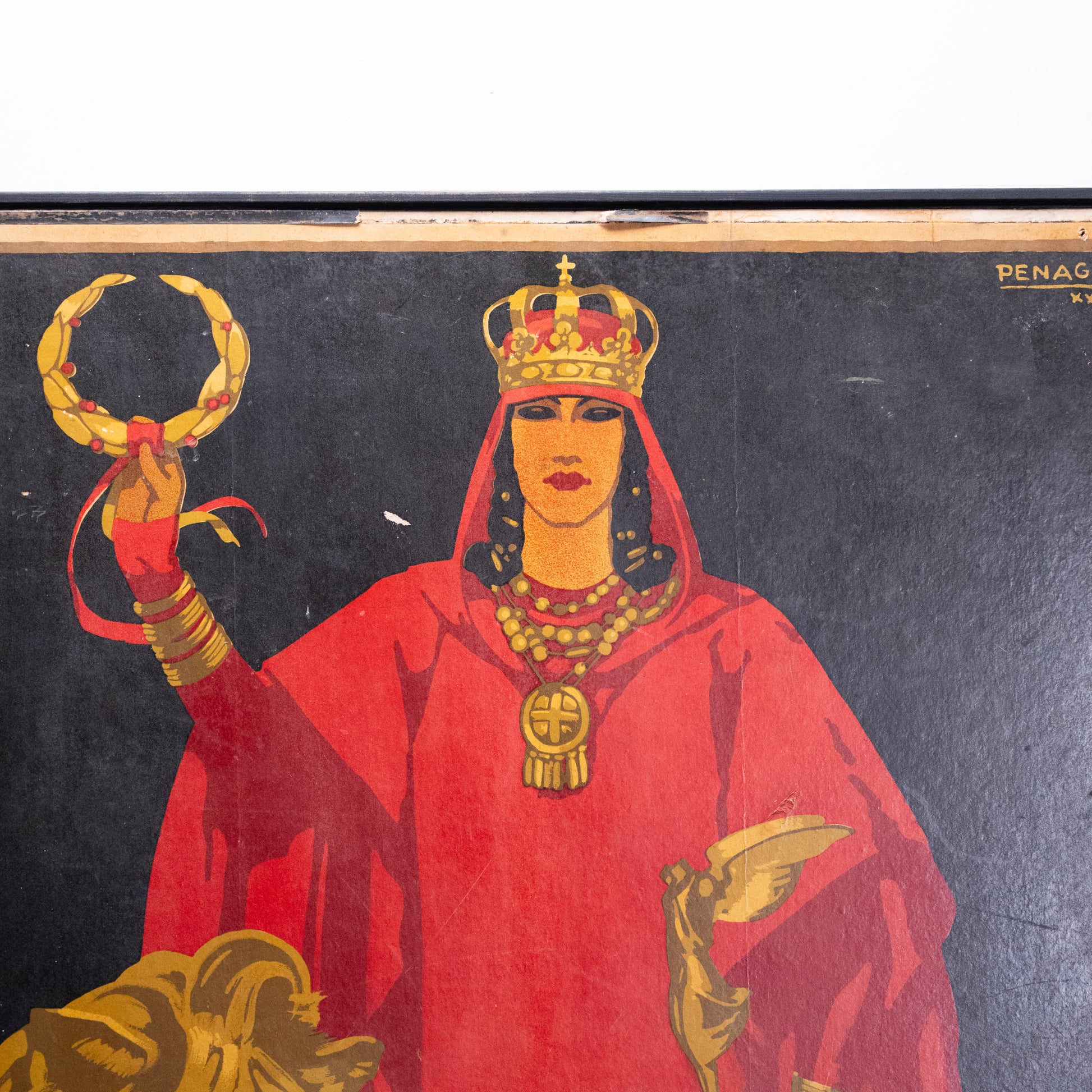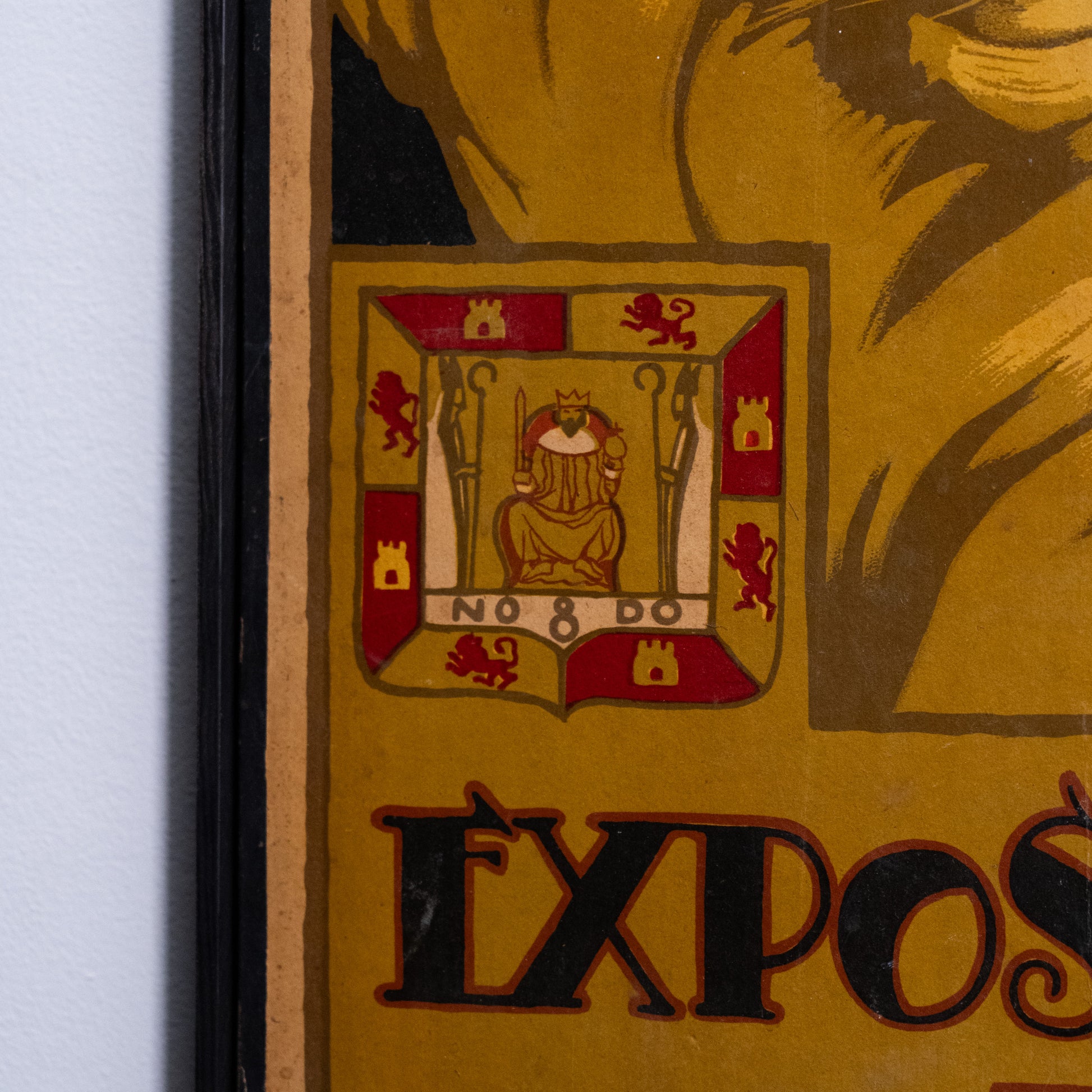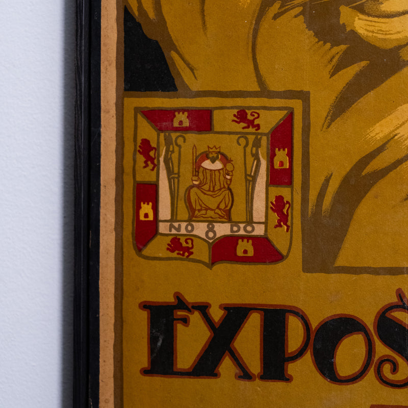 Printed as an original stone lithograph on paper, it was intended for public display in prominent civic and urban spaces, projecting Spain’s cultural ambition and modern identity. The imagery—an allegorical figure of Spain, lion, laurel wreath, and heraldic elements—conveys strength, unity, and national pride through a restrained Art Deco palette.