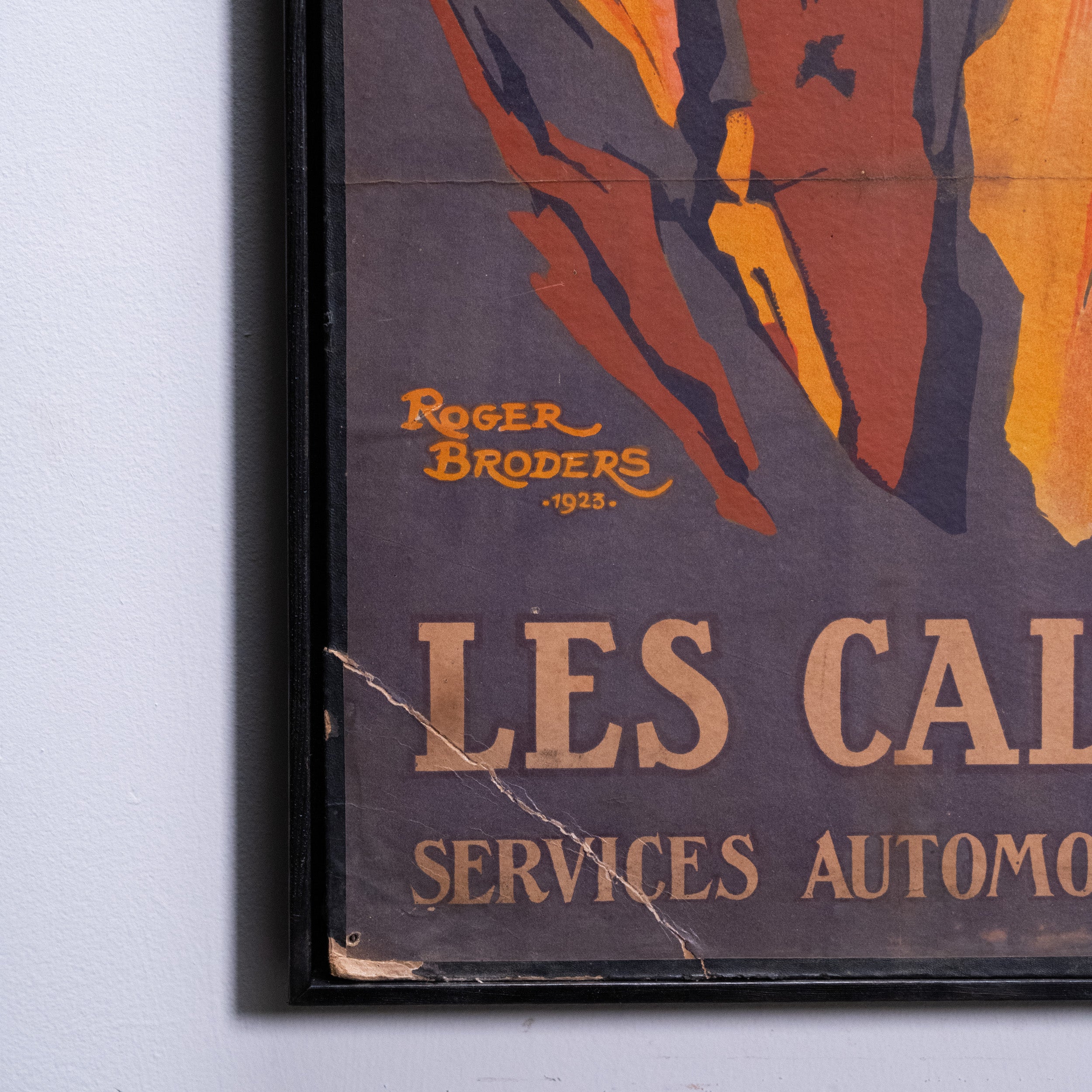 This original French Art Deco travel poster was designed by Roger Broders around 1923 for the Paris–Lyon–Méditerranée (PLM) railway, promoting excursions to the Calanche de Piana in Corsica. Printed as an original stone lithograph on paper, it reflects Broders’ signature use of bold colour planes and dramatic, simplified landscapes.