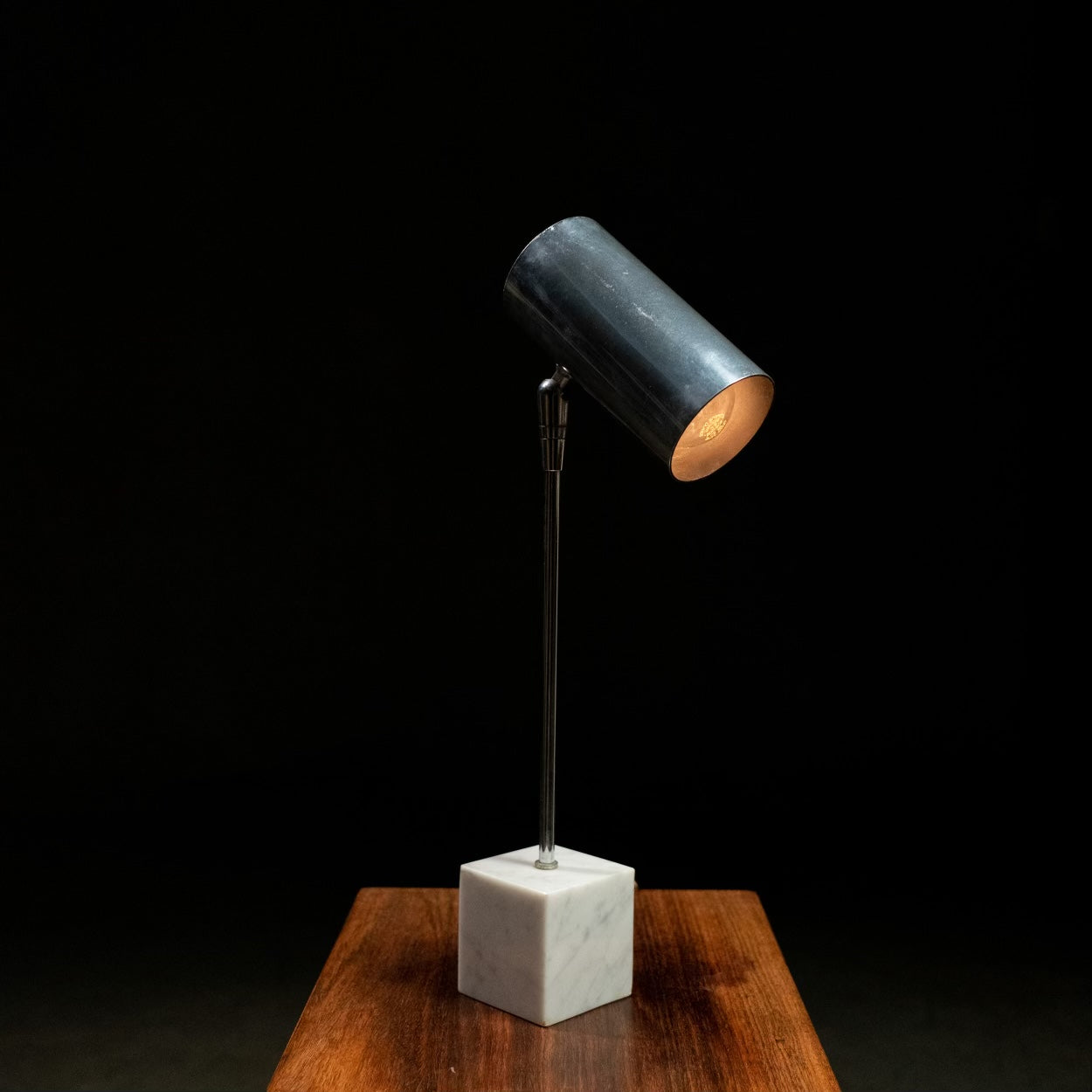 Robert Sonneman for Kovacs Mid-Century Modern cream painted table lamp with a movable can, atop a white and grey marble bloc. The piece has some scratches to the metal finish but is in overall great vintage condition. Acquired from a private collection