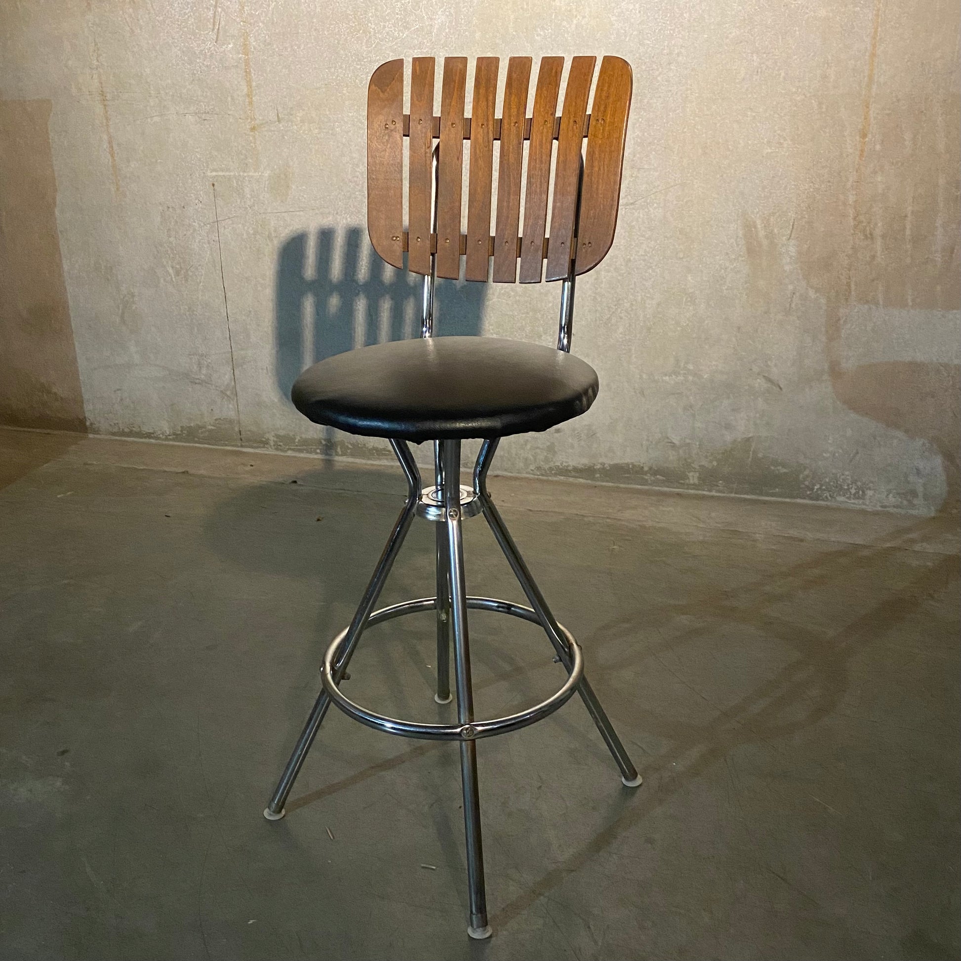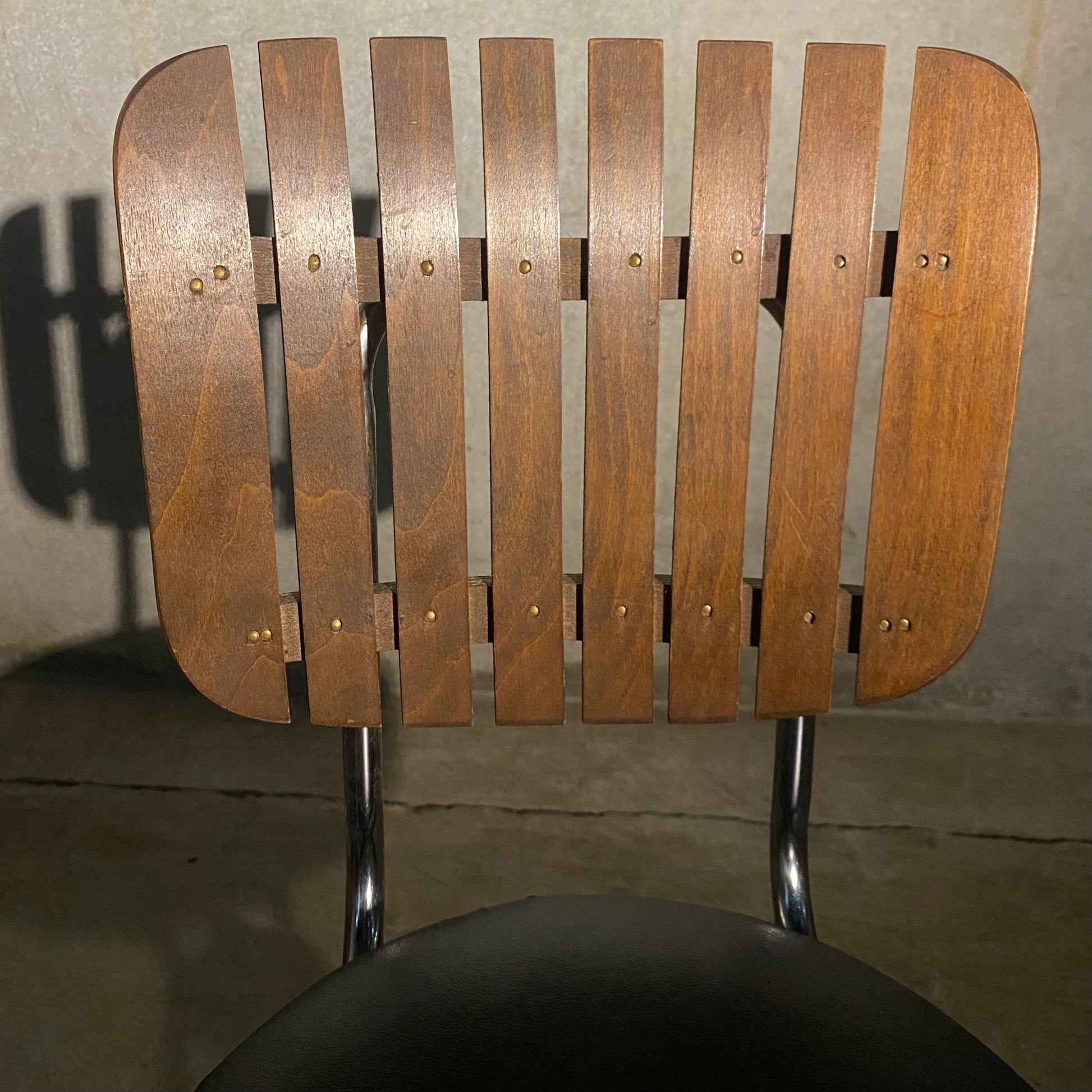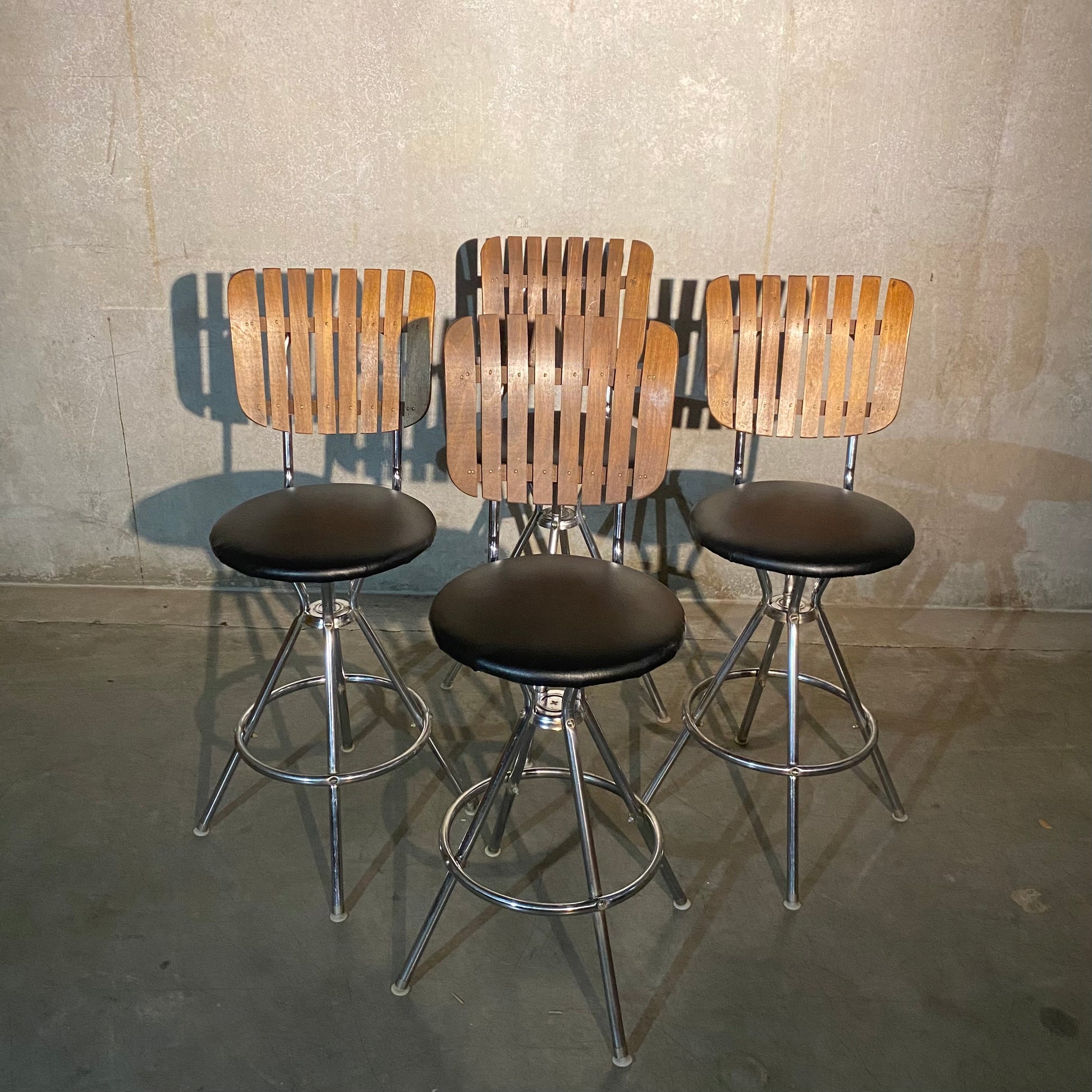 These beautiful Mid-Century Modern Swivel Bar Stools feature a Wood Slat Back, a Chrome Base & Upholstered Vinyl Seats.