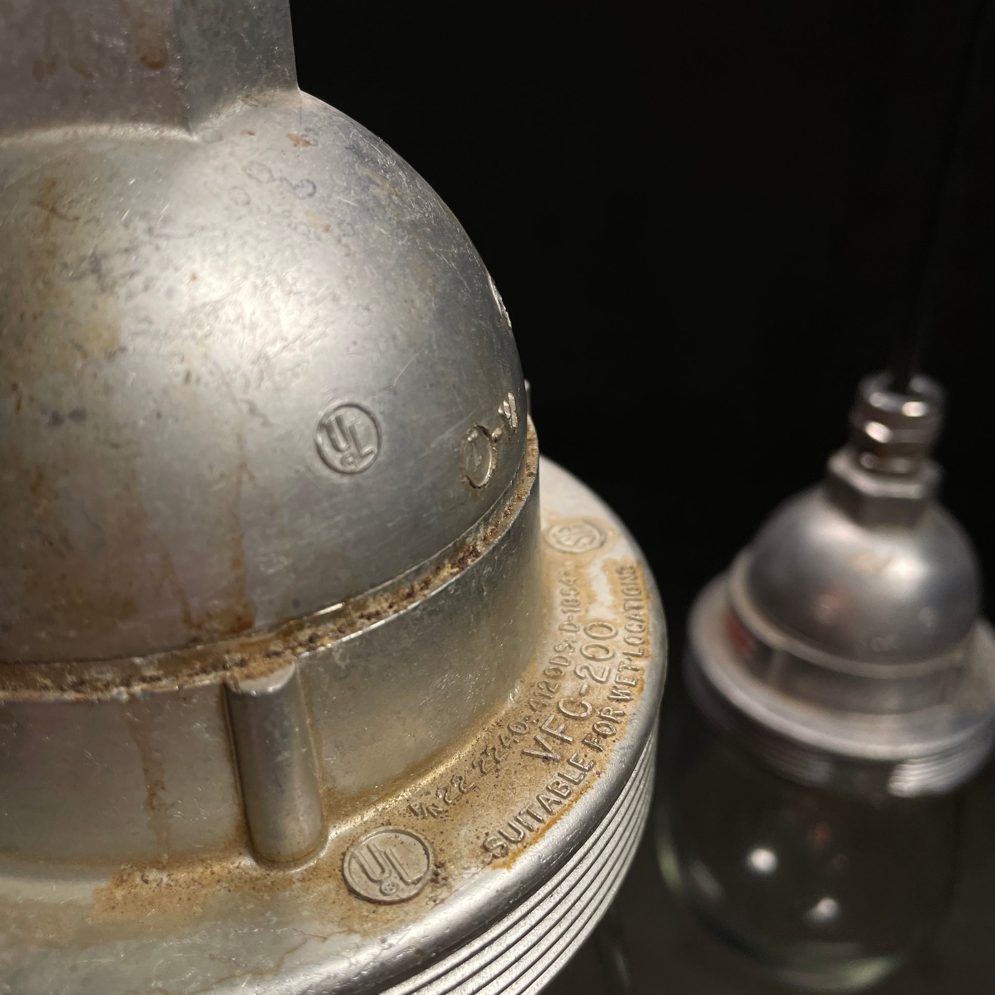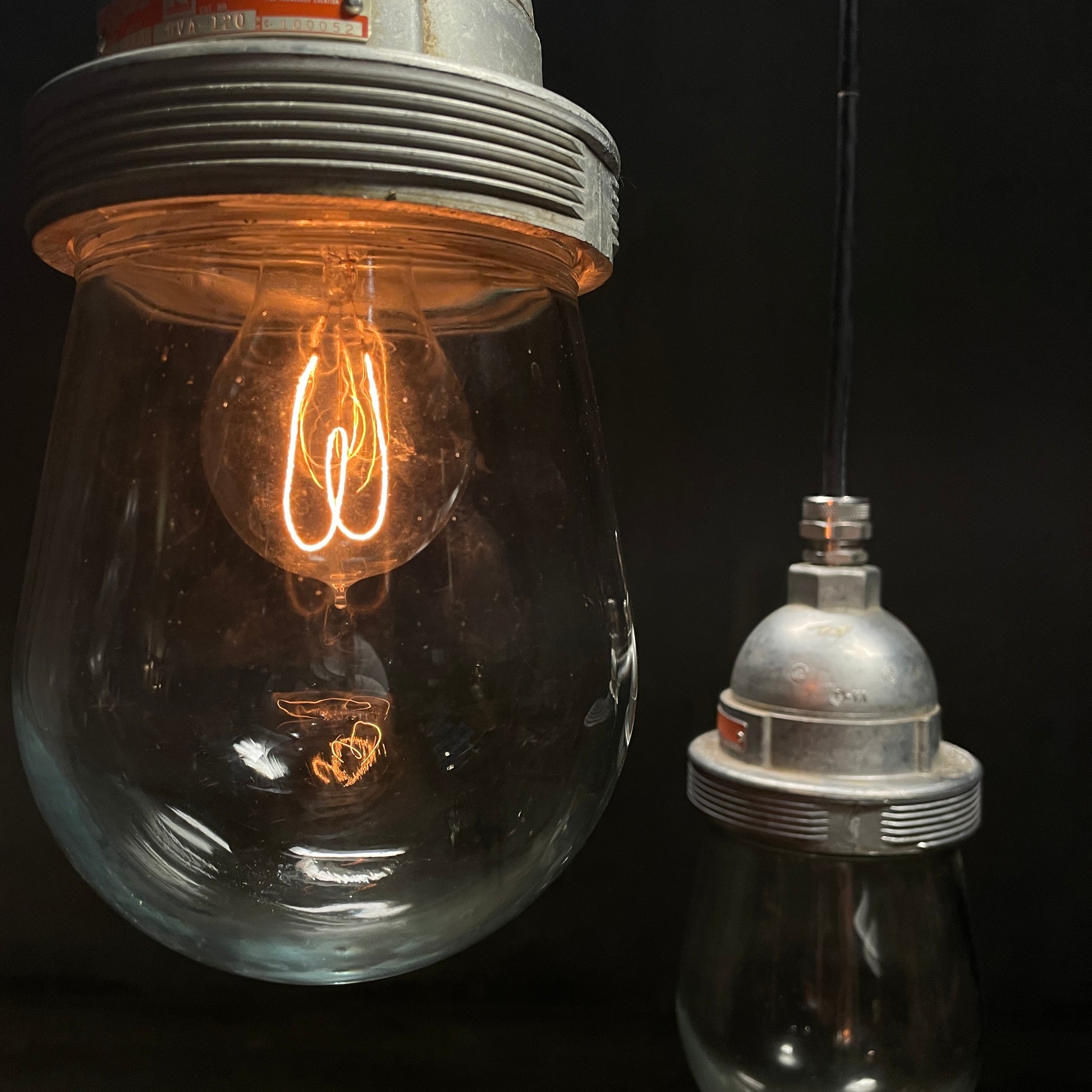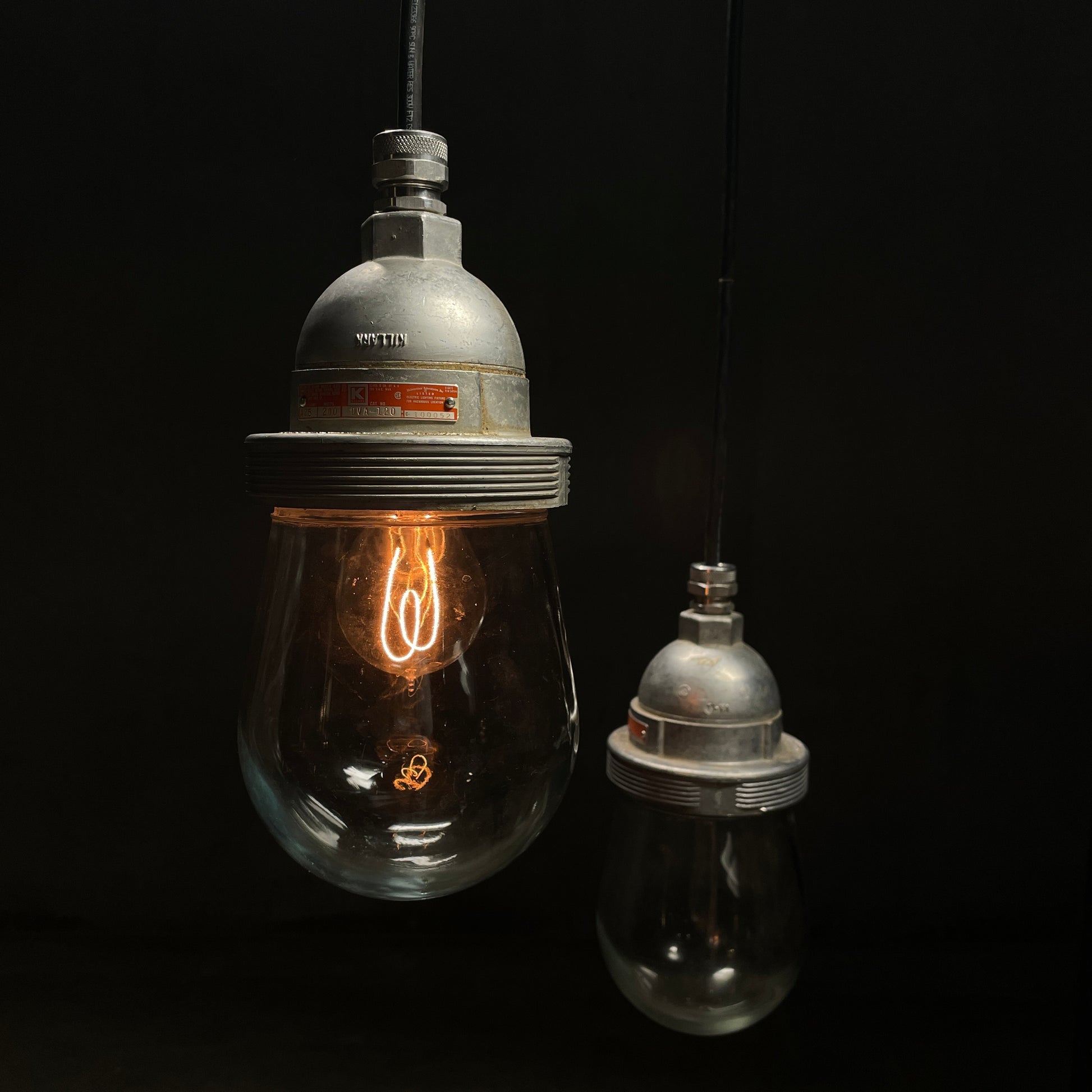 Group of industrial pendants on black wire.