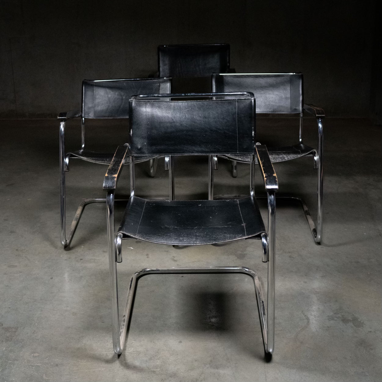 This piece is attributed to the above-mentioned designer/maker. It has no attribution mark. This vintage item has visible wear and patina real leather and no missing parts. It may be in need of minor restoration. Price per piece.