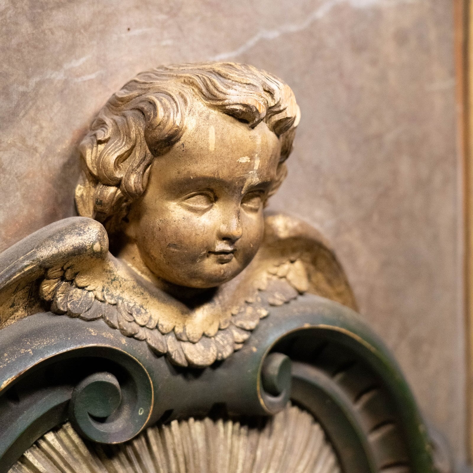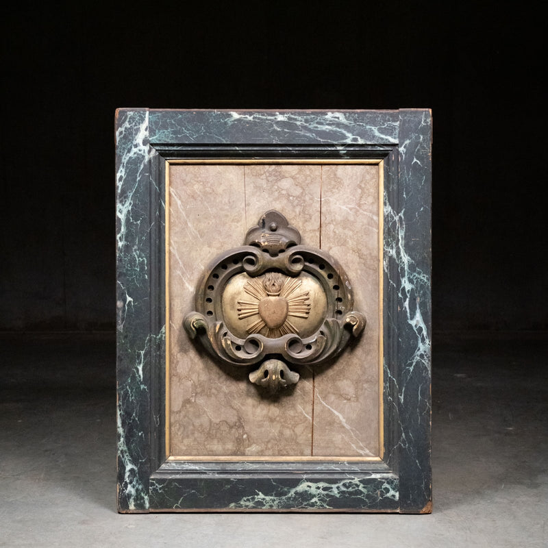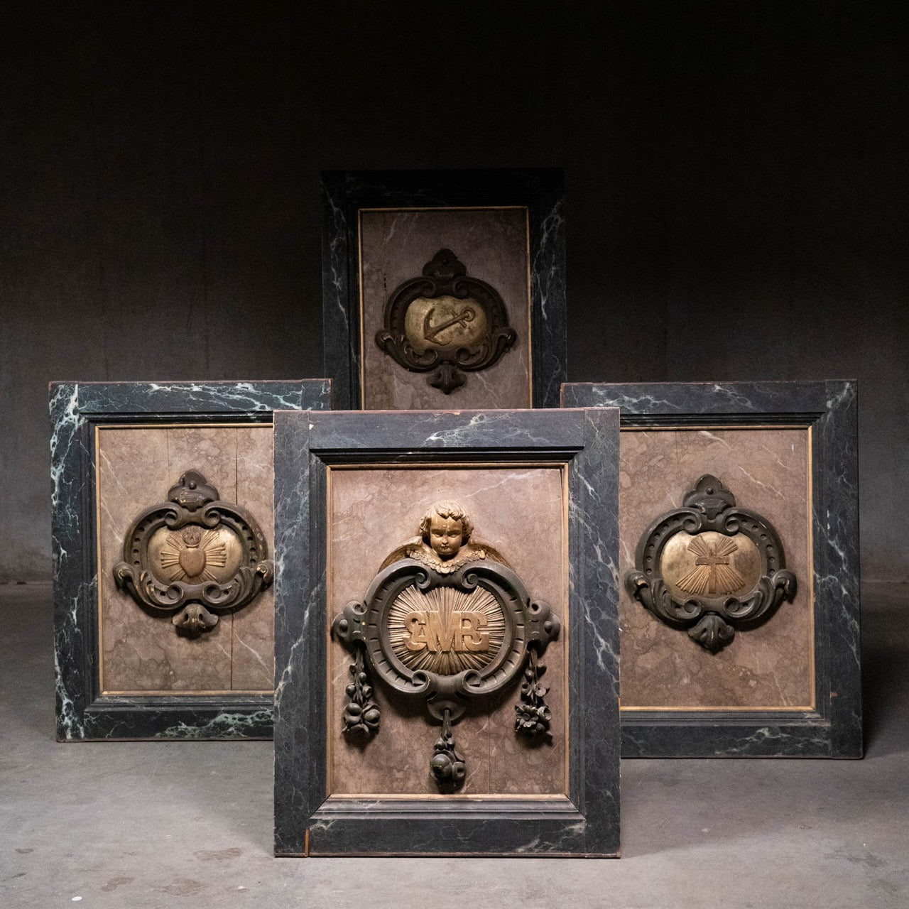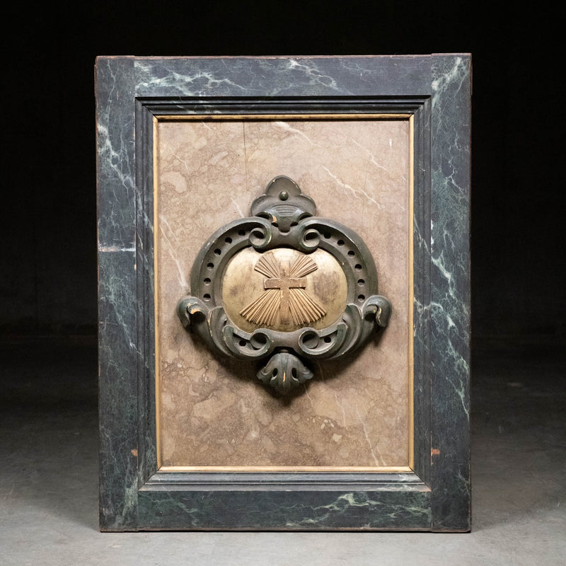 They don’t get much better , solid wood carved iconic religious art in faux painted marble frames , beautiful details all in untouched as found condition . These are some of the best we have seen salvaged years ago from a church in Chicago.