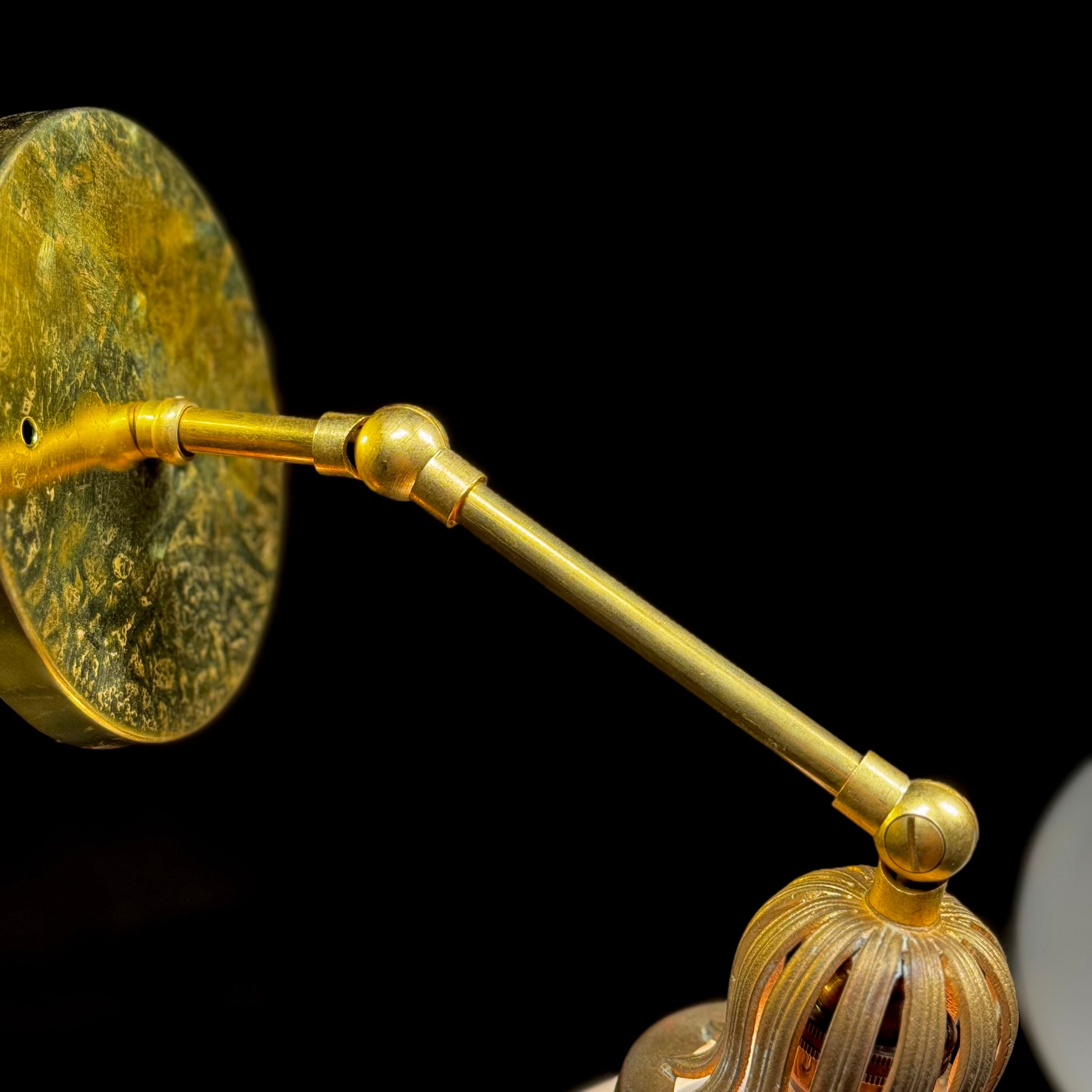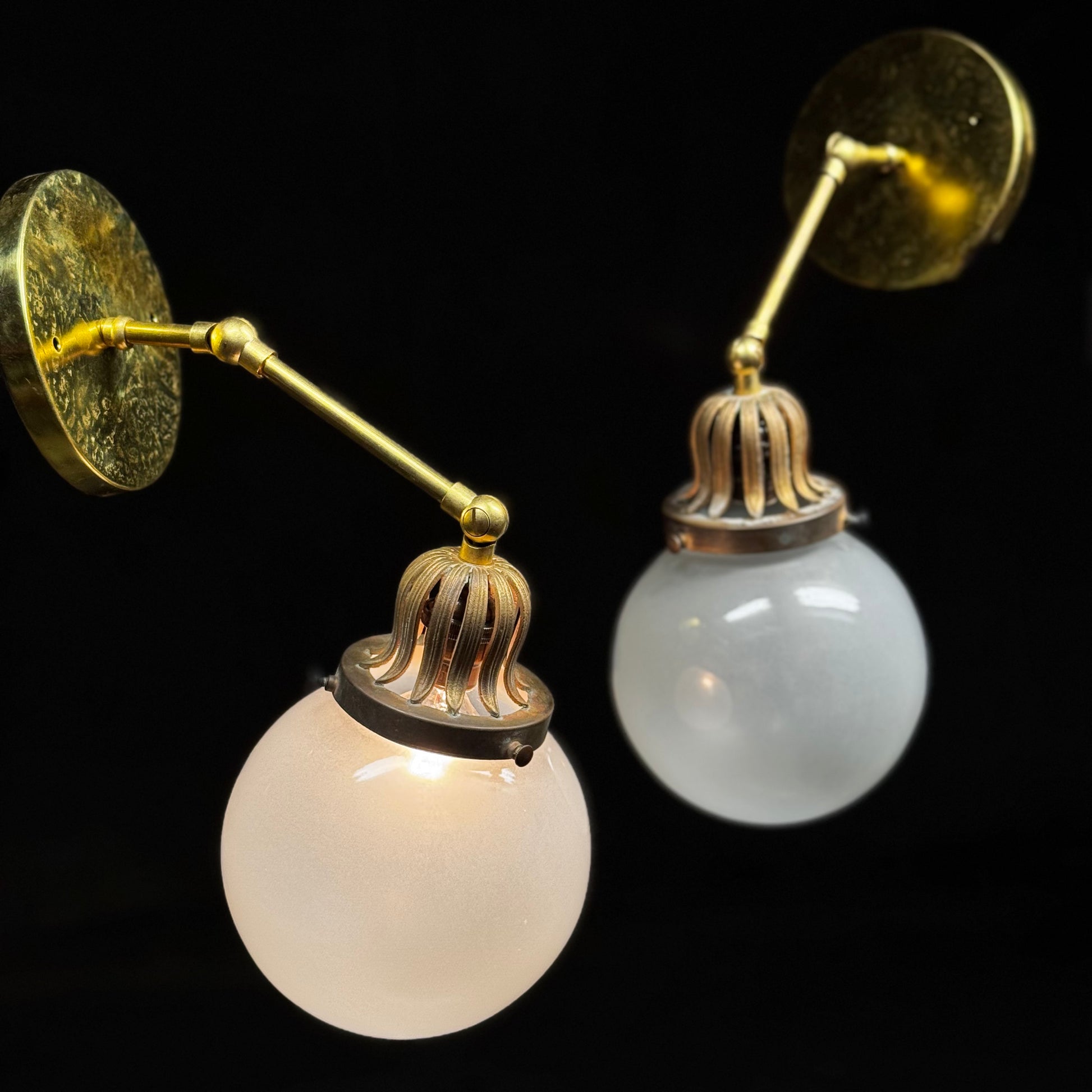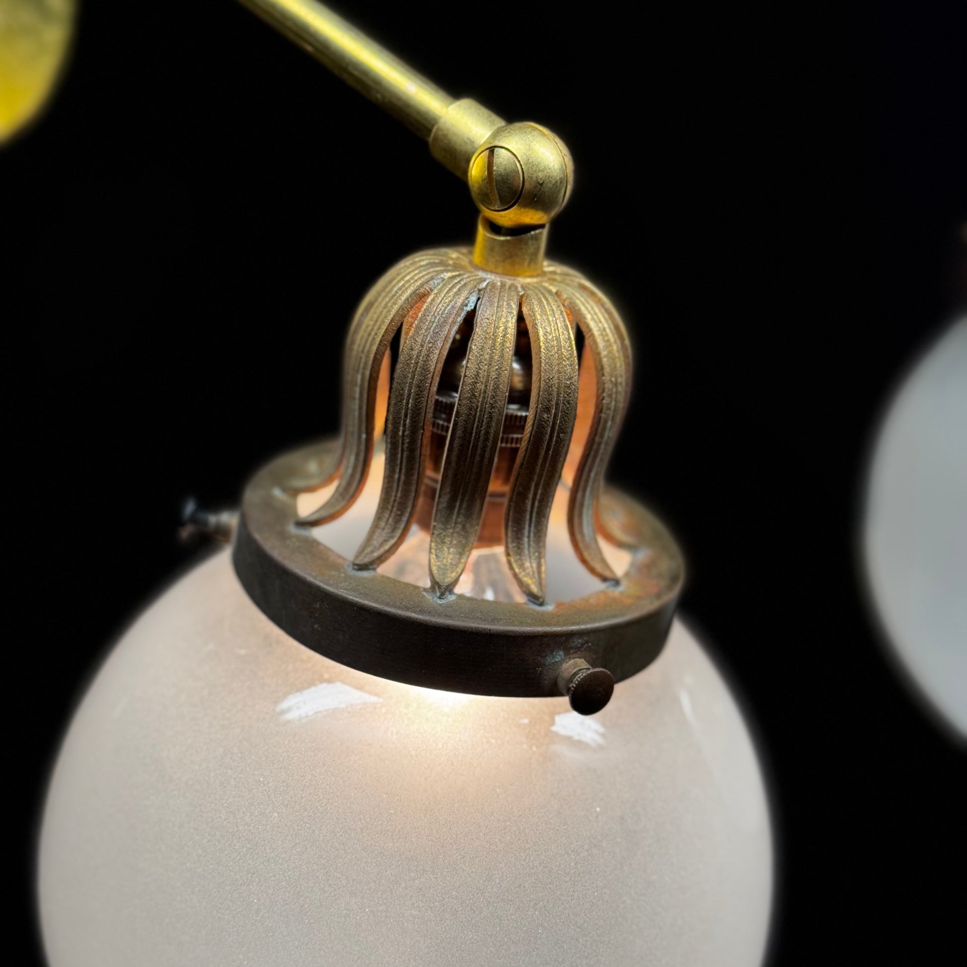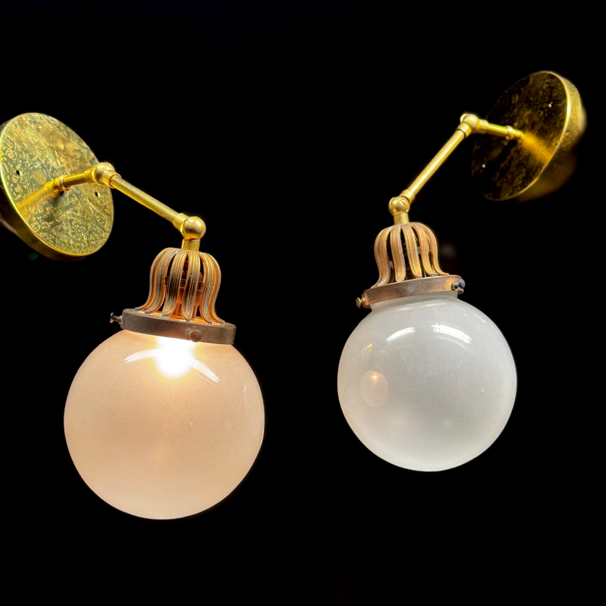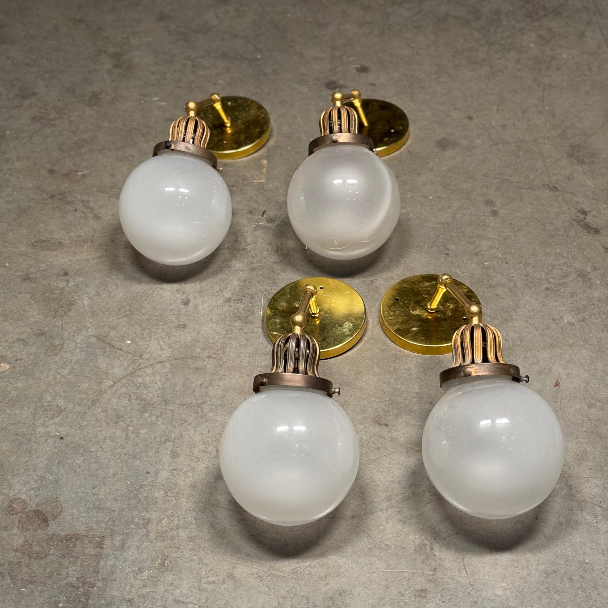 Two with frosted glass, and two with milk glass shades at this time. fitters are 1920 bronze on brass connection .