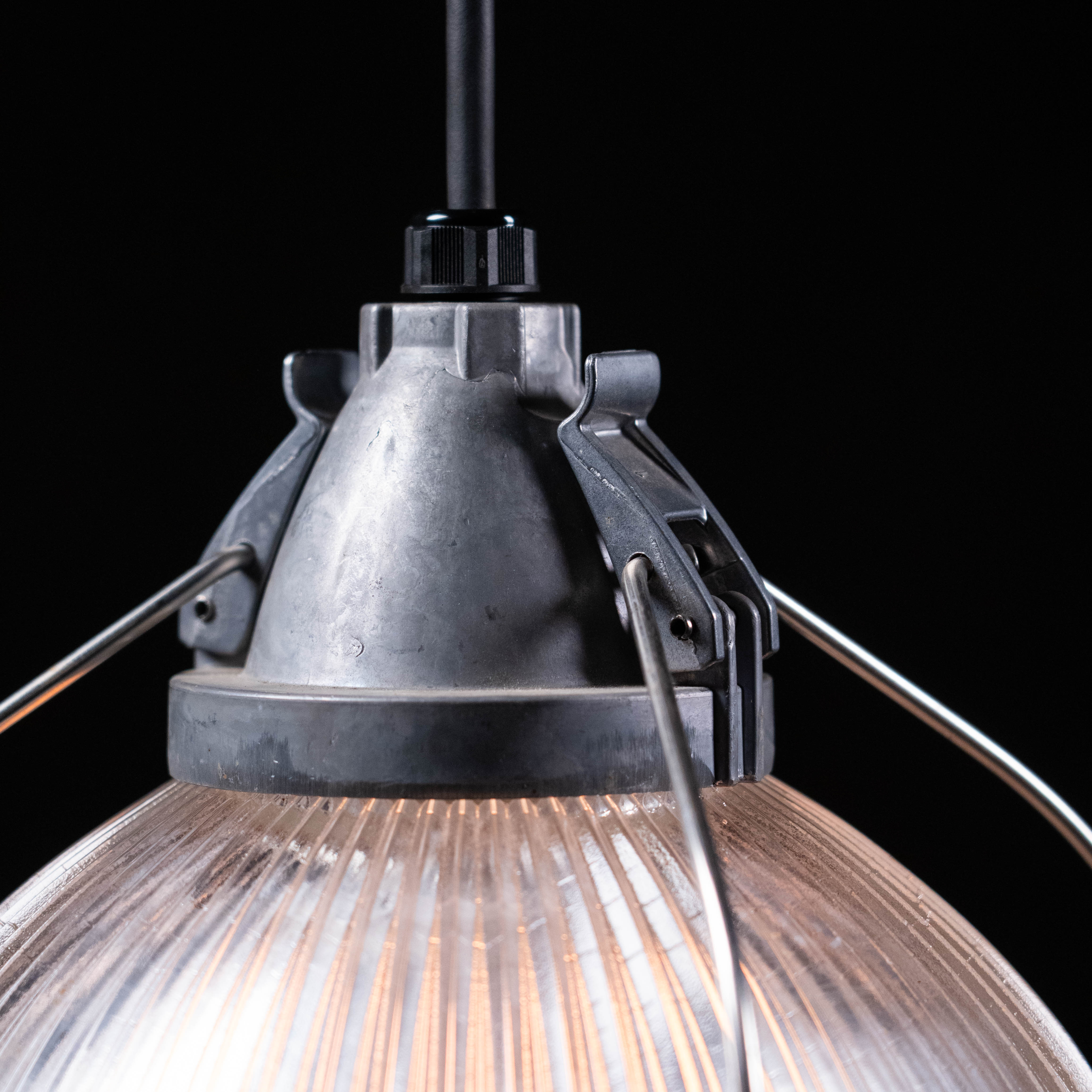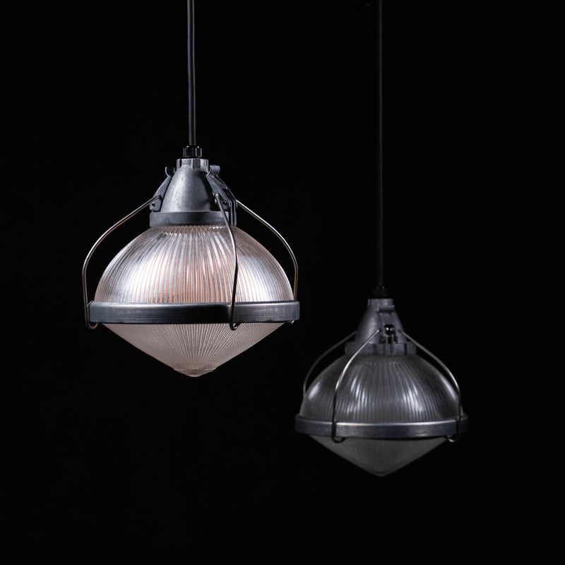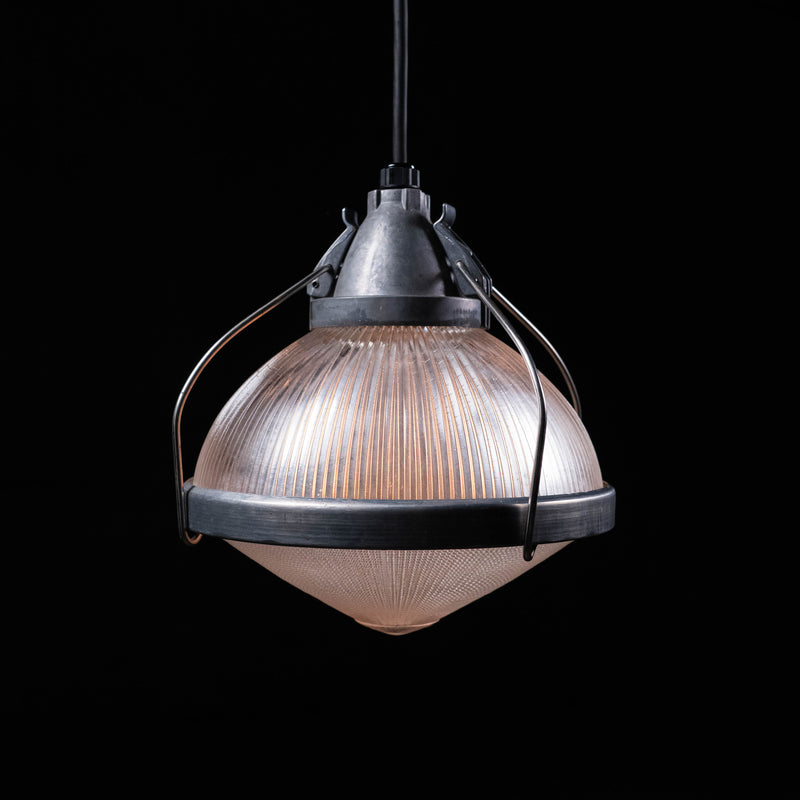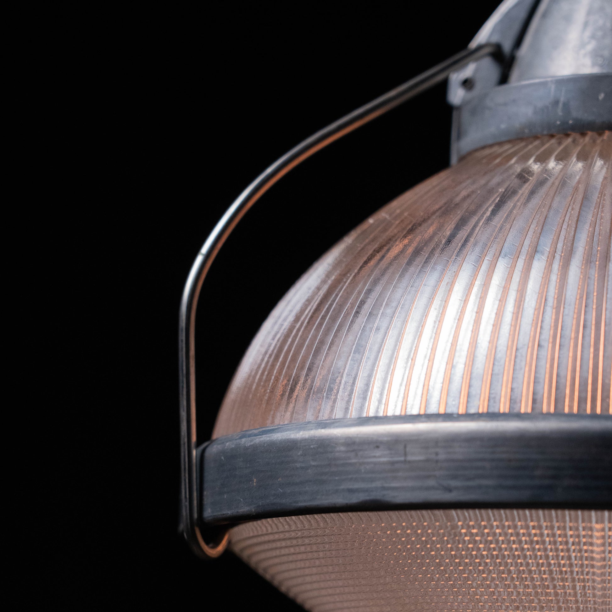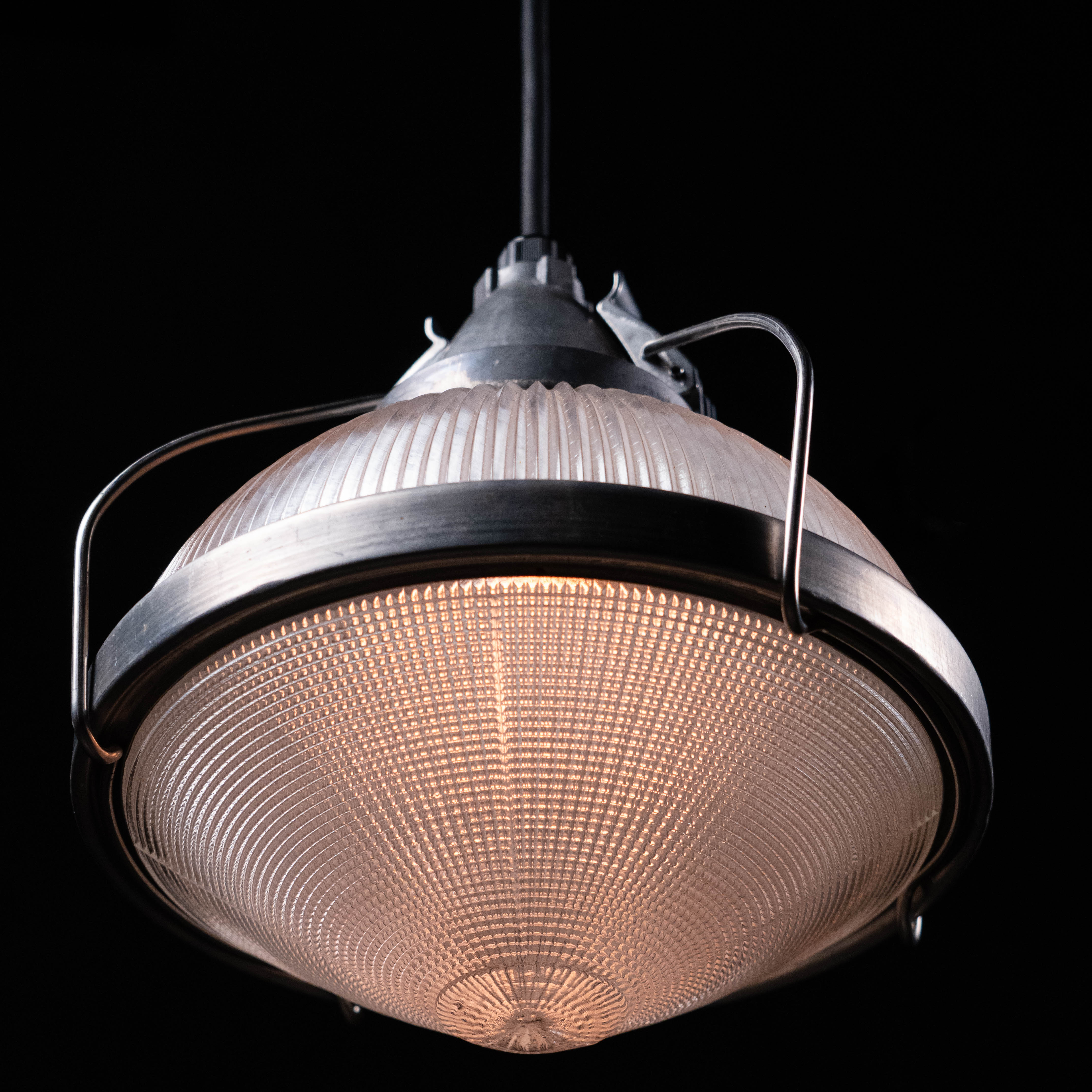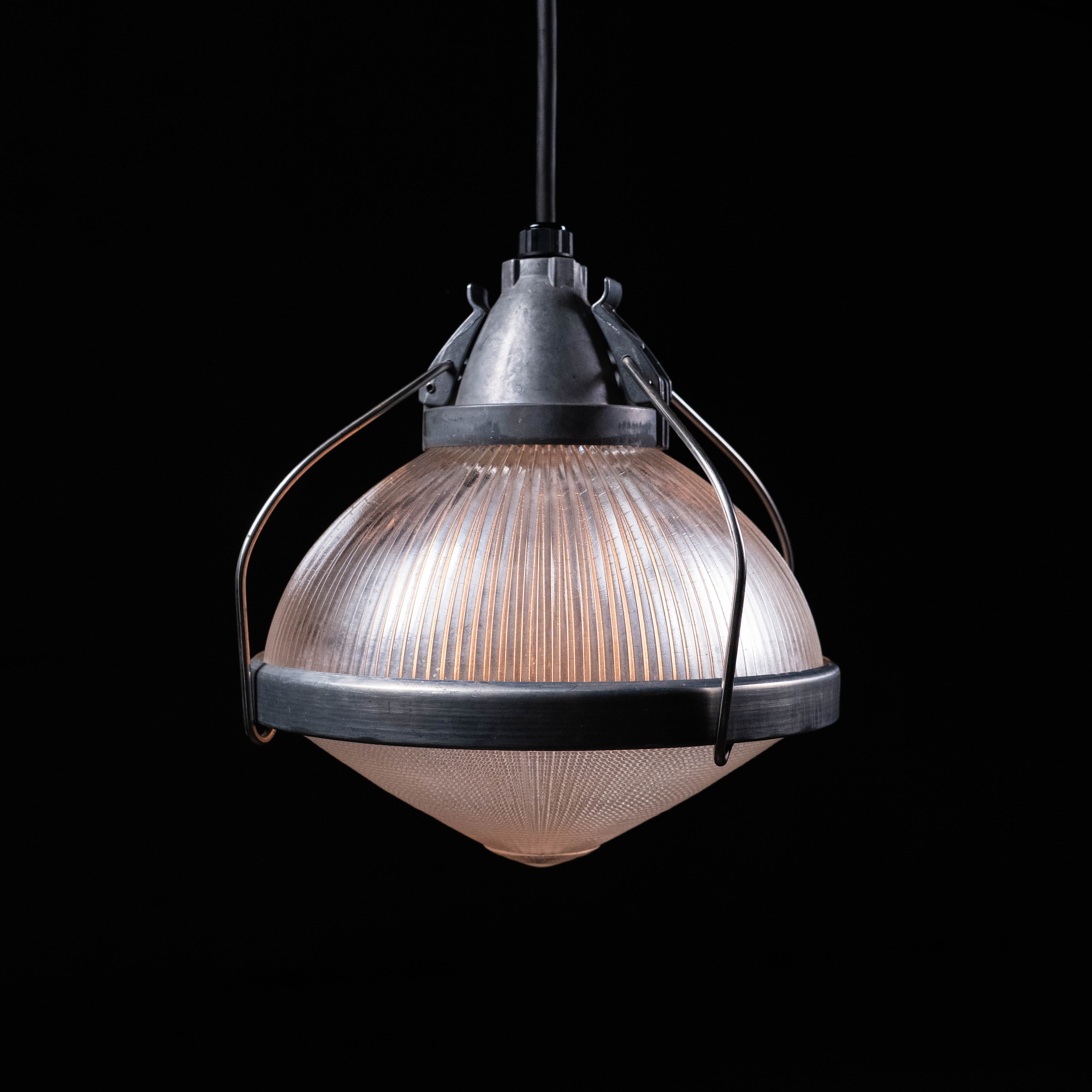 A group of 6 industrial holophane lights with metal cage, rewired and CSA complete. Homophone's history in Canada began with the establishment of the Holophane Glass Company in America in 1898, followed by an international factory in Toronto, Ontario.