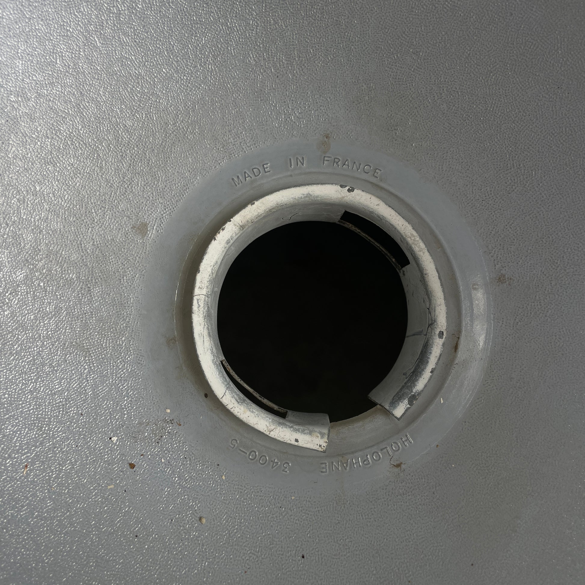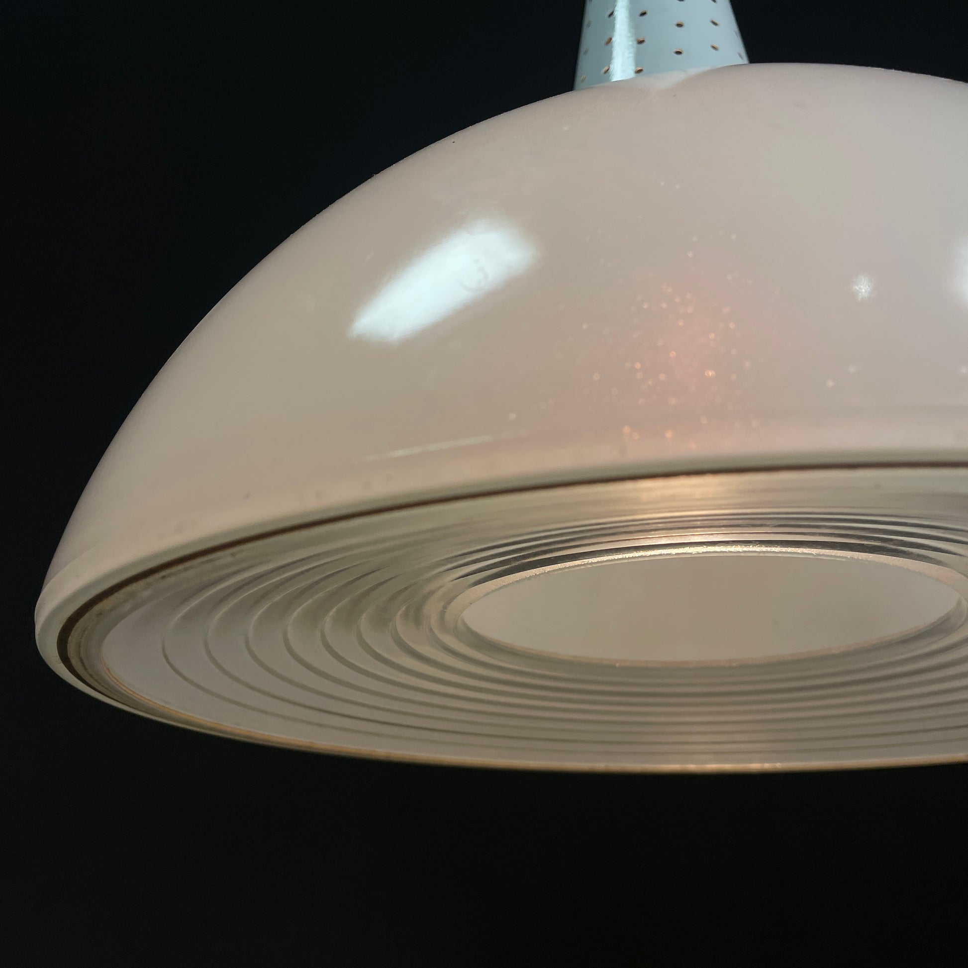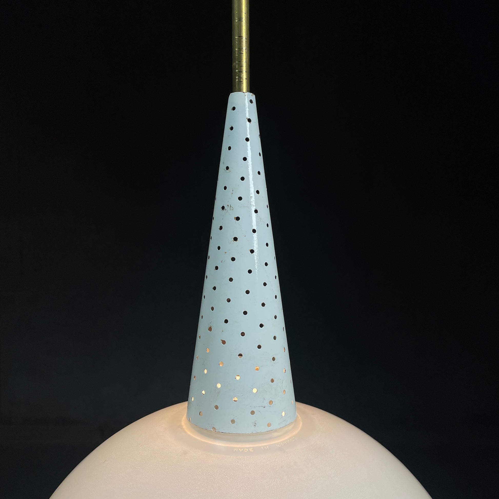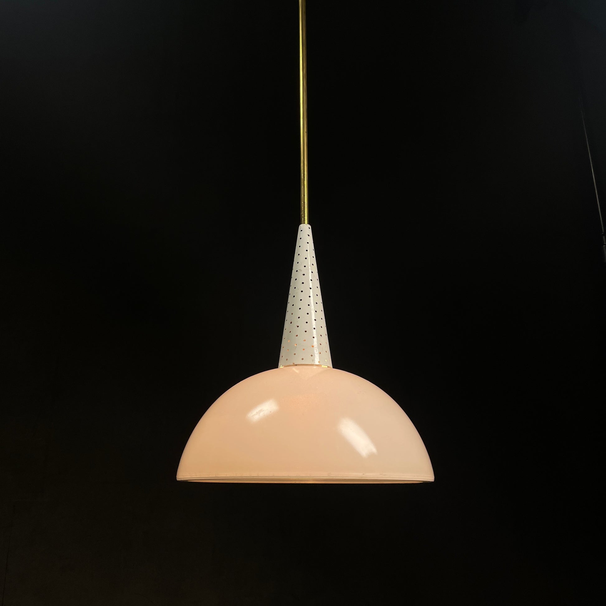 A beautiful industrial midcentury pendant lamp from the late 1940s / early 1950s, attributed to Mathieu Mategot for Holophane. Made of white painted, perforated metal. It has a beautiful hemispherical lampshade with its original prismatic opaline glass. In good condition with nice patina. On brass pipe.