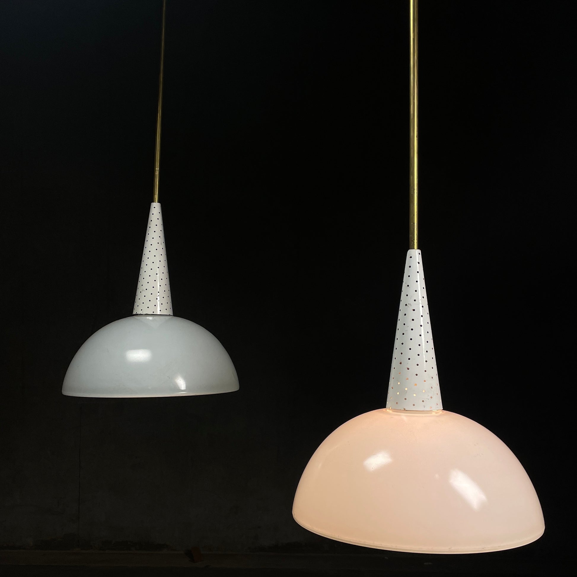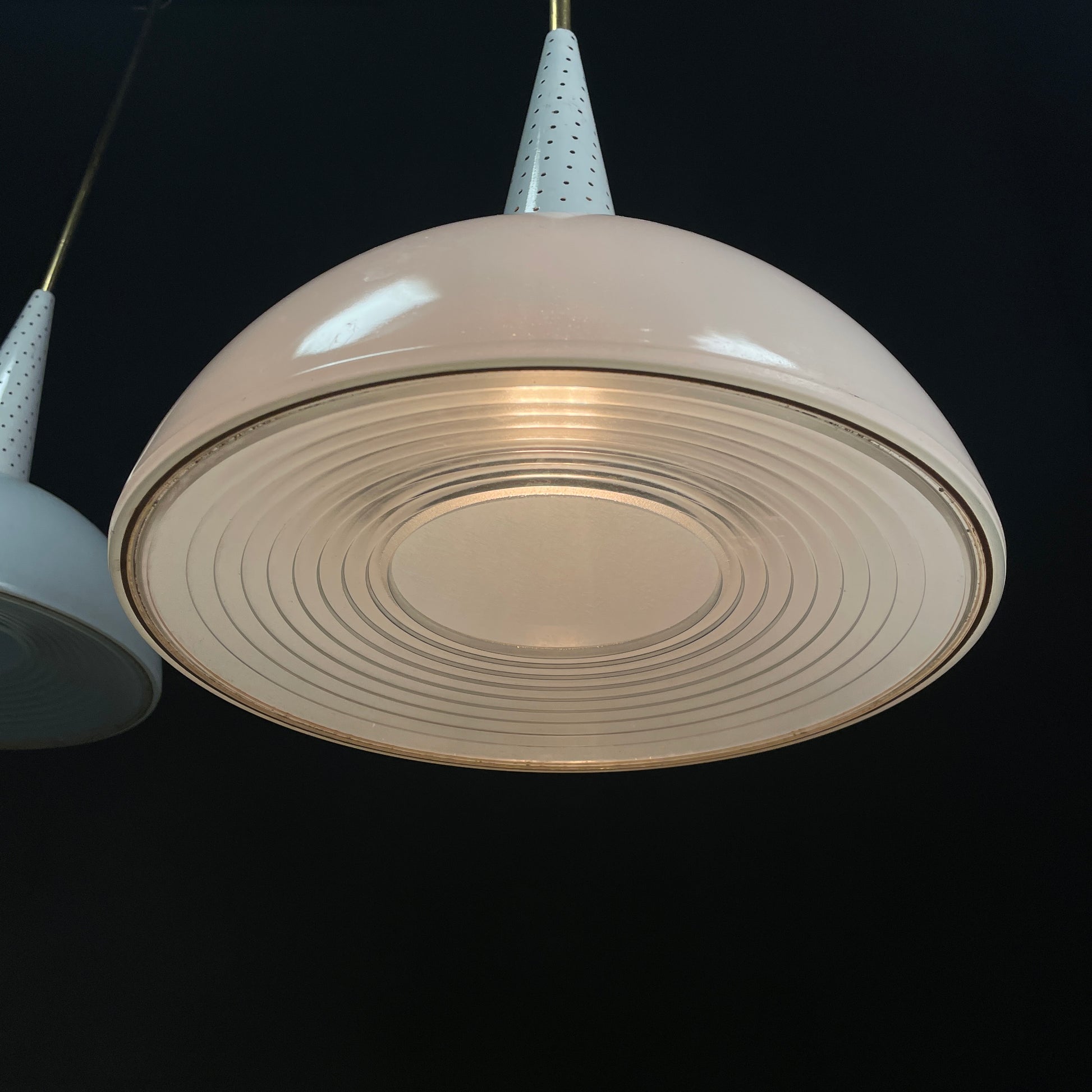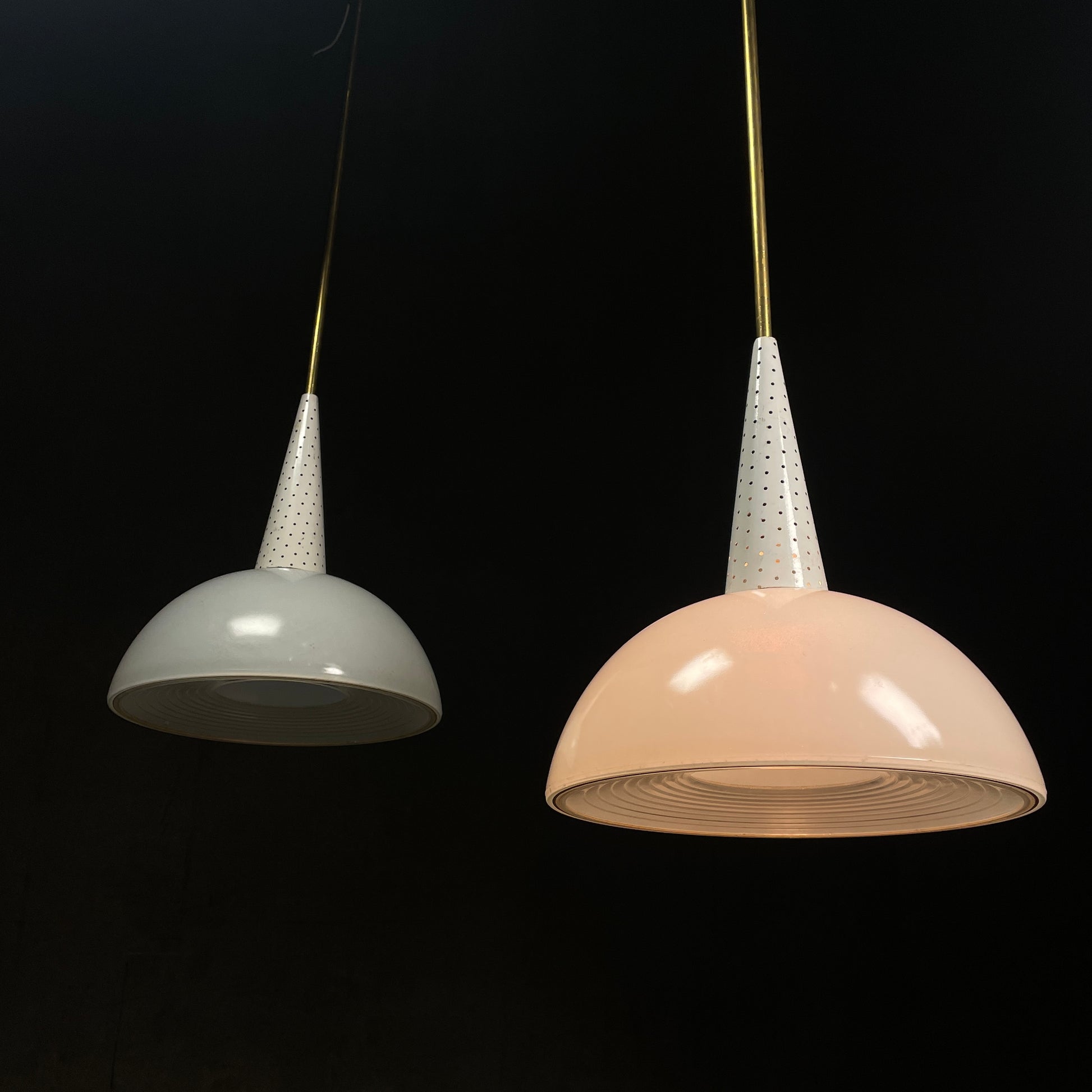 1950 White Perforated Metal and Glass French Chandeliers by Mathieu Matégot