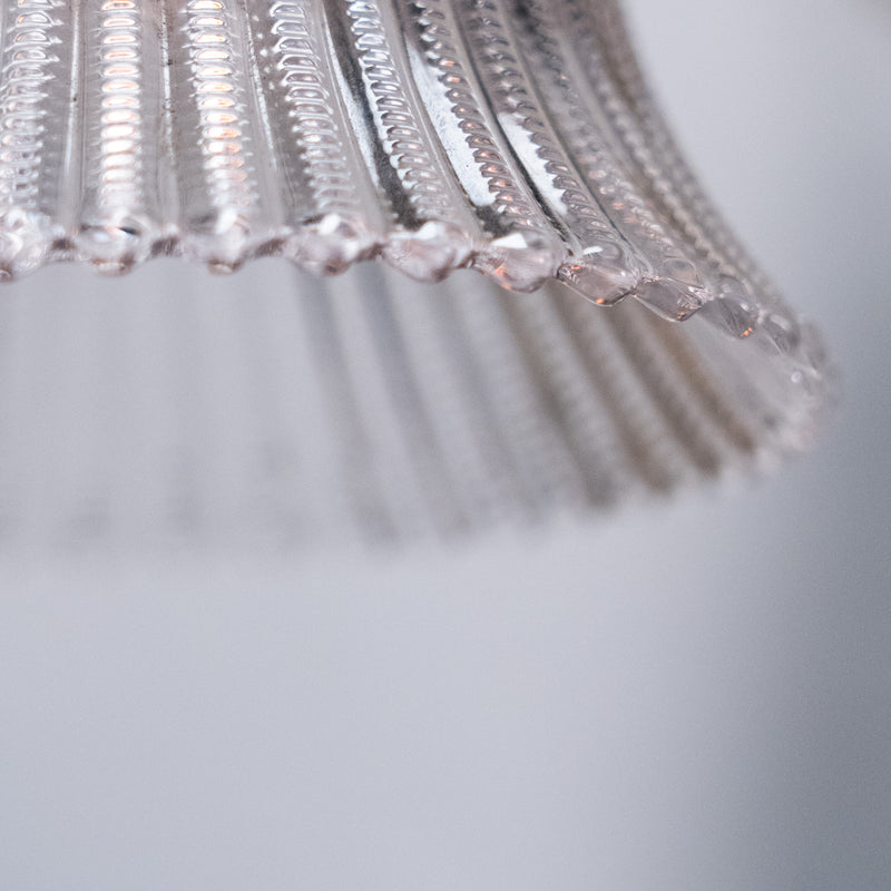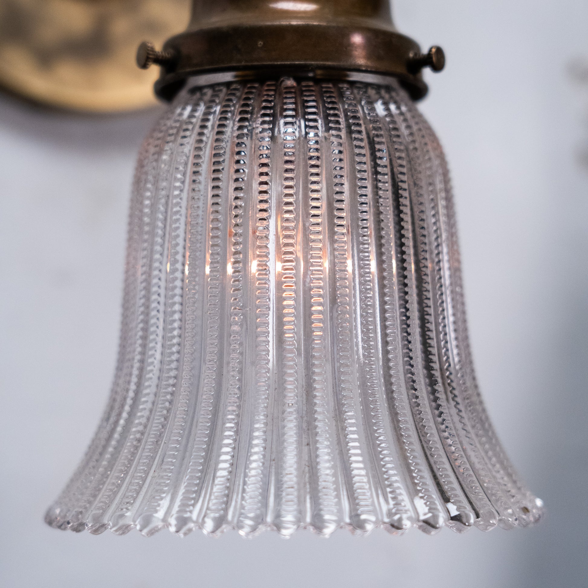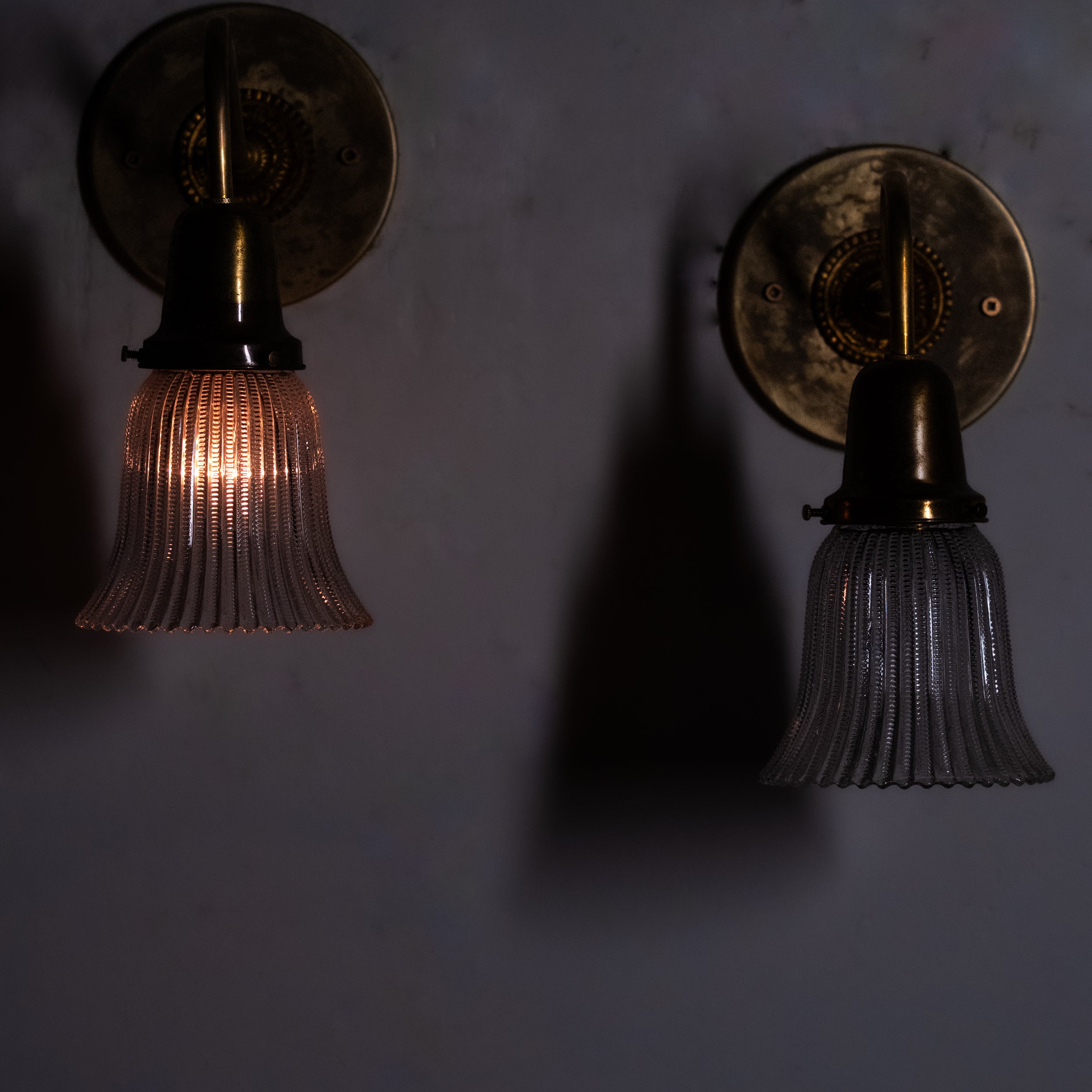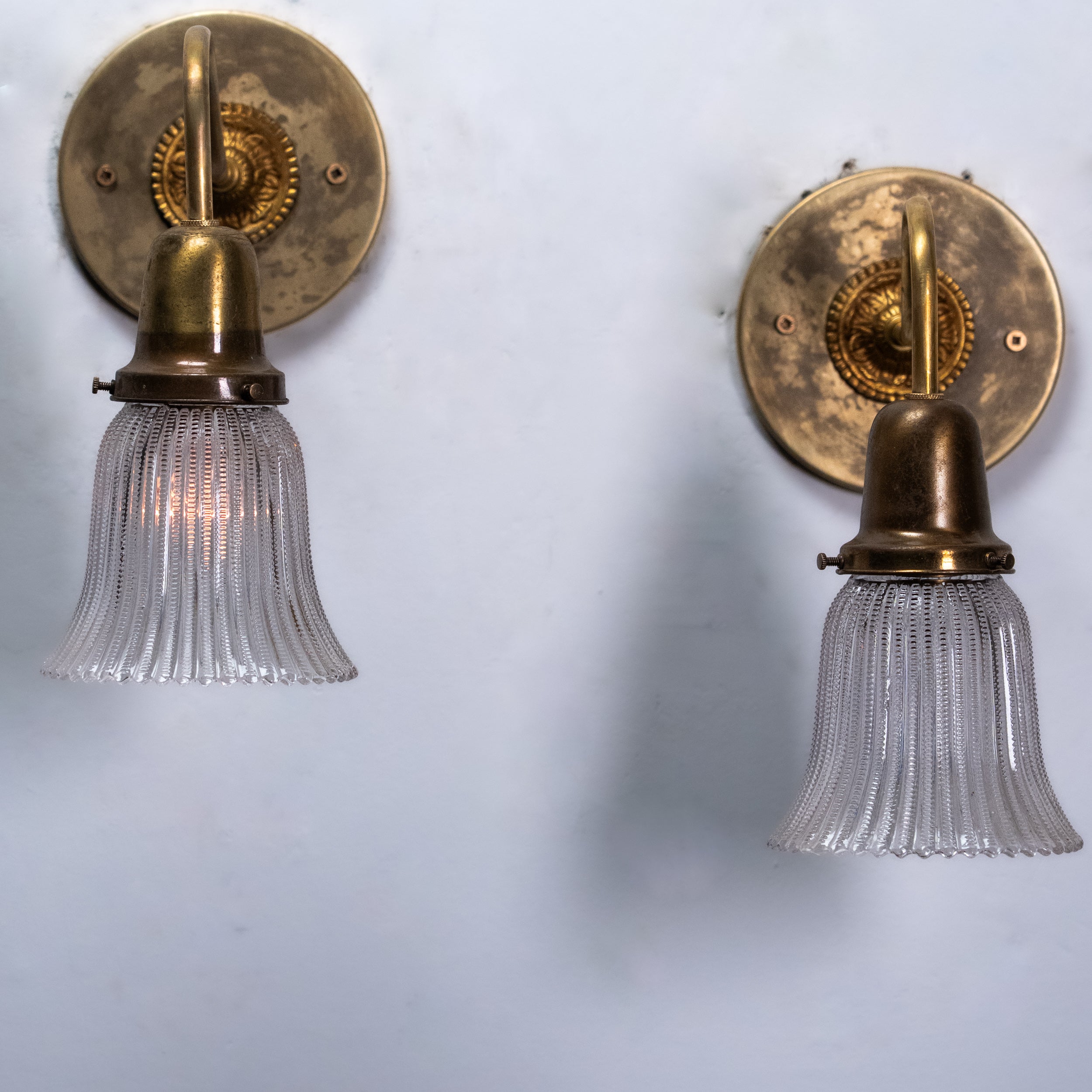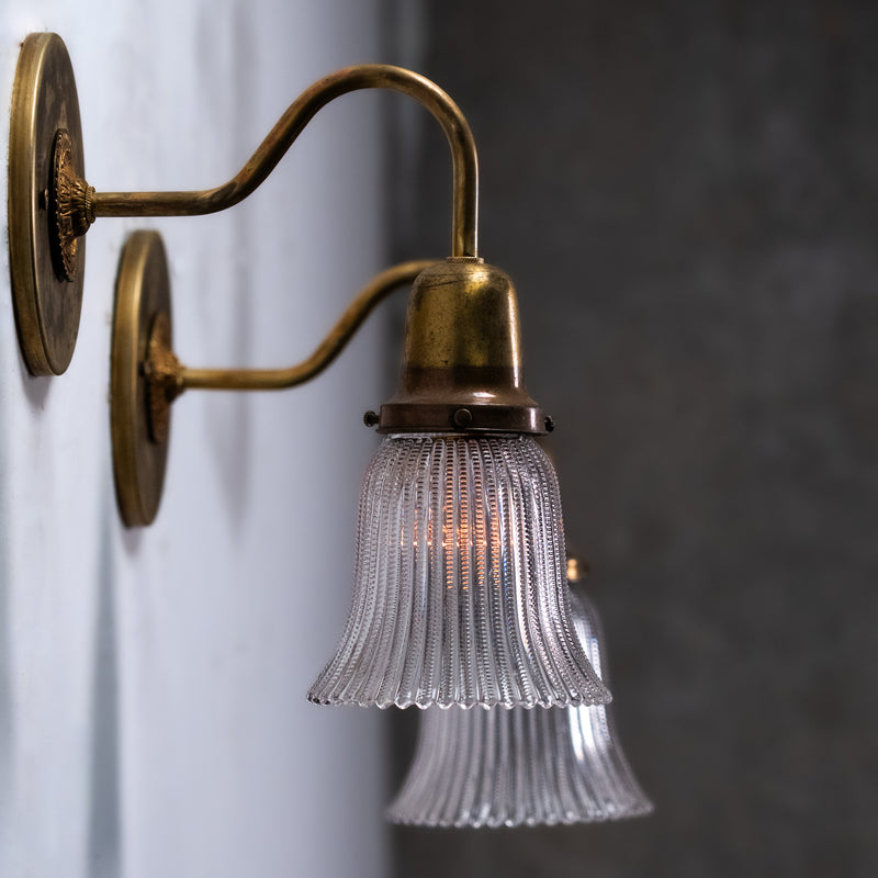 A refined set of four antique brass wall sconces featuring gracefully curved arms and ribbed bell-shaped glass shades. The brass surfaces retain a warm, naturally aged patina, complemented by softly flared glass that diffuses light evenly.