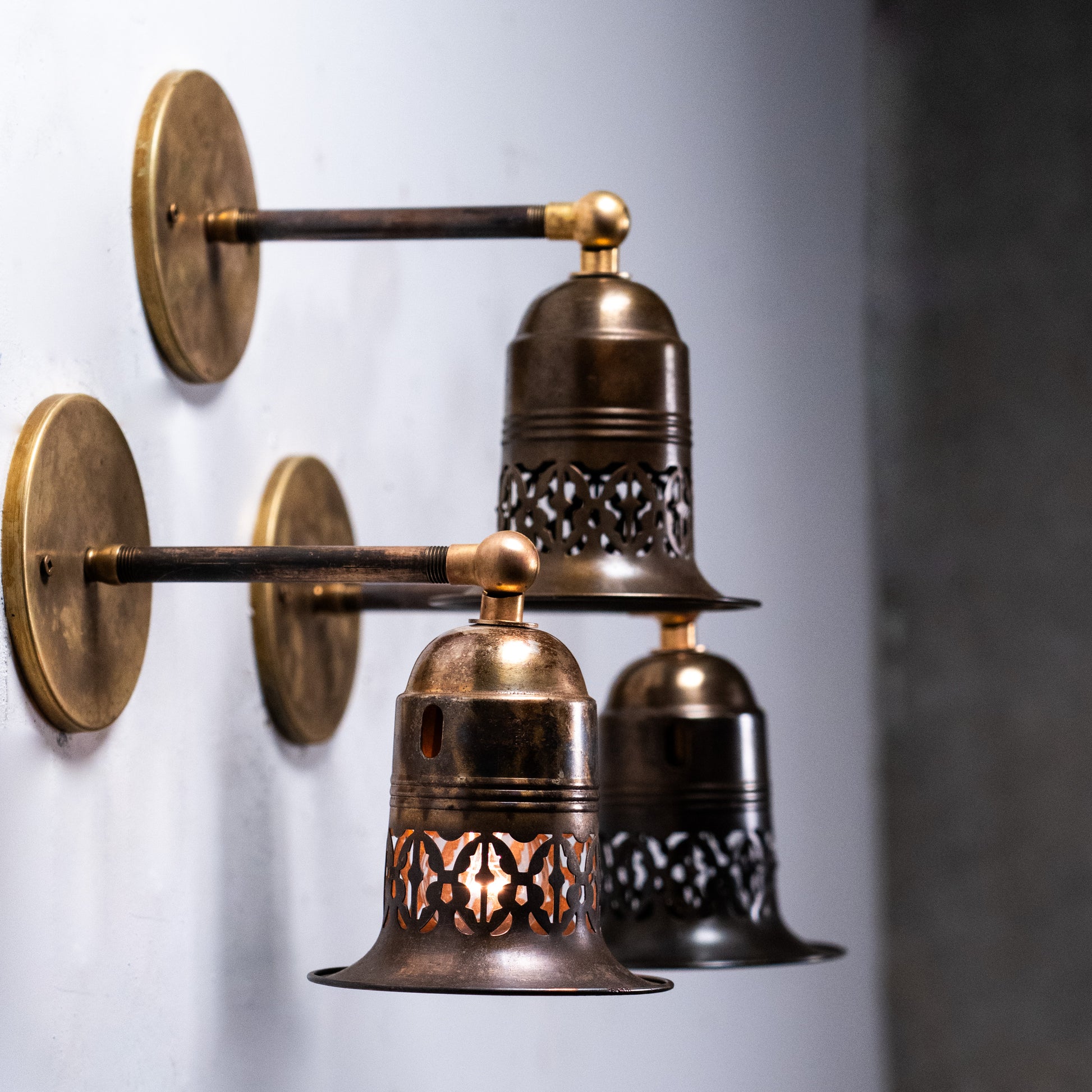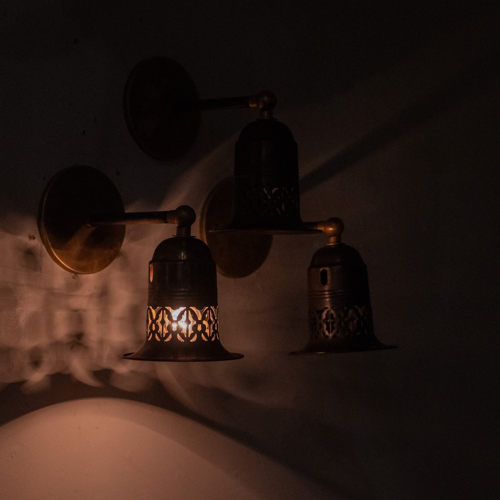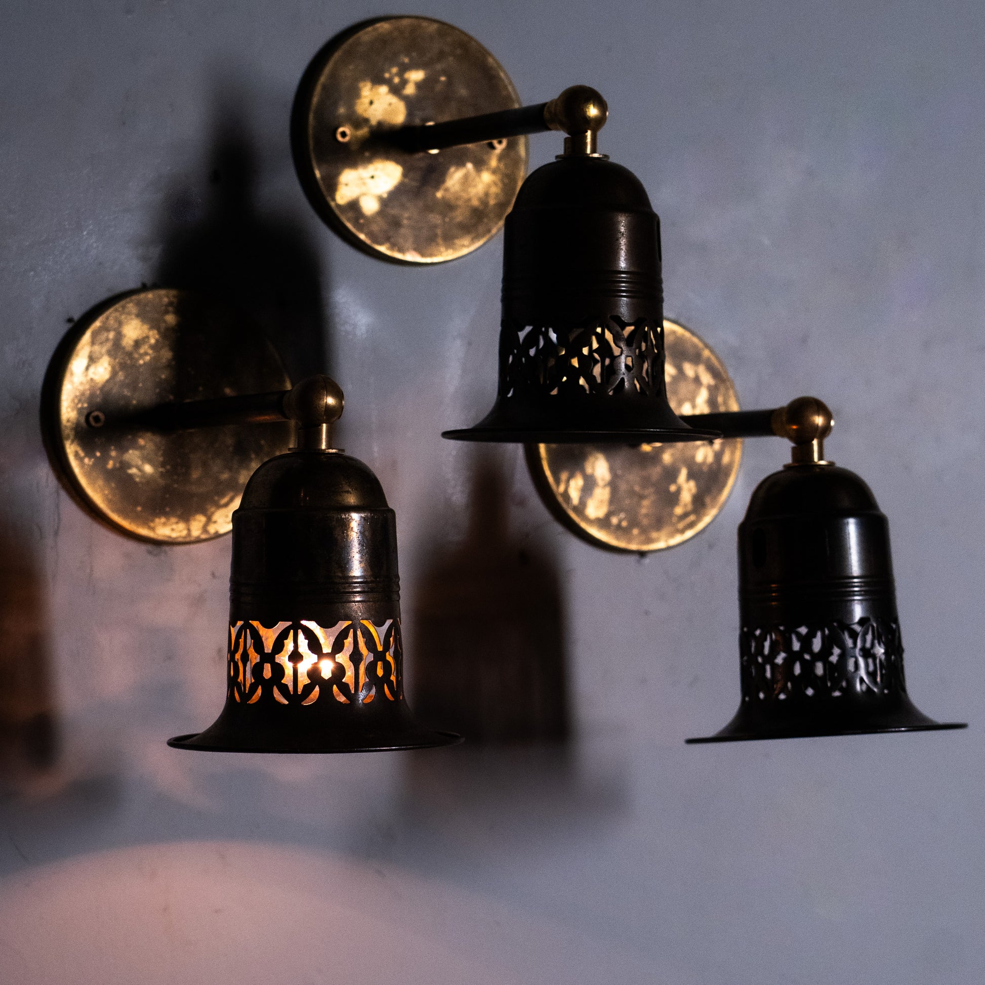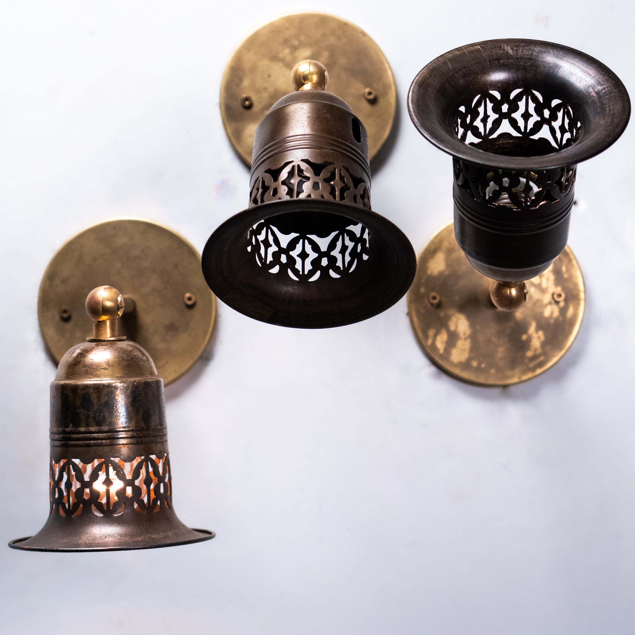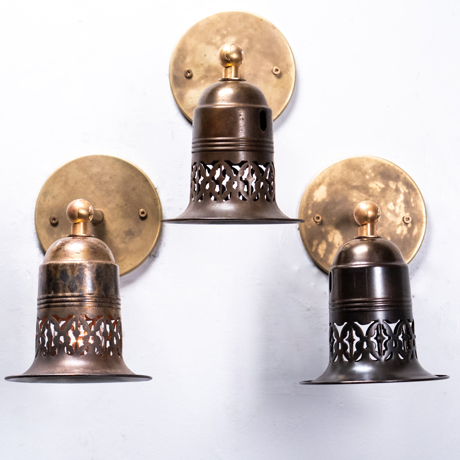 Unusual set of three brass pierced sconces with fitters all ready for easy installation. These shades cast a very unique light and are very well built .