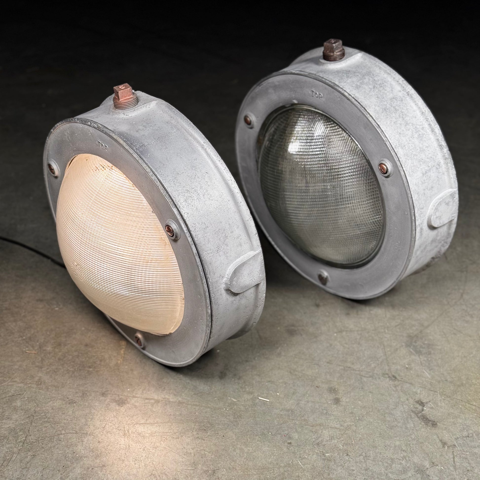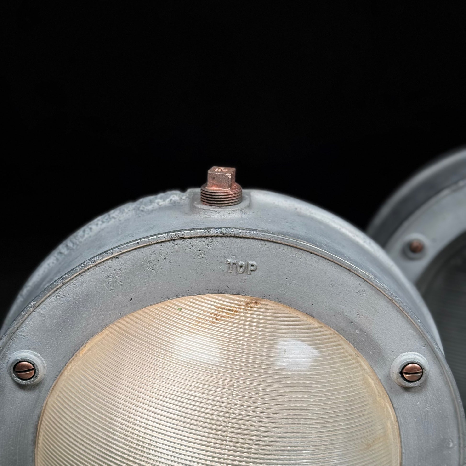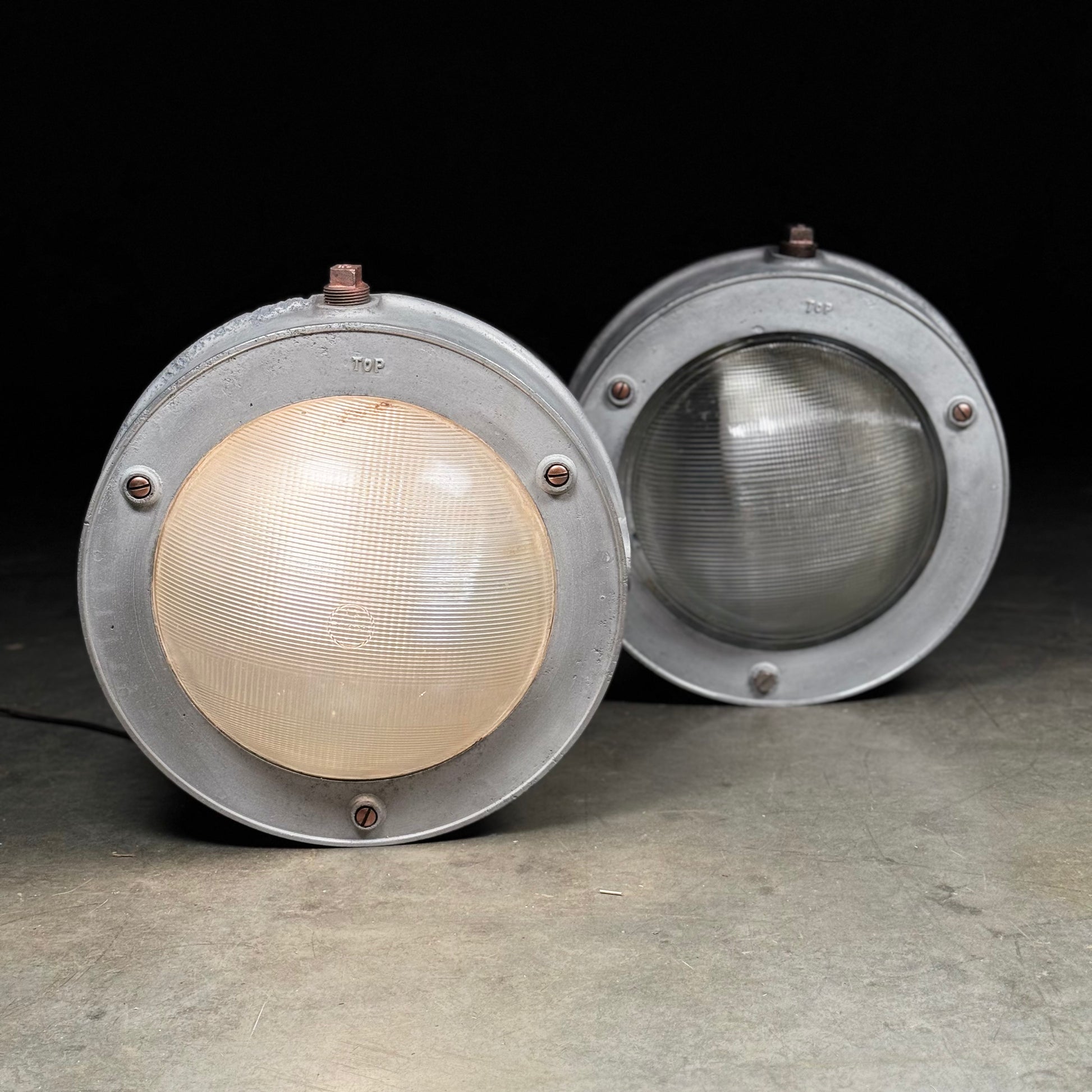 Reclaimed industrial Holophane wall-mounted lights, originally salvaged from a ship, offering a unique blend of maritime history and rugged functionality.