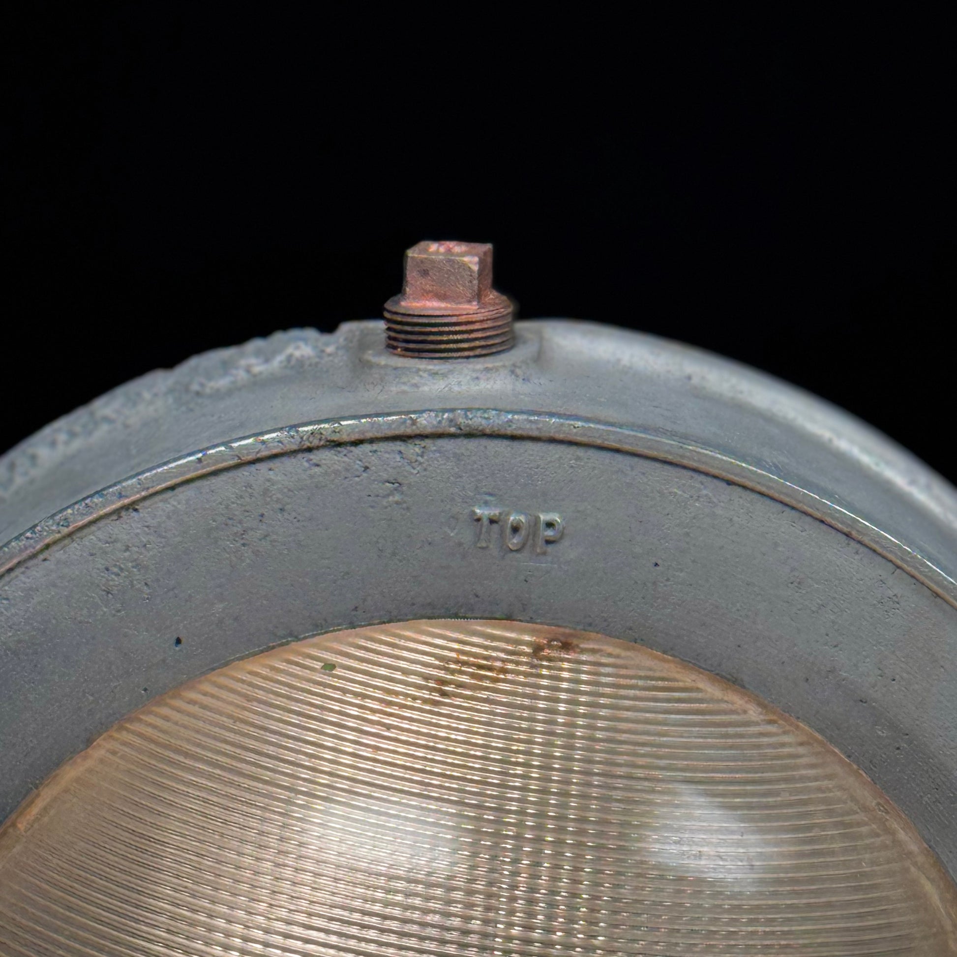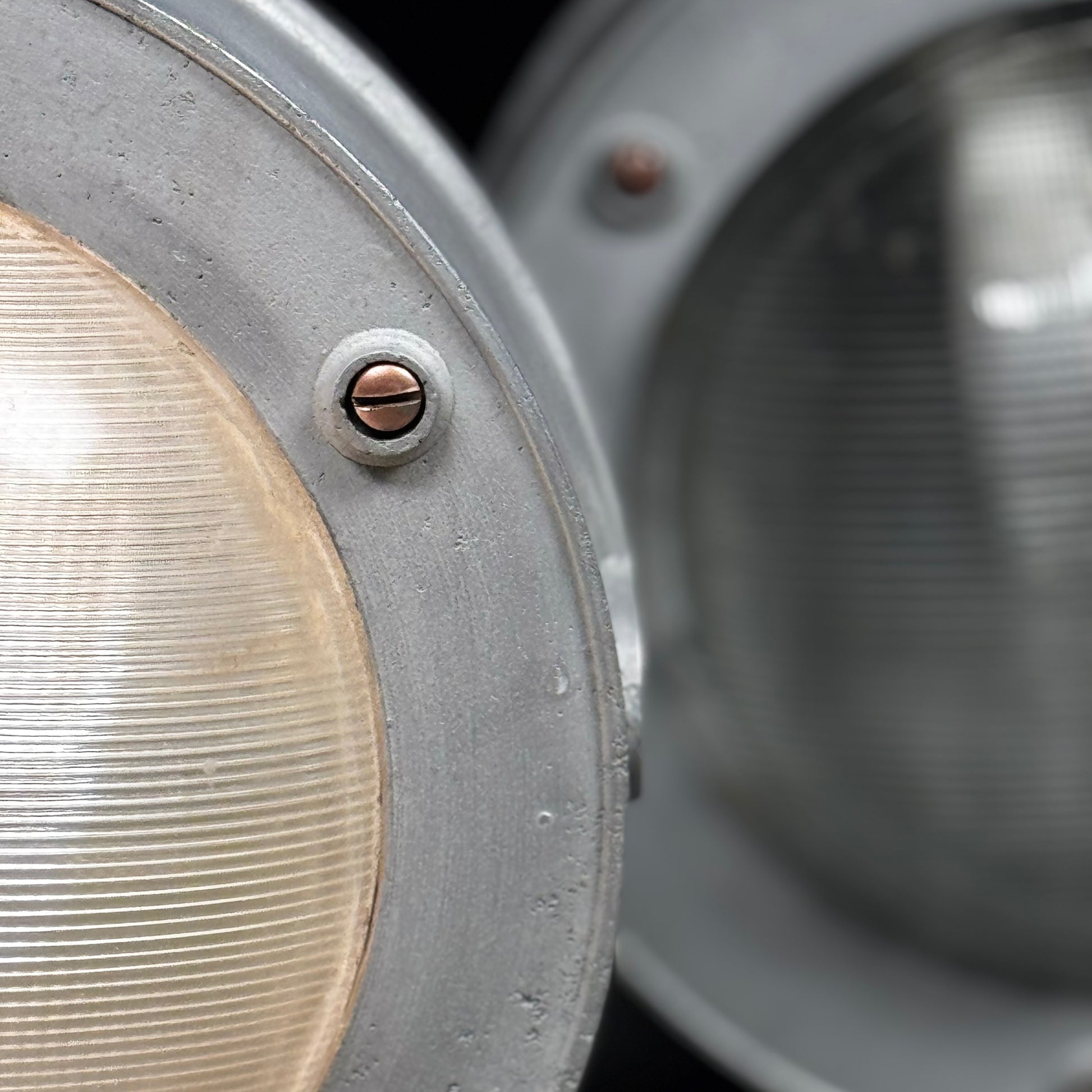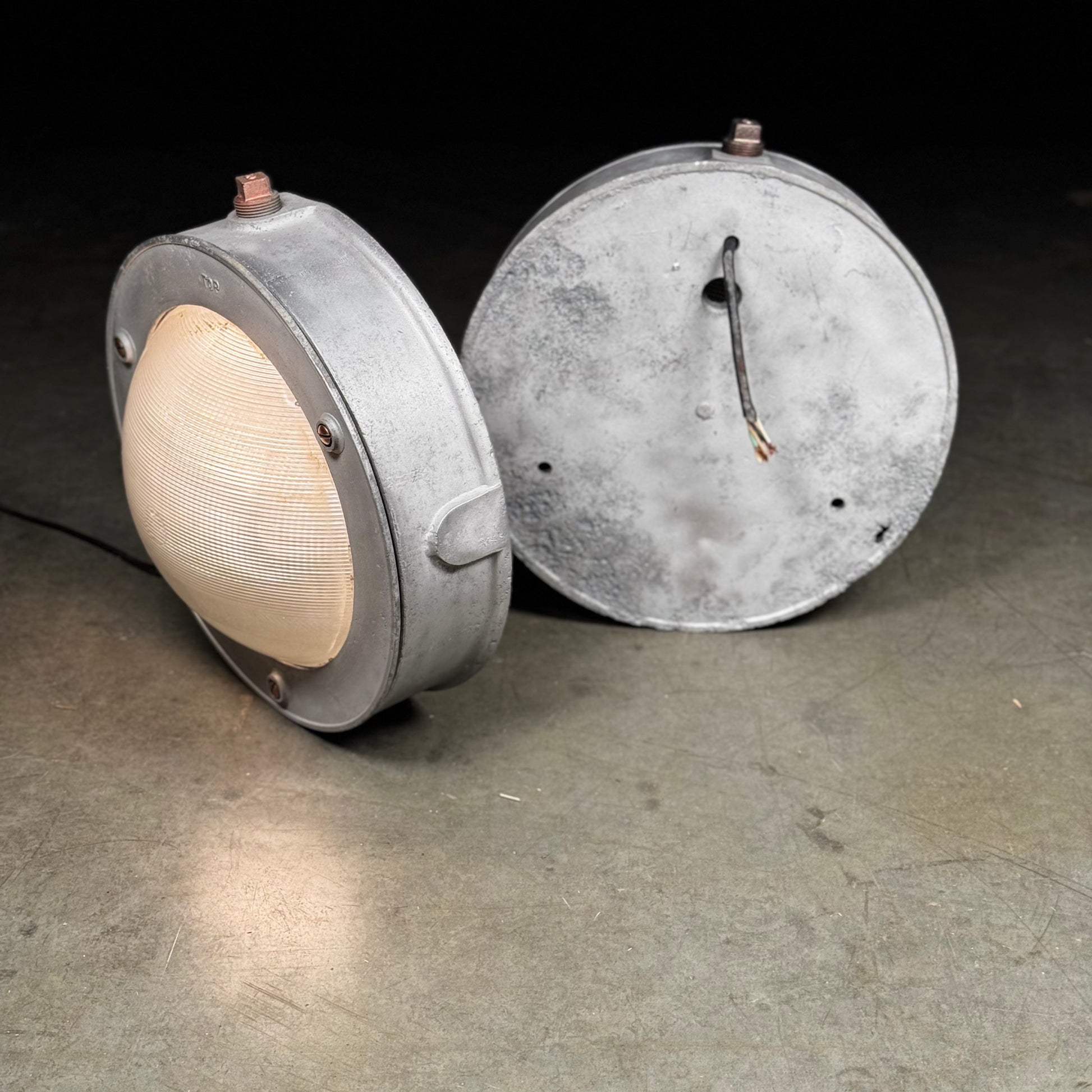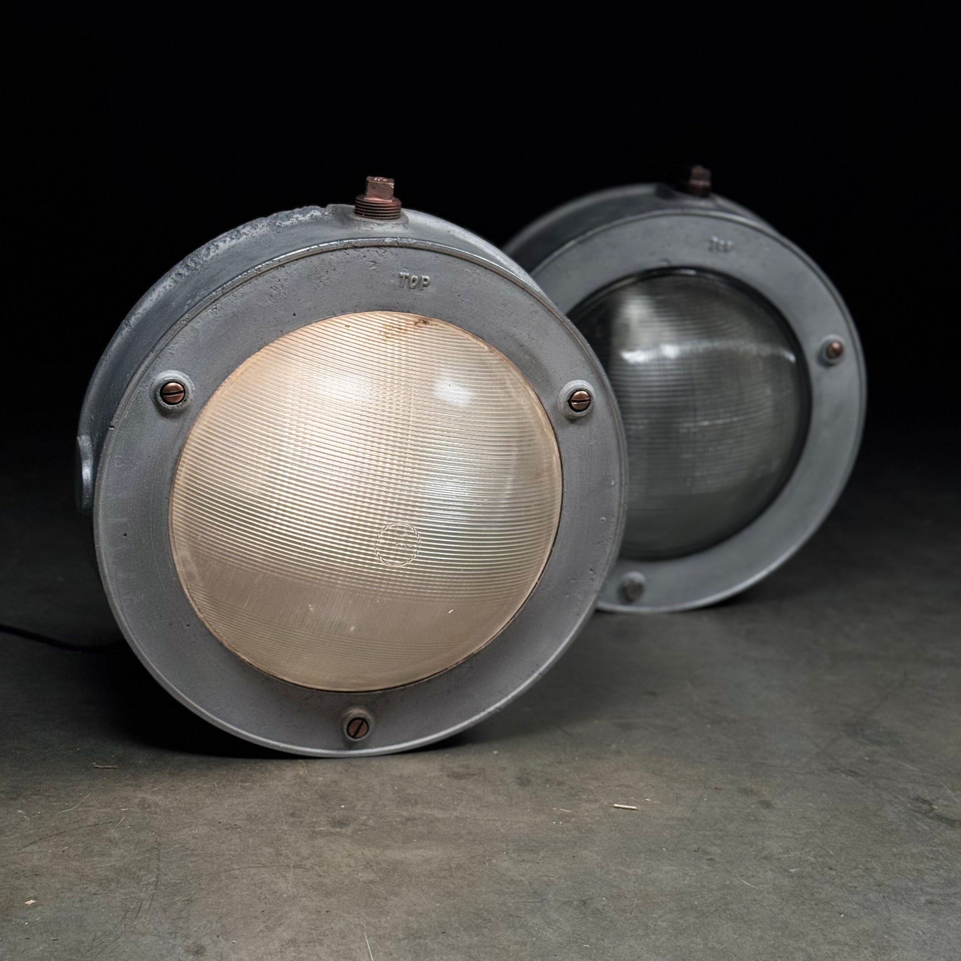 Reclaimed industrial Holophane wall-mounted lights, originally salvaged from a ship, offering a unique blend of maritime history and rugged functionality.