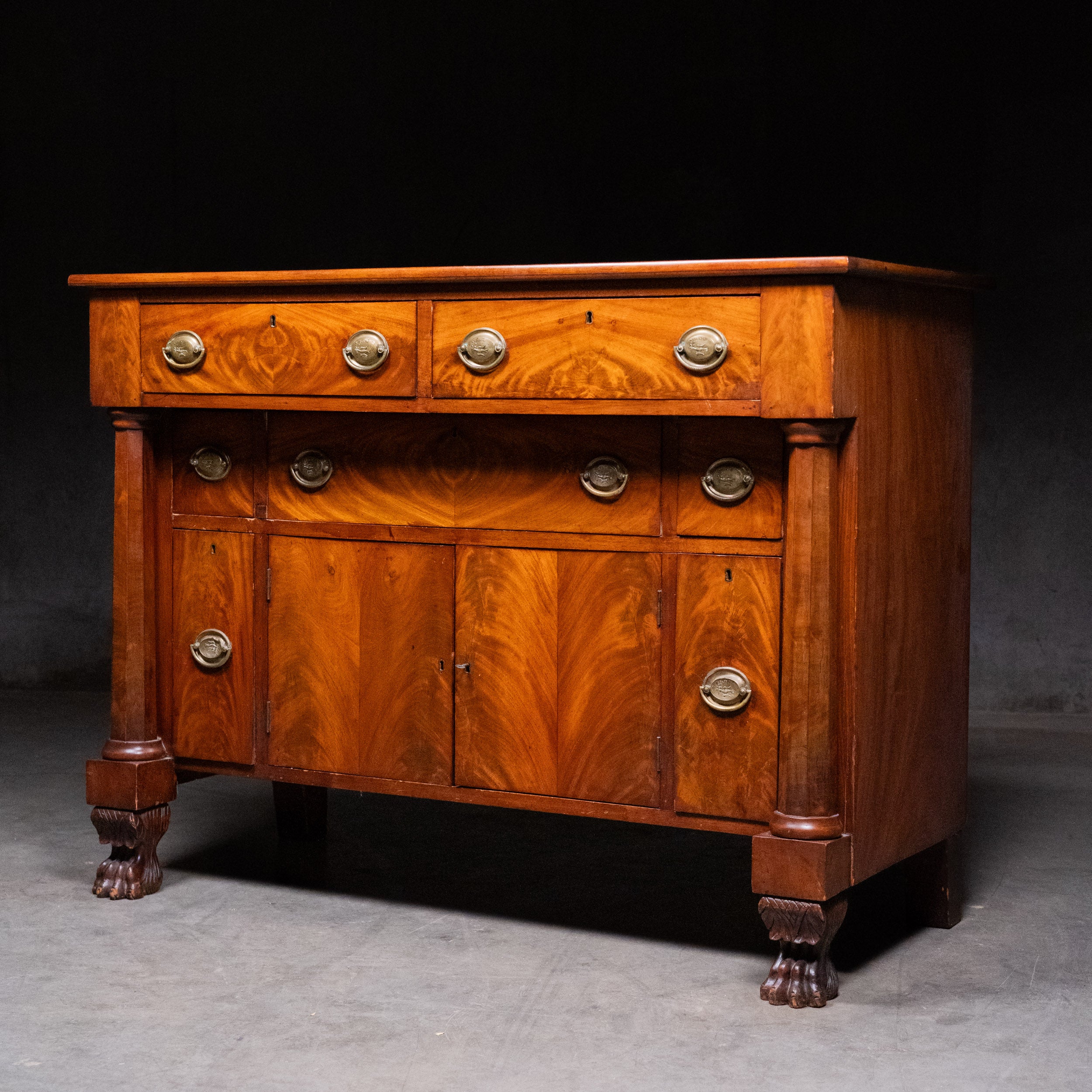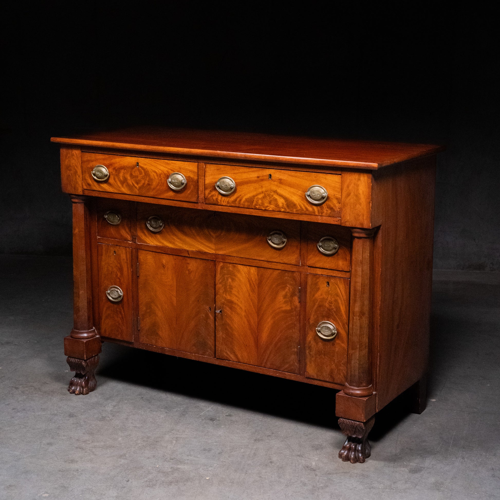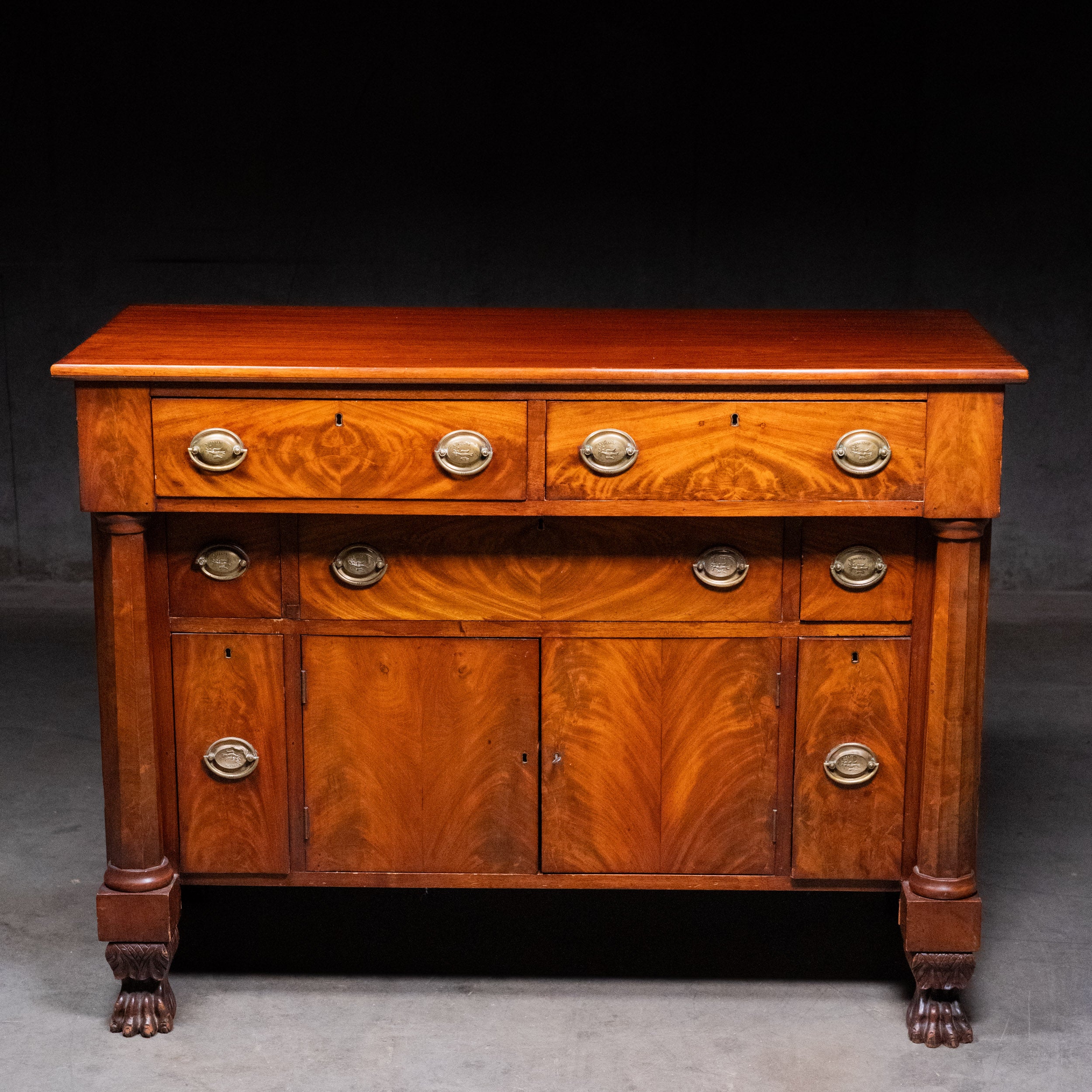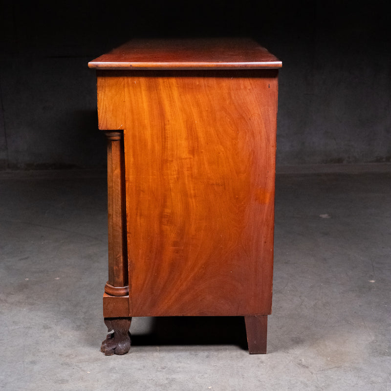This early 19th century English Regency sideboard is crafted from solid mahogany and retains its original architectural presence and rich patina. The cabinet stands on bold carved paw feet, with turned front columns framing a balanced arrangement of drawers and cupboards.
