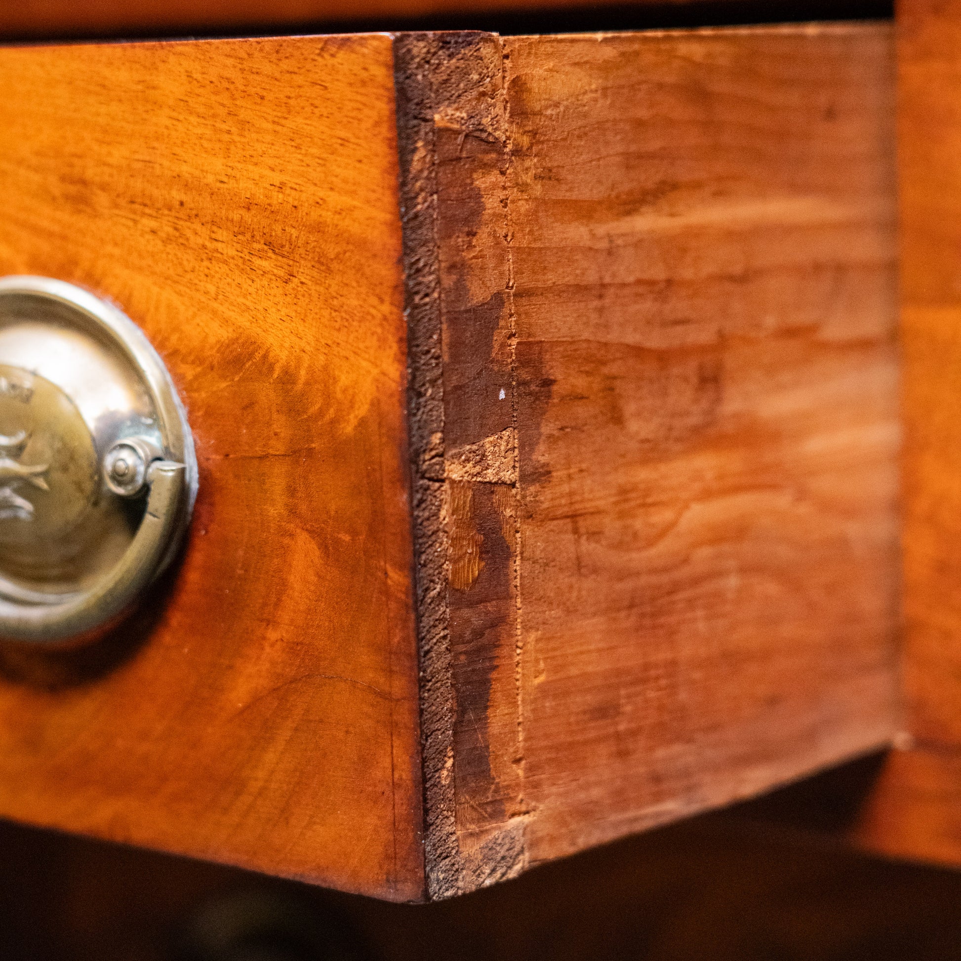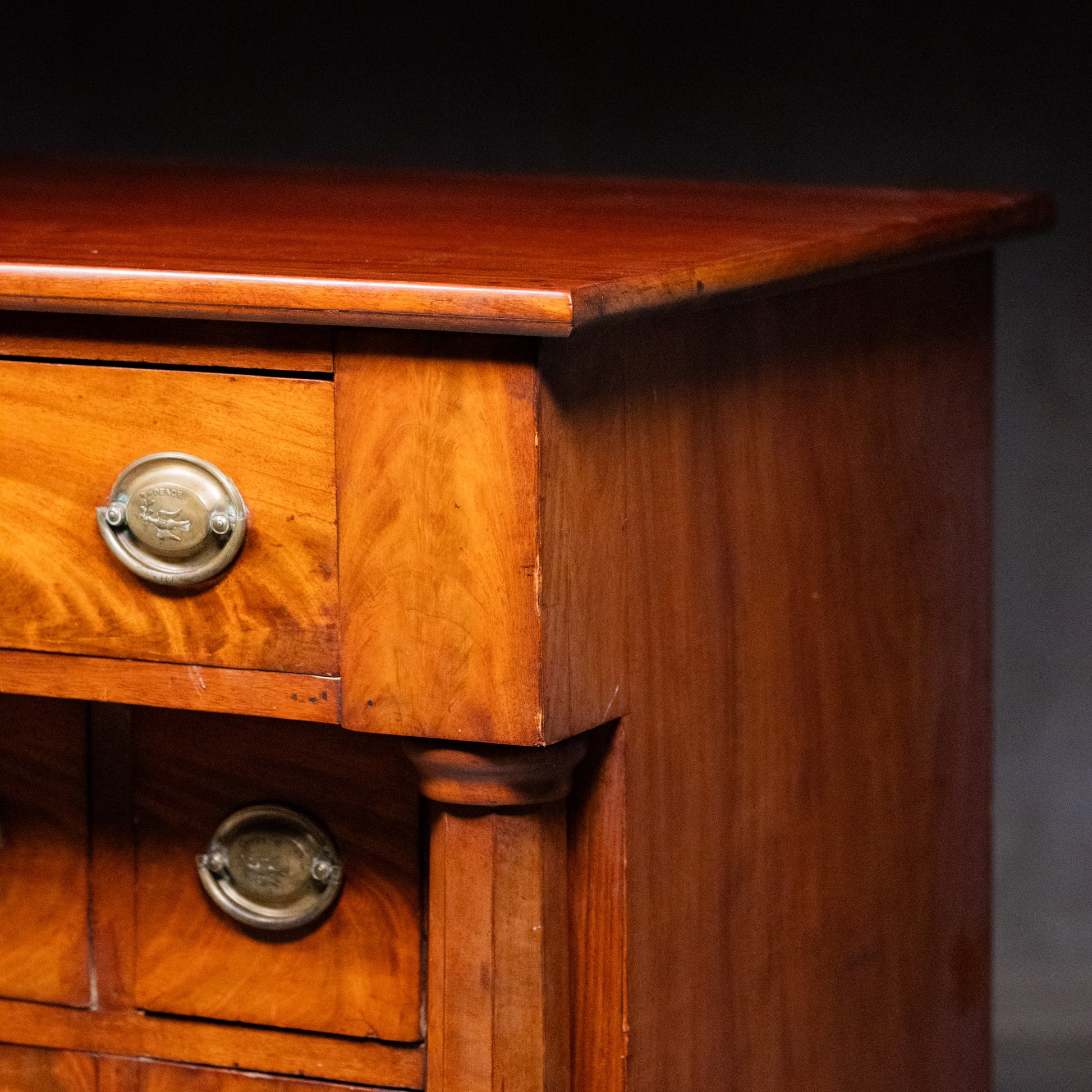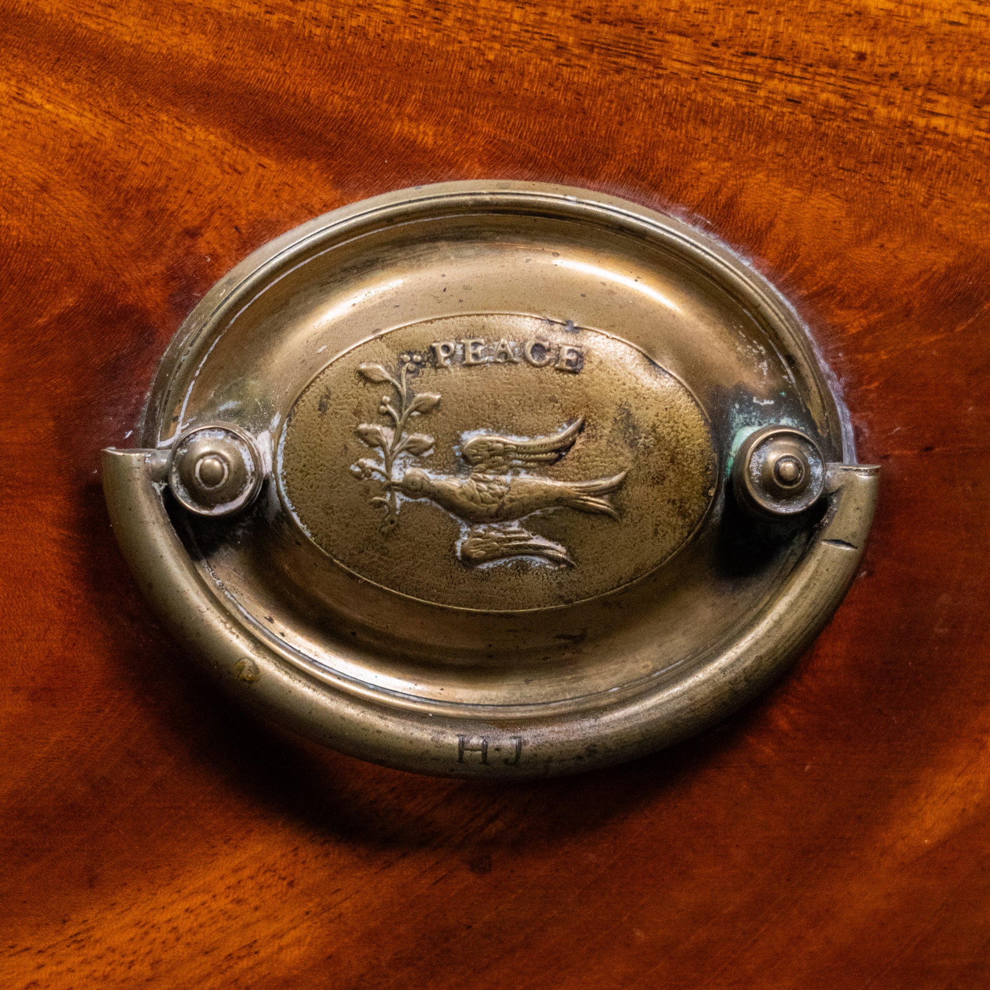 The drawer fronts feature beautifully figured mahogany and retain their original oval brass pulls, each cast with a dove and olive branch beneath the word Peace — a motif associated with post-Napoleonic England. Hand-cut dovetails, original locks, and period construction details are evident throughout. This piece was refinished in the 1970.