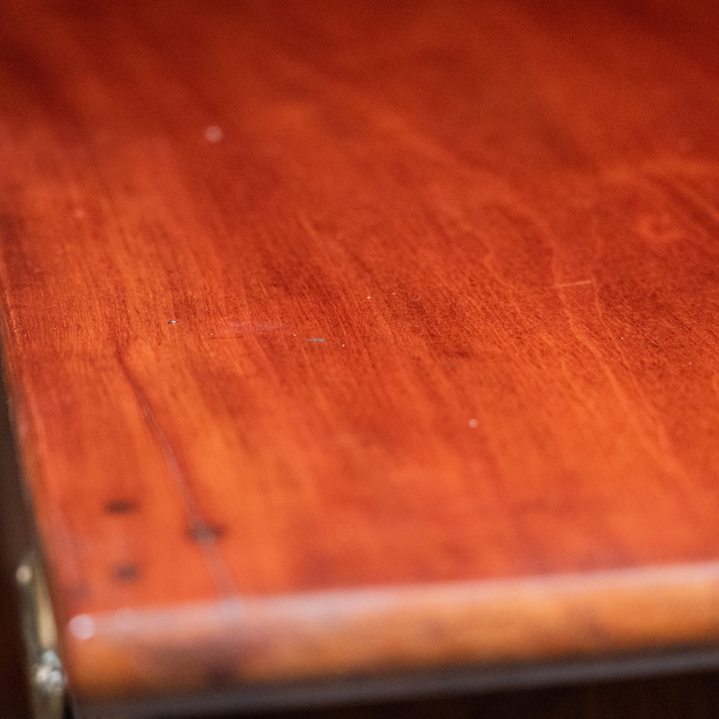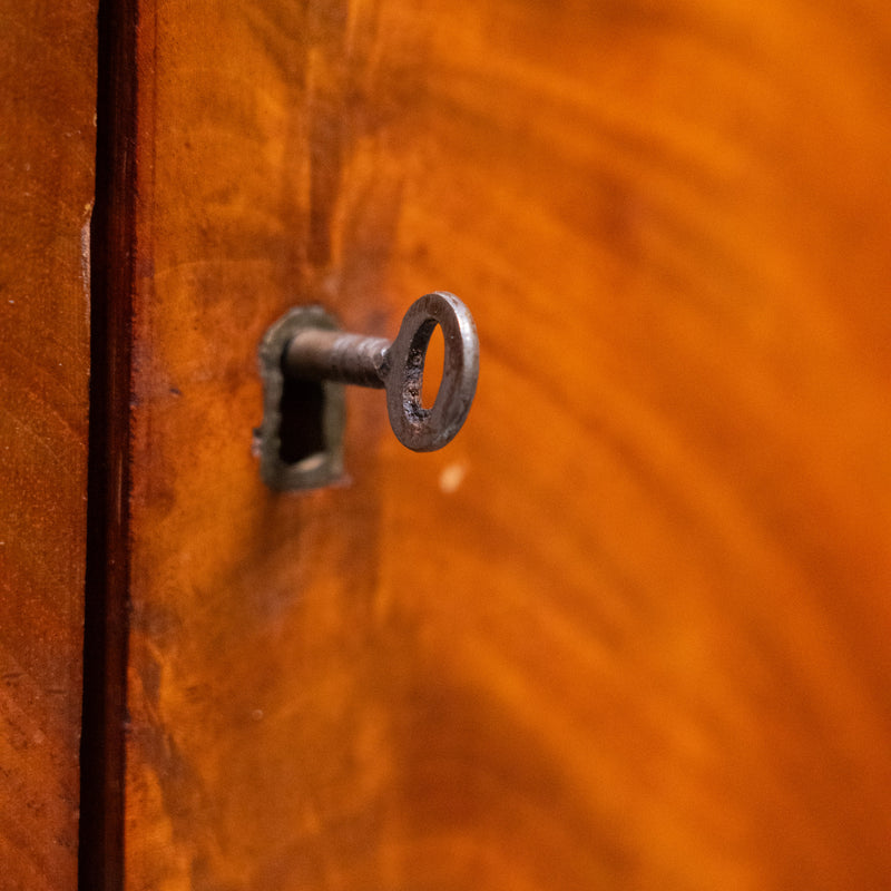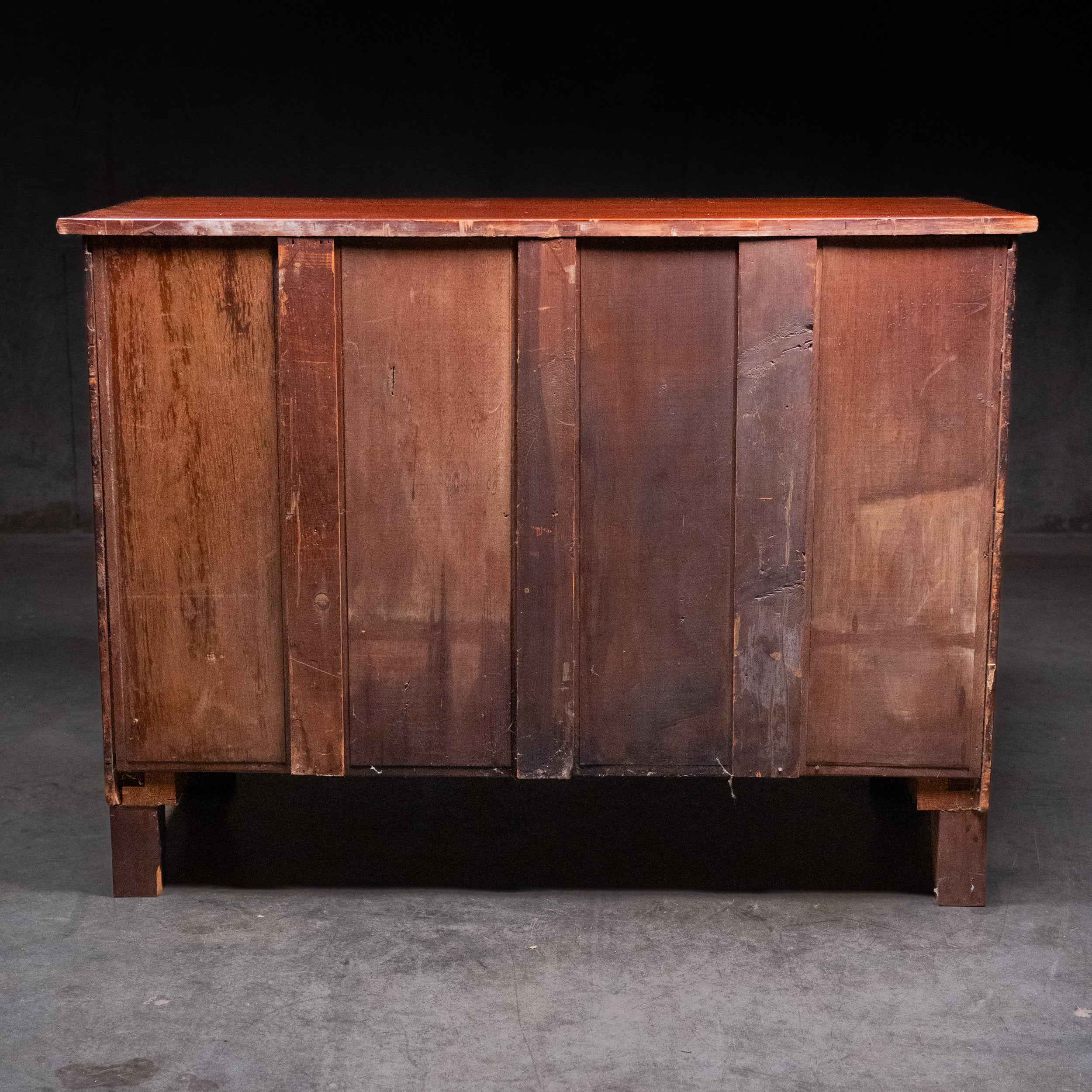 The drawer fronts feature beautifully figured mahogany and retain their original oval brass pulls, each cast with a dove and olive branch beneath the word Peace — a motif associated with post-Napoleonic England. Hand-cut dovetails, original locks, and period construction details are evident throughout. This piece was refinished in the 1970.