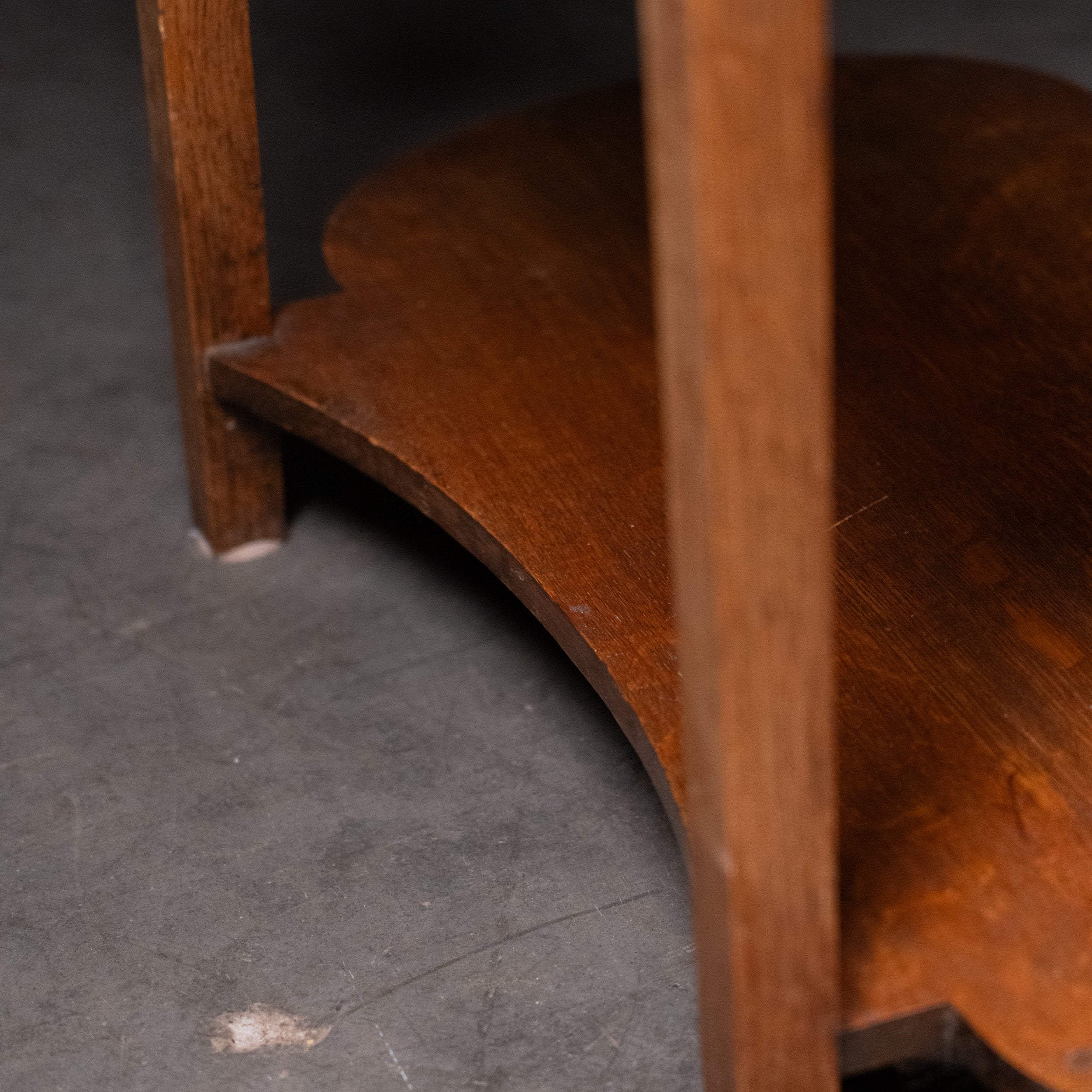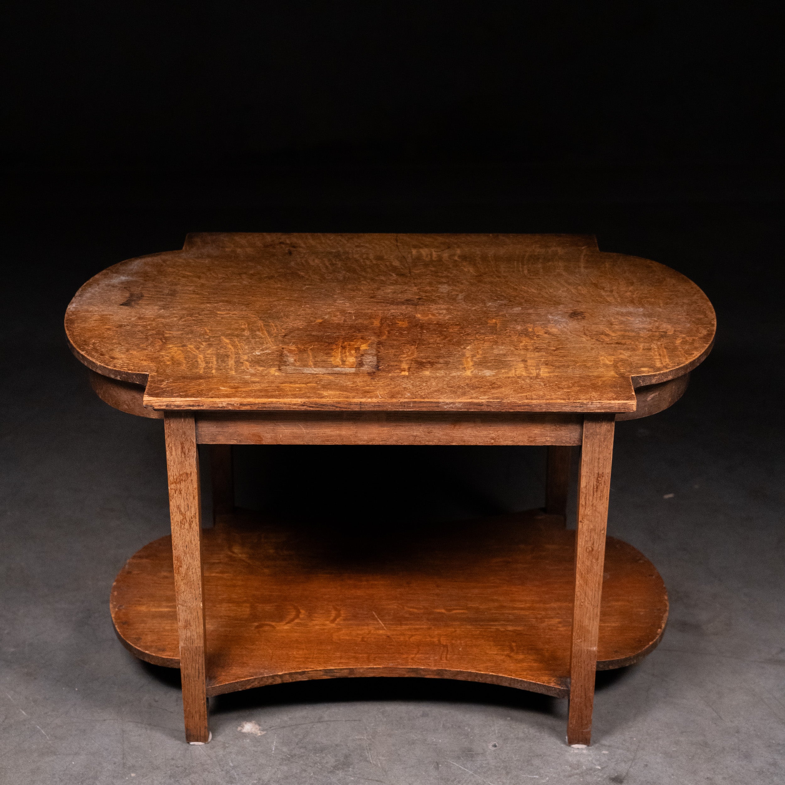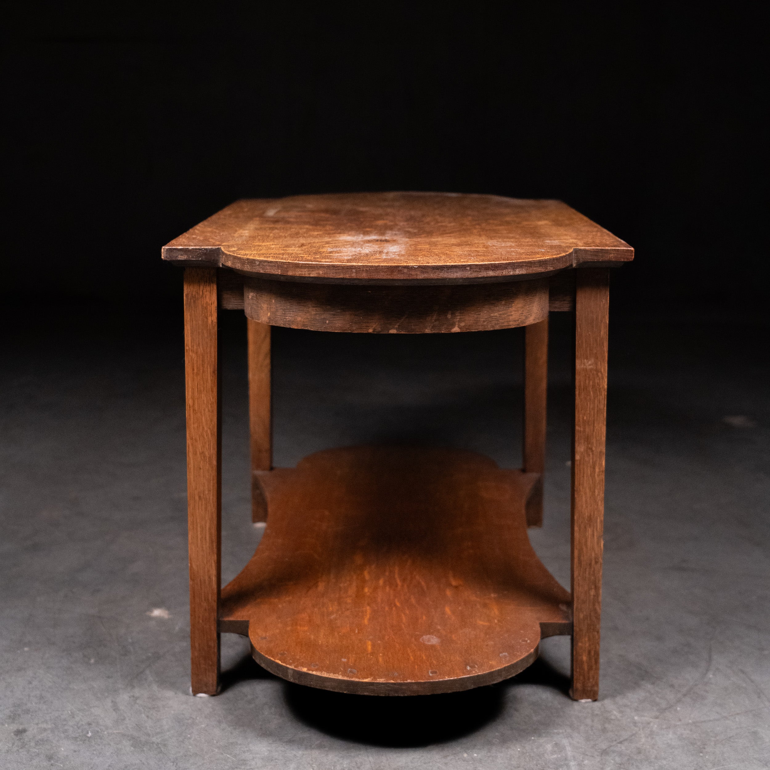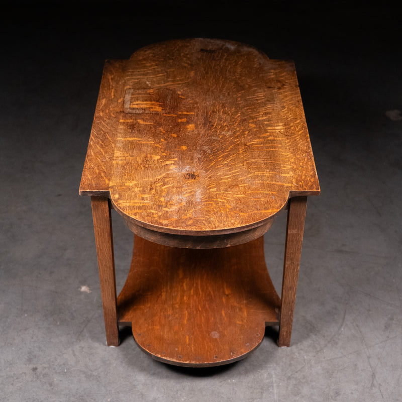 Constructed in solid oak with visible quarter-sawn grain, the table features clean rectilinear legs, a subtly shaped top, and a matching architectural lower shelf with gentle curves. The simplicity of form and emphasis on natural material are hallmarks of the English Arts & Crafts tradition, associated with makers such as Heals of London and the broader Cotswold school aesthetic.