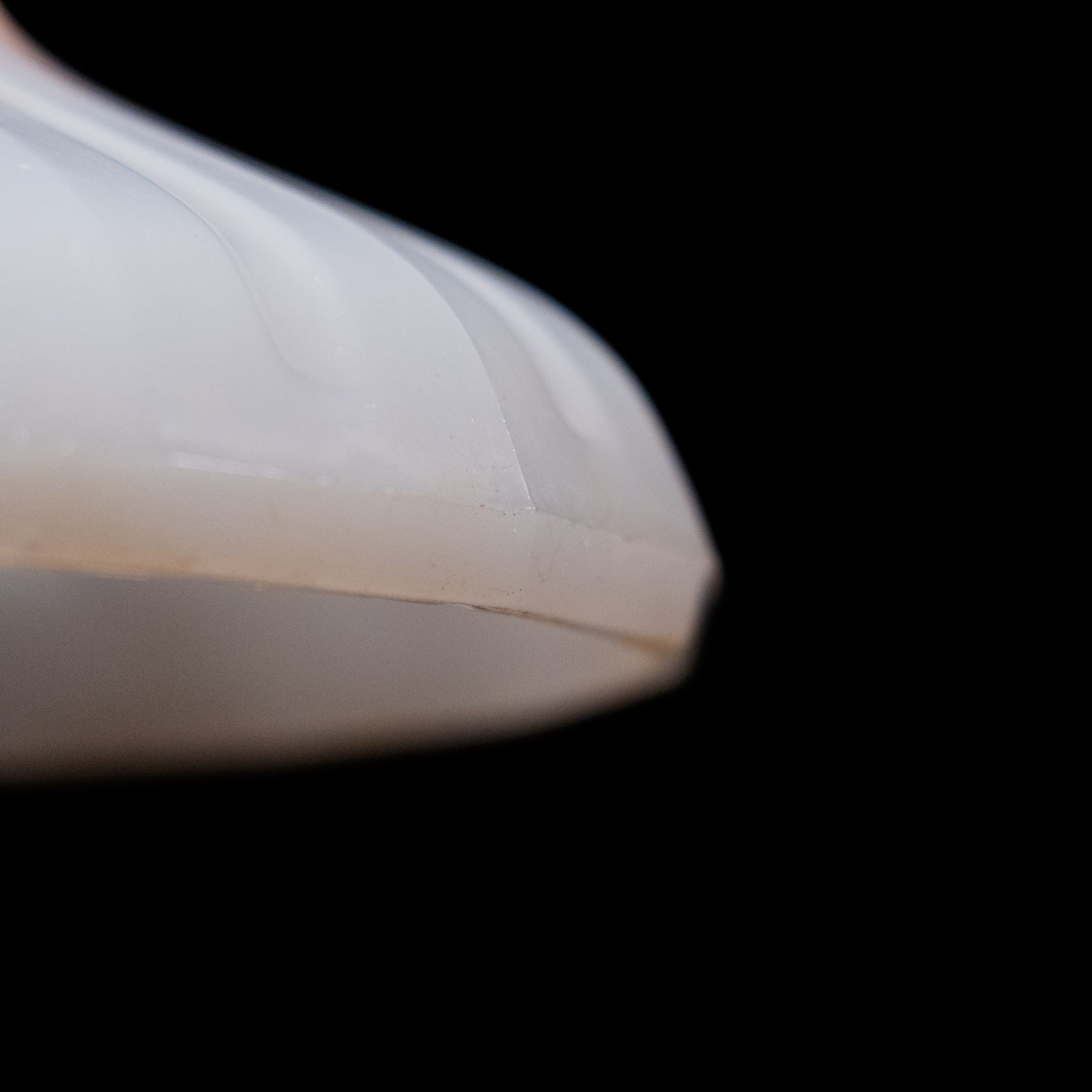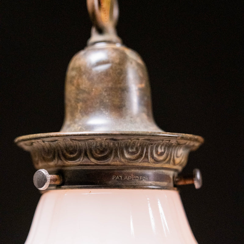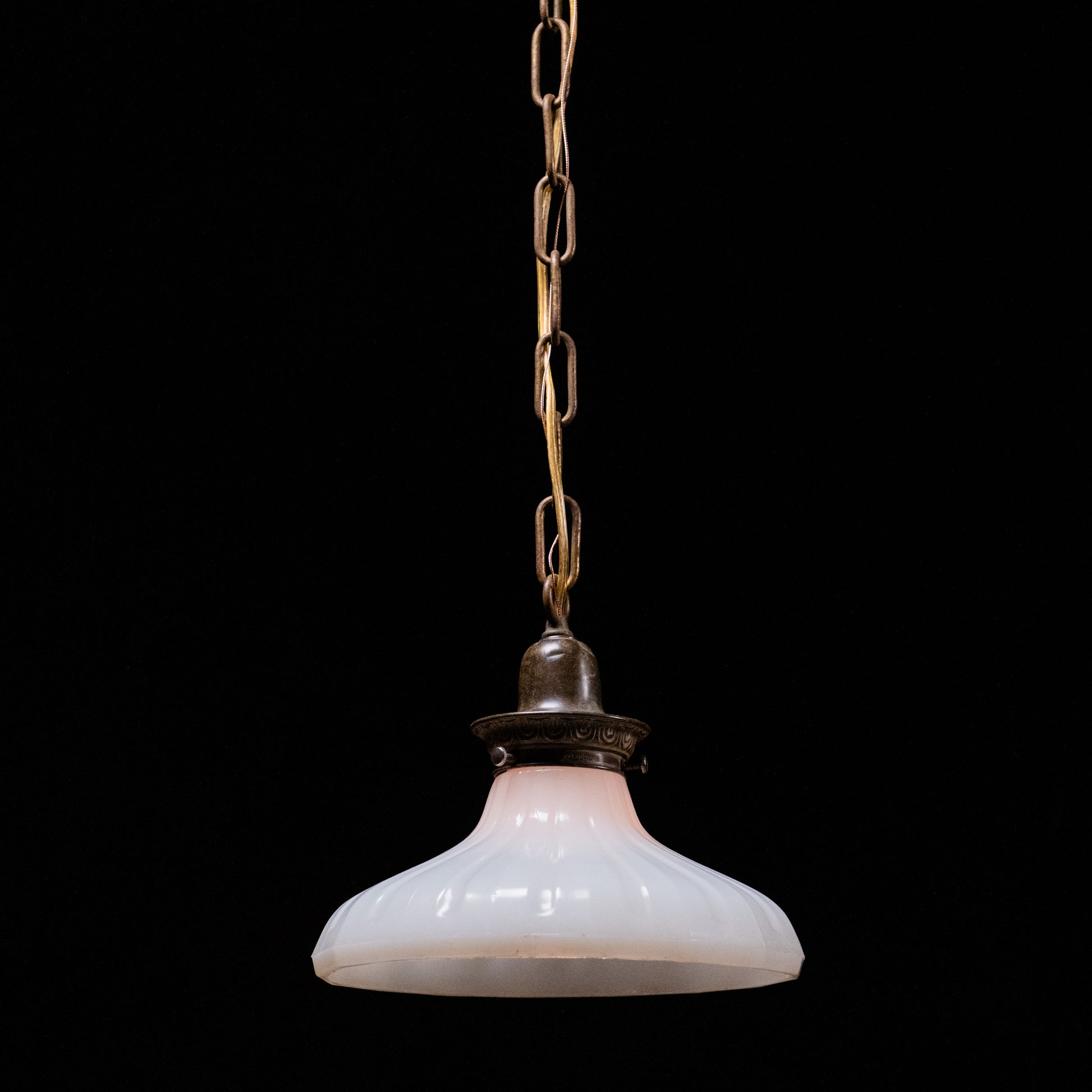 A pretty little early fixture with oxidized brass fitter on opaline glass pressed shade. Found in Ohio.