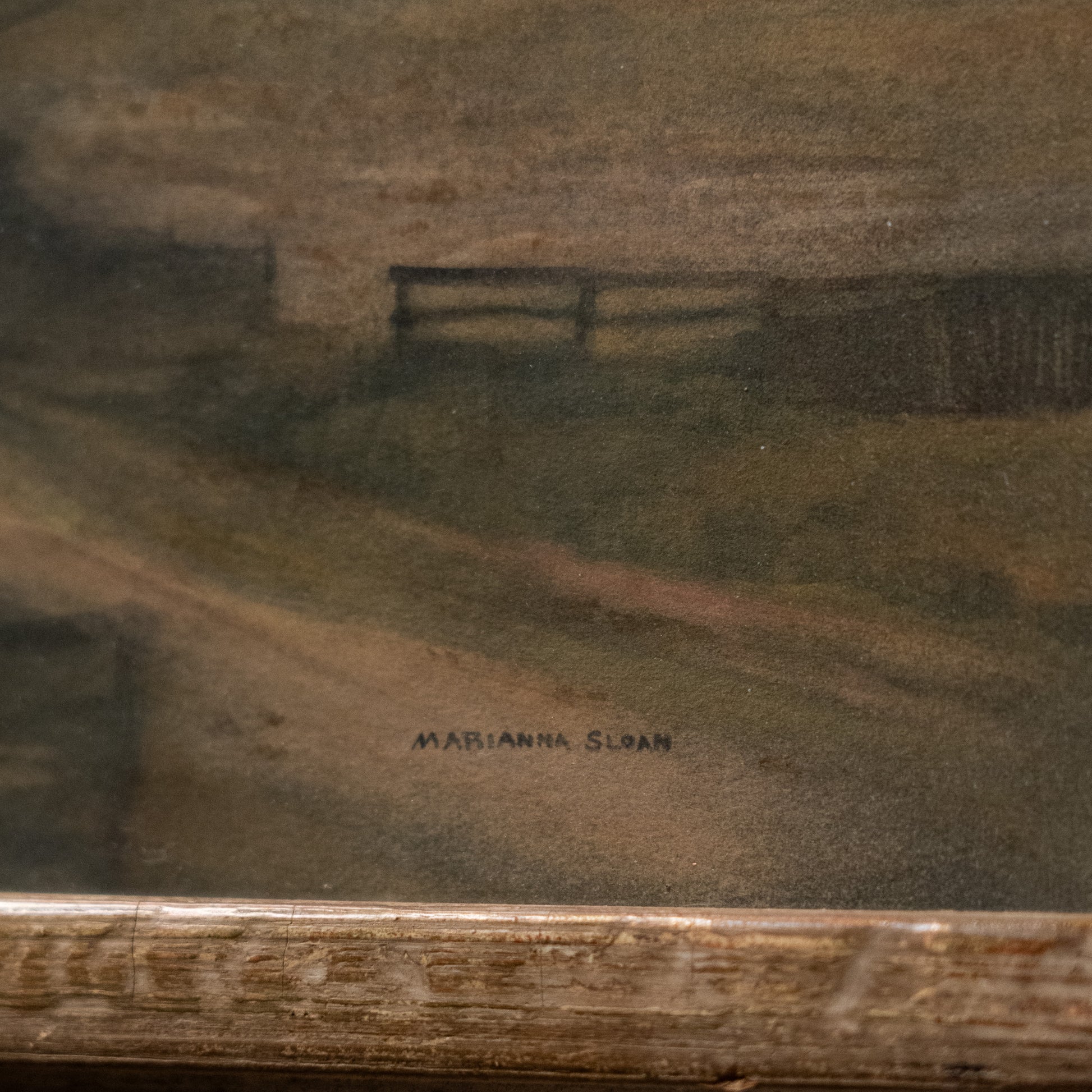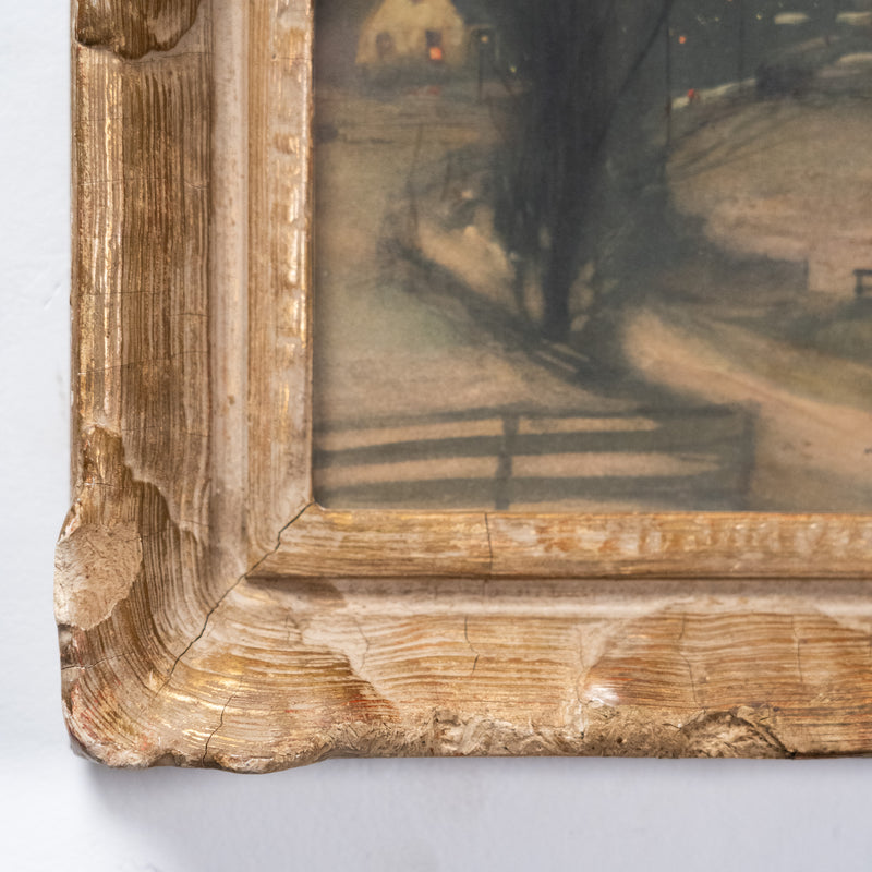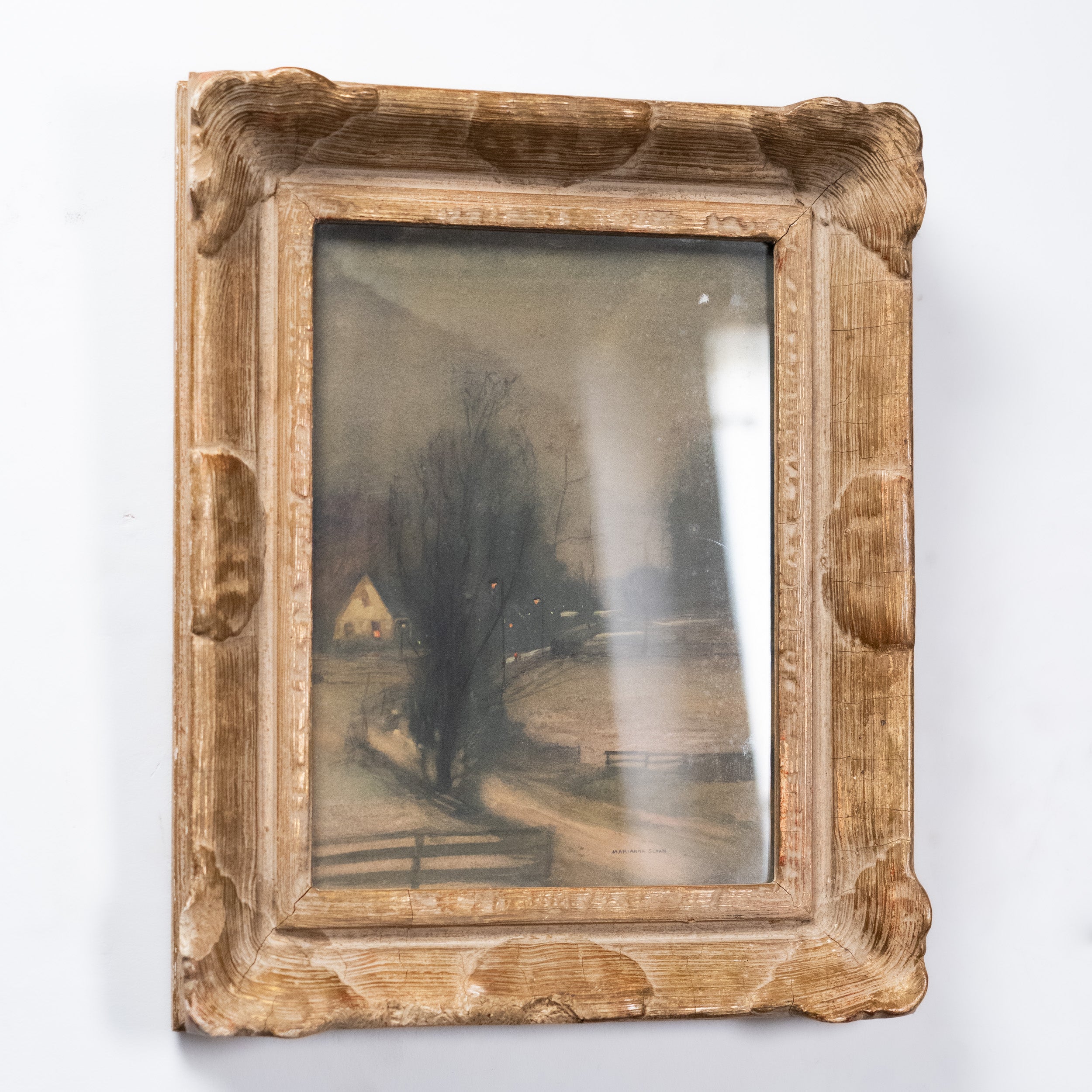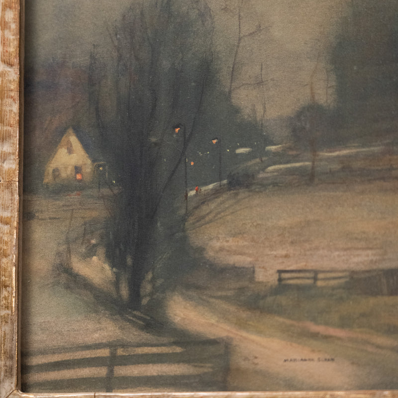 A softly atmospheric winter landscape signed Marianna Sloan, depicting a winding country road leading toward a warmly lit cottage. Rendered in the tonalist style popular in the early 20th century, the scene captures a quiet evening landscape with muted tones and subtle light. Presented in a substantial period carved frame with textured faux wood finish.