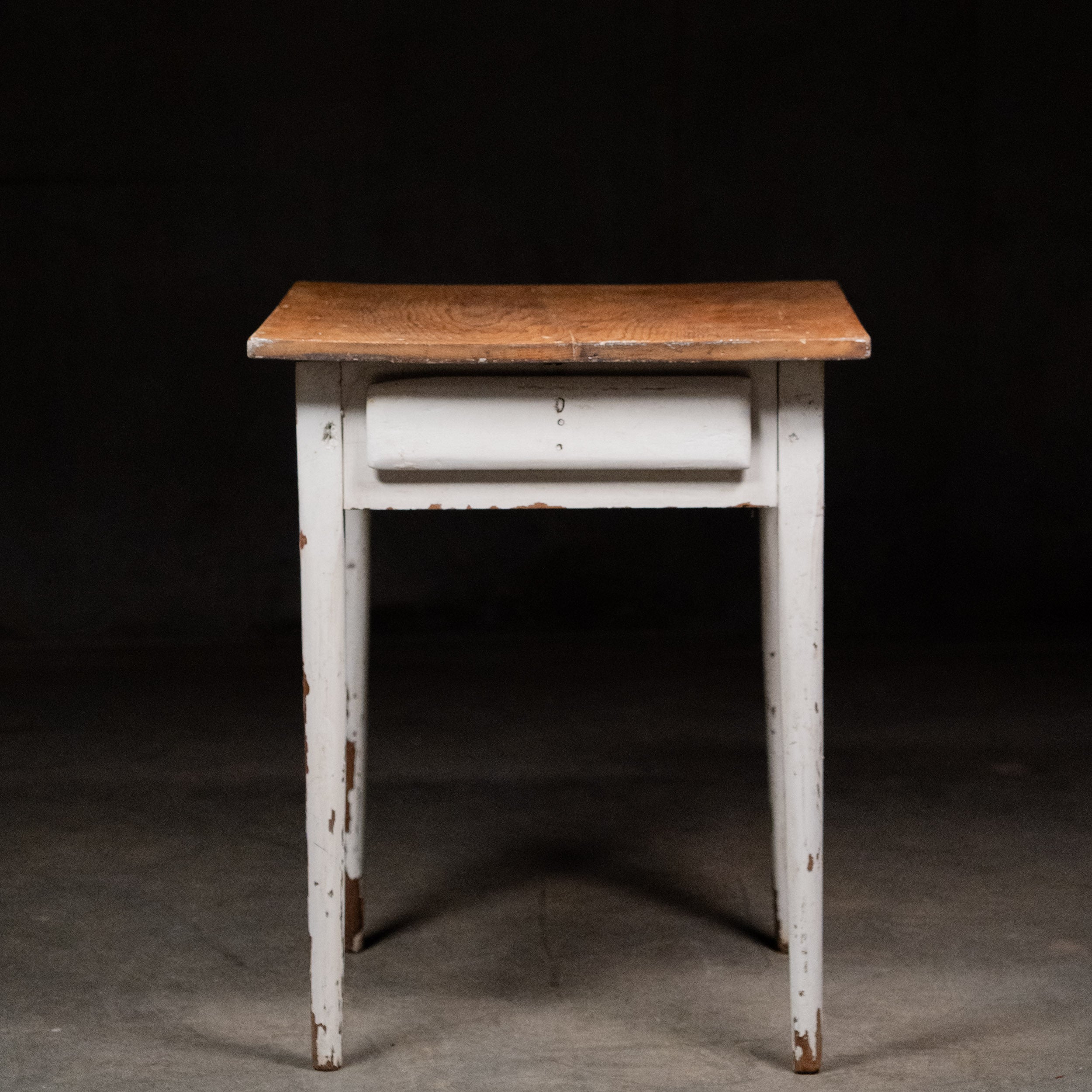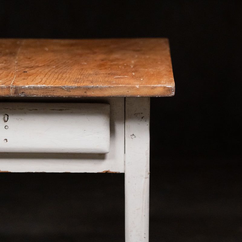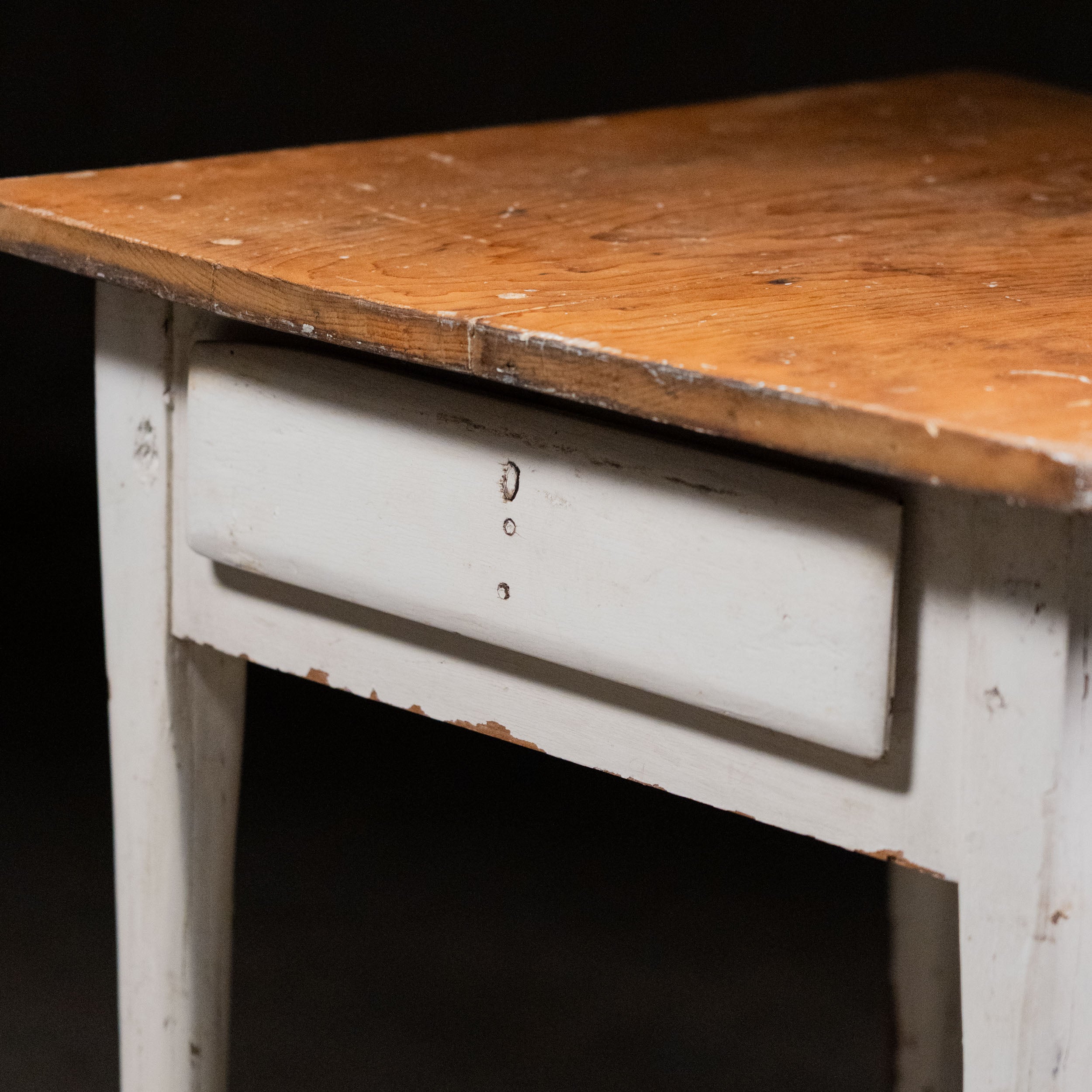 Retaining an old worn white paint this pine side table features an overlapping drawer, square nailed construction with hand turned legs.