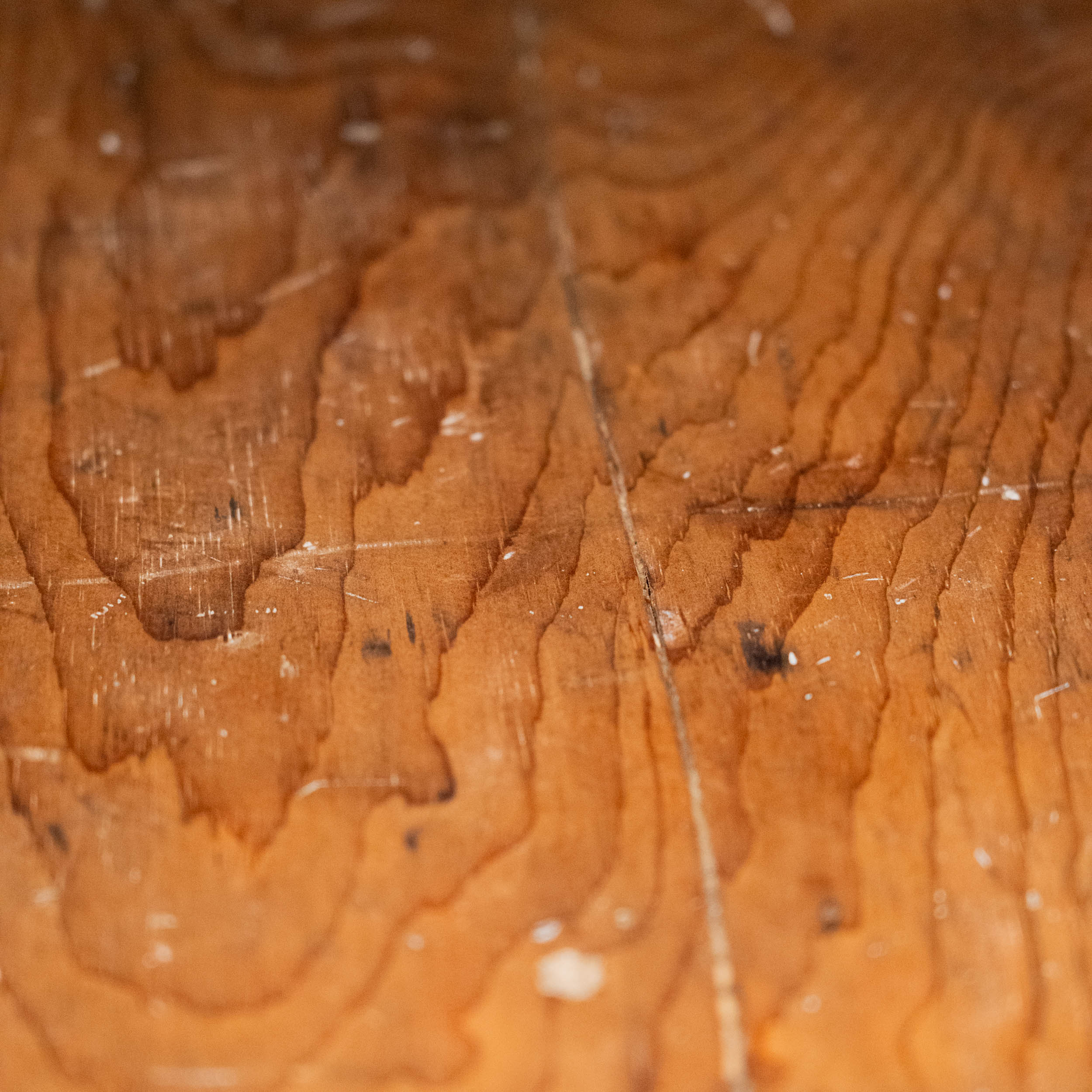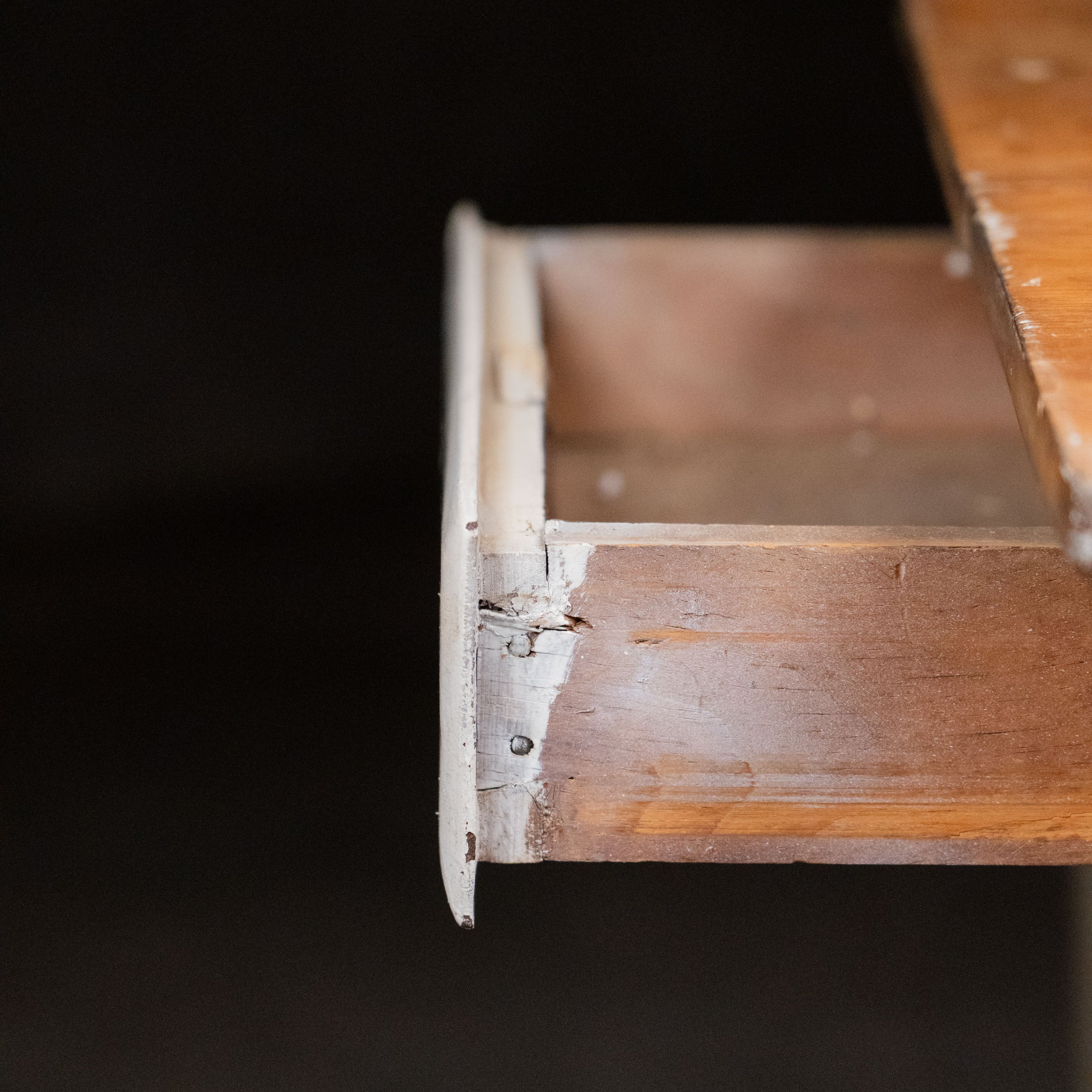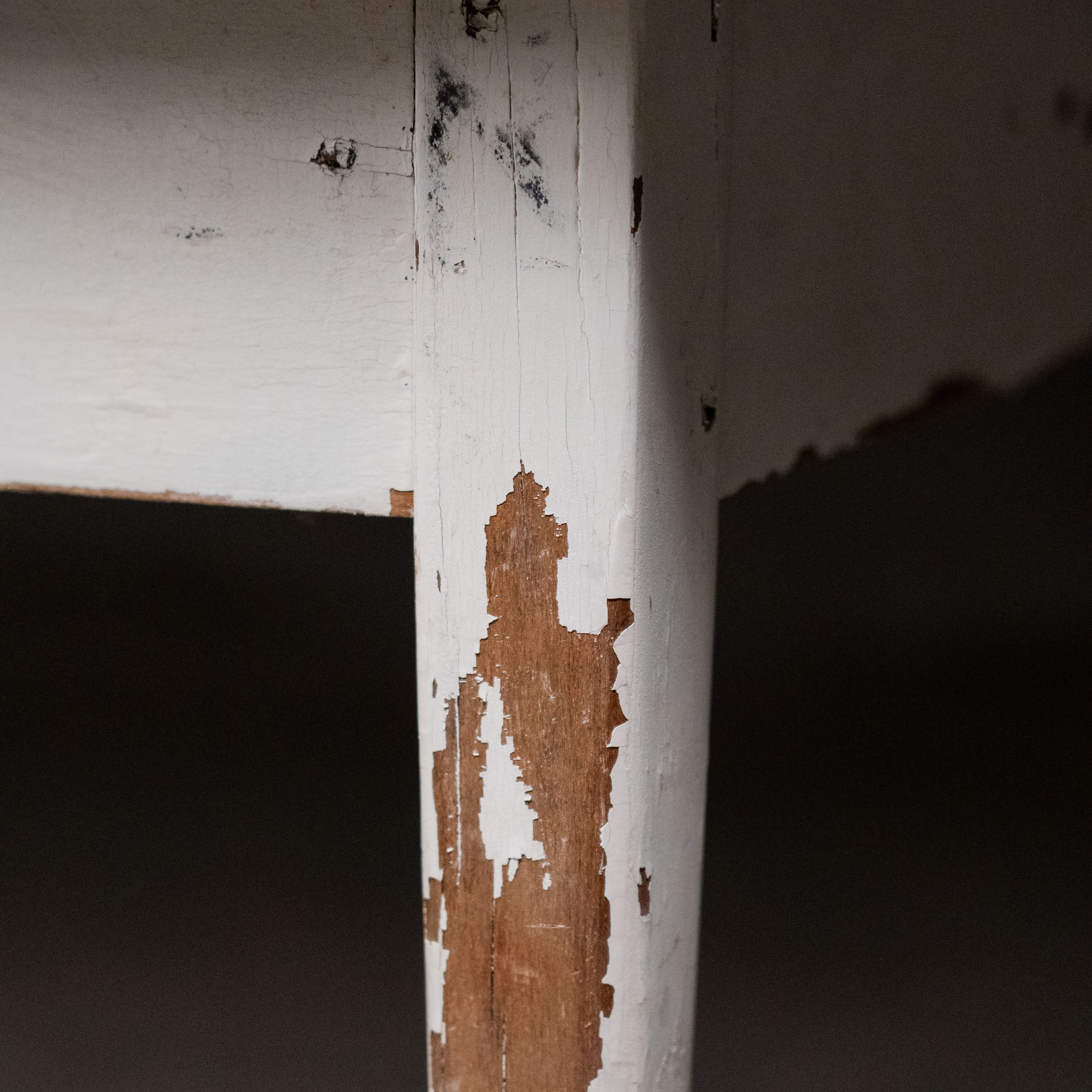Retaining an old worn white paint this pine side table features an overlapping drawer, square nailed construction with hand turned legs.