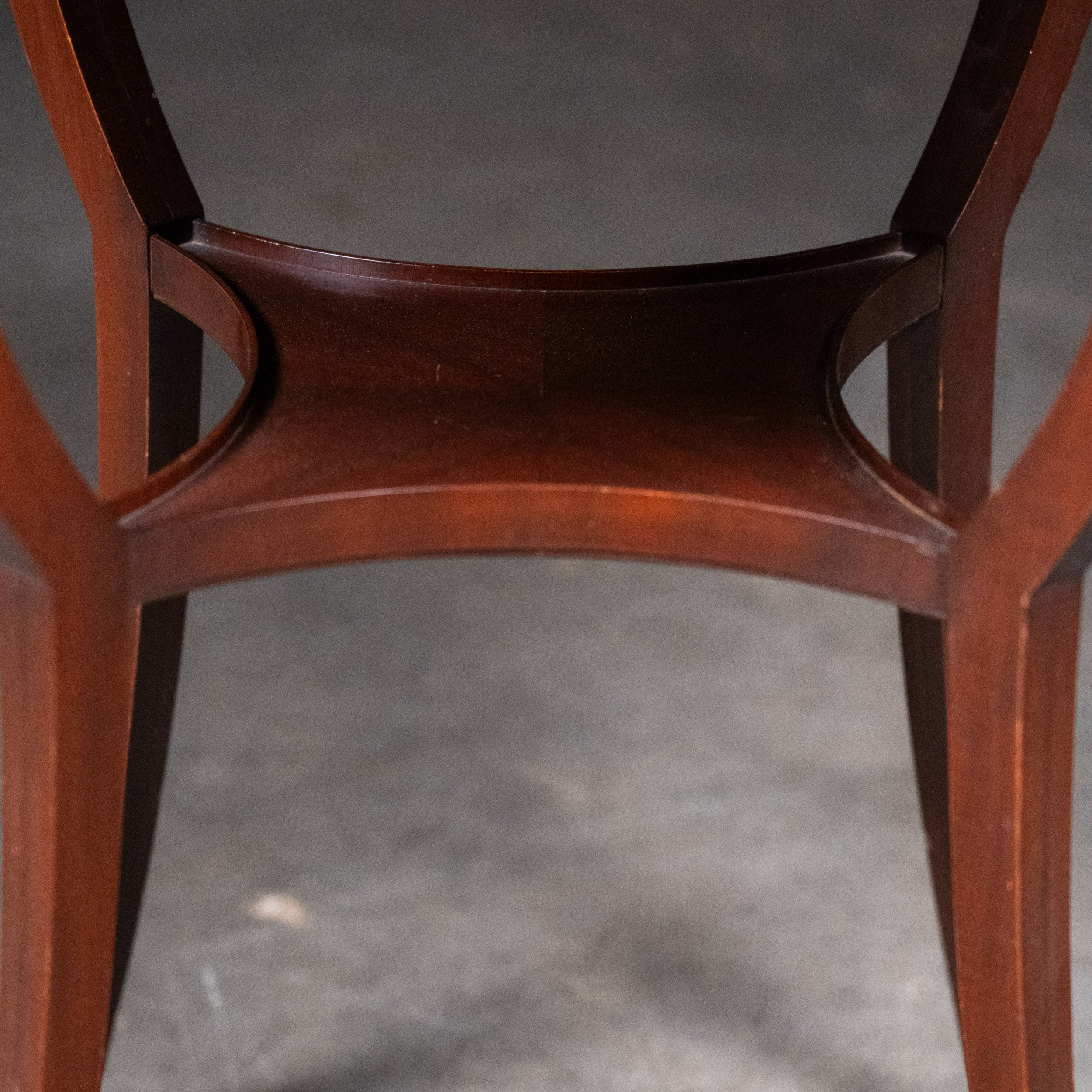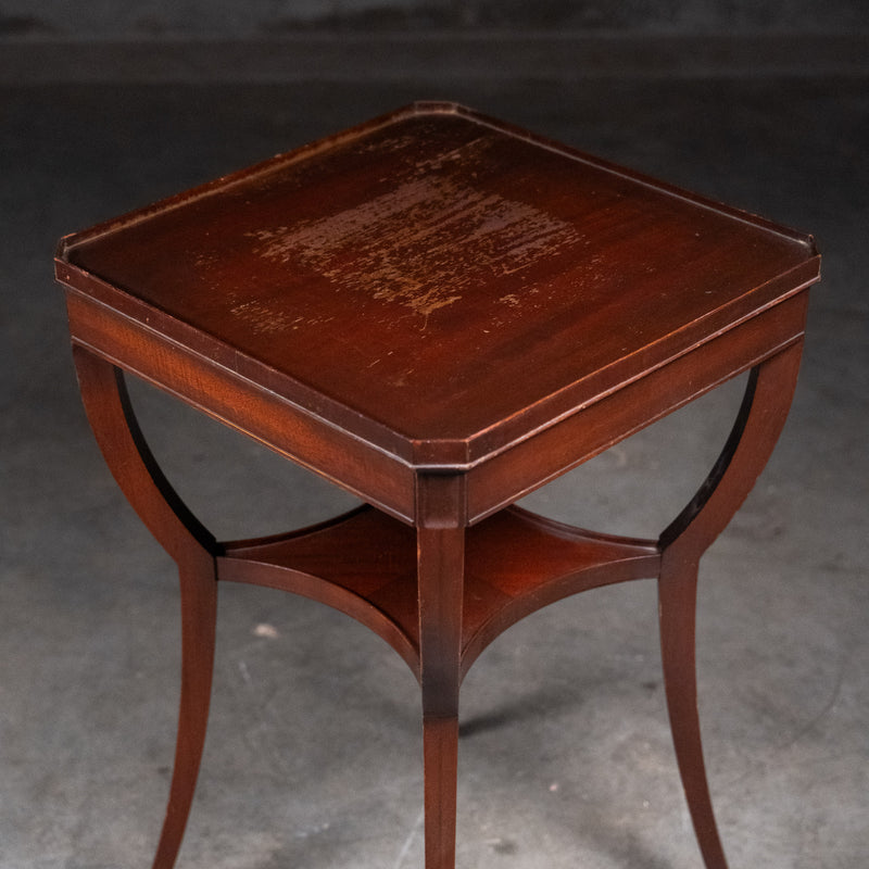 This early 20th century English occasional table is crafted from solid mahogany and features elegant tapered legs joined by a refined curved stretcher. The square top retains its original surface with gentle wear consistent with age, lending warmth and authenticity.