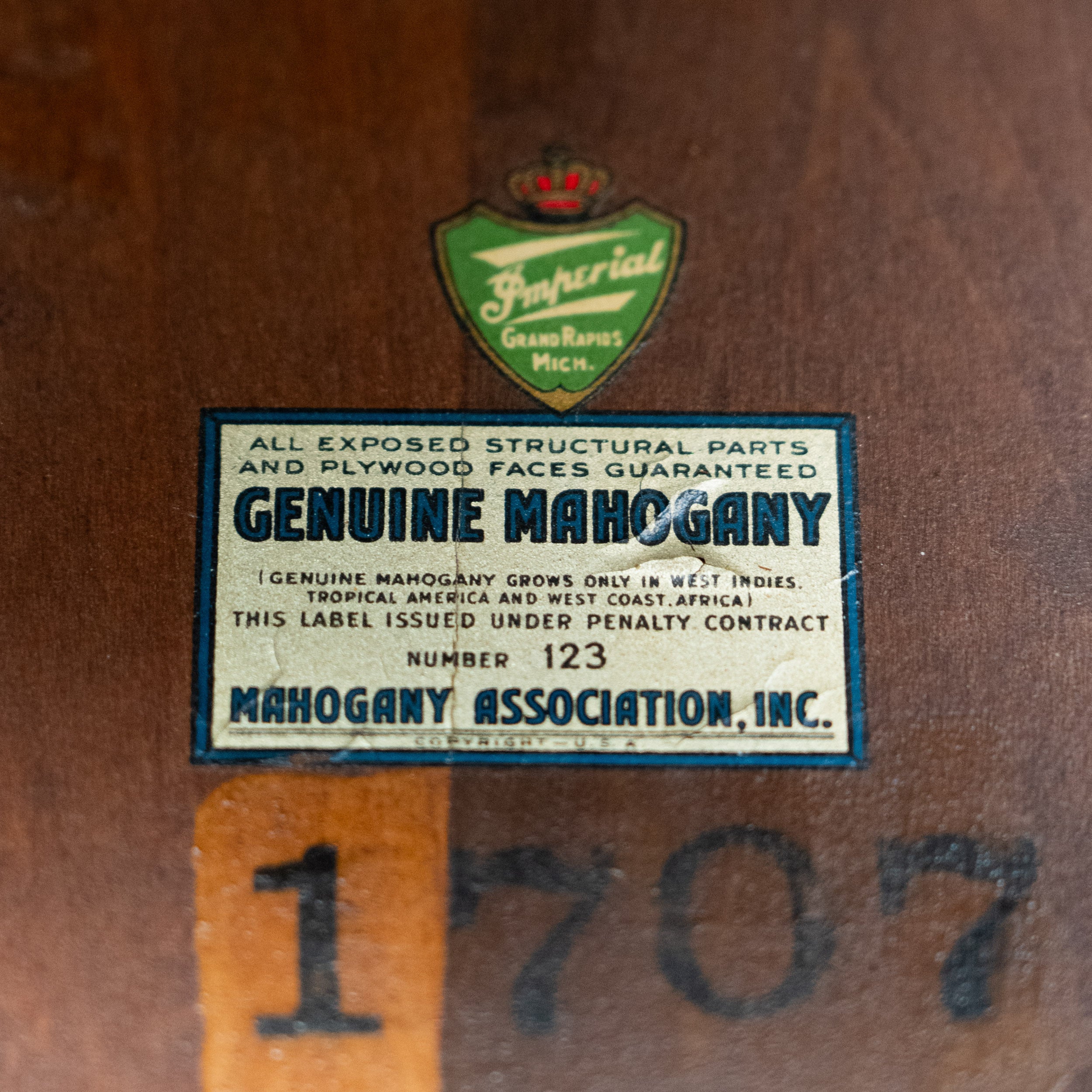 Produced by Imperial Furniture of Grand Rapids, Michigan—one of America’s leading furniture-making centers during the early 20th century—this piece dates to approximately circa 1918–1935. It retains its original Mahogany Association, Inc. certification label, issued under penalty contract, guaranteeing that all exposed structural parts and veneered surfaces are constructed of genuine mahogany sourced from the West Indies, Tropical America, and West Africa. Such certification was reserved for higher-grade furniture of the period and reflects an era when material authenticity and craftsmanship were strictly regulated.
