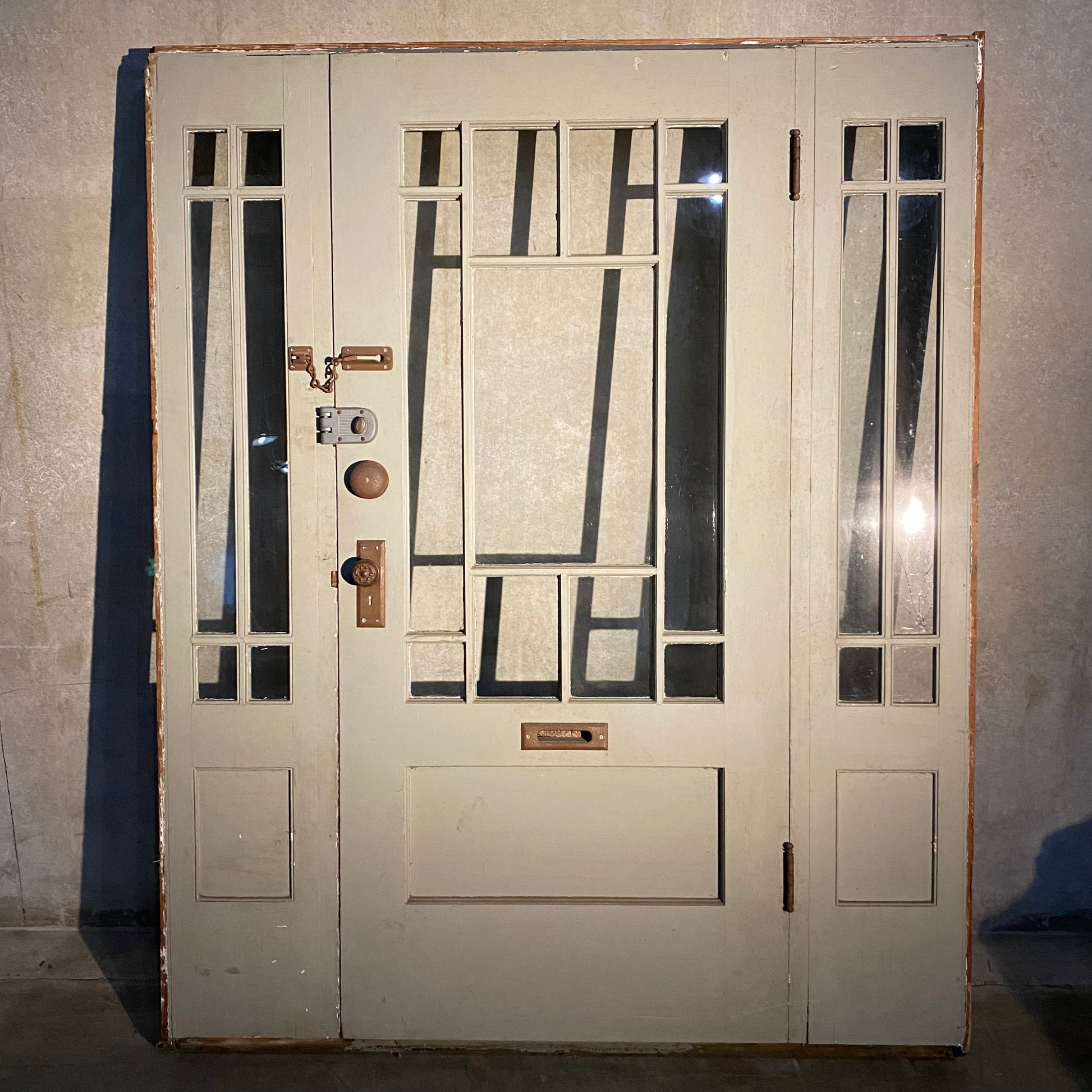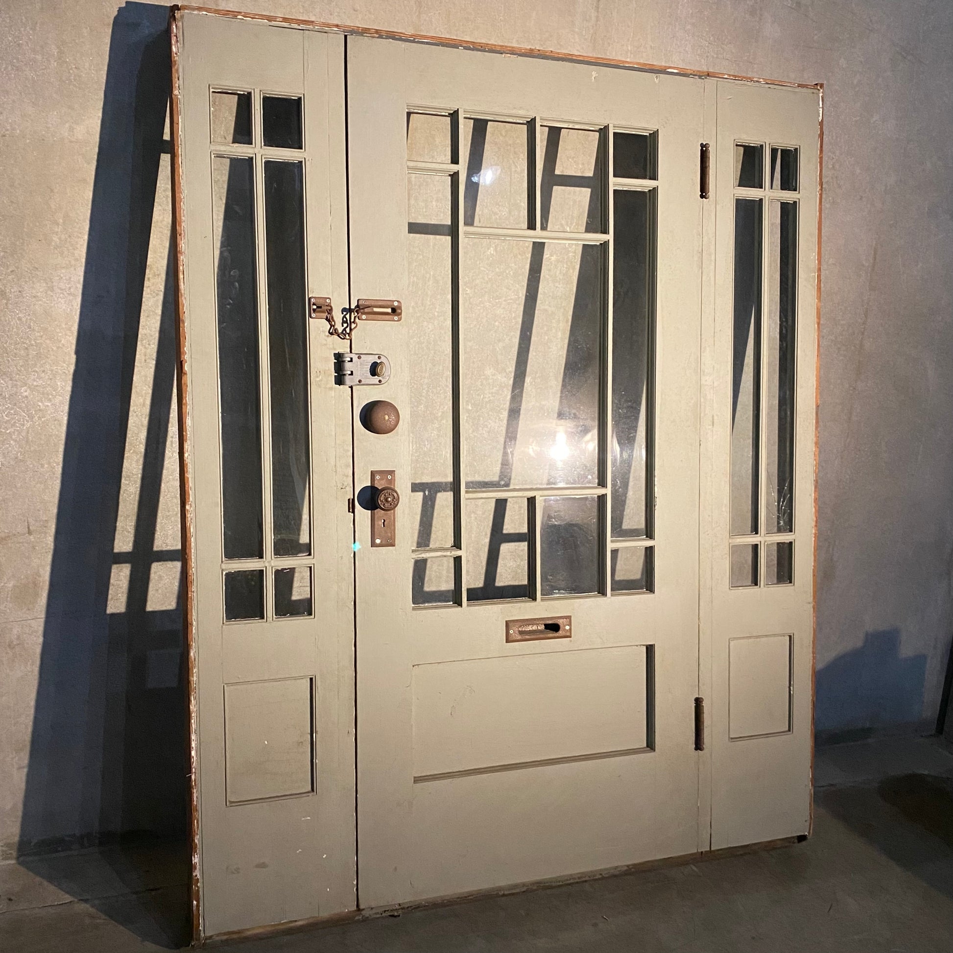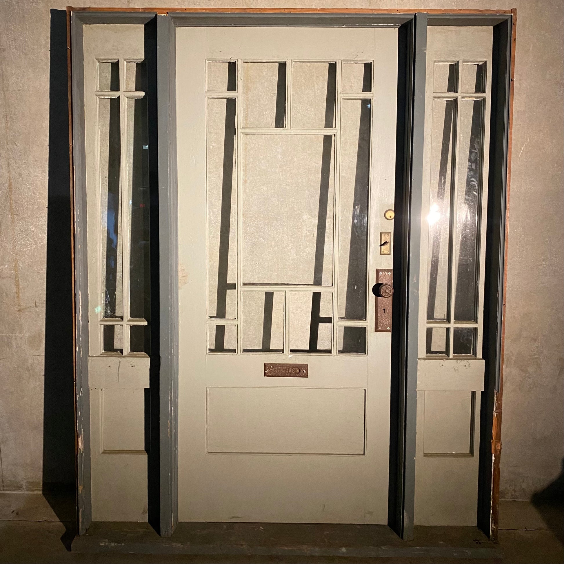 Salvaged in a 1910 home in east Vancouver , this is a fir door with glass side panels. It is likely the door also have a transom glass feature in the original build ..