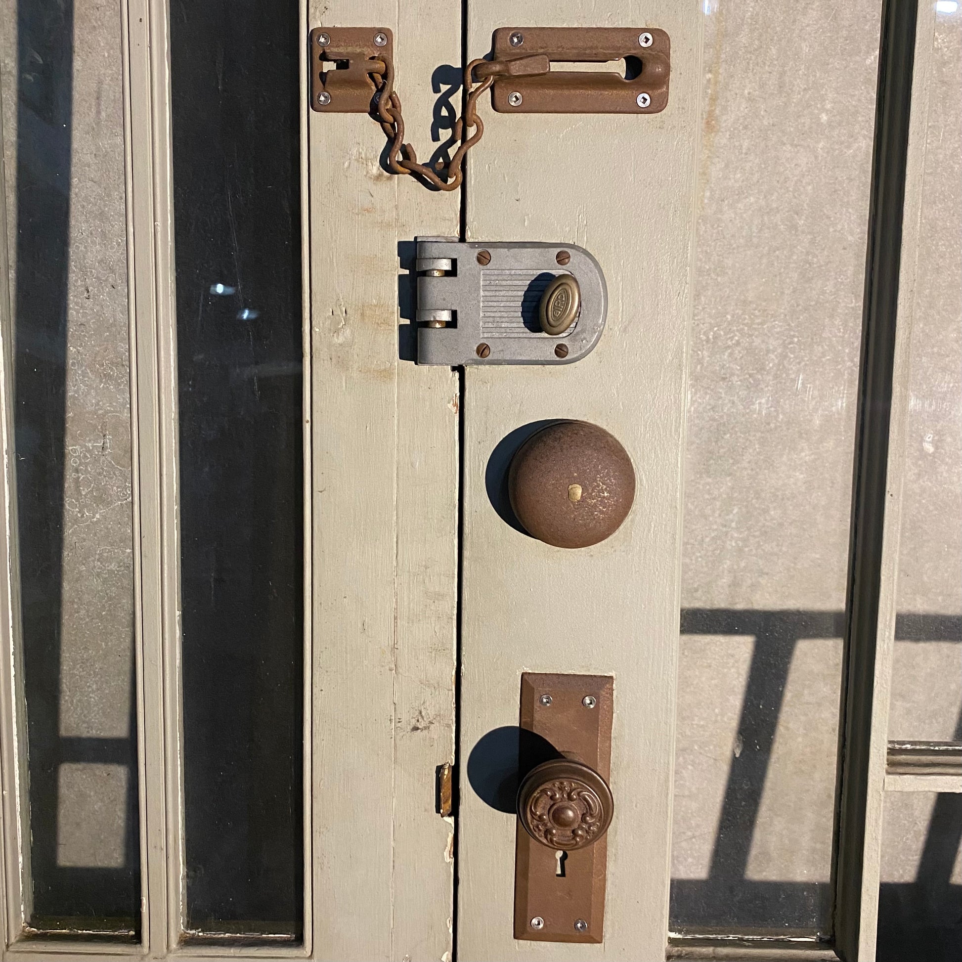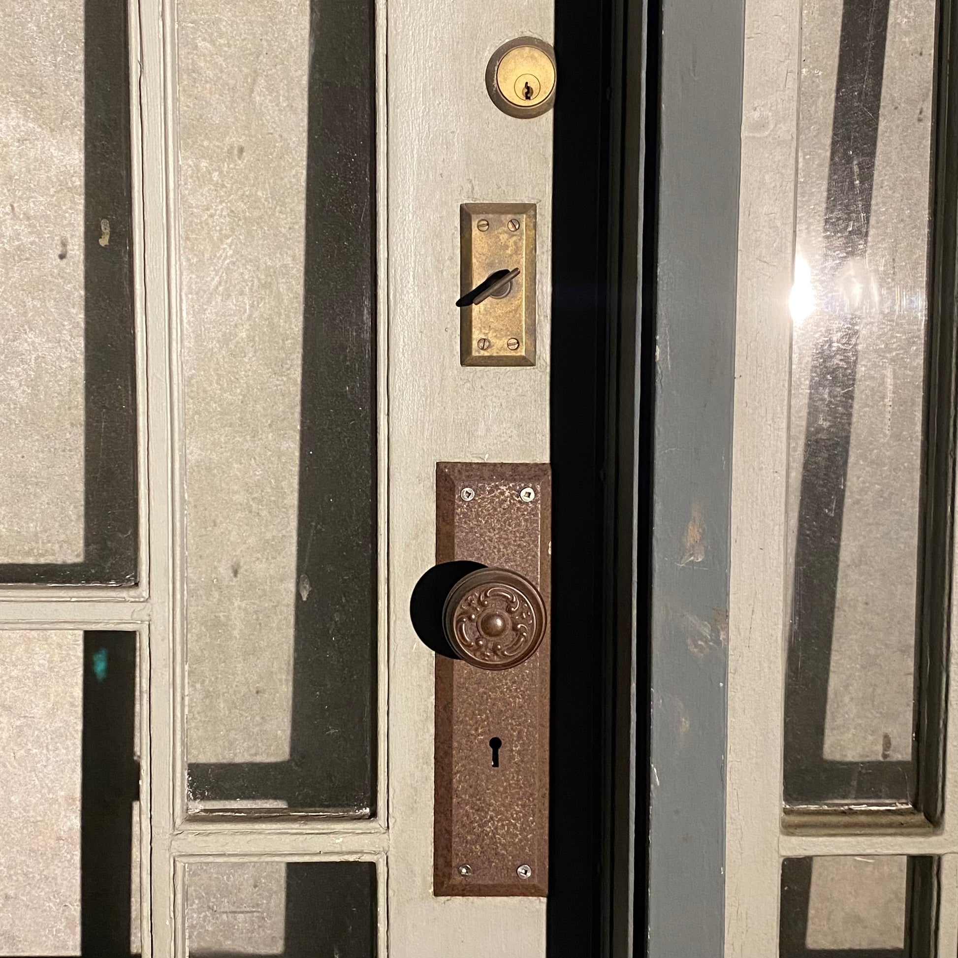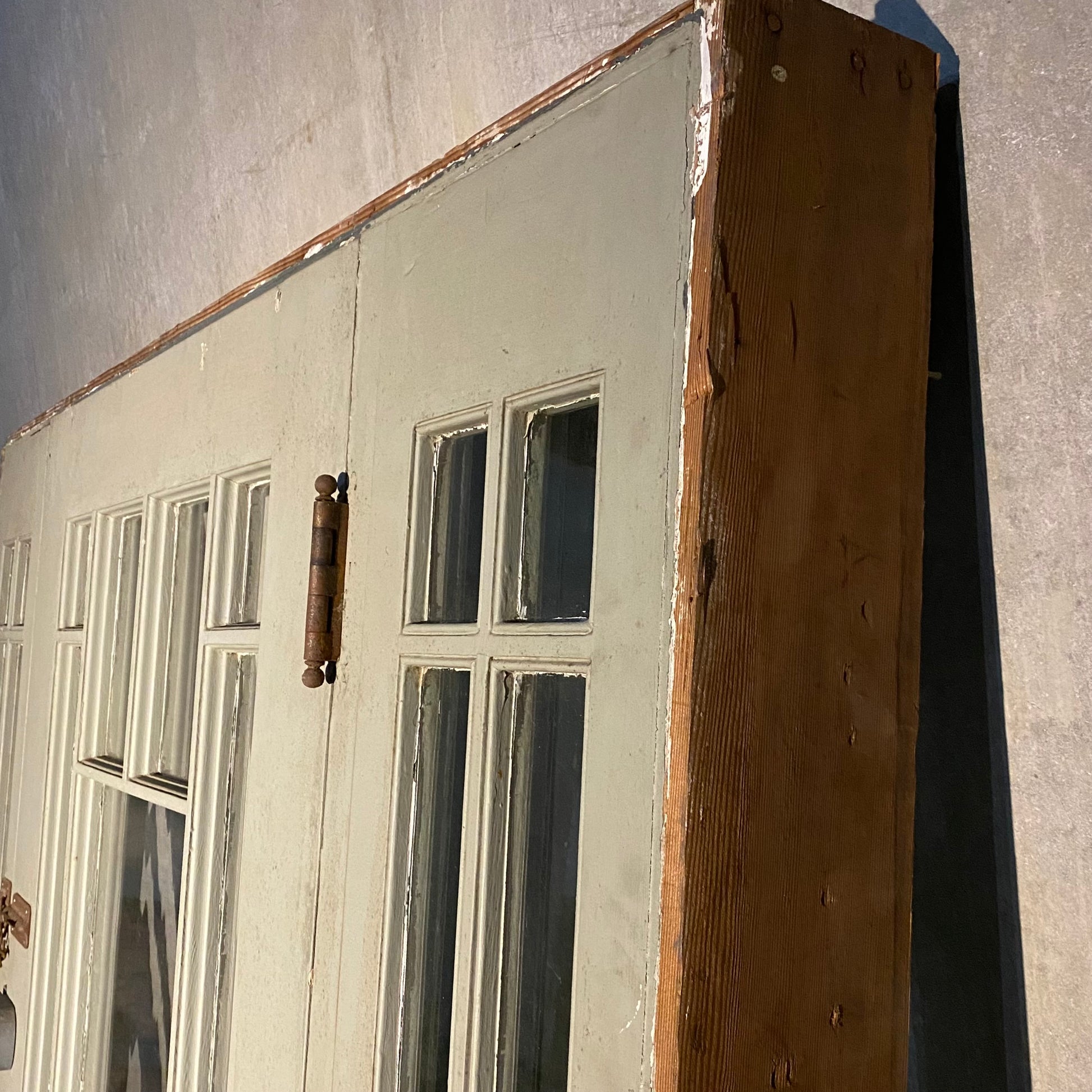 Salvaged in a 1910 home in east Vancouver , this is a fir door with glass side panels. It is likely the door also have a transom glass feature in the original build ..