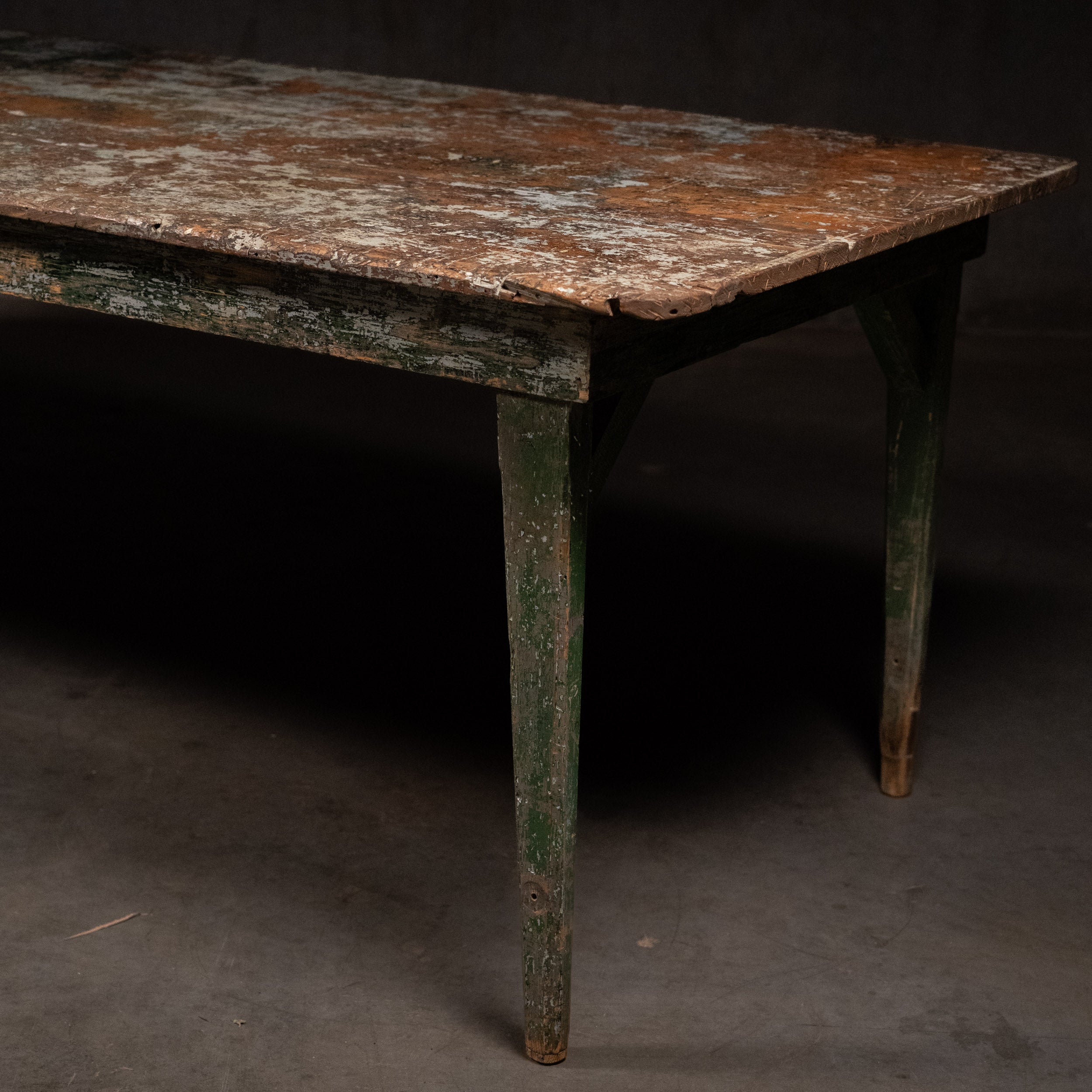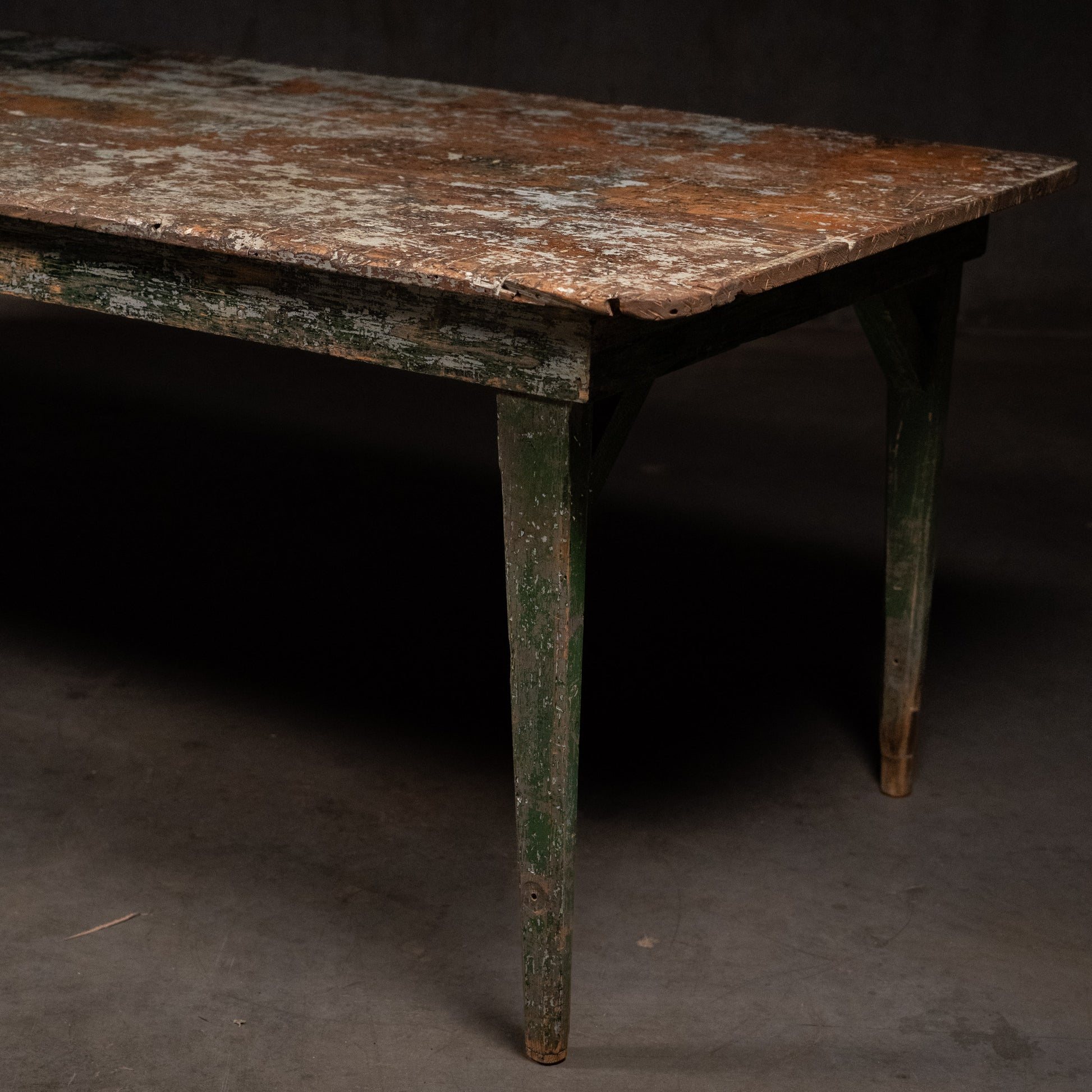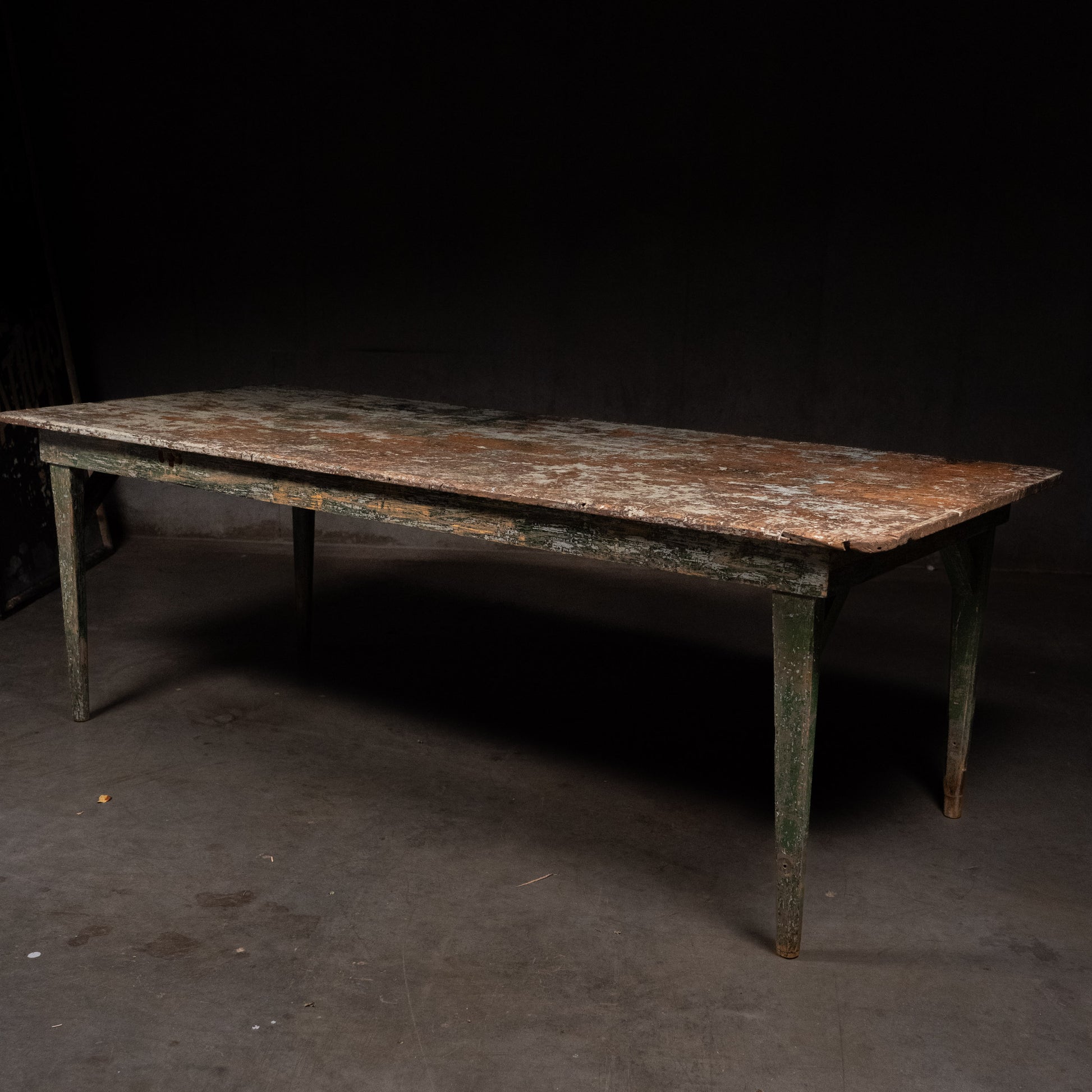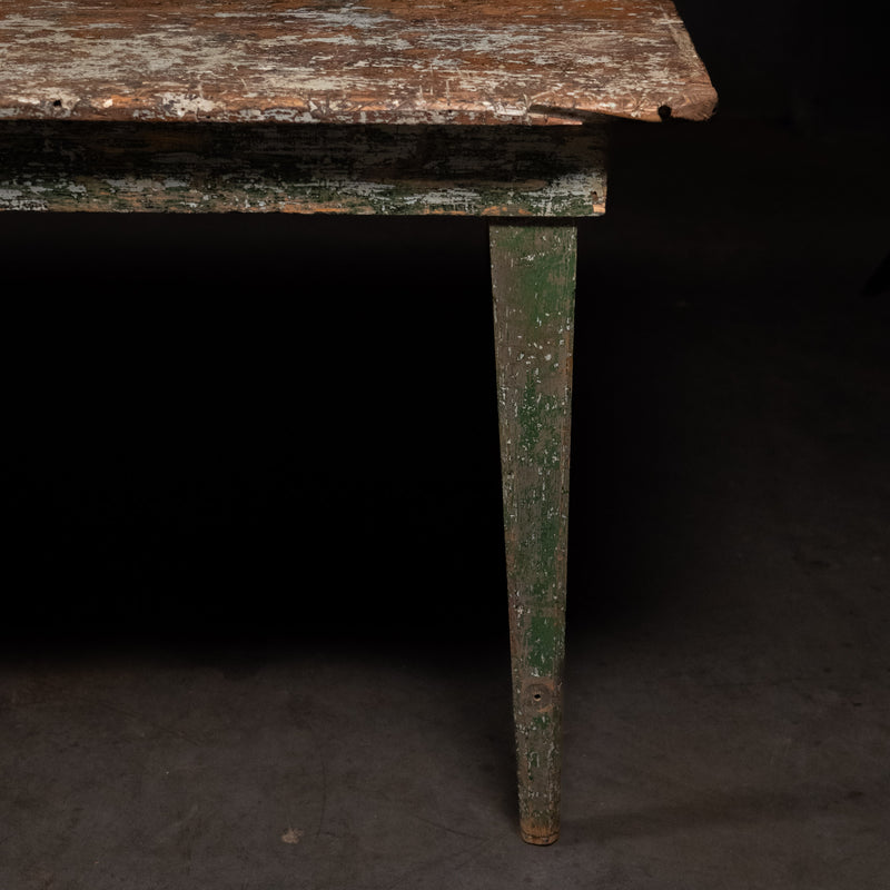 A nice western country example of a large, well made dining table in as found condition. The table retains lots of grey original paint over green. We have left this in its original condition allowing for end user to custom finish as desired.