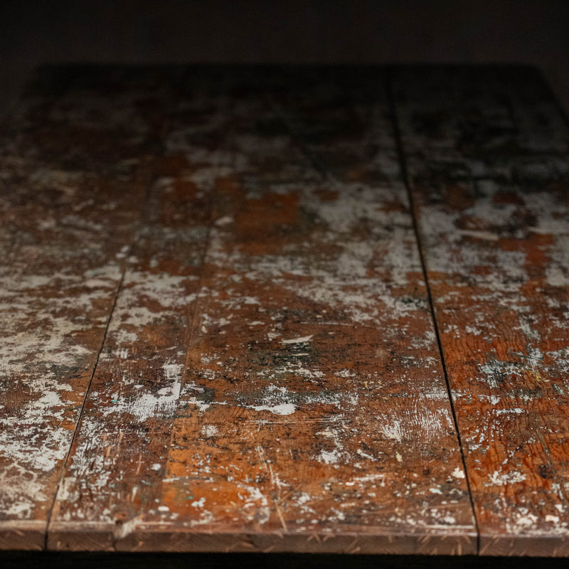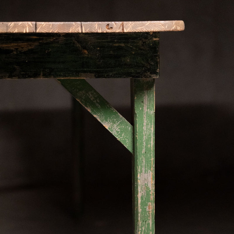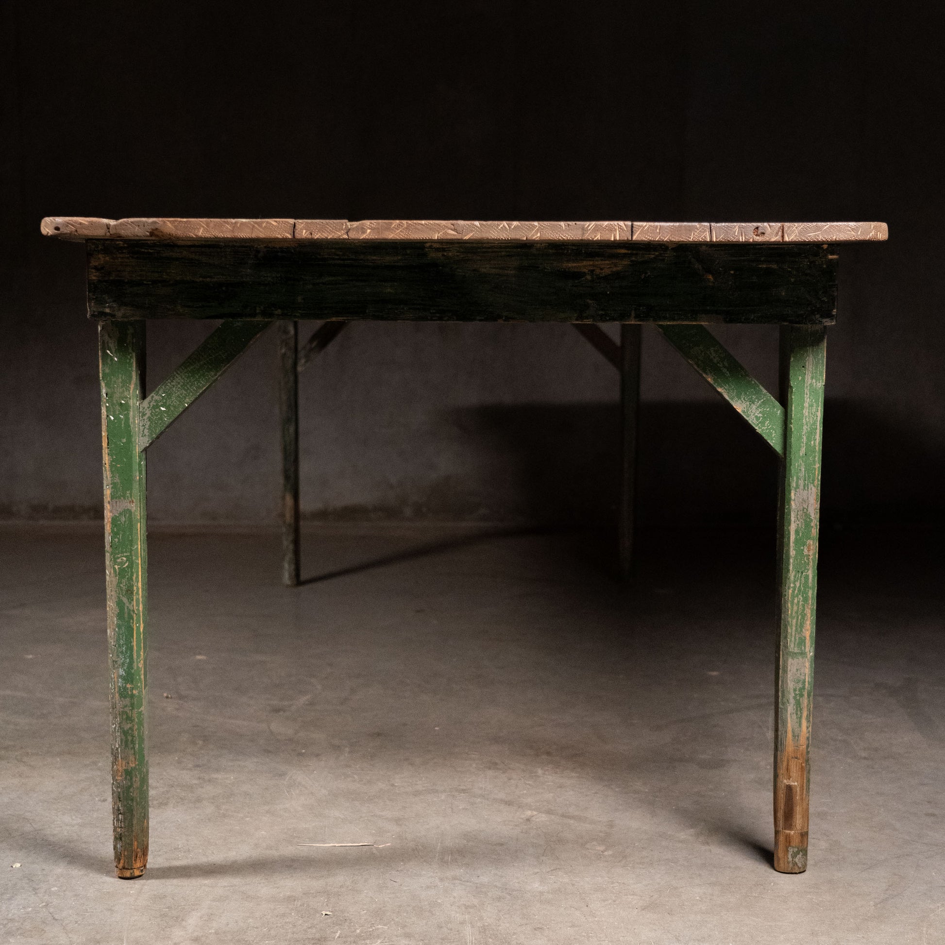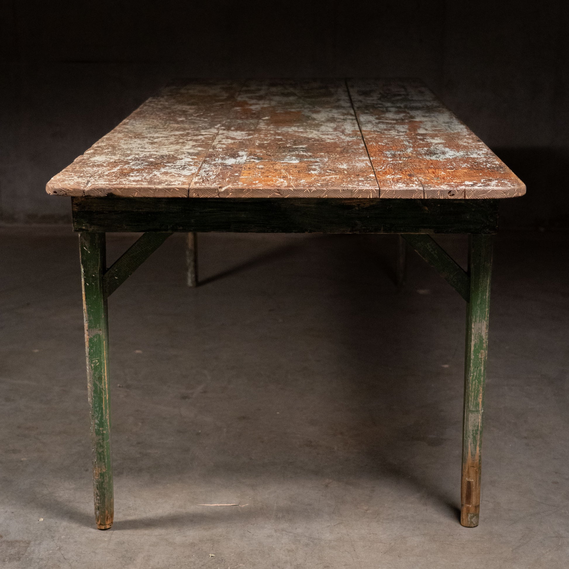 A nice western country example of a large, well made dining table in as found condition. The table retains lots of grey original paint over green. We have left this in its original condition allowing for end user to custom finish as desired.