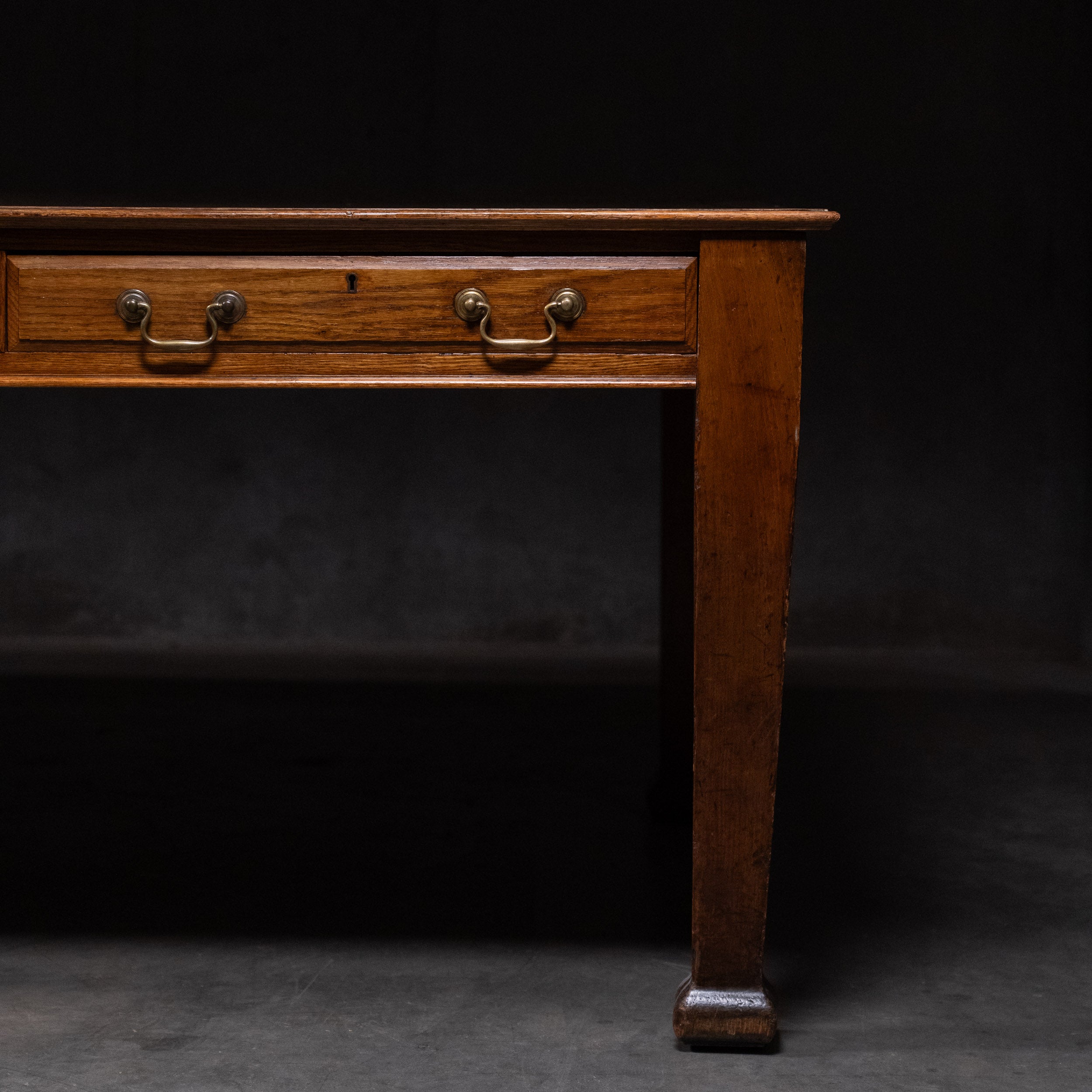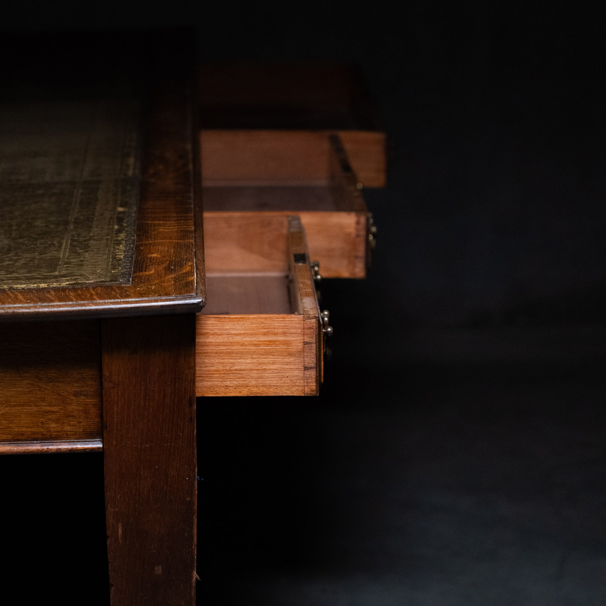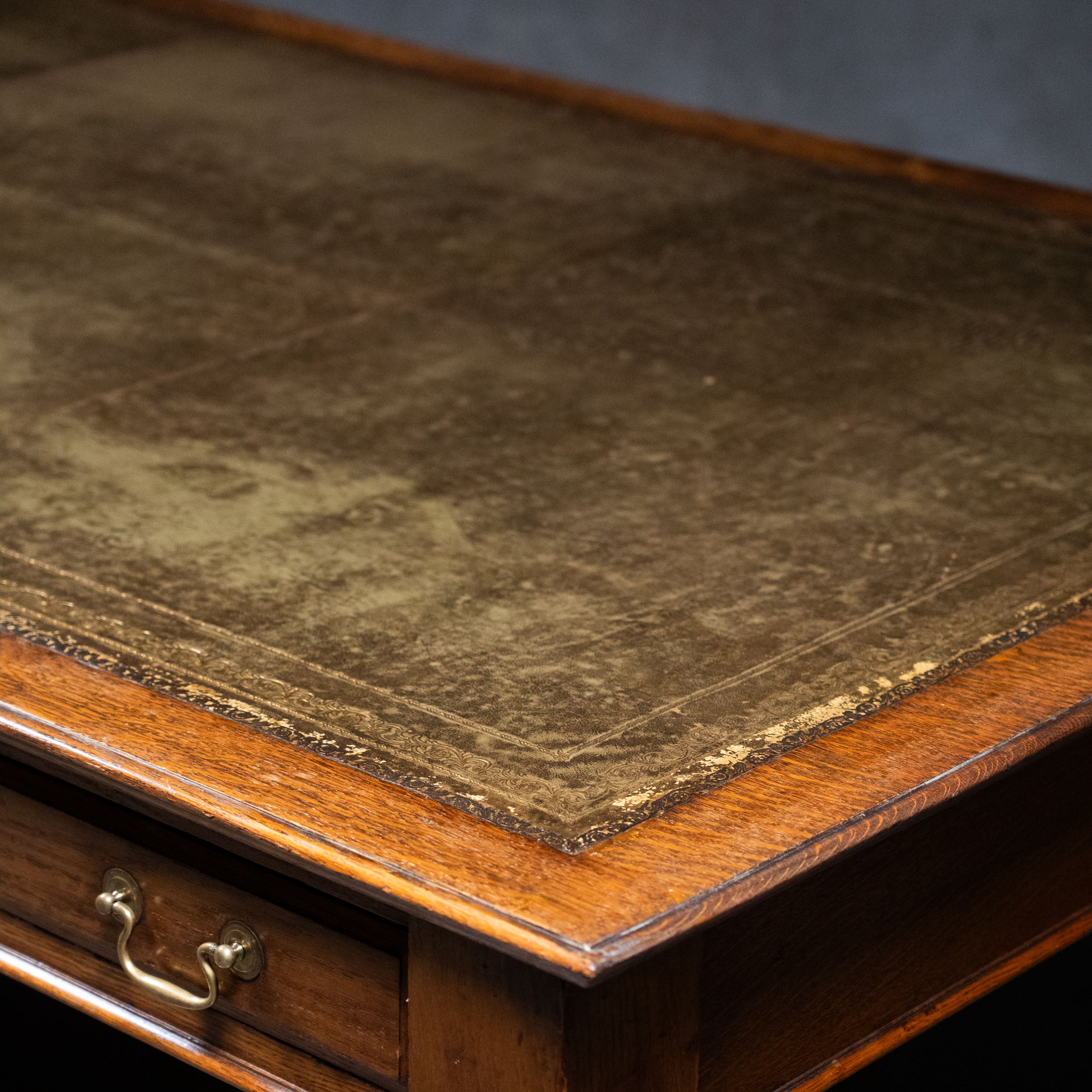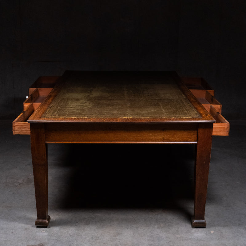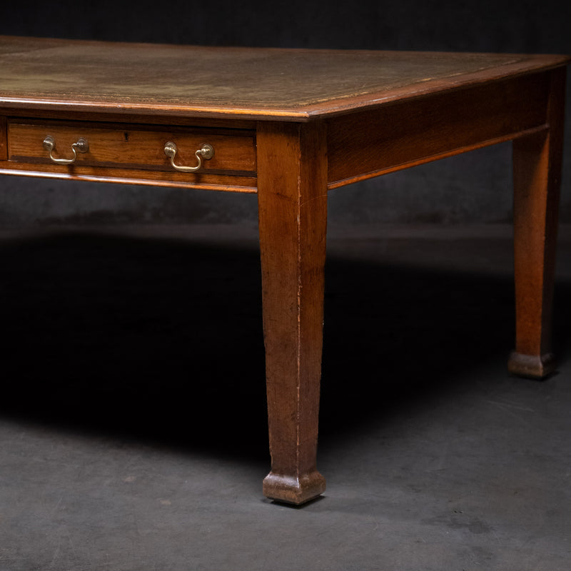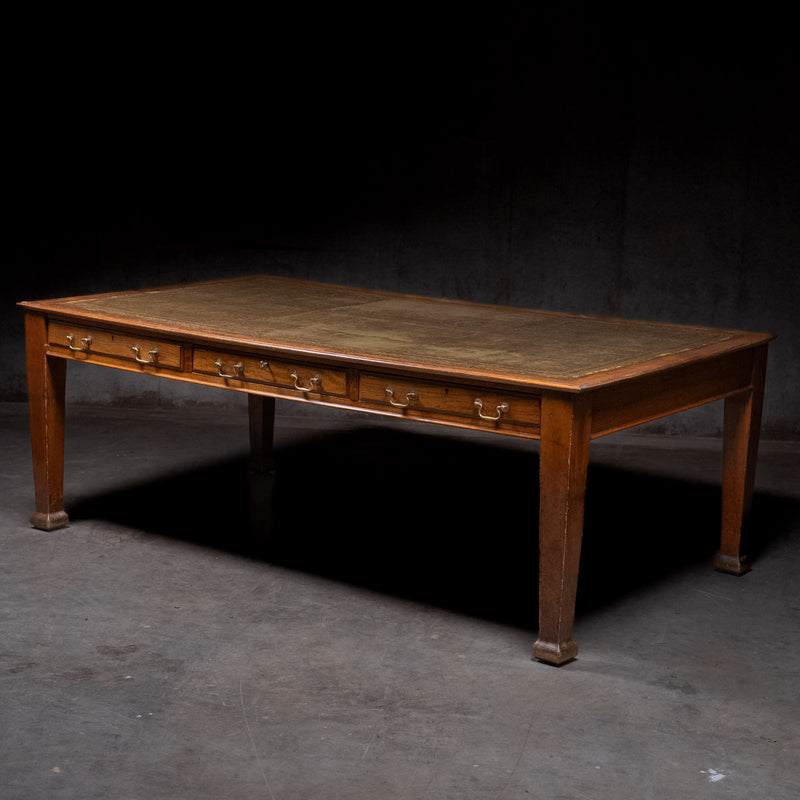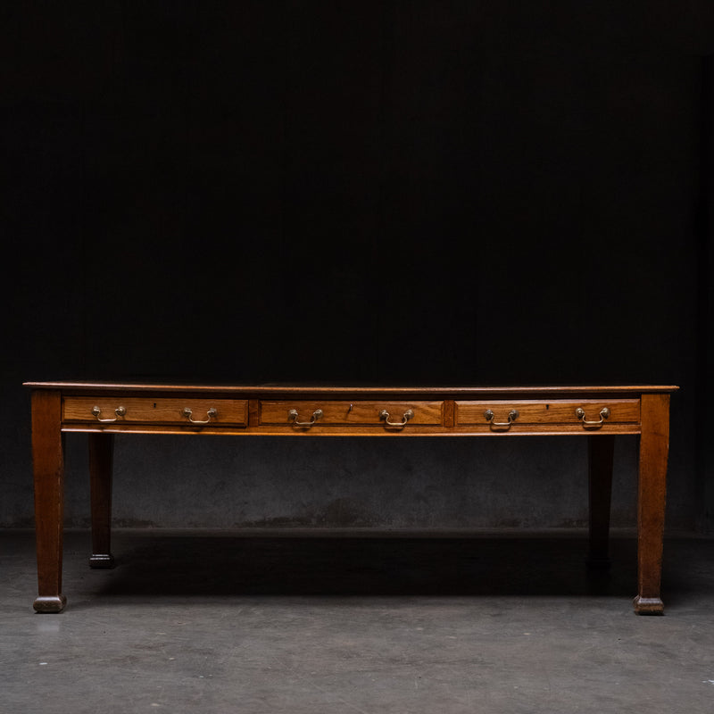 A great quality piece in old finish and original leather top with working drawers. A large table recently used as a boardroom table and then a dining table.