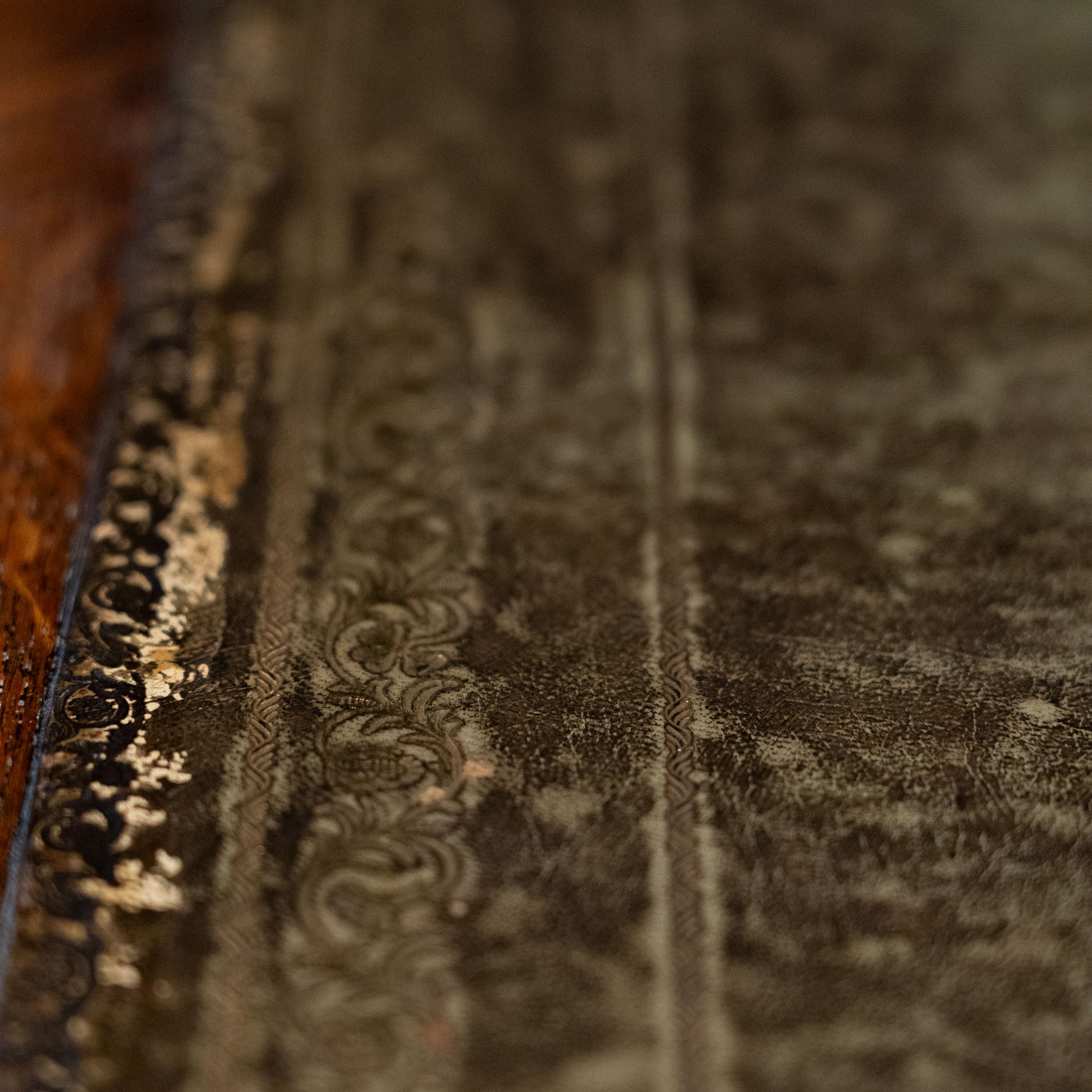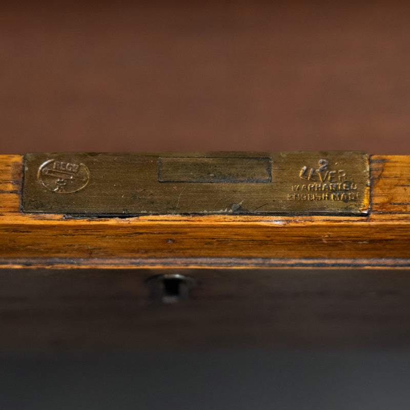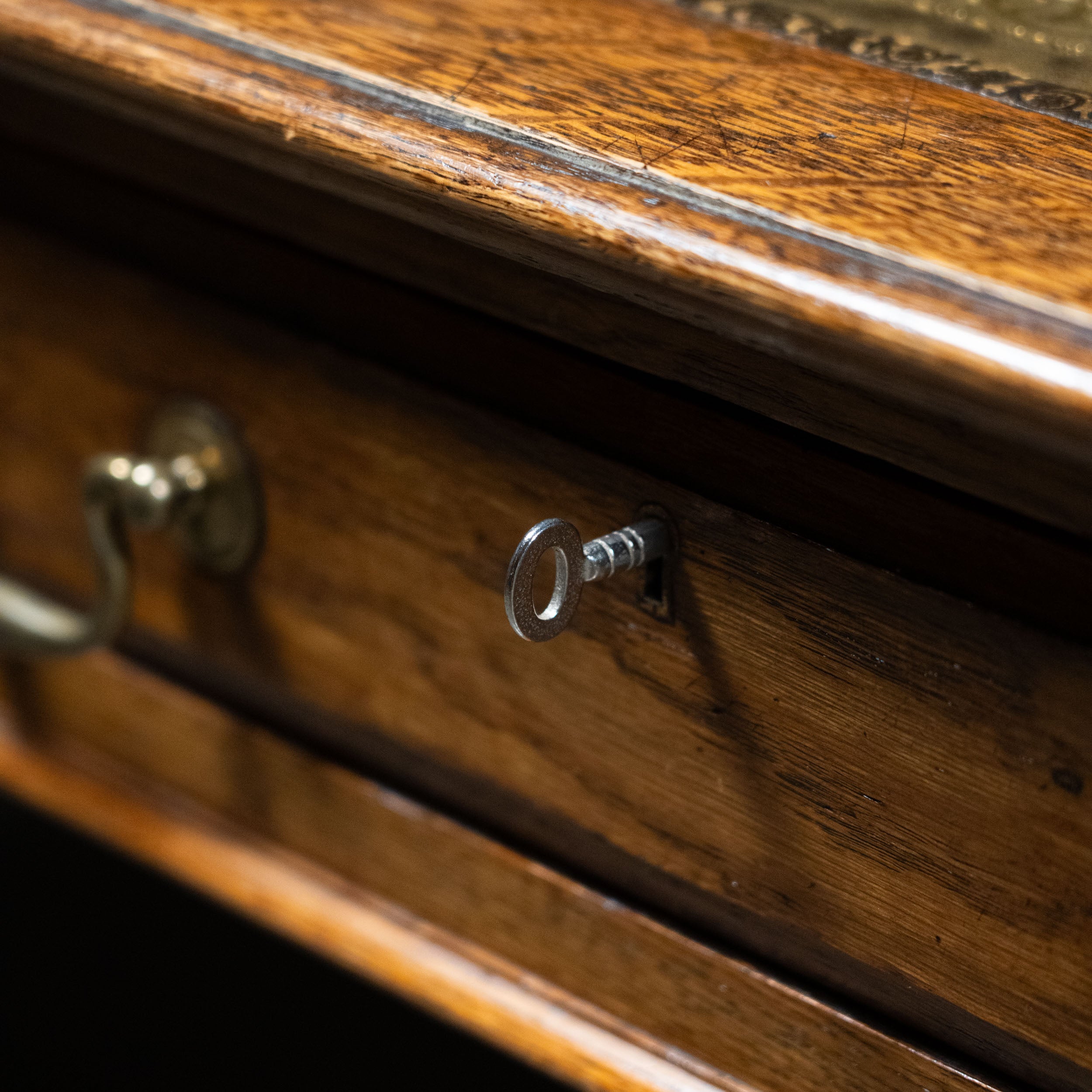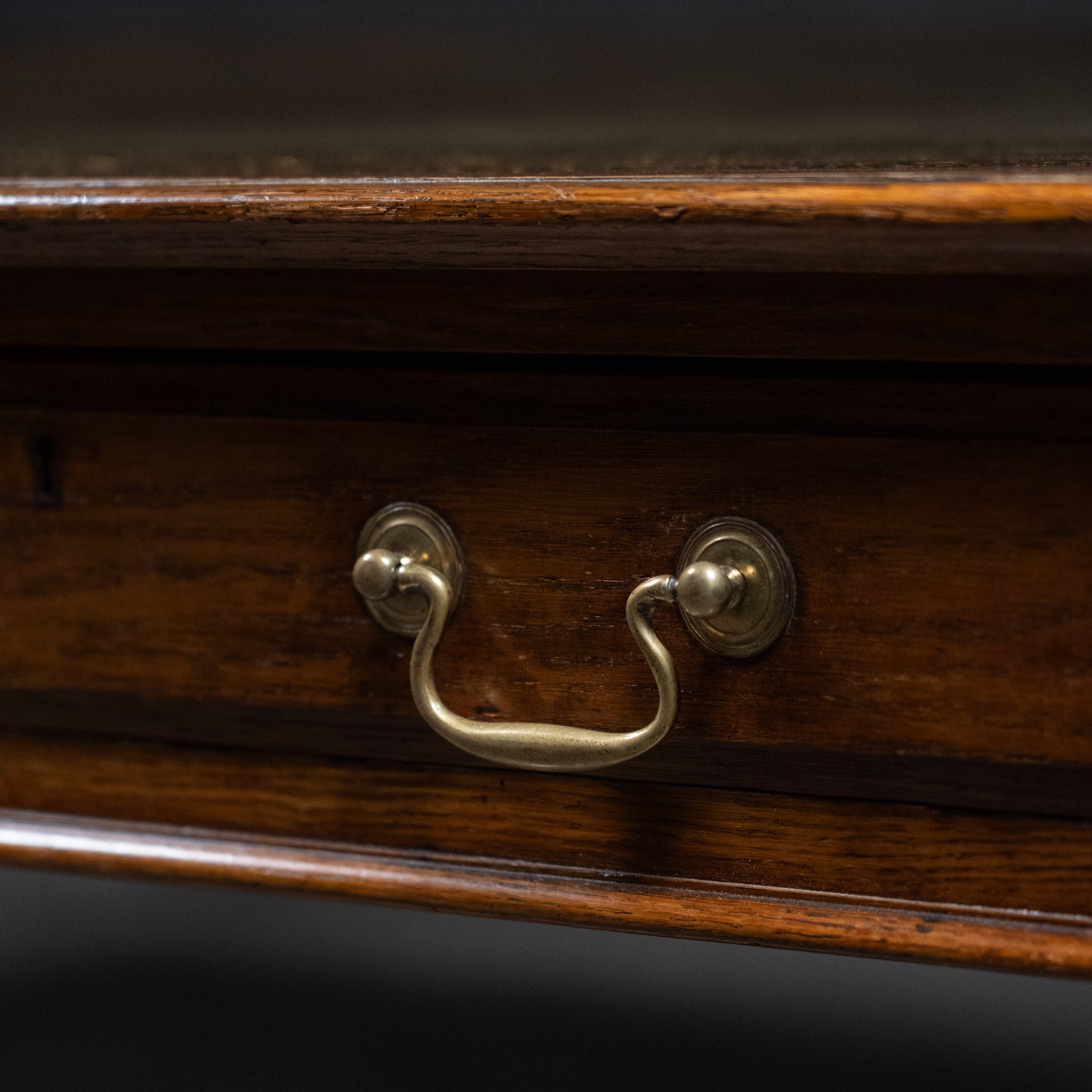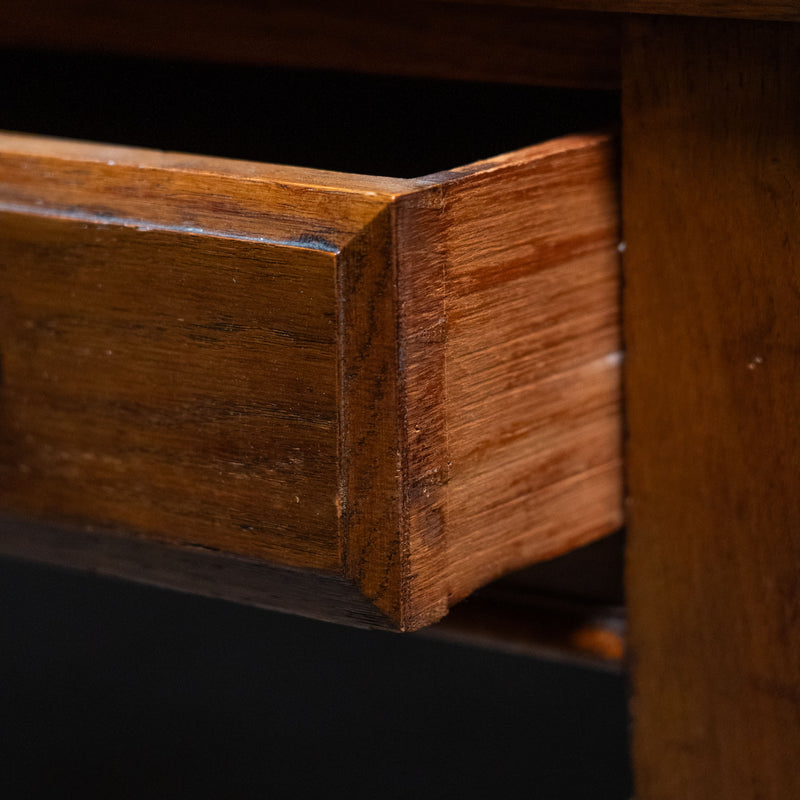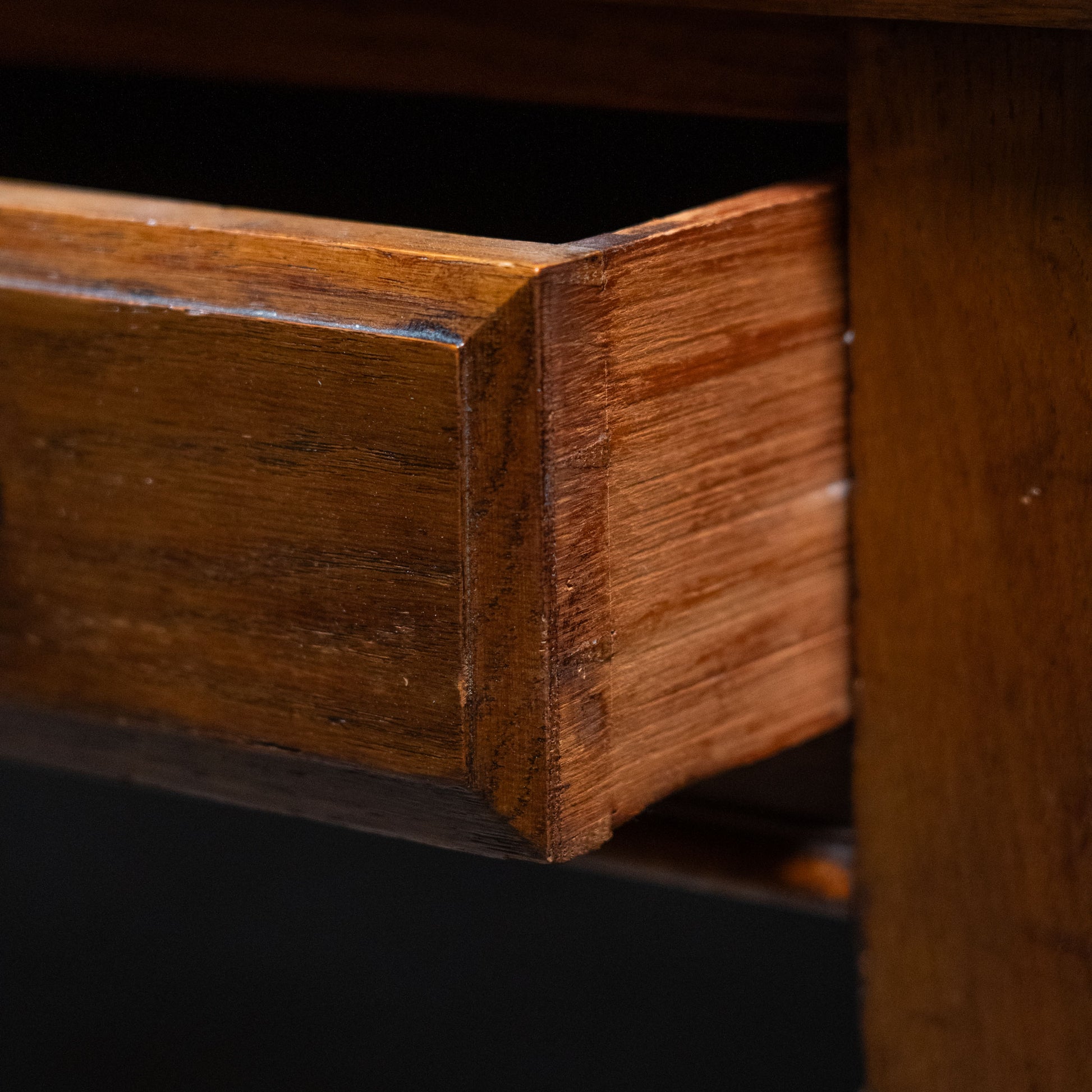 A great quality piece in old finish and original leather top with working drawers. A large table recently used as a boardroom table and then a dining table.