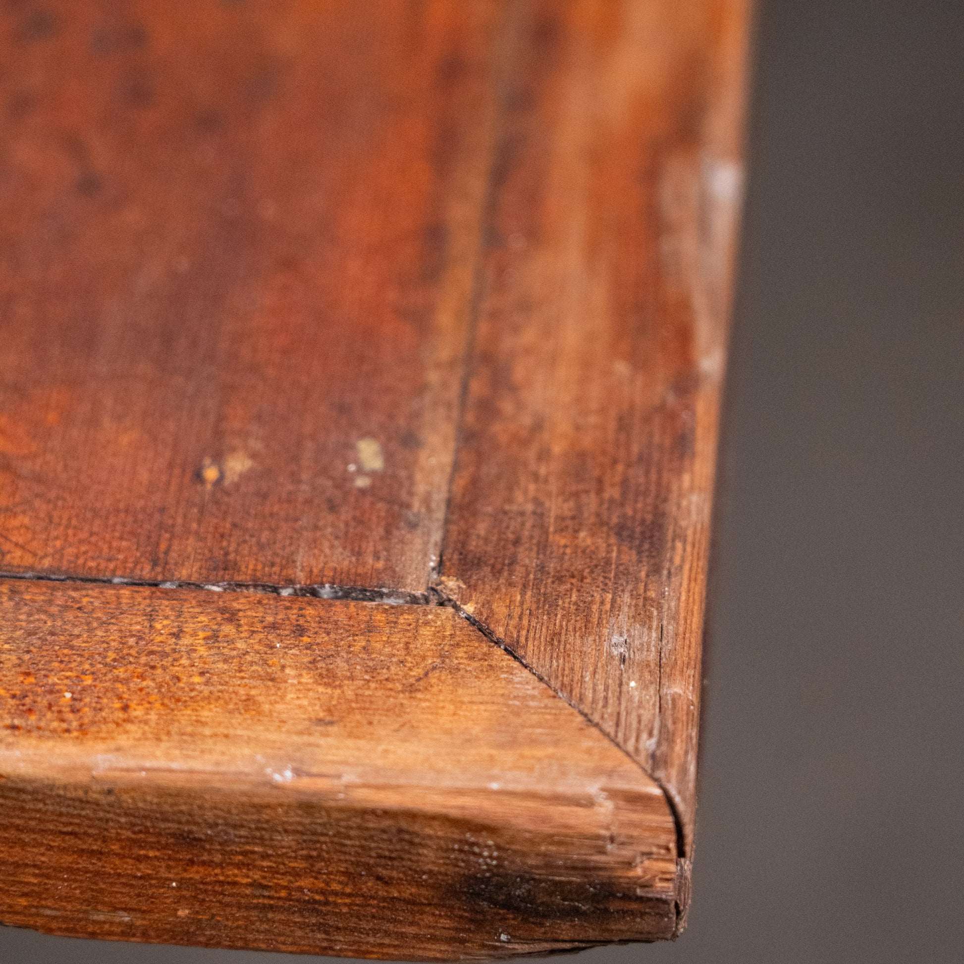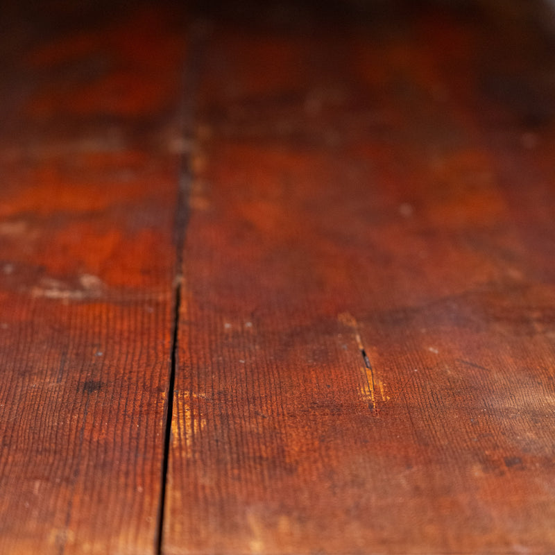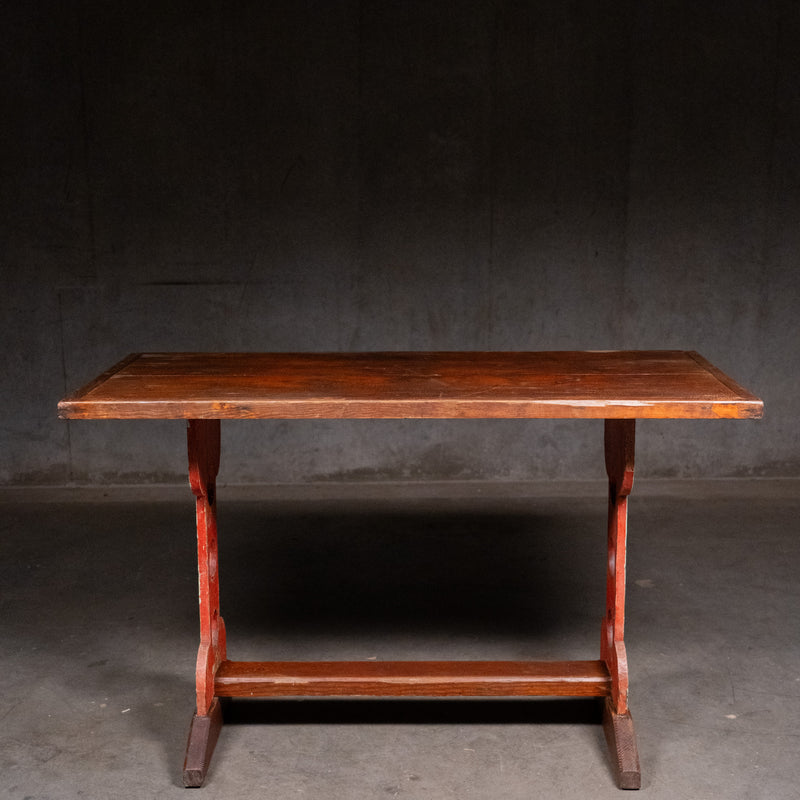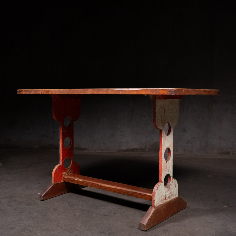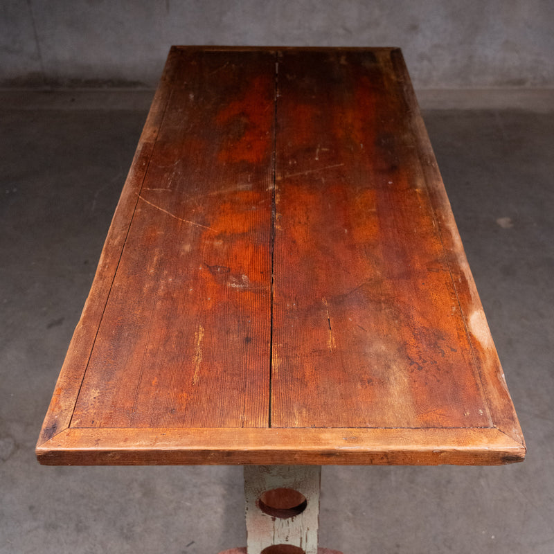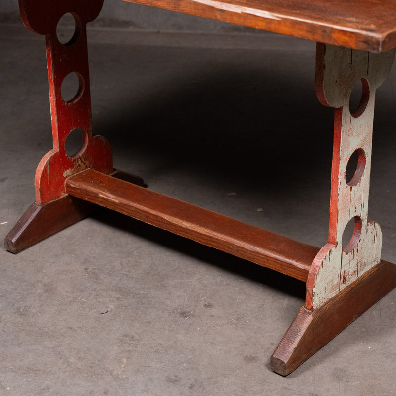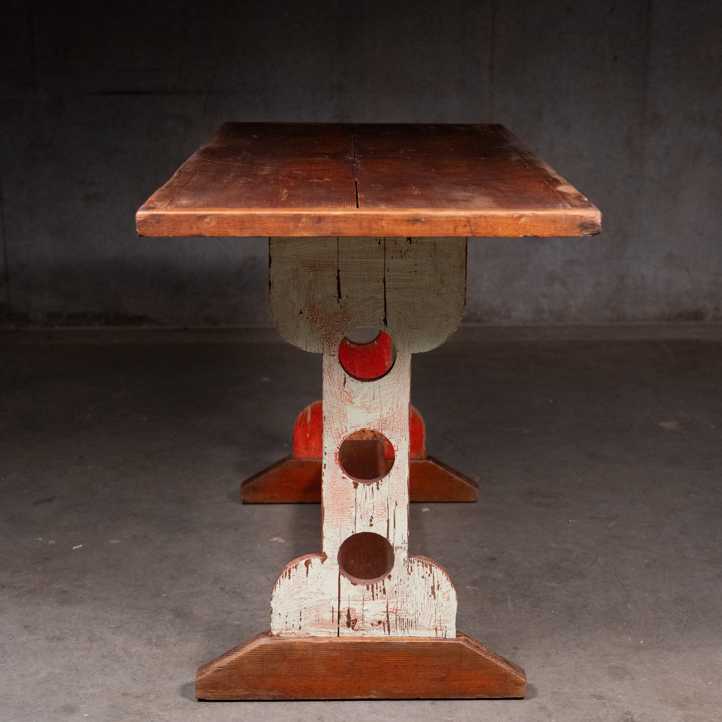 A late 19th century painted pine trestle table, likely French Canadian or Northeastern North American, dating to circa 1890.